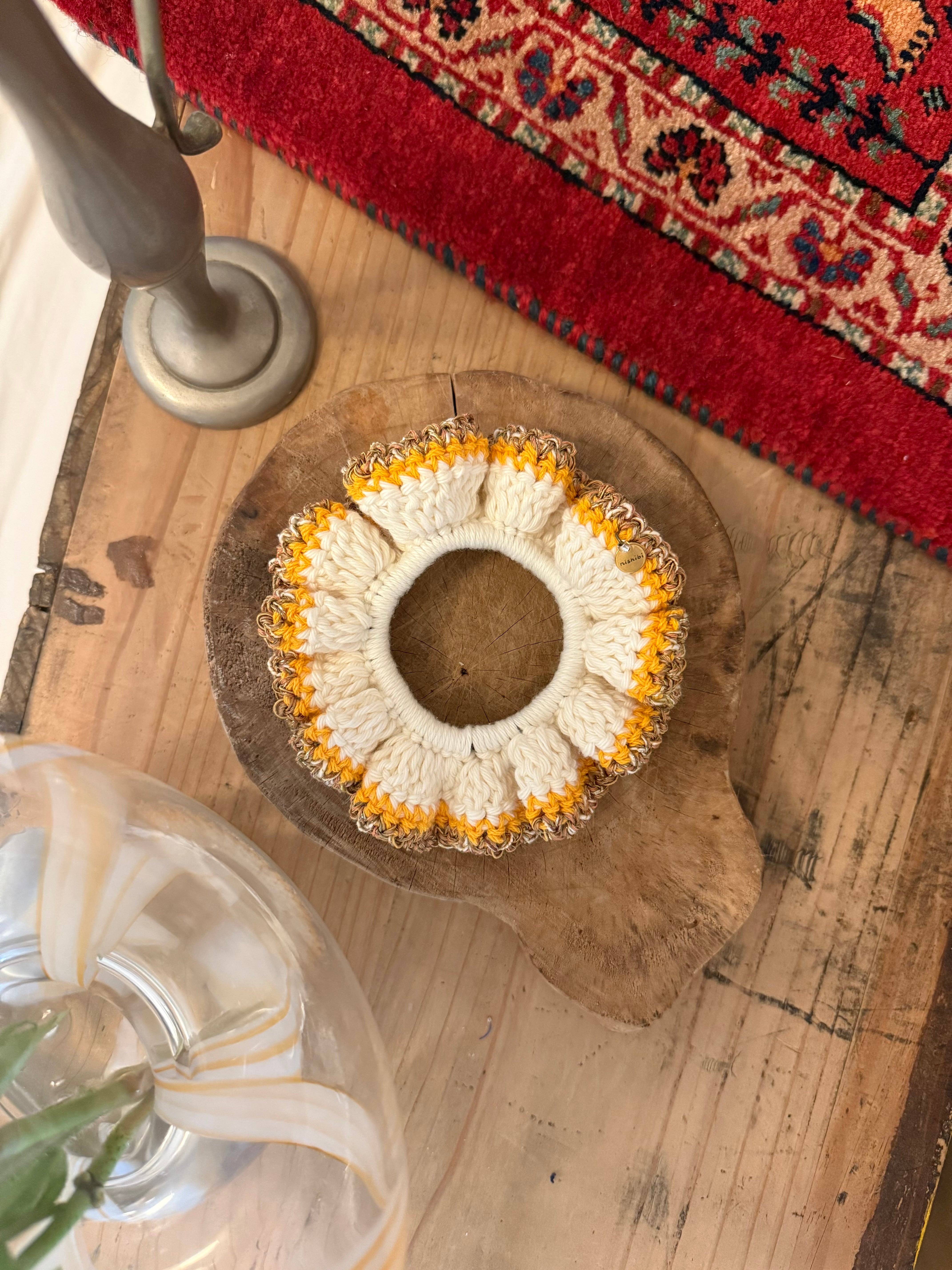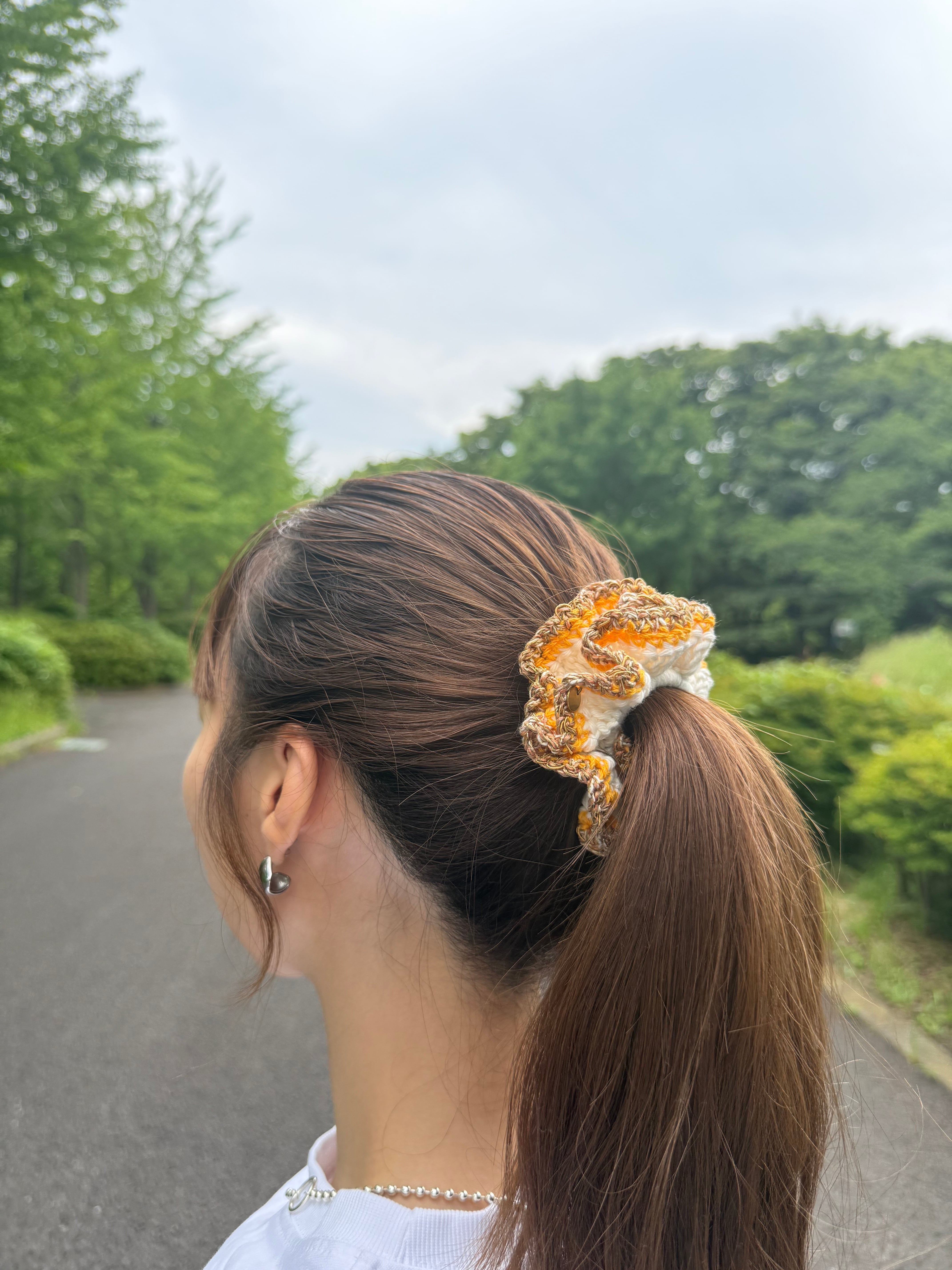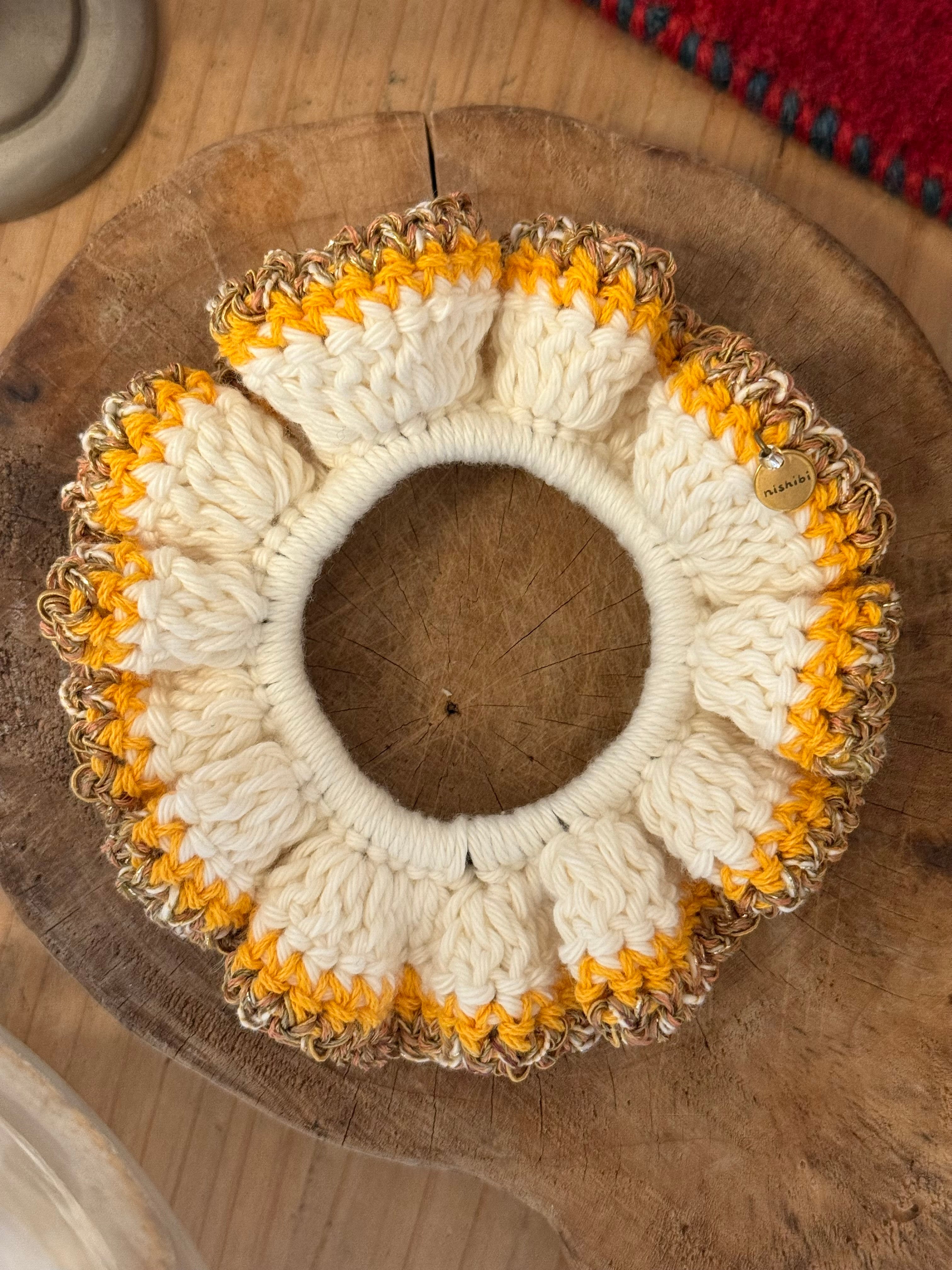 アクセサリー感覚で付けられる手編みのシュシュ。