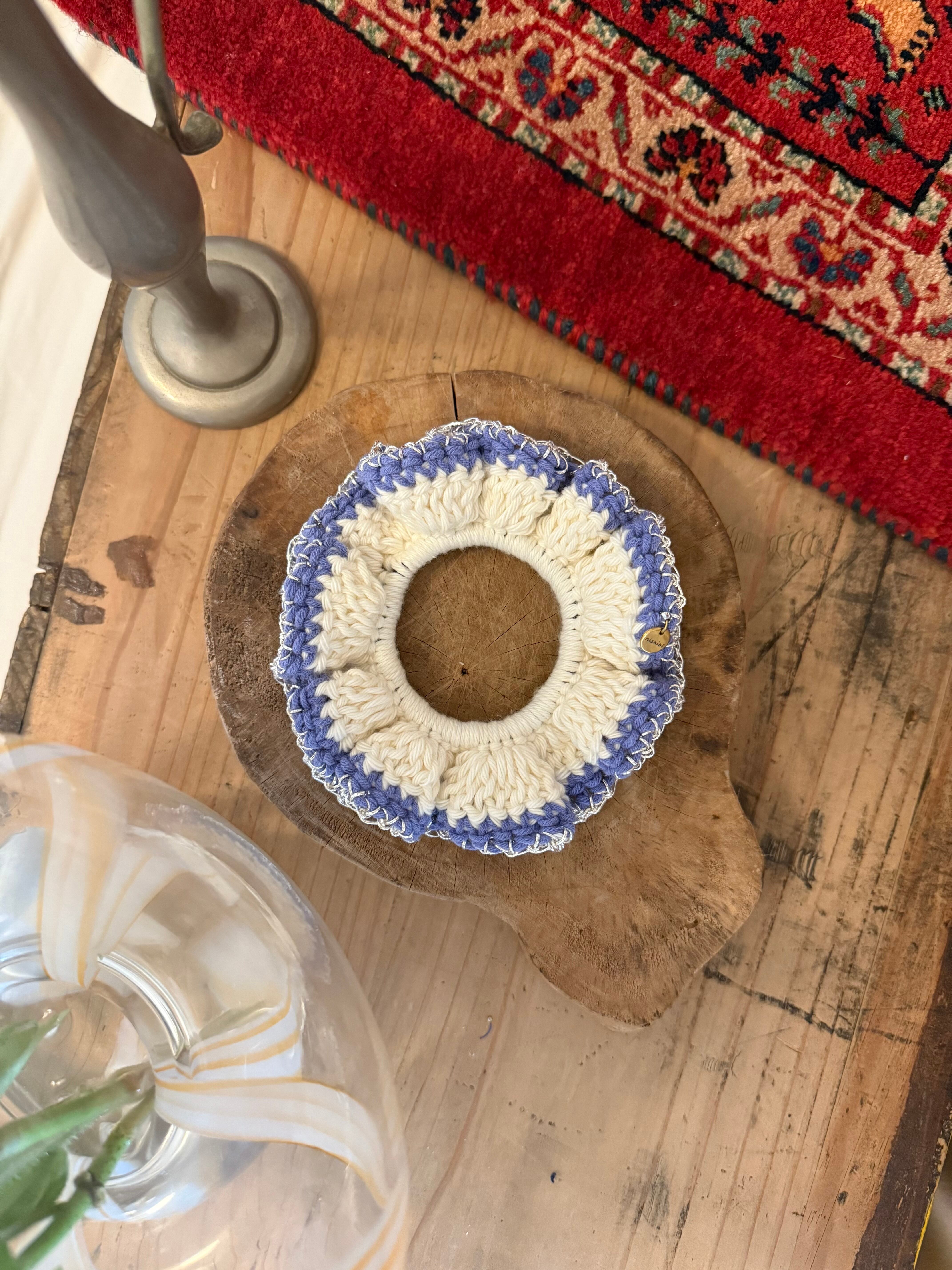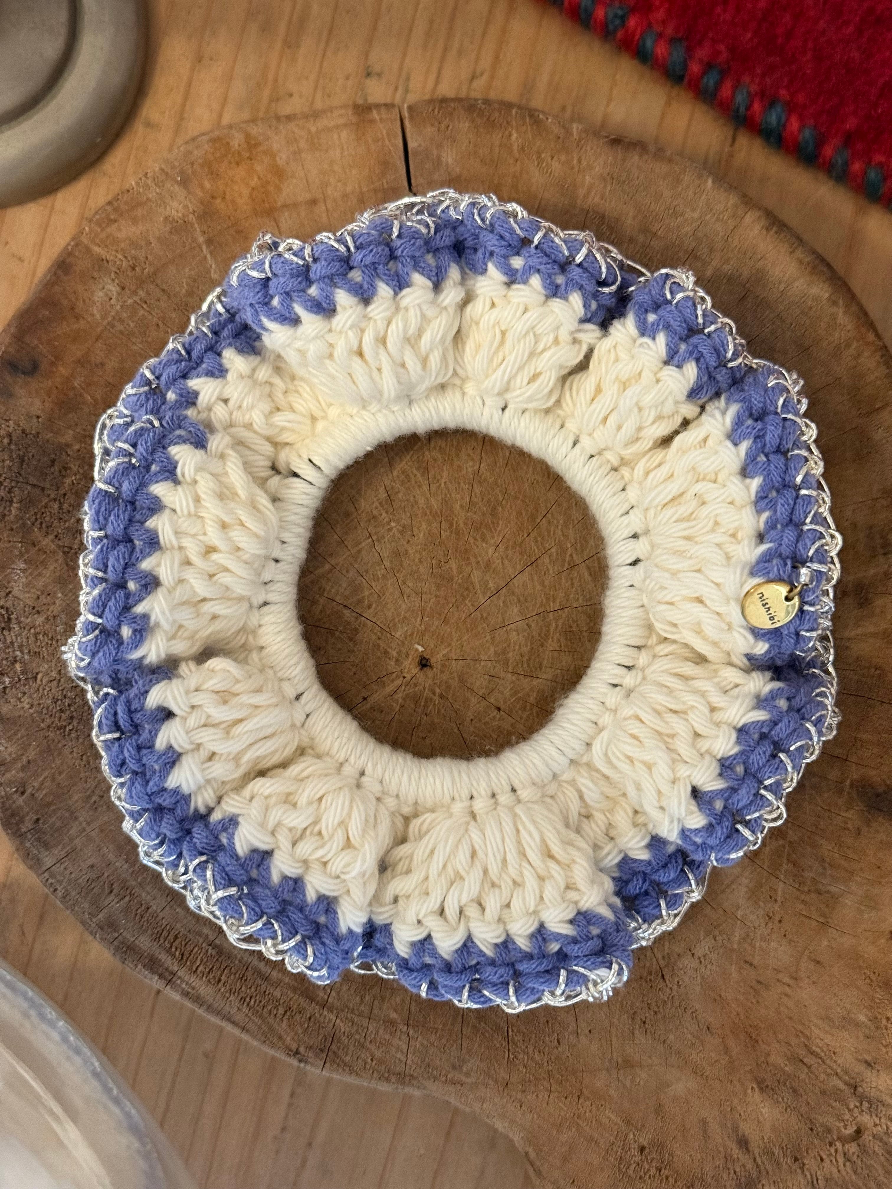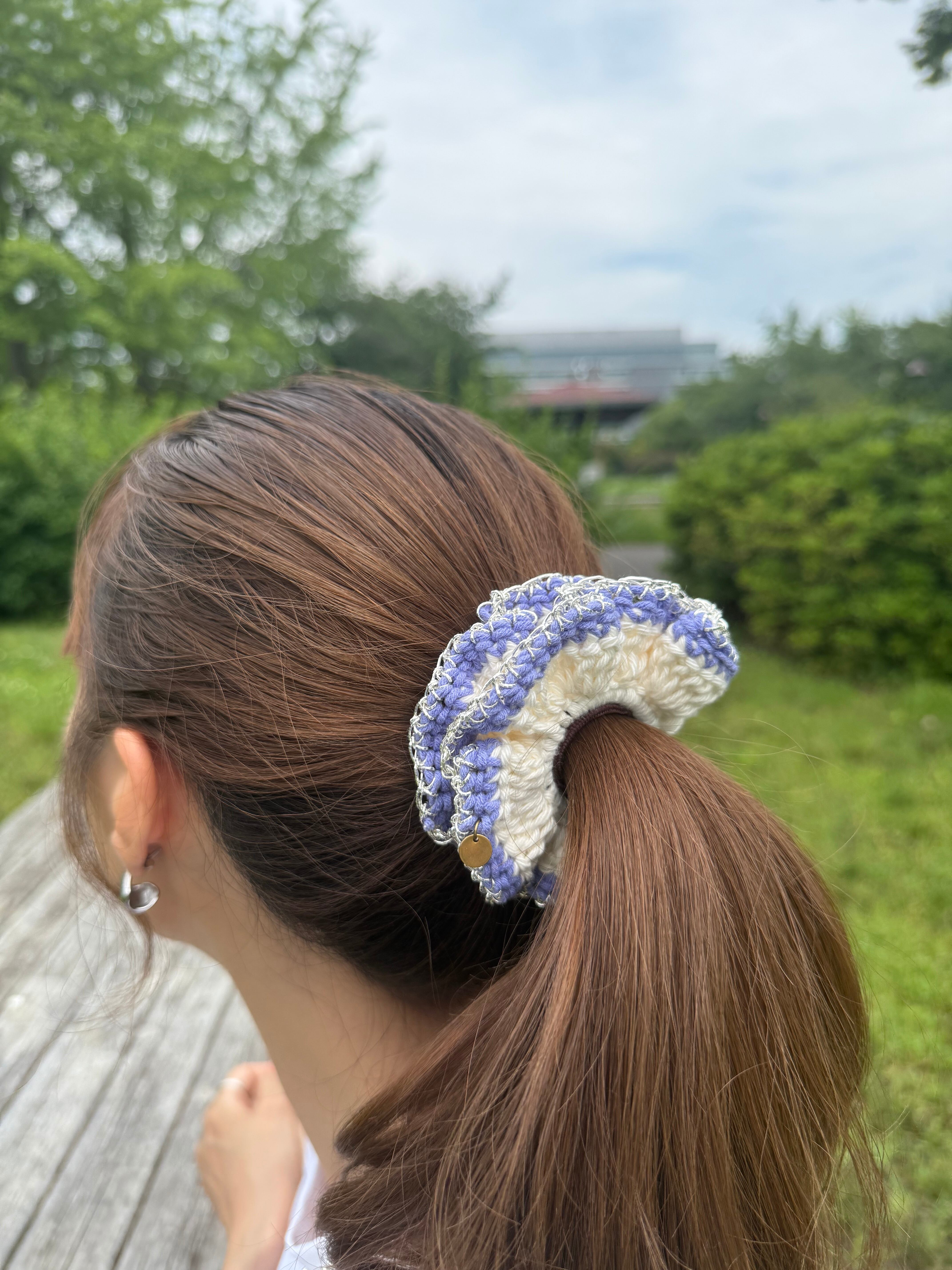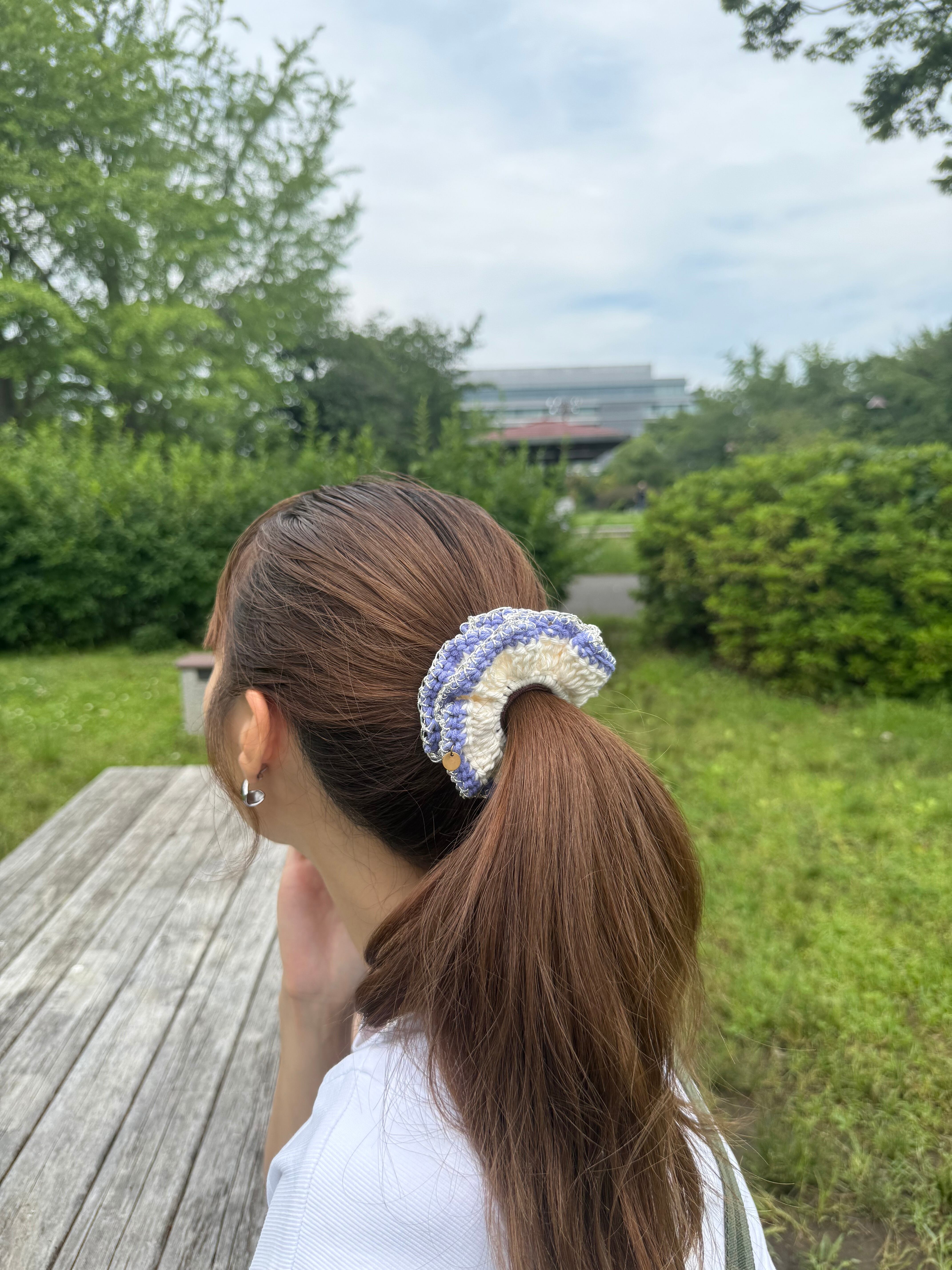アクセサリー感覚で付けられる手編みのシュシュ。