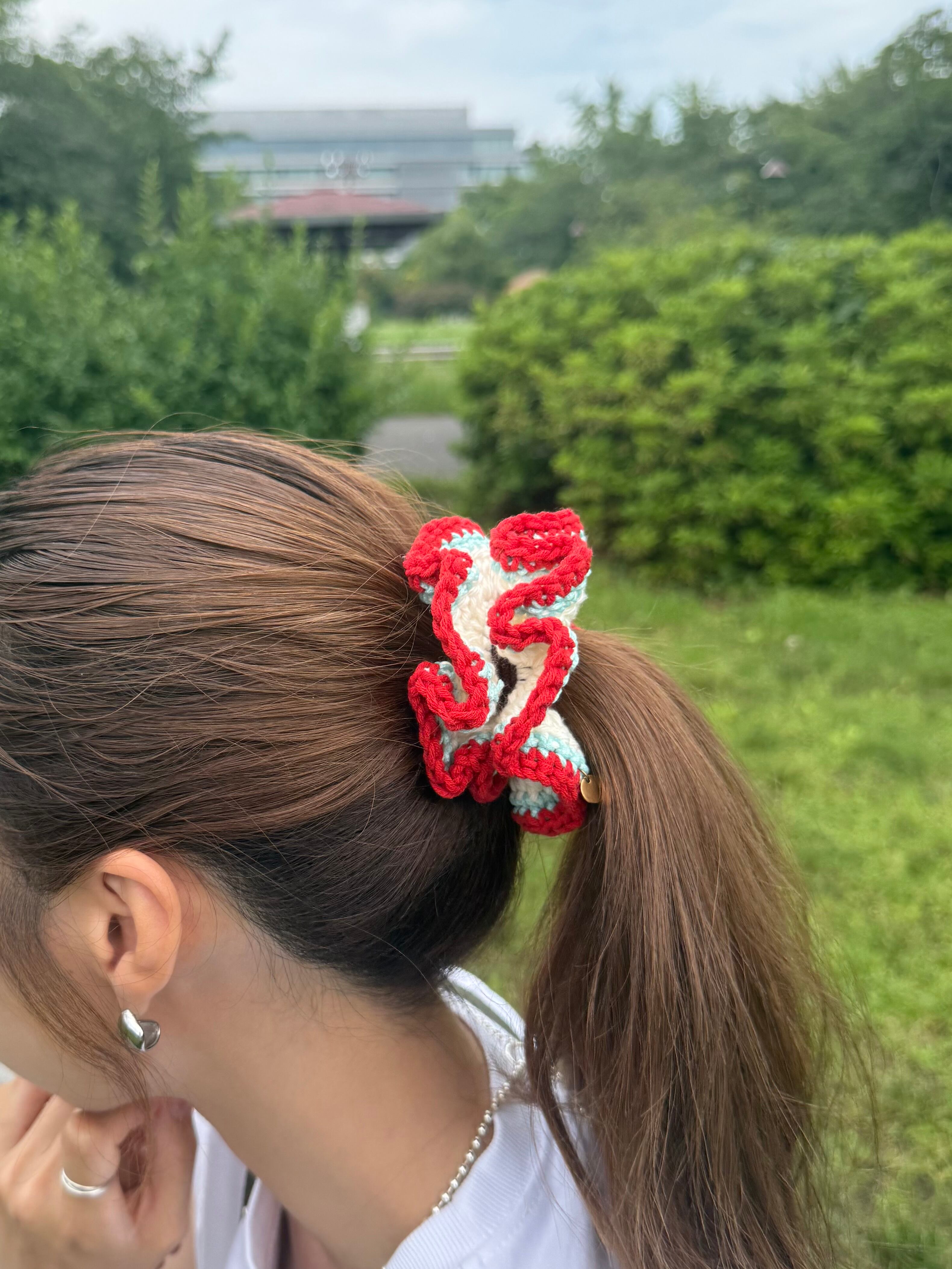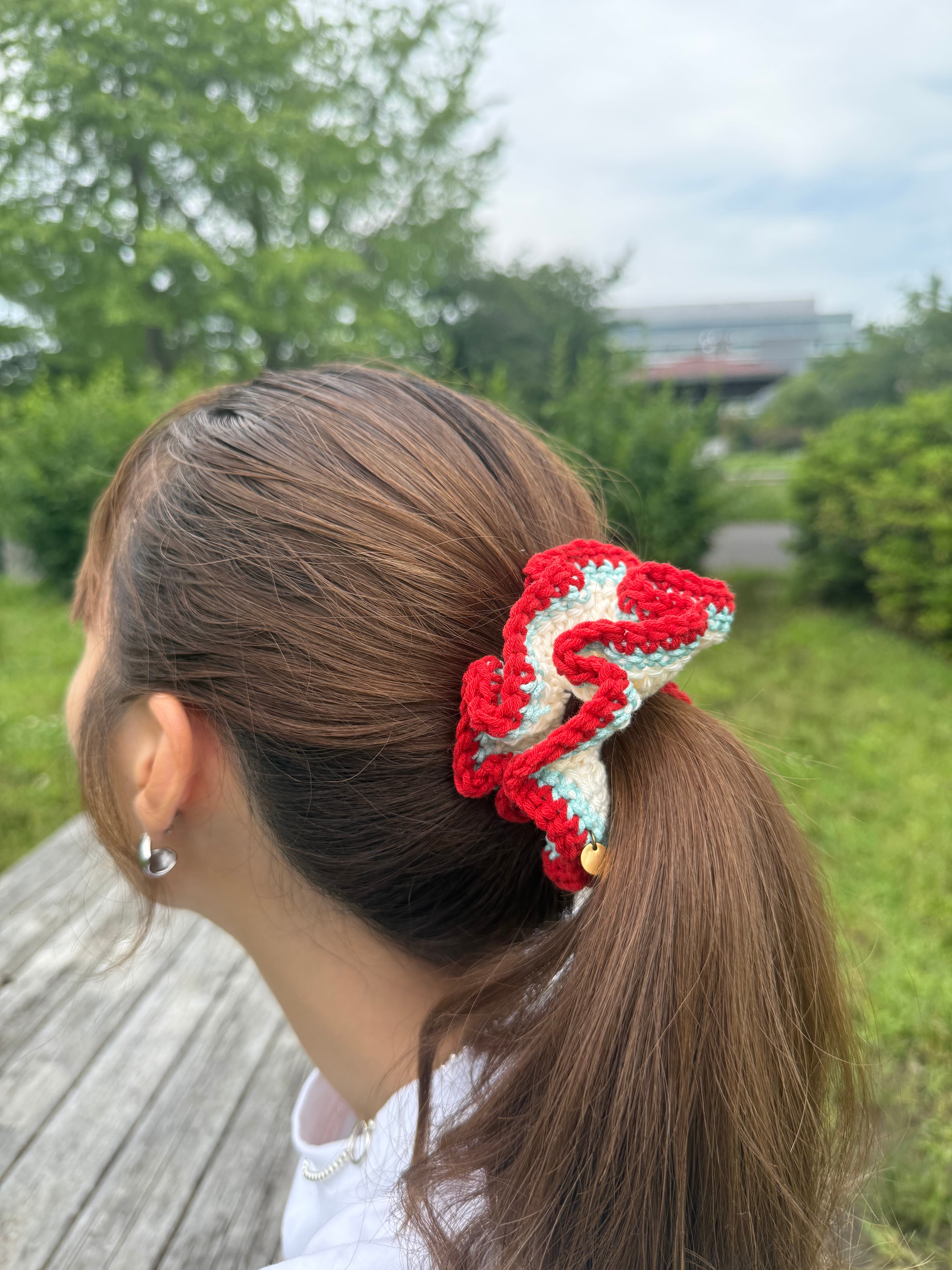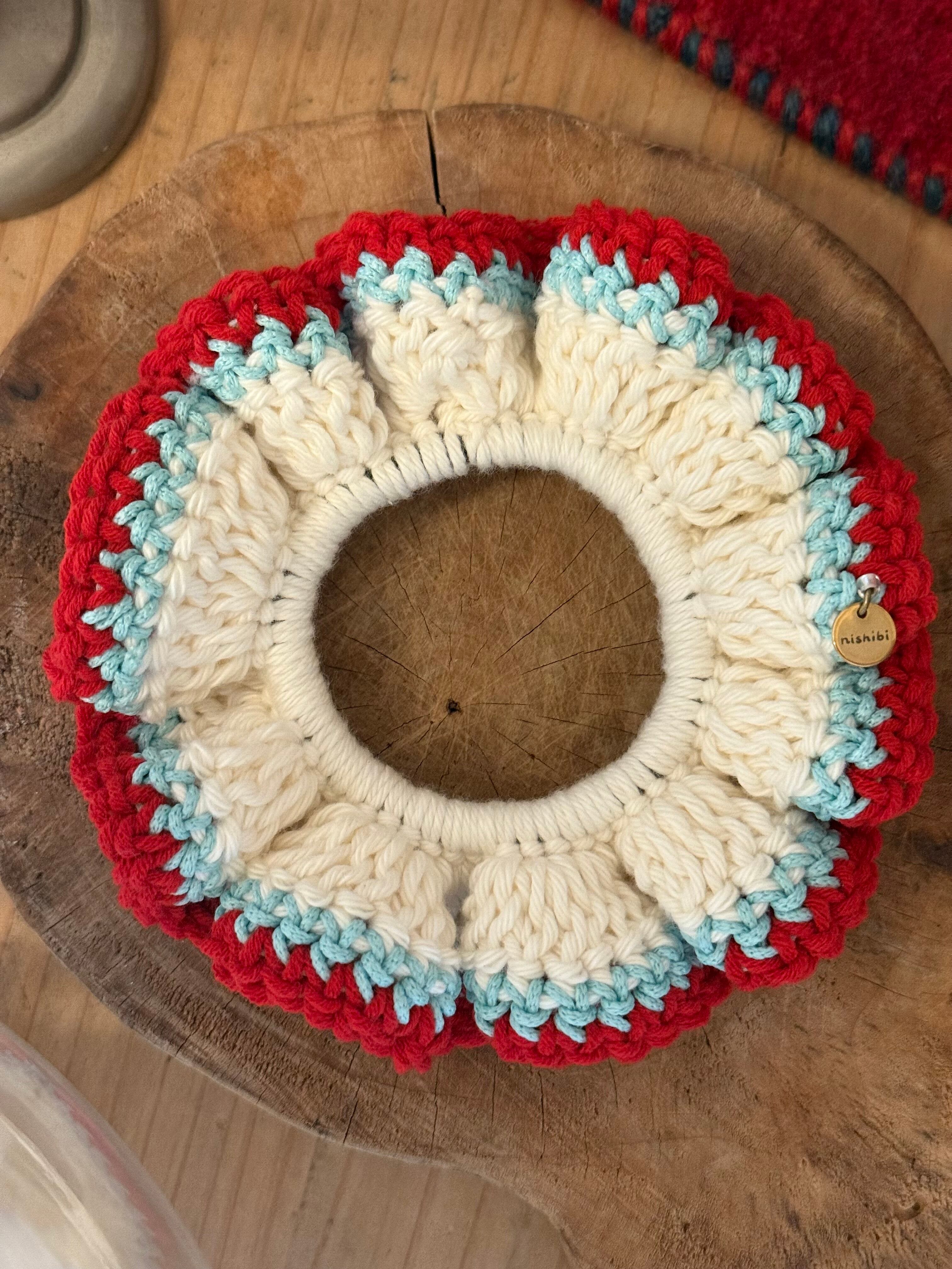 アクセサリー感覚で付けられる手編みのシュシュ。