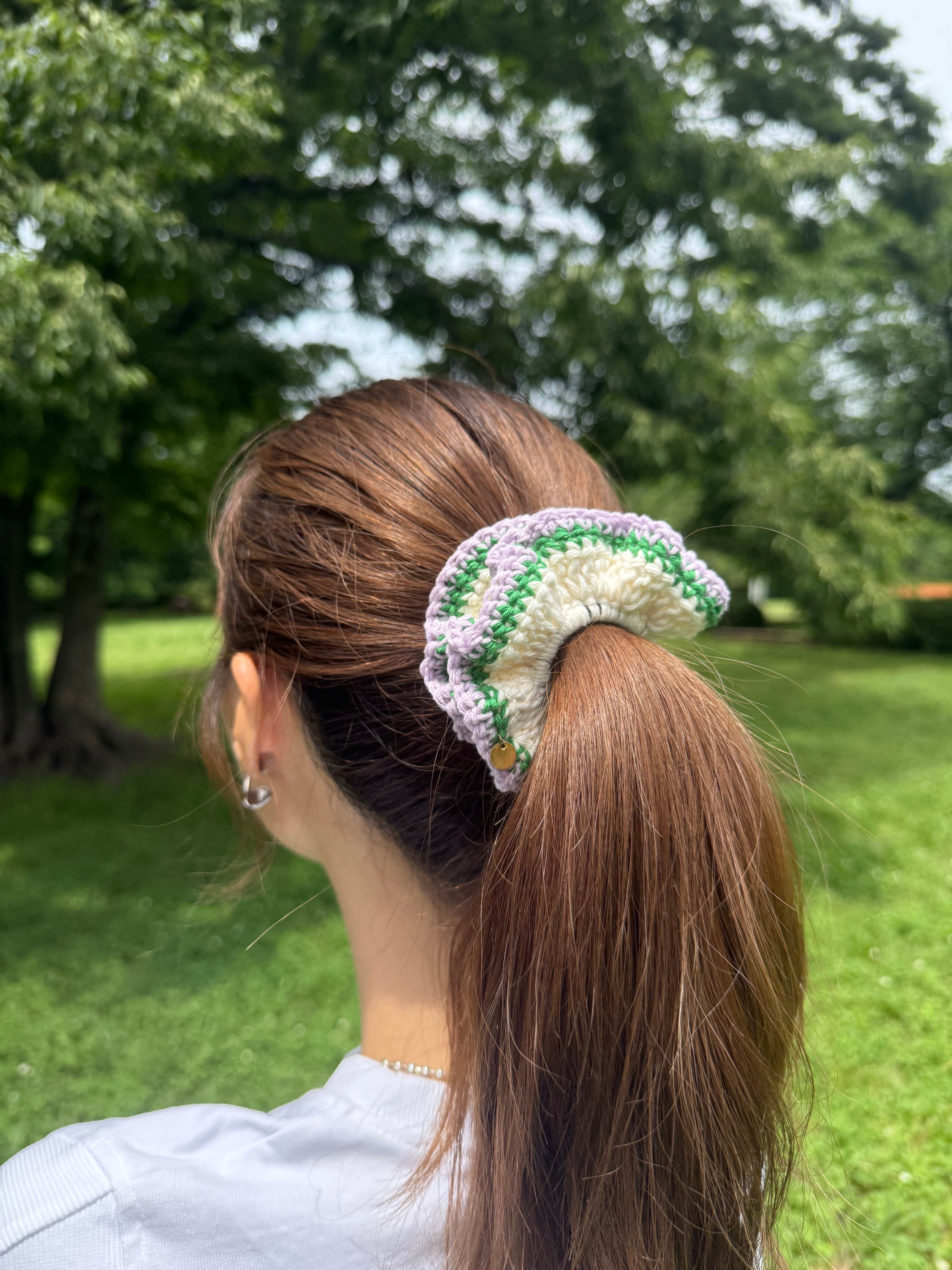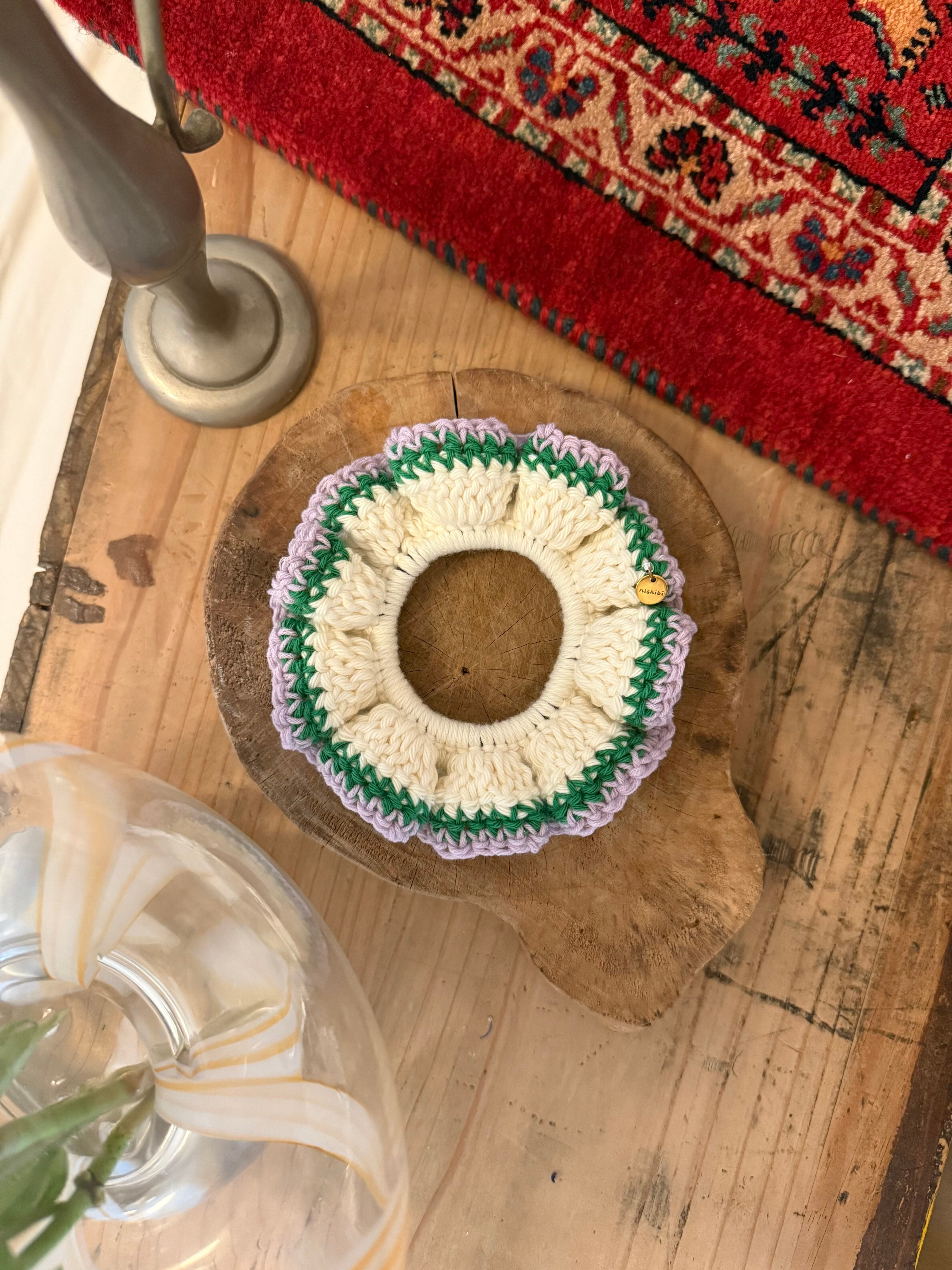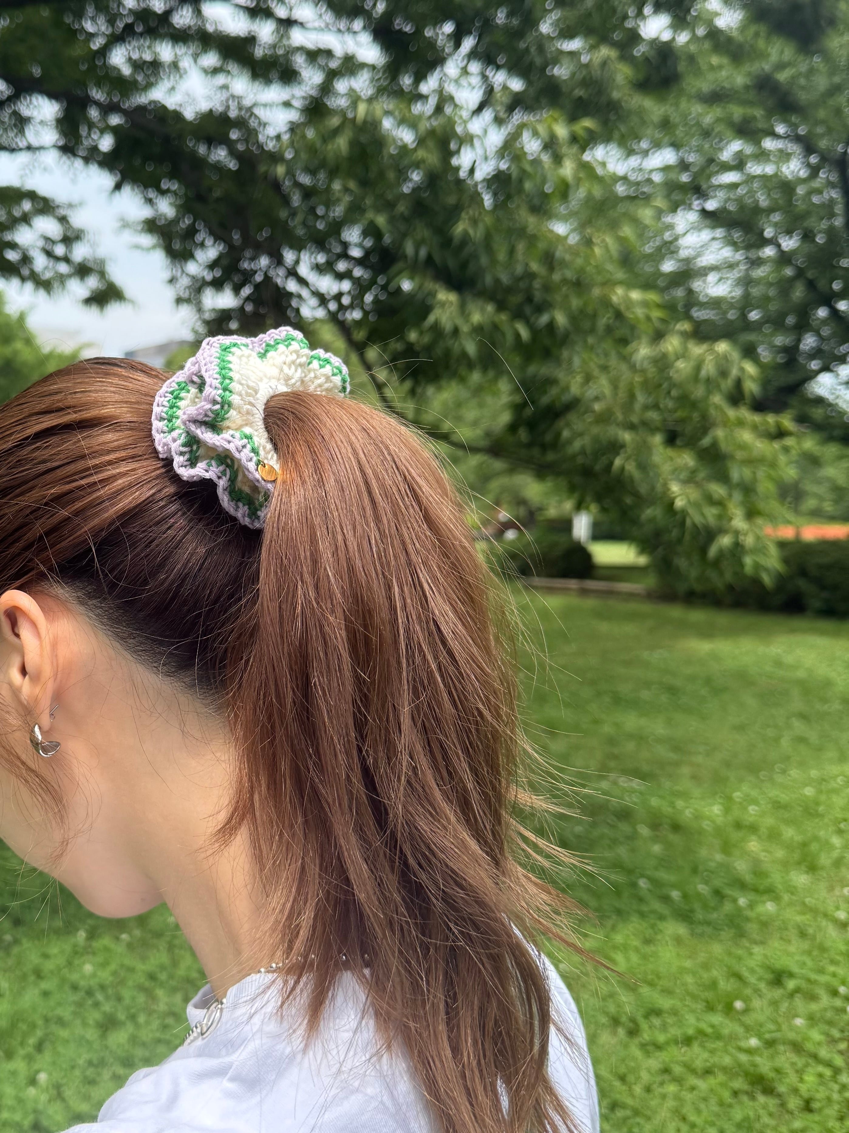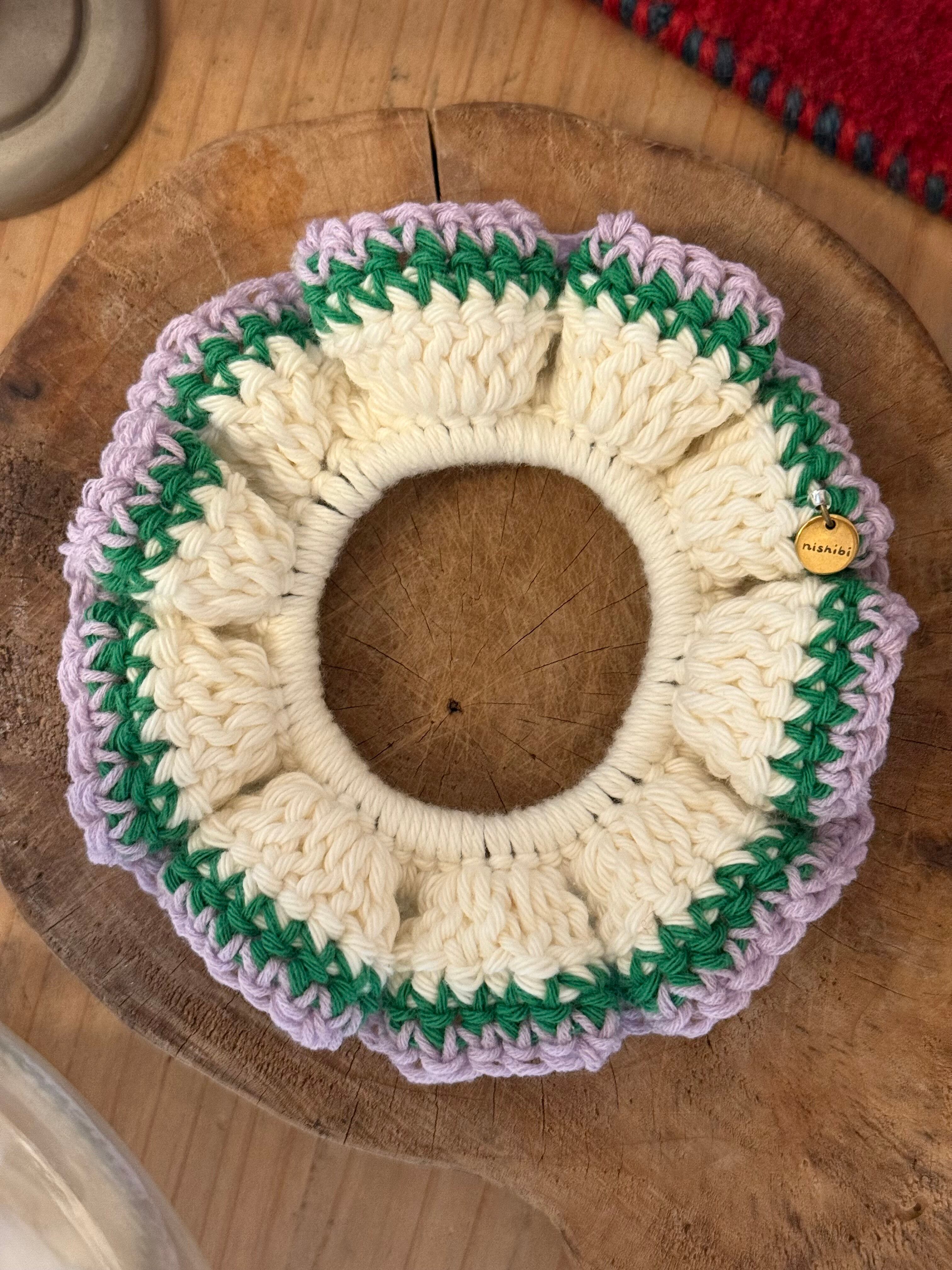 アクセサリー感覚で付けられる手編みのシュシュ。