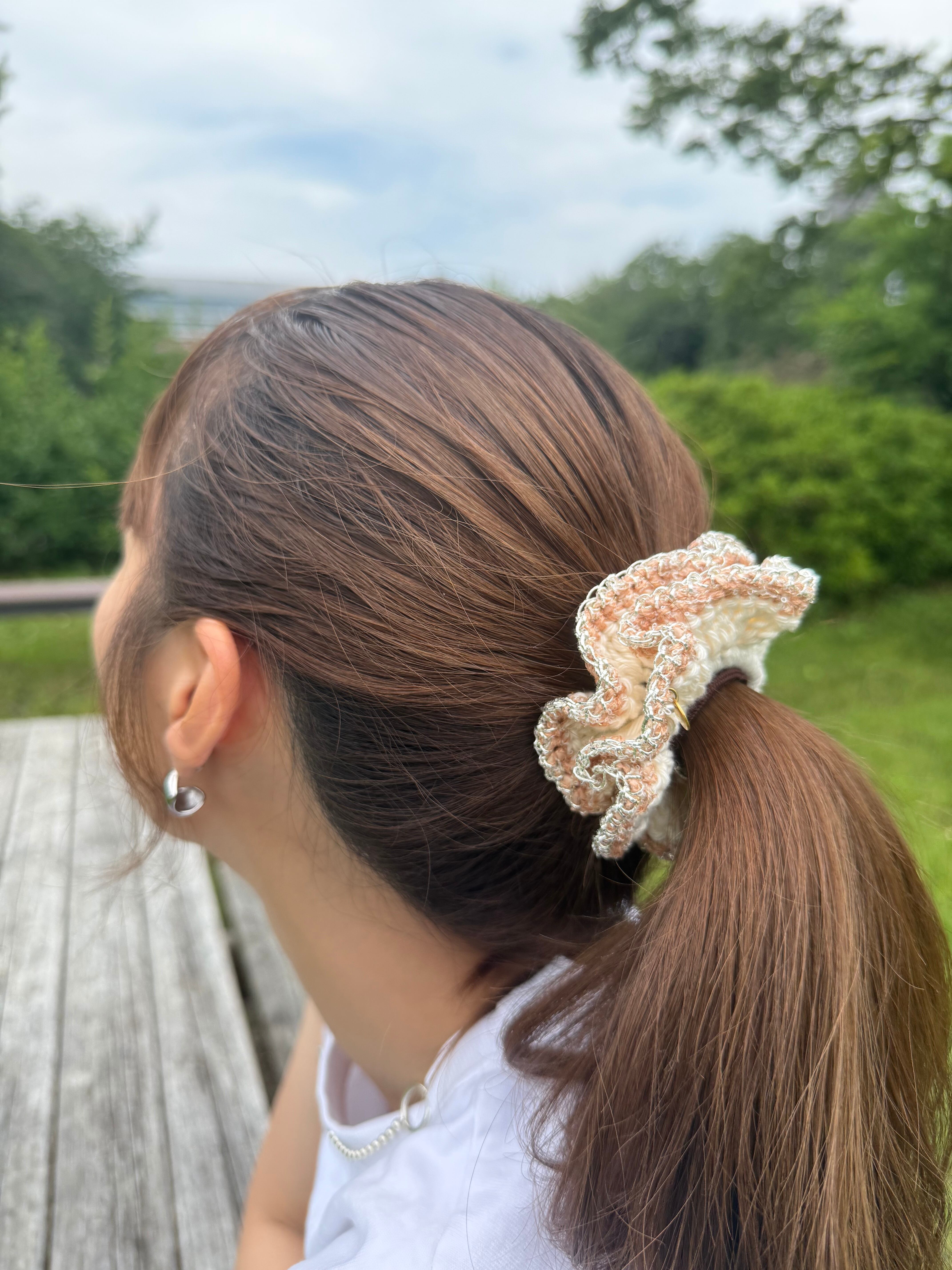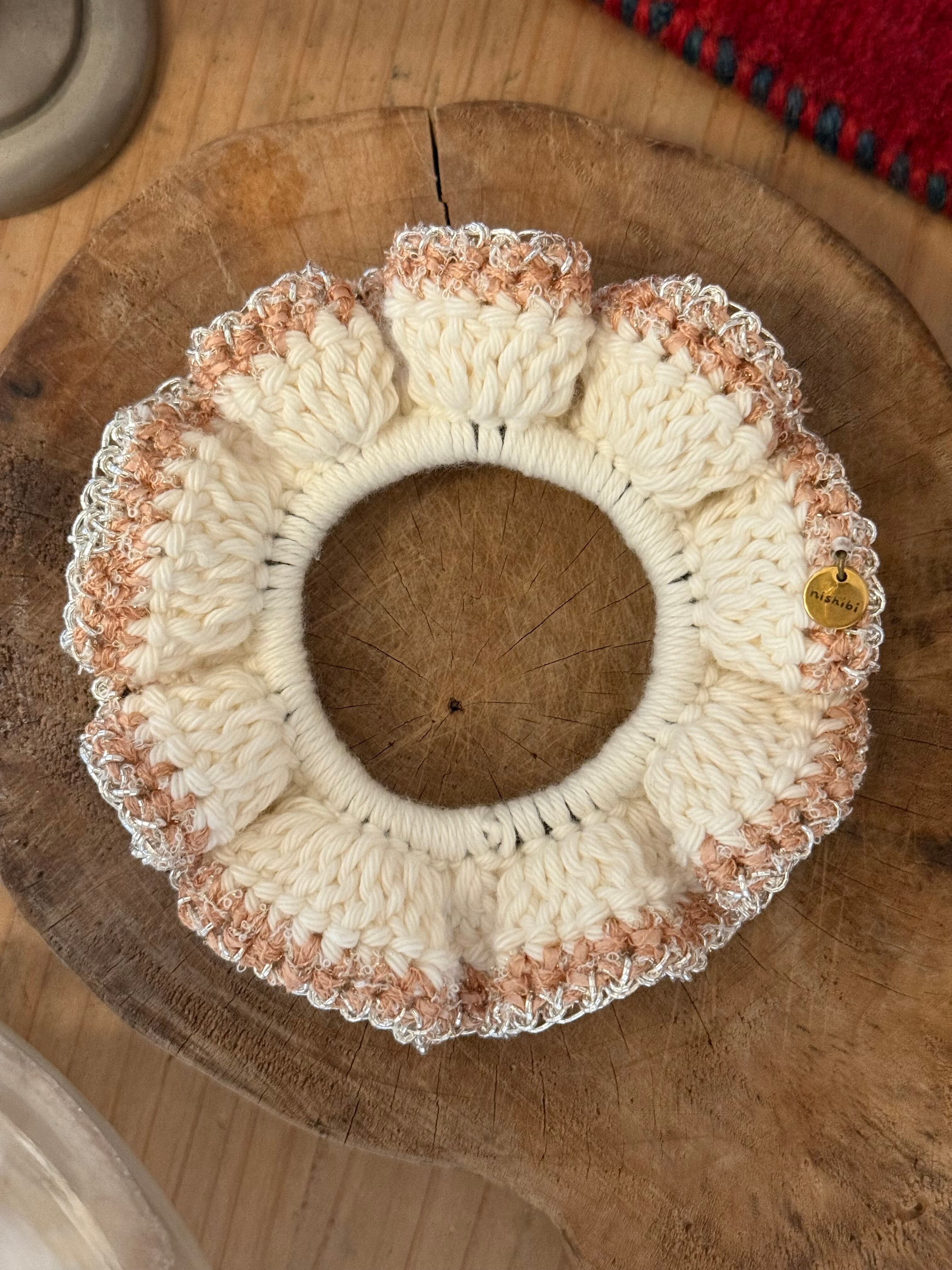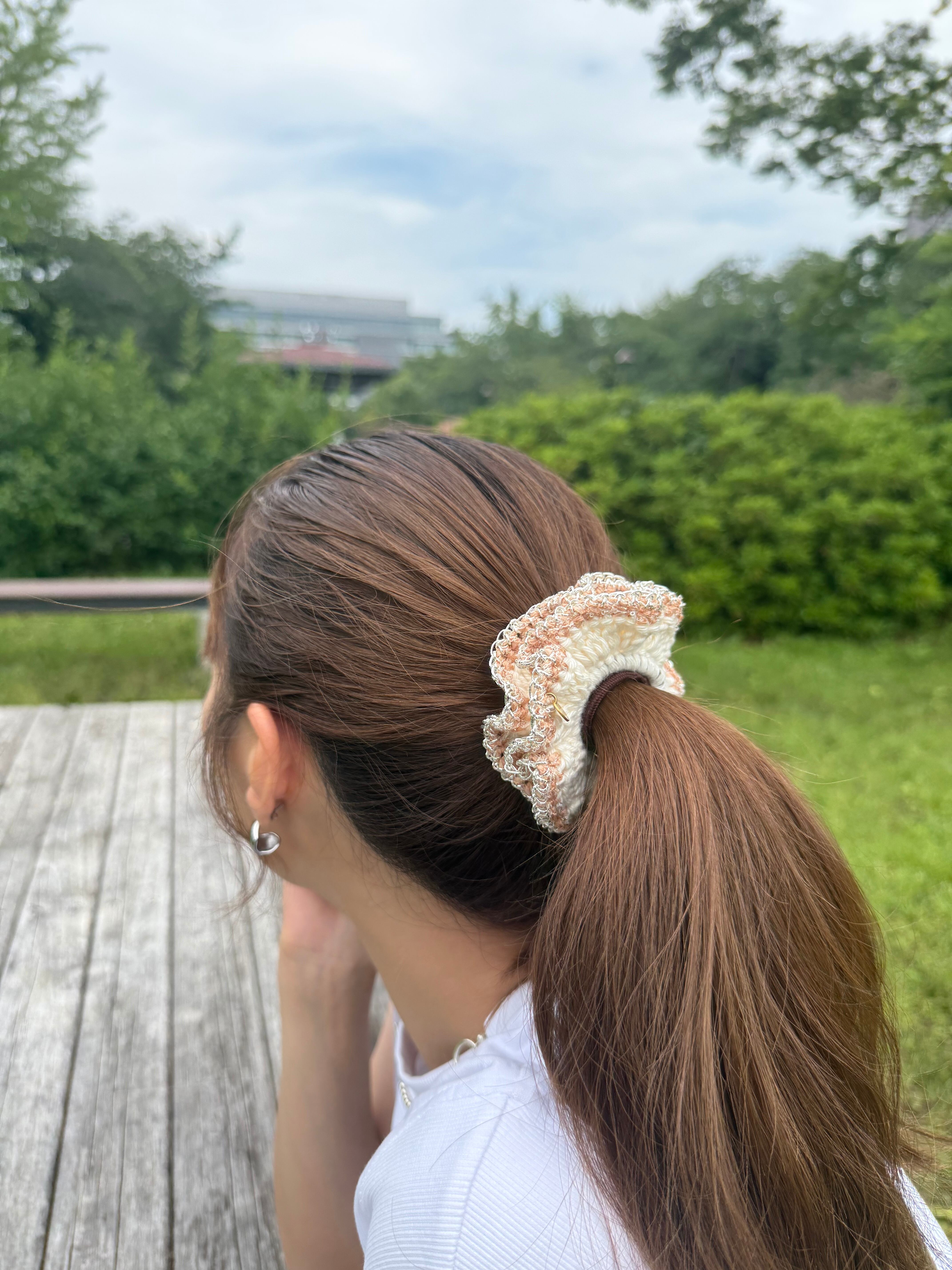 アクセサリー感覚で付けられる手編みのシュシュ。
