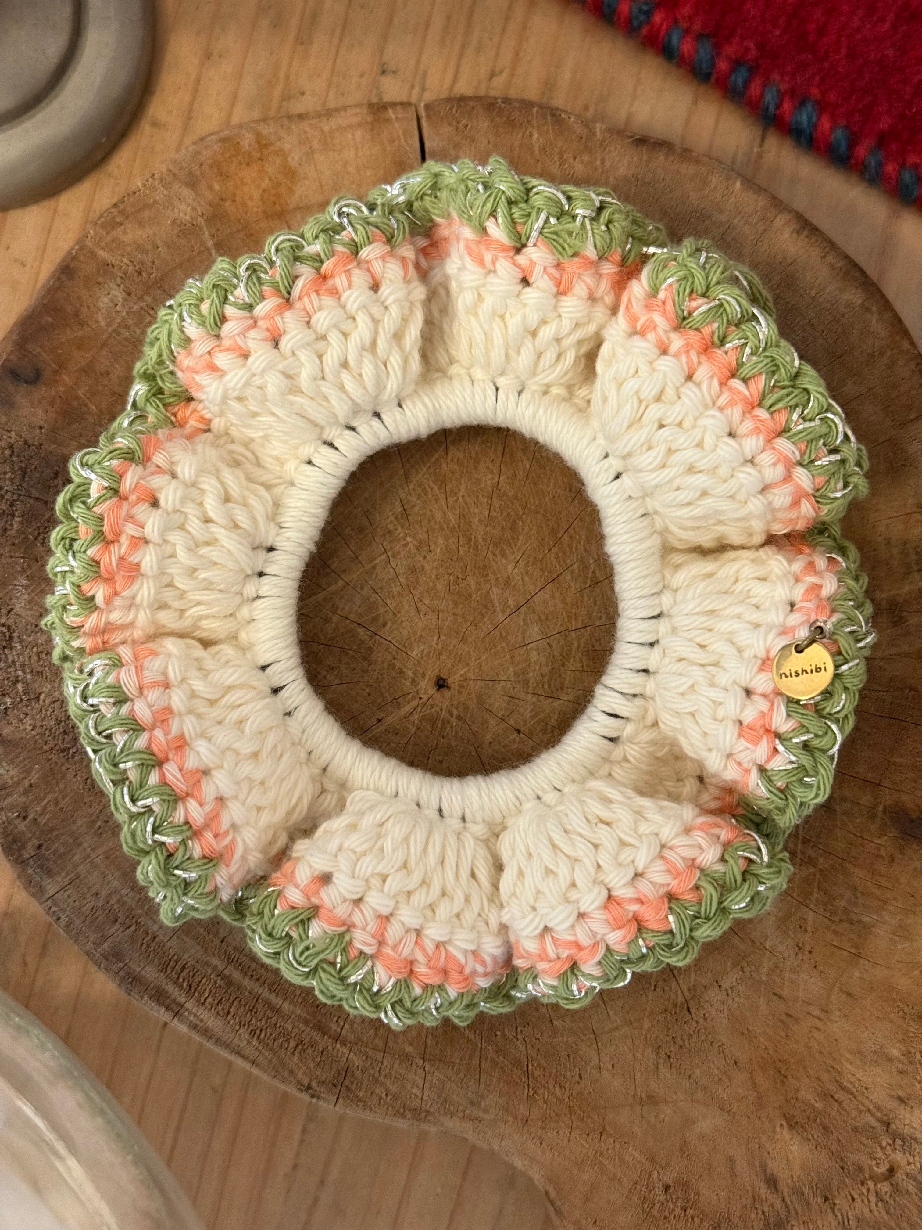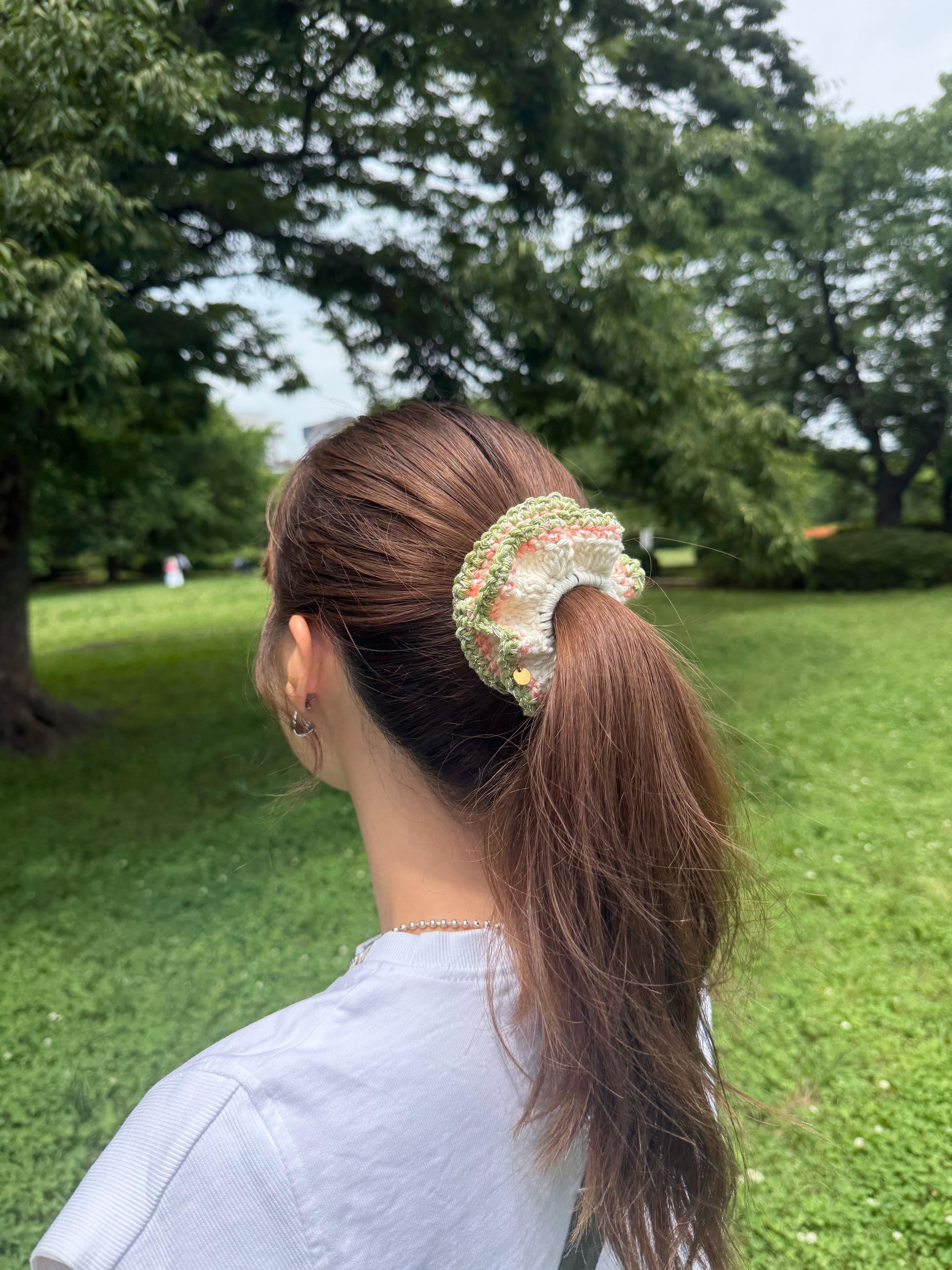 アクセサリー感覚で付けられる手編みのシュシュ。