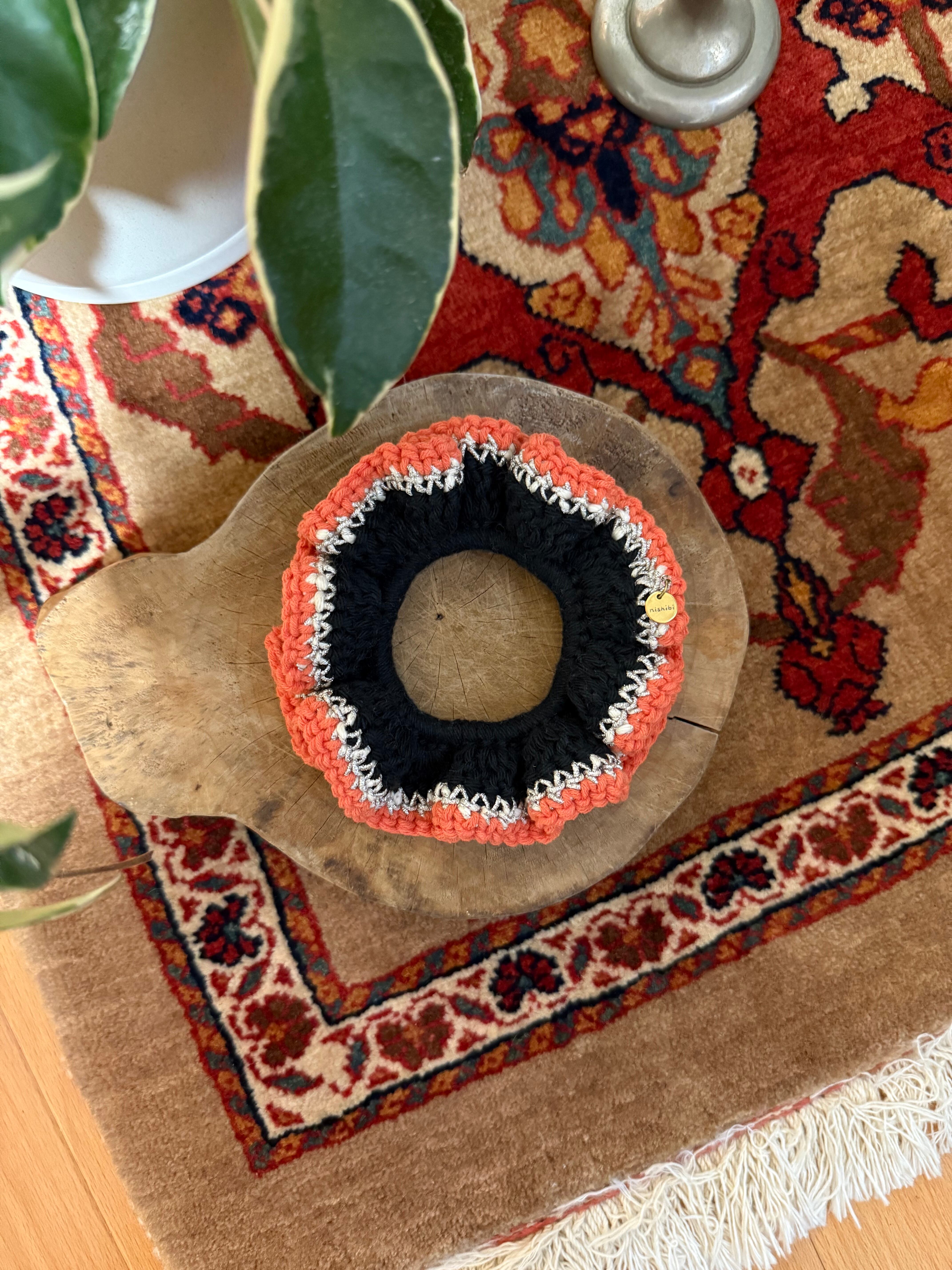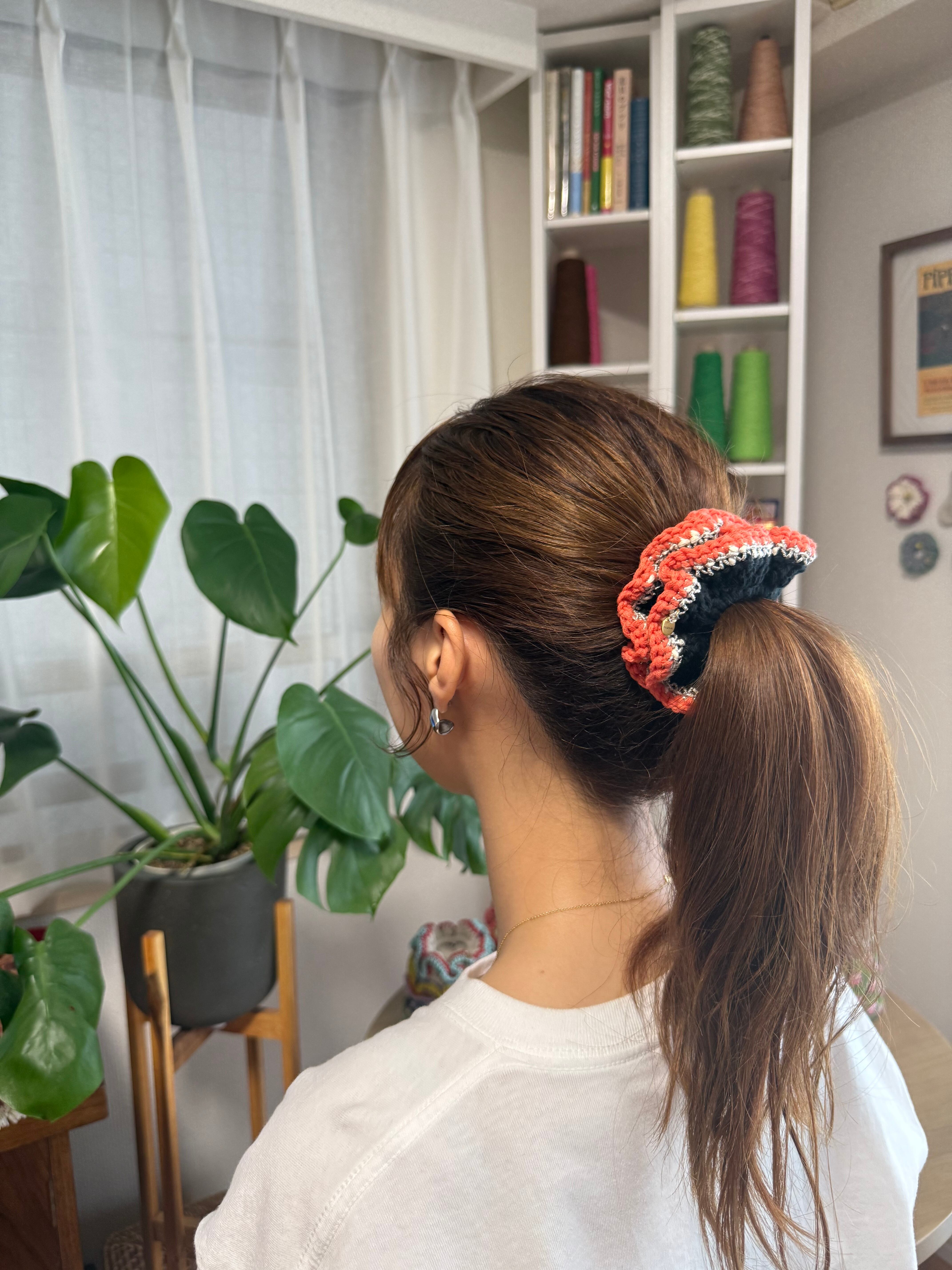 アクセサリー感覚で付けられる手編みのシュシュ。