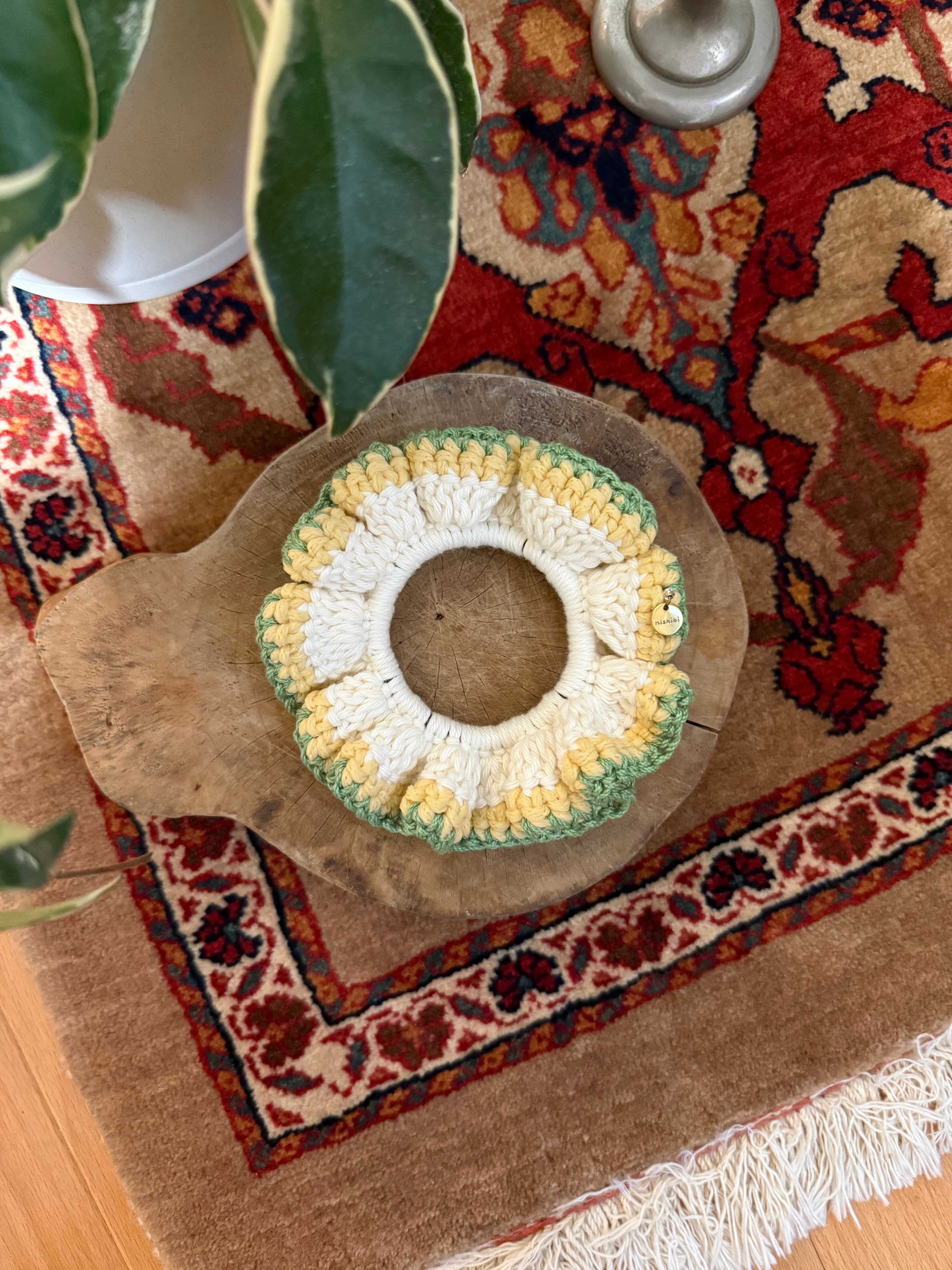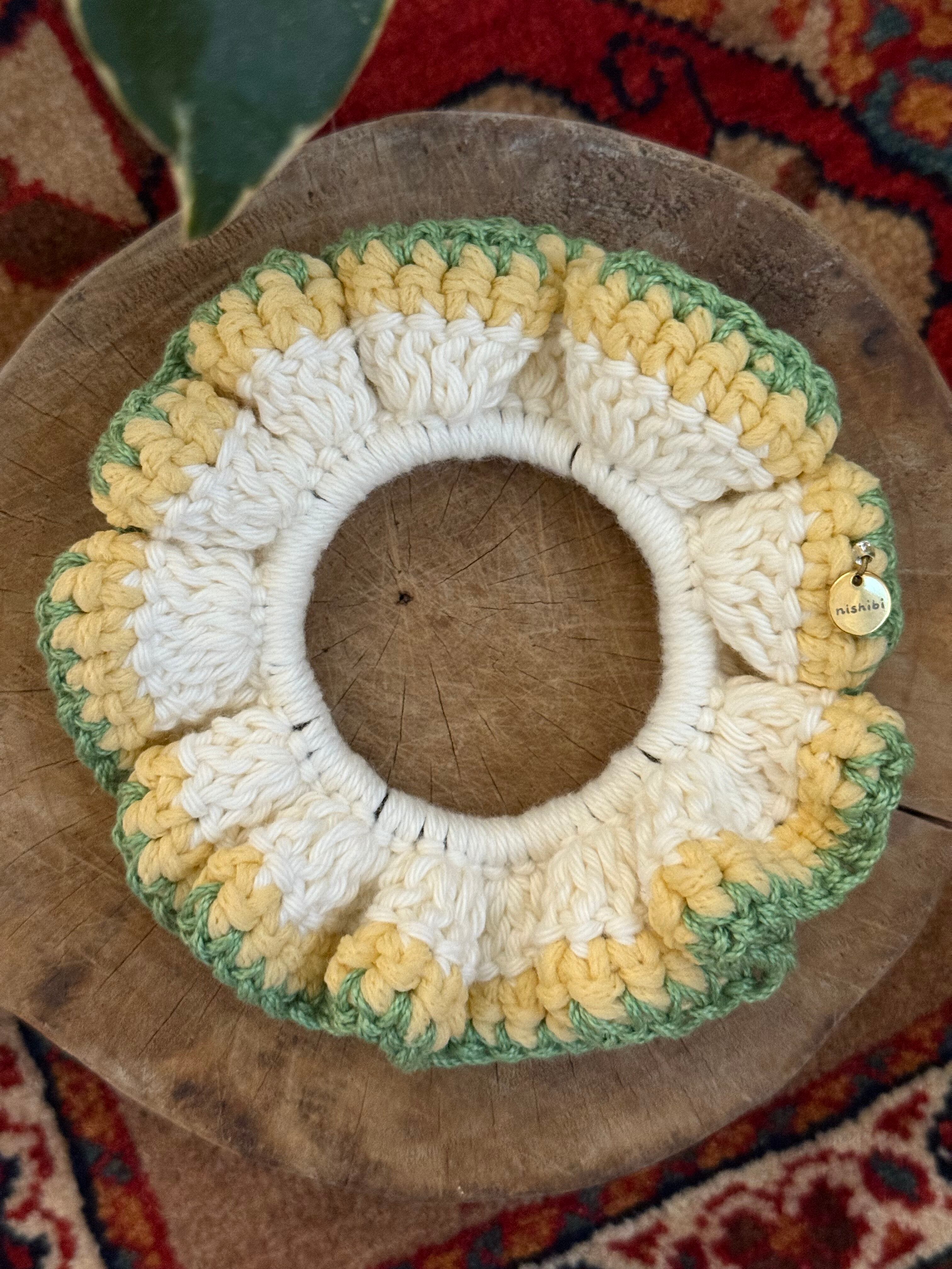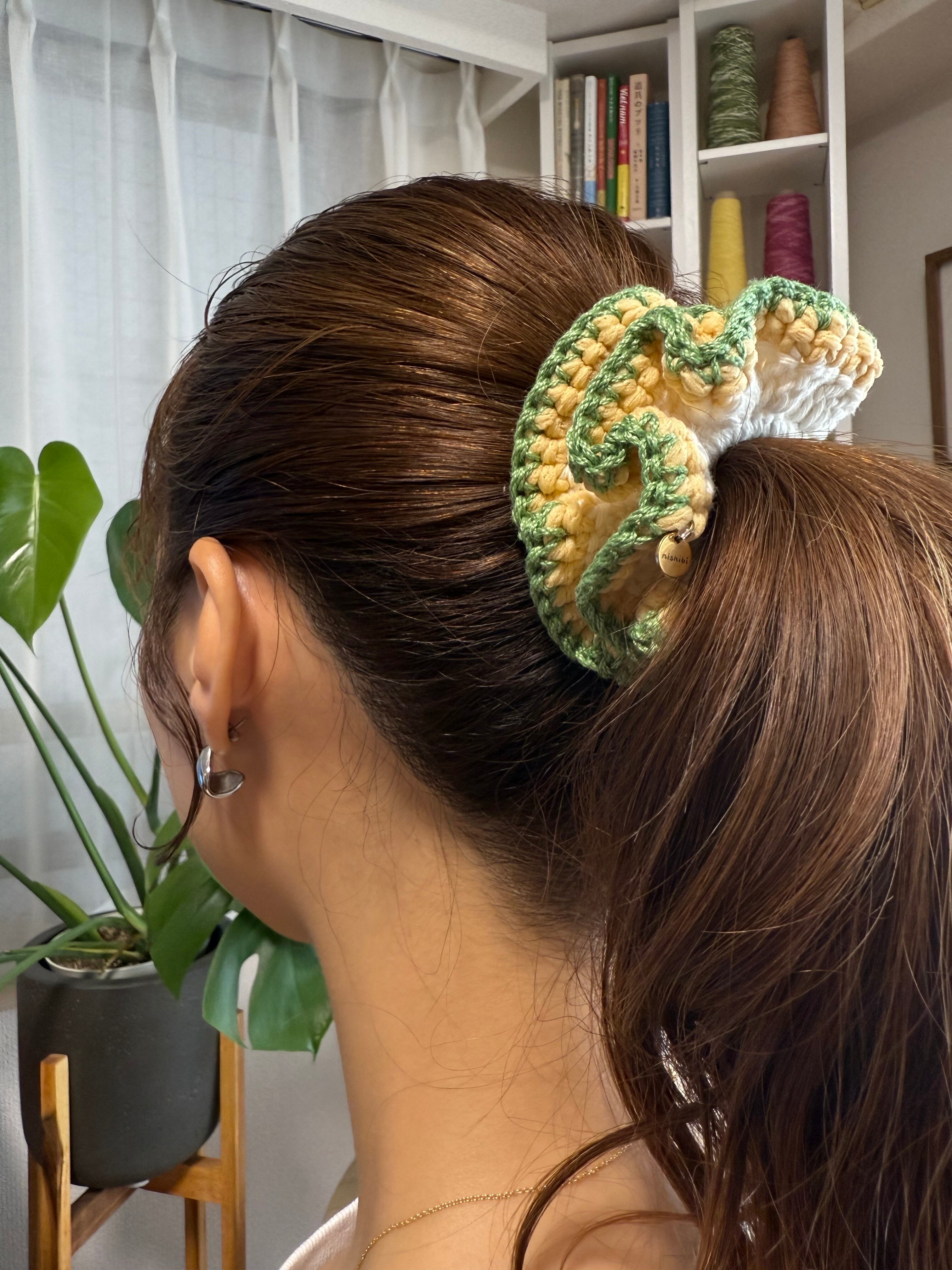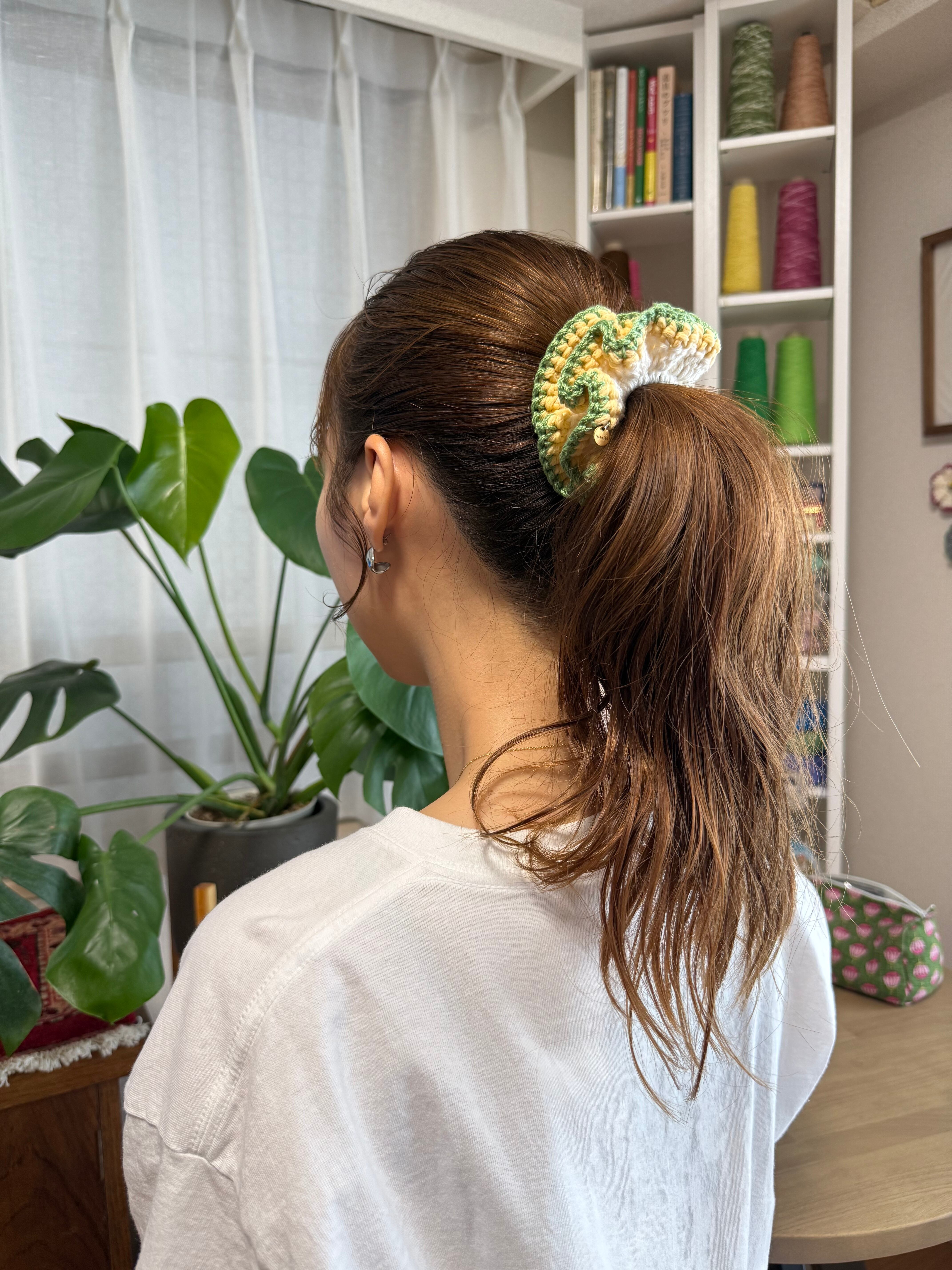 アクセサリー感覚で付けられる手編みのシュシュ。
