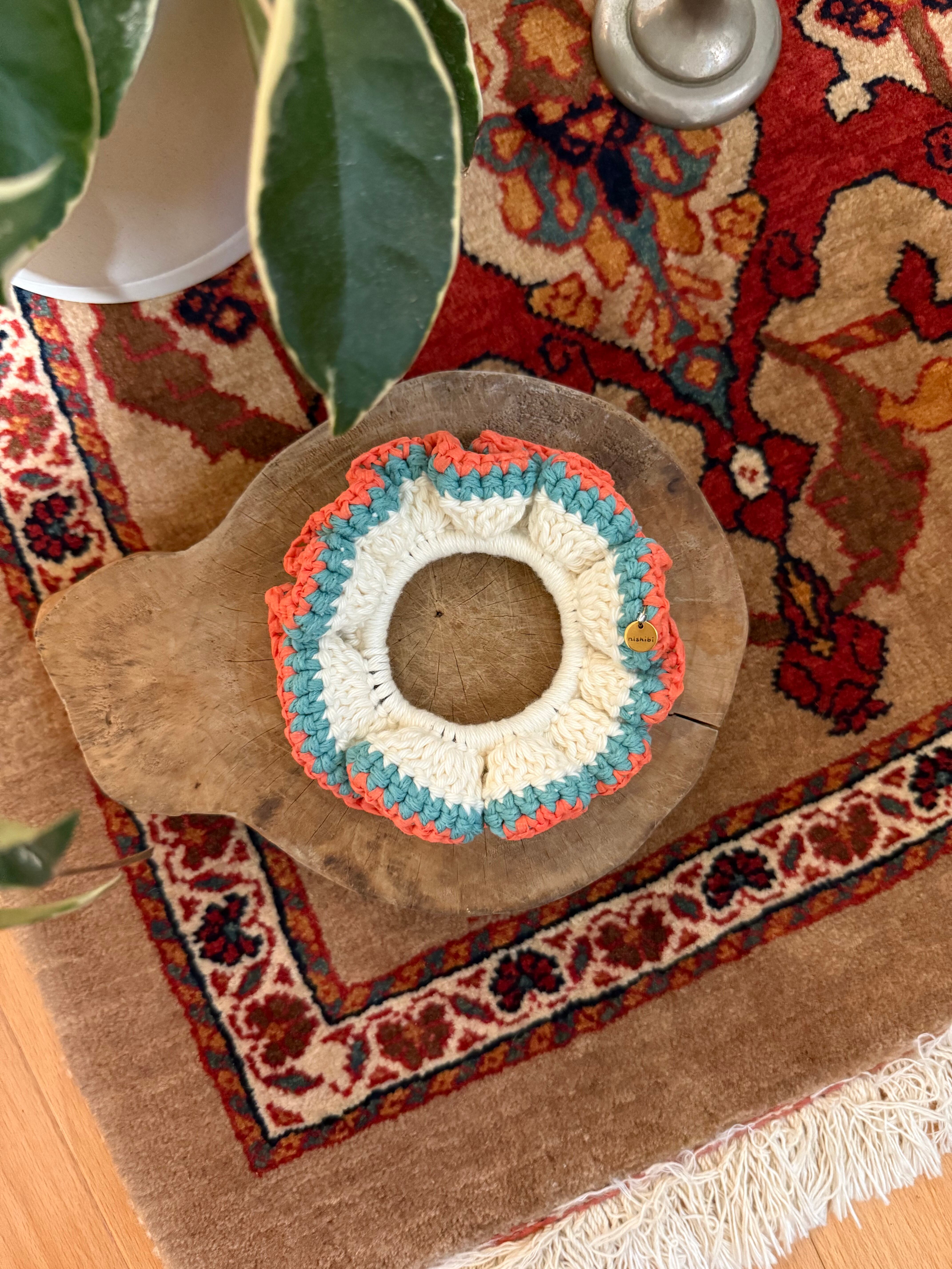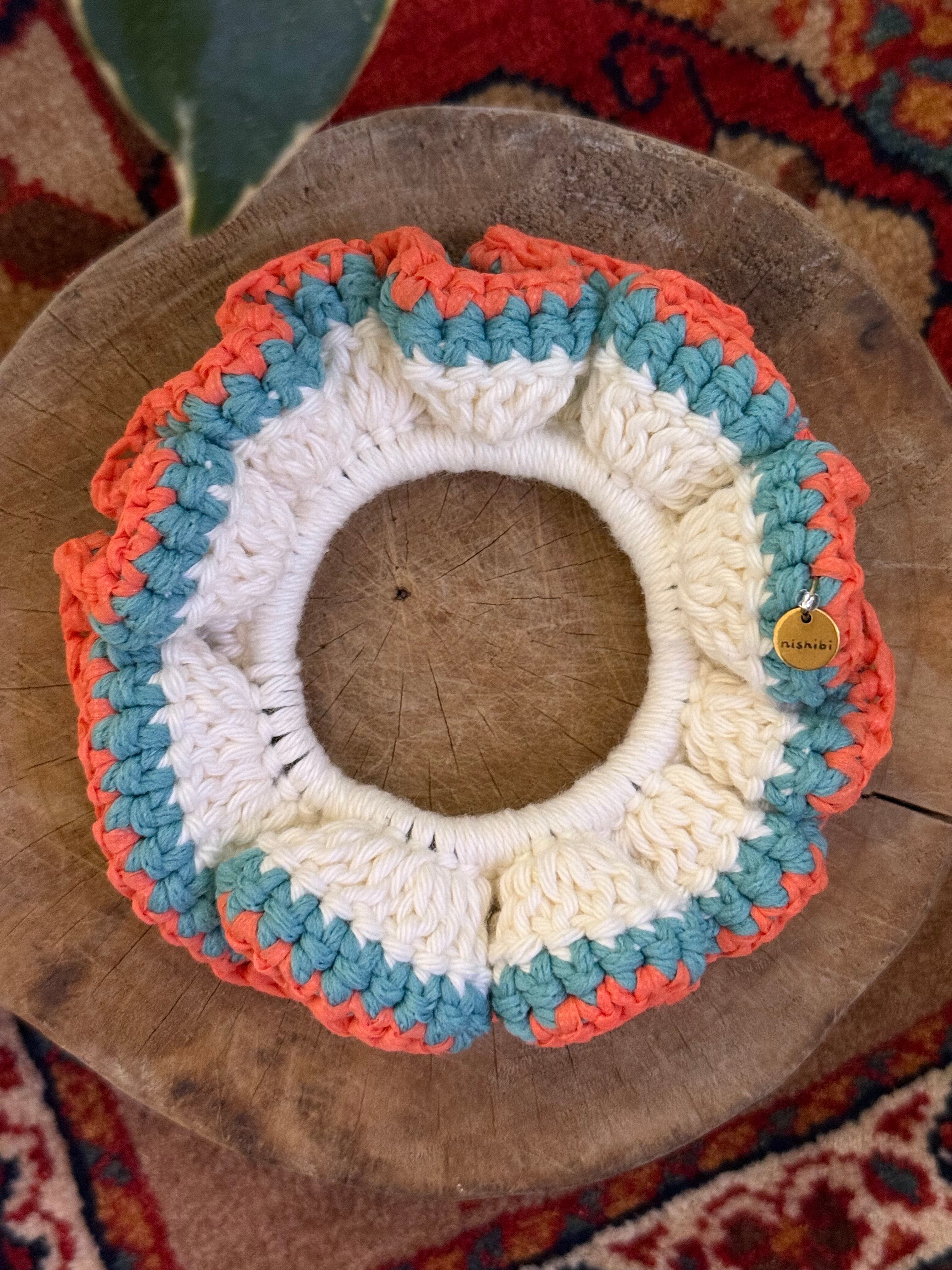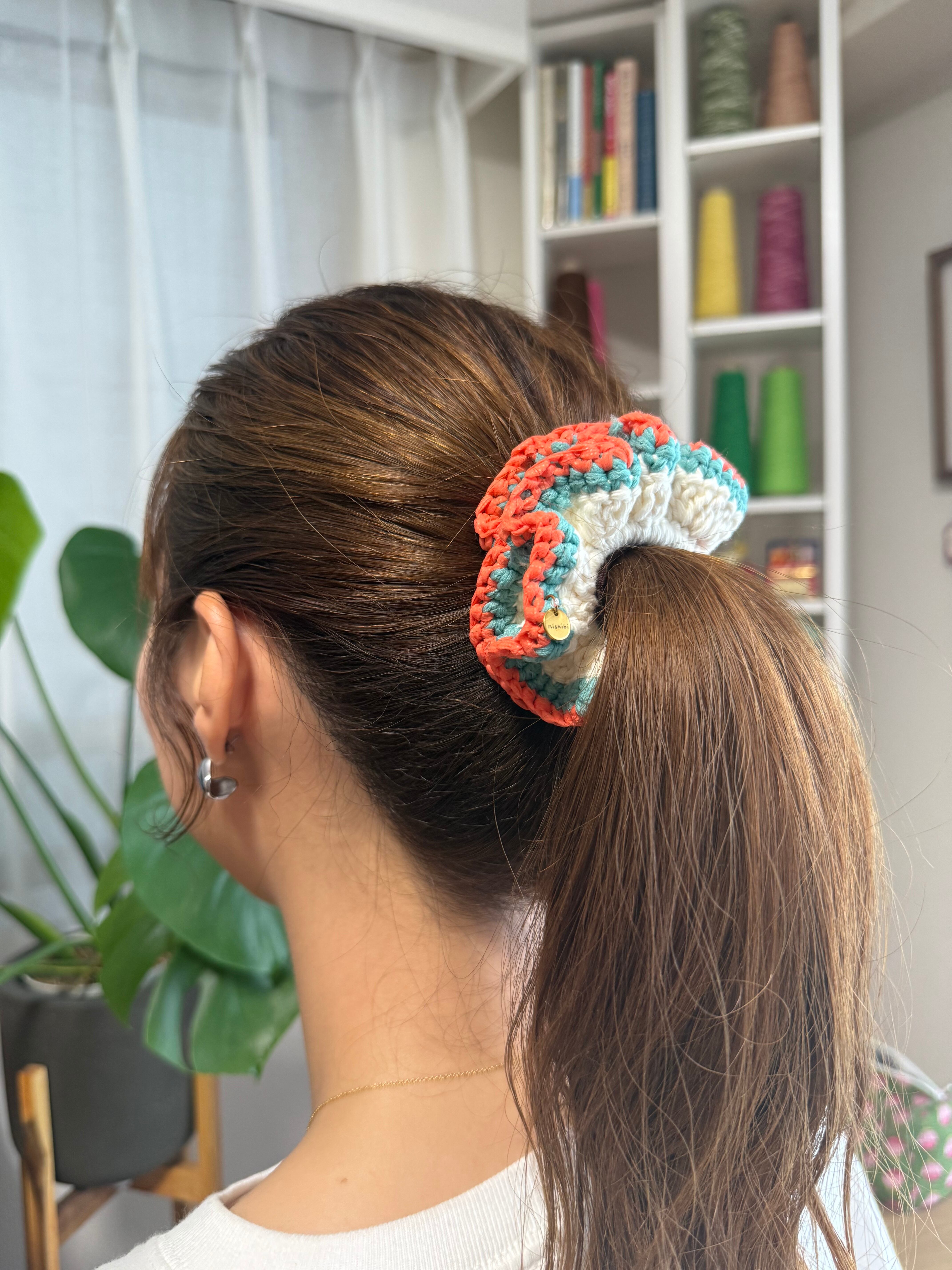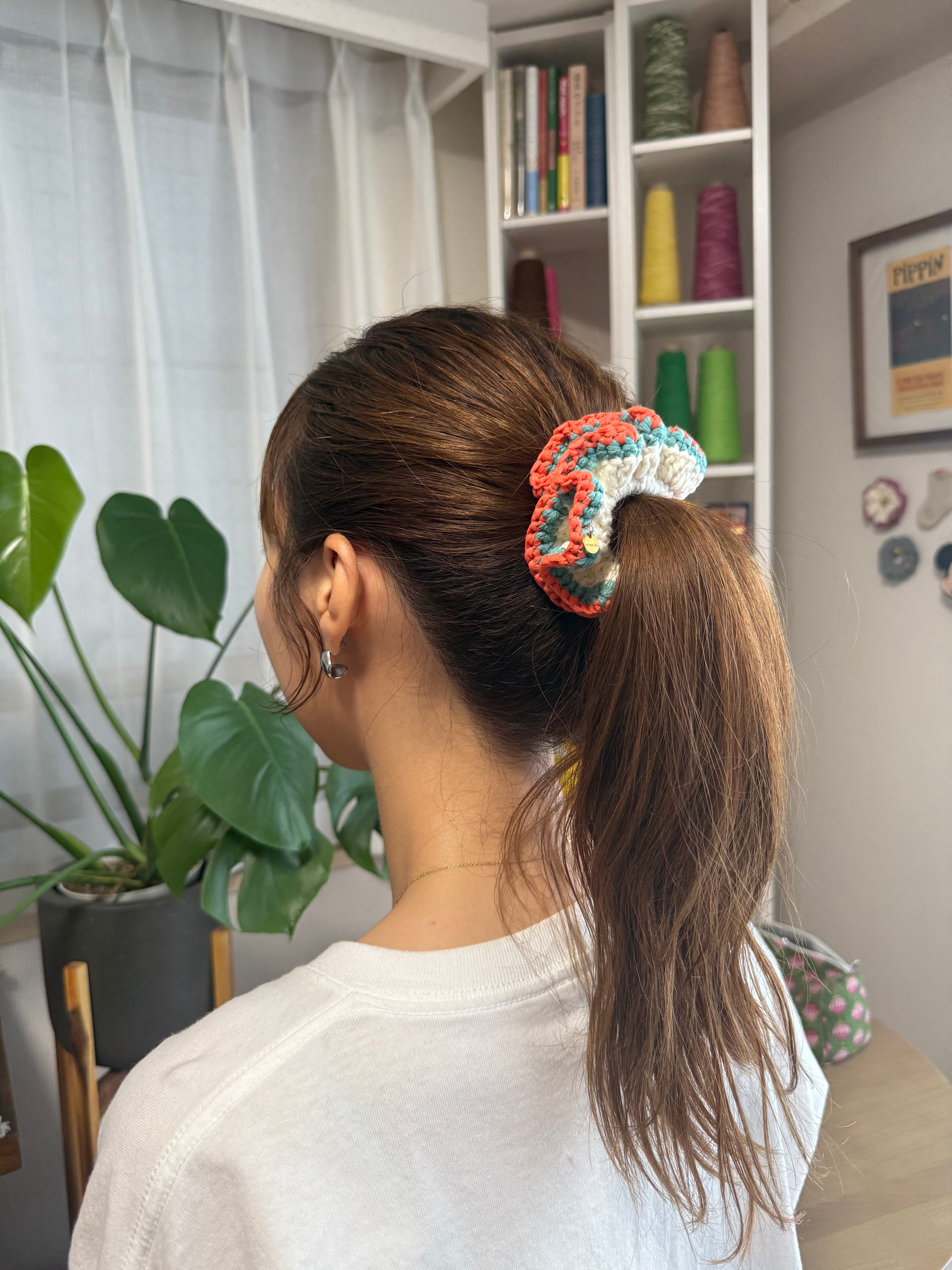 アクセサリー感覚で付けられる手編みのシュシュ。