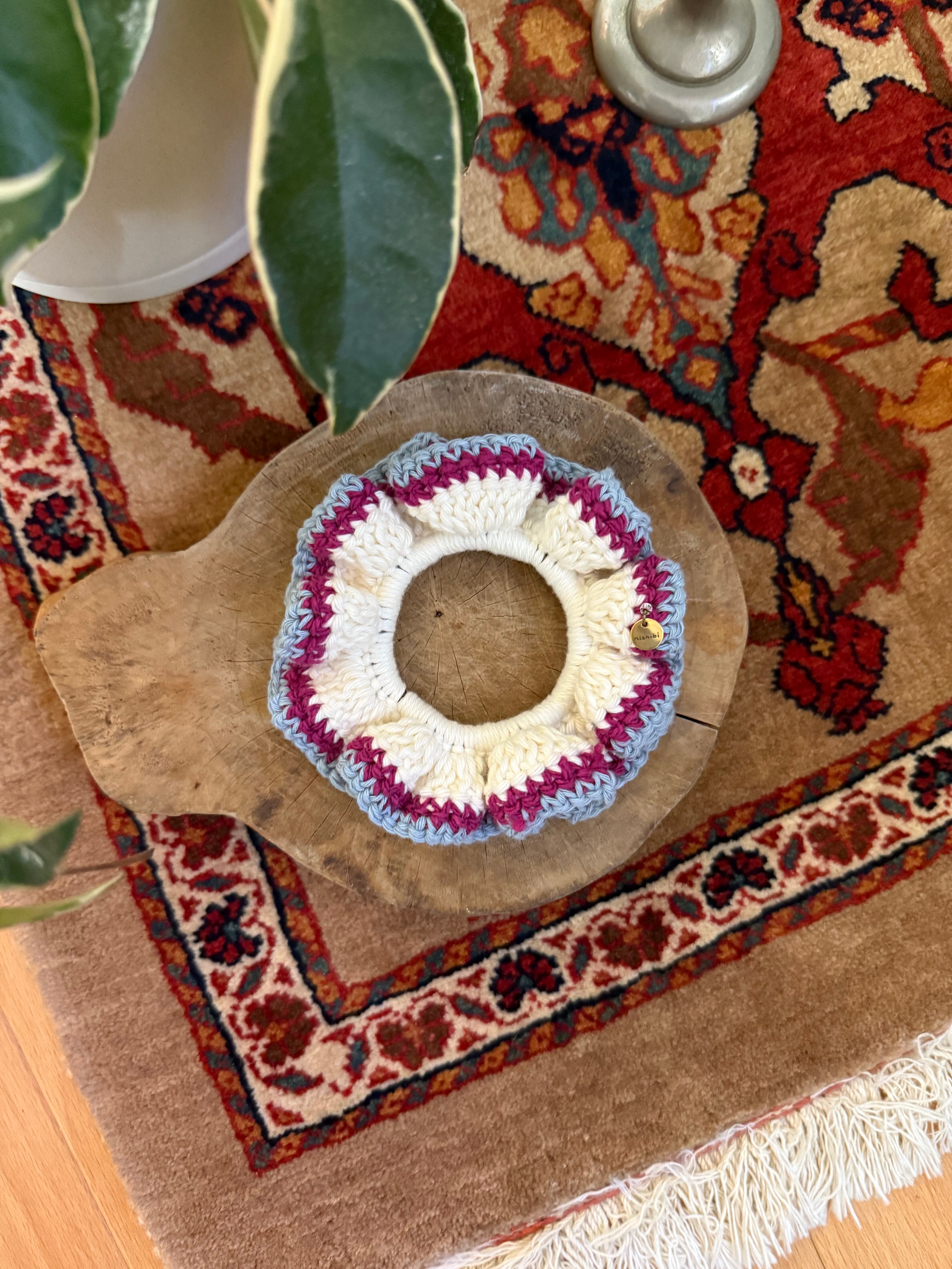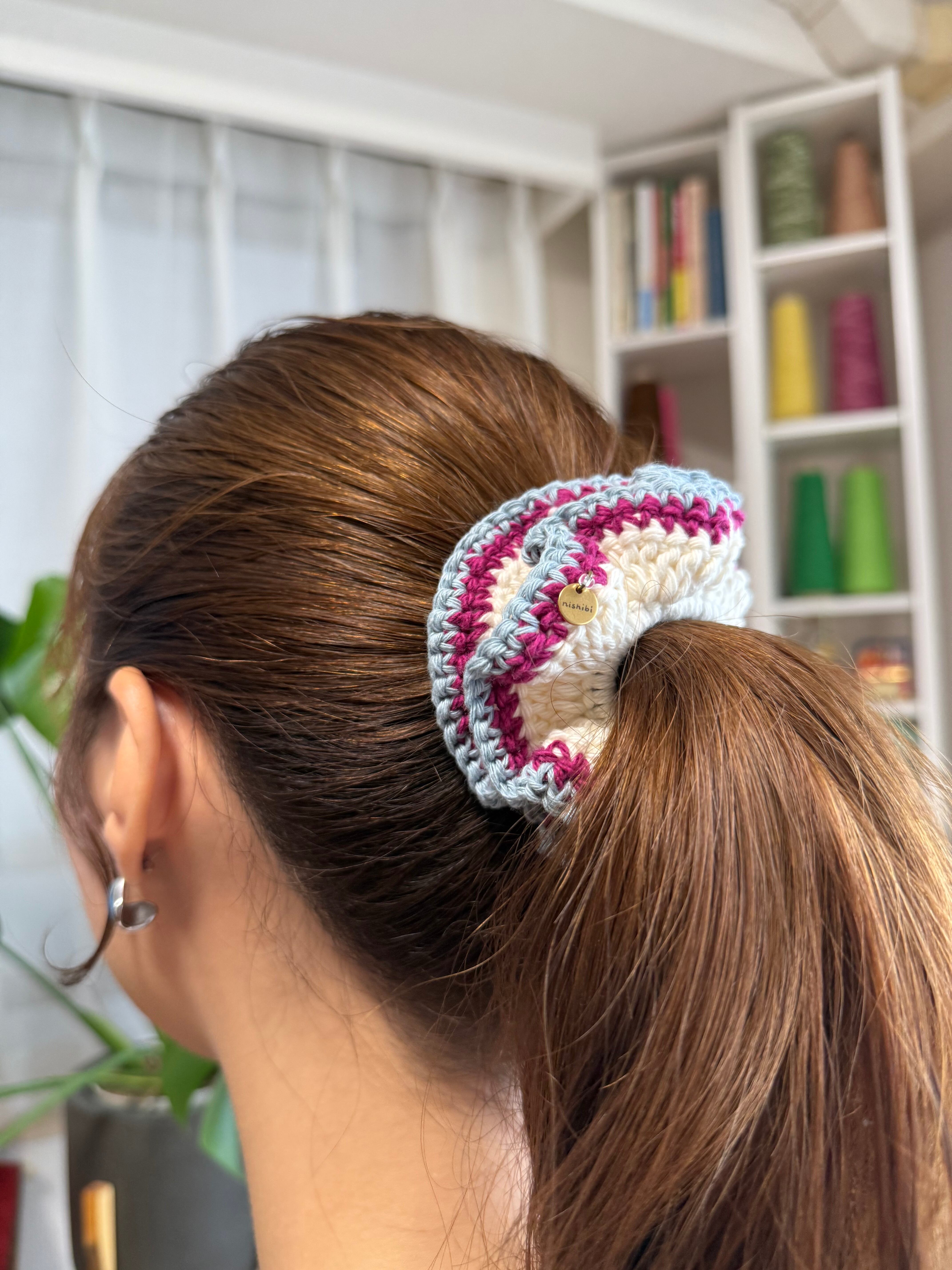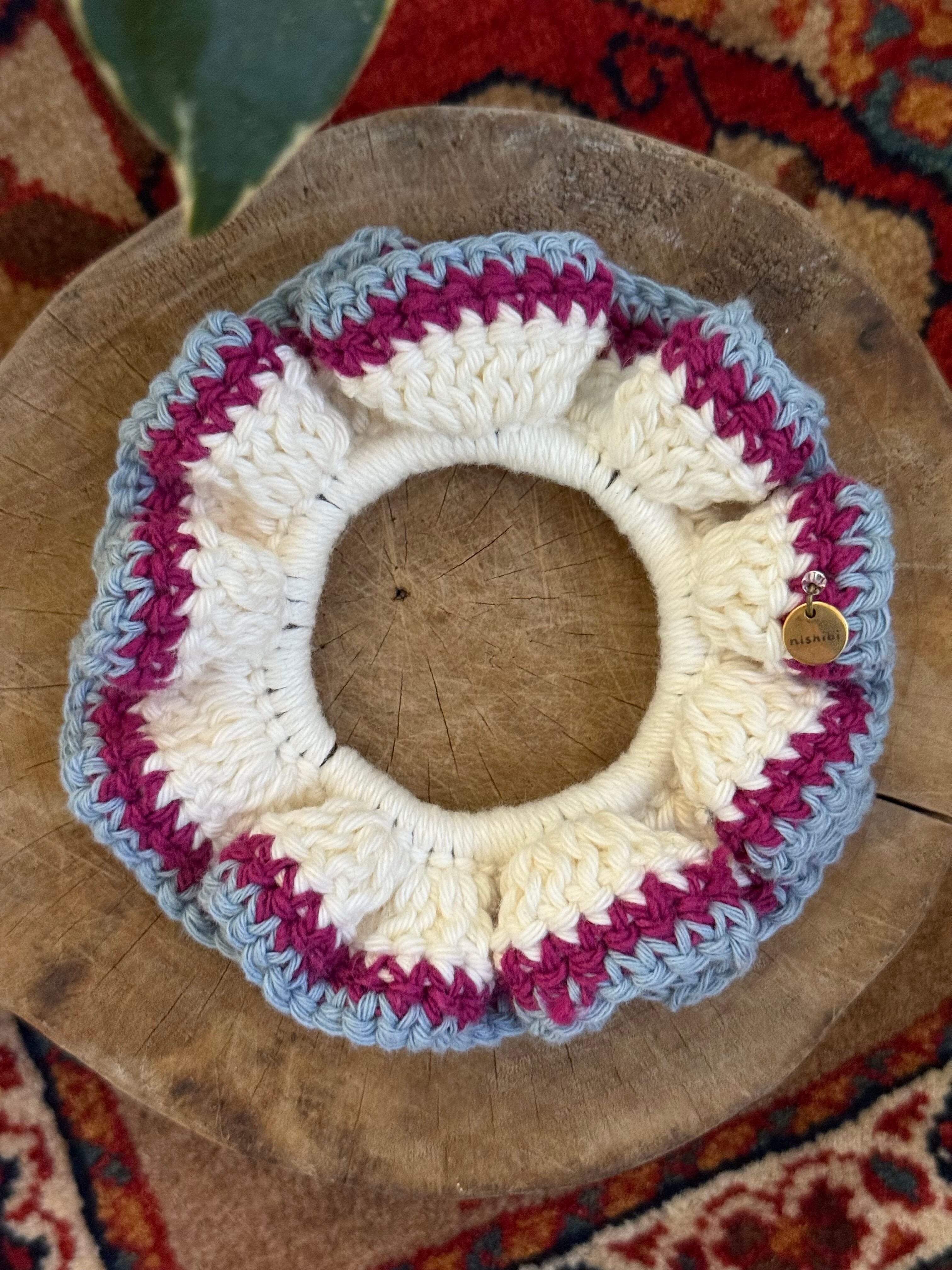 アクセサリー感覚で付けられる手編みのシュシュ。