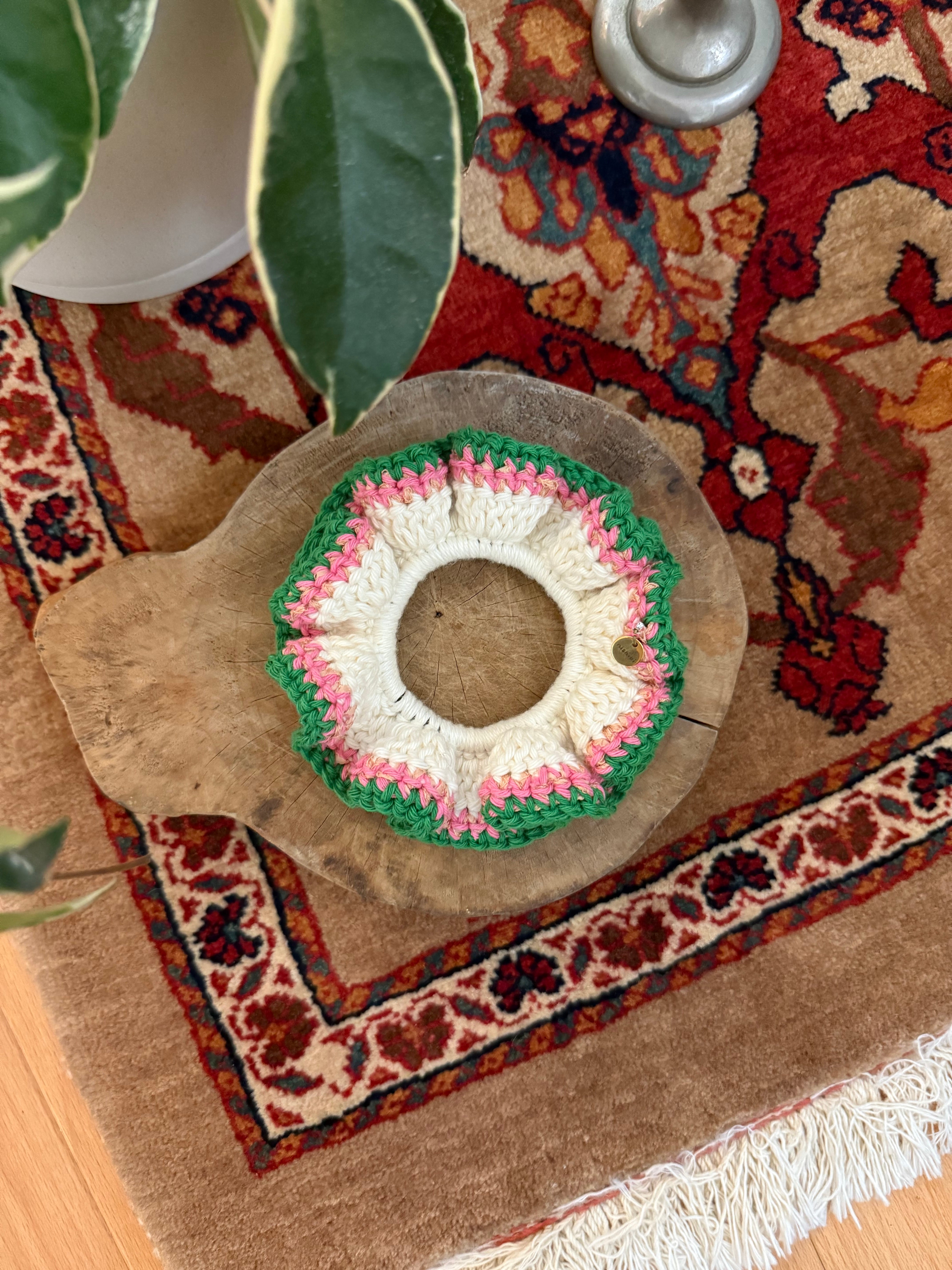 アクセサリー感覚で付けられる手編みのシュシュ。