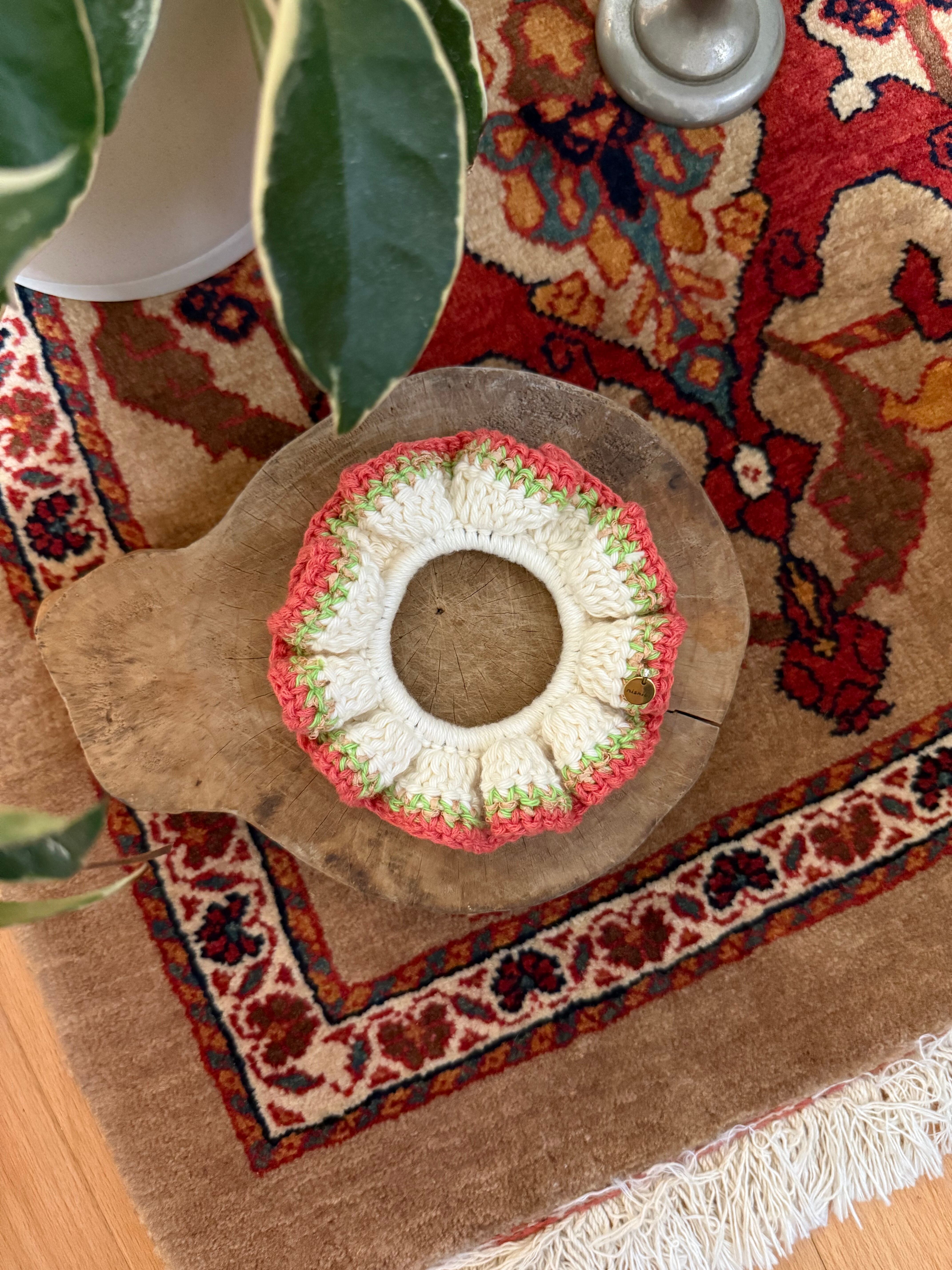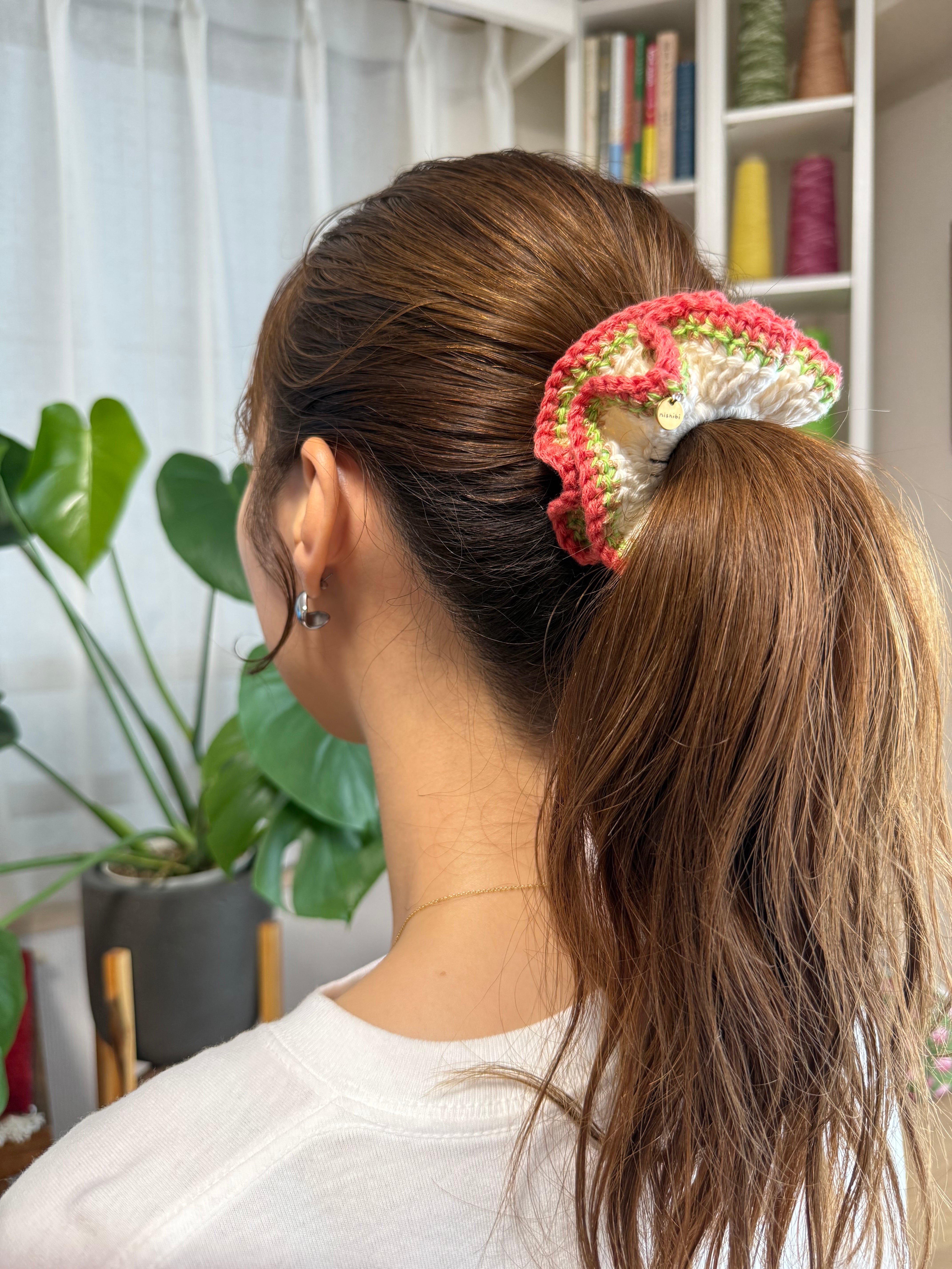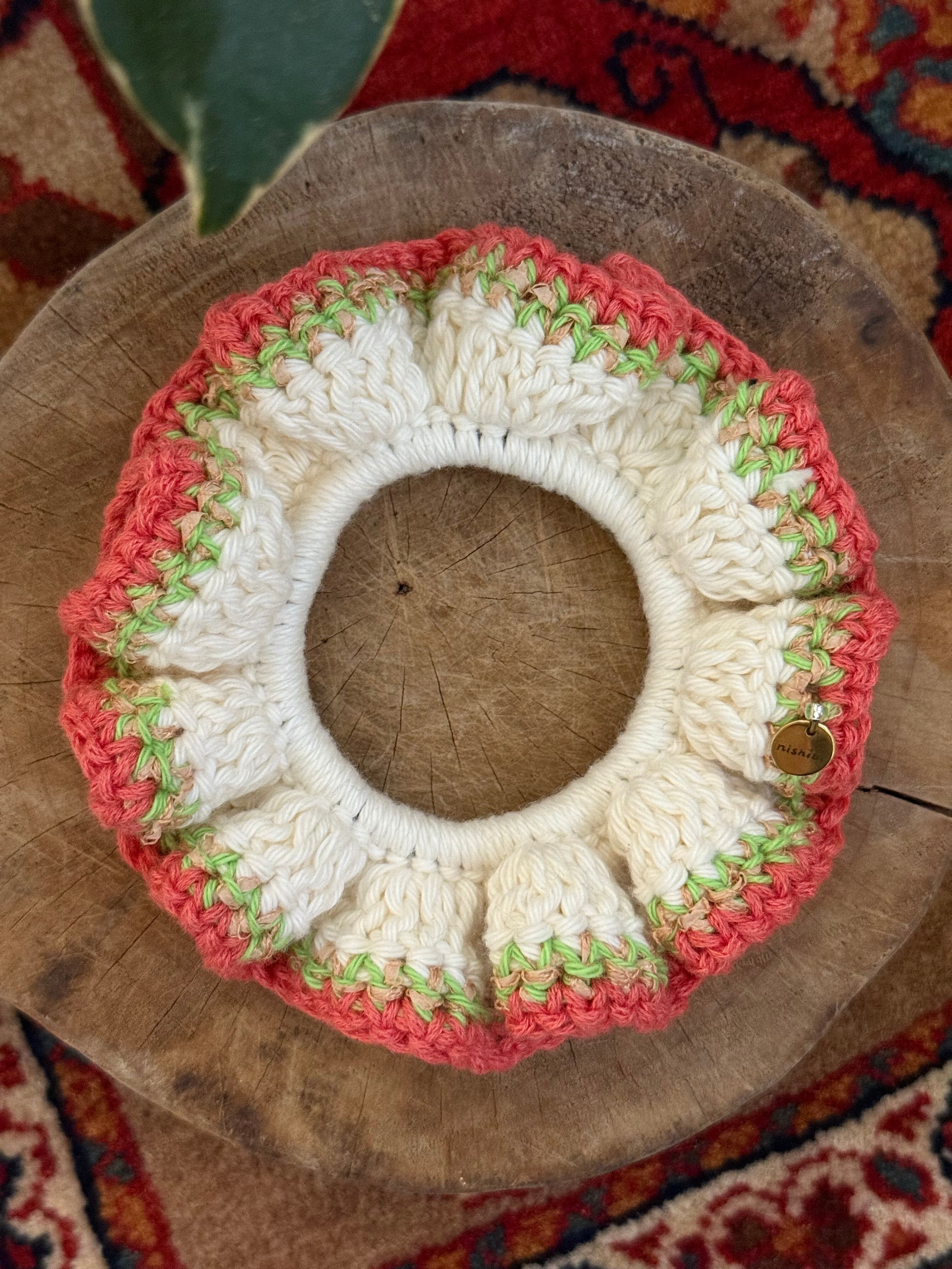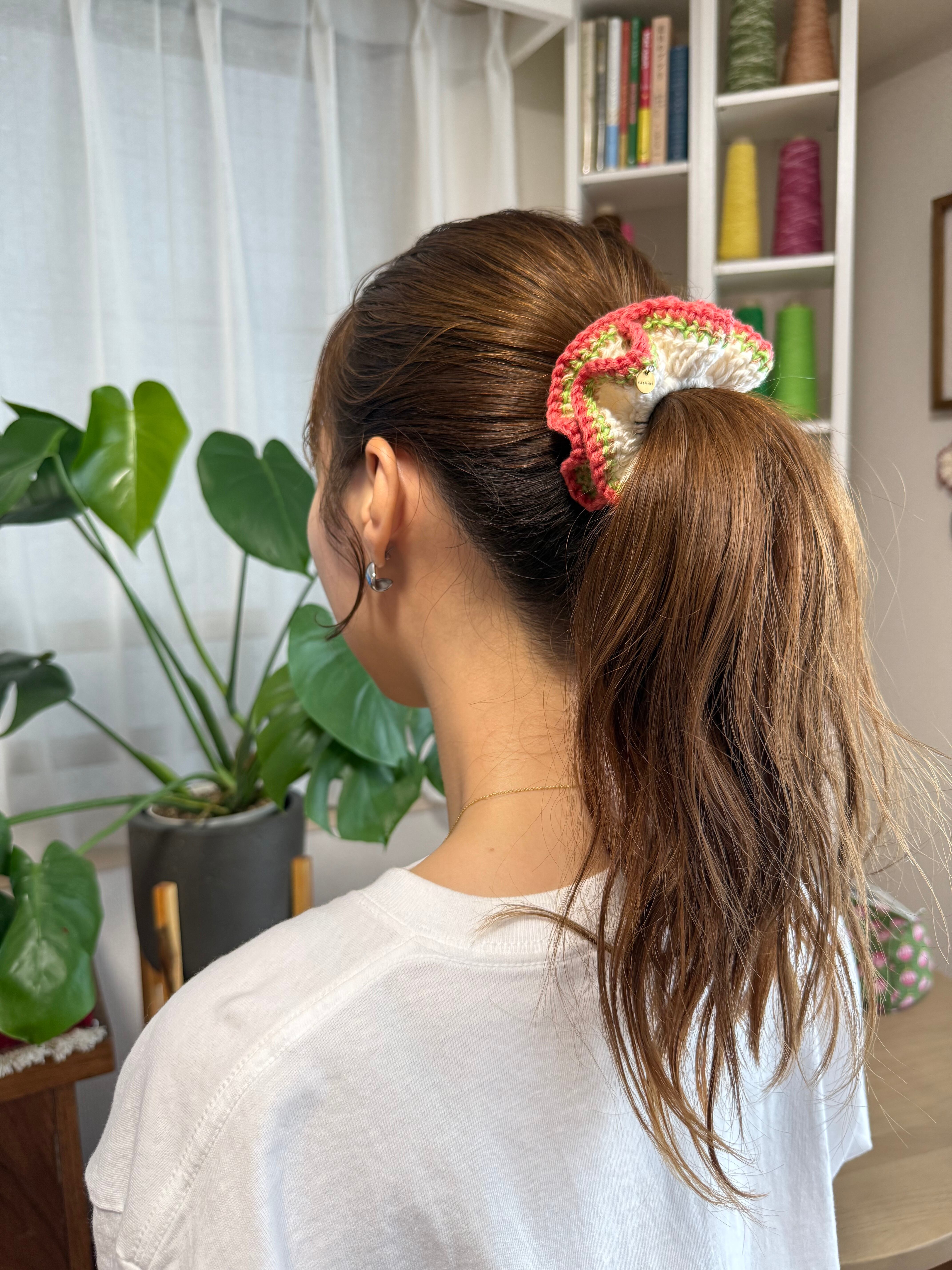 アクセサリー感覚で付けられる手編みのシュシュ。