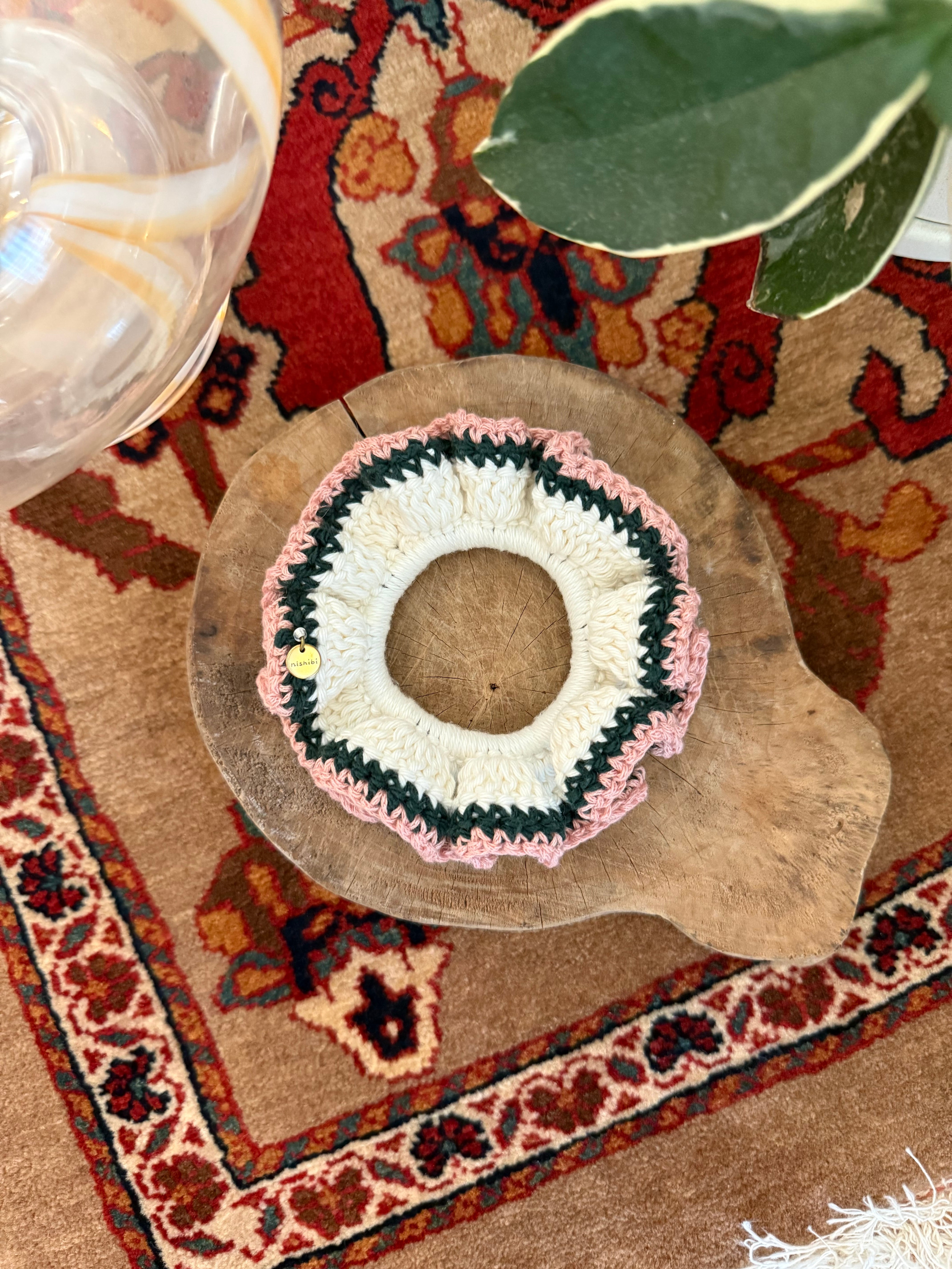 アクセサリー感覚で付けられる手編みのシュシュ。