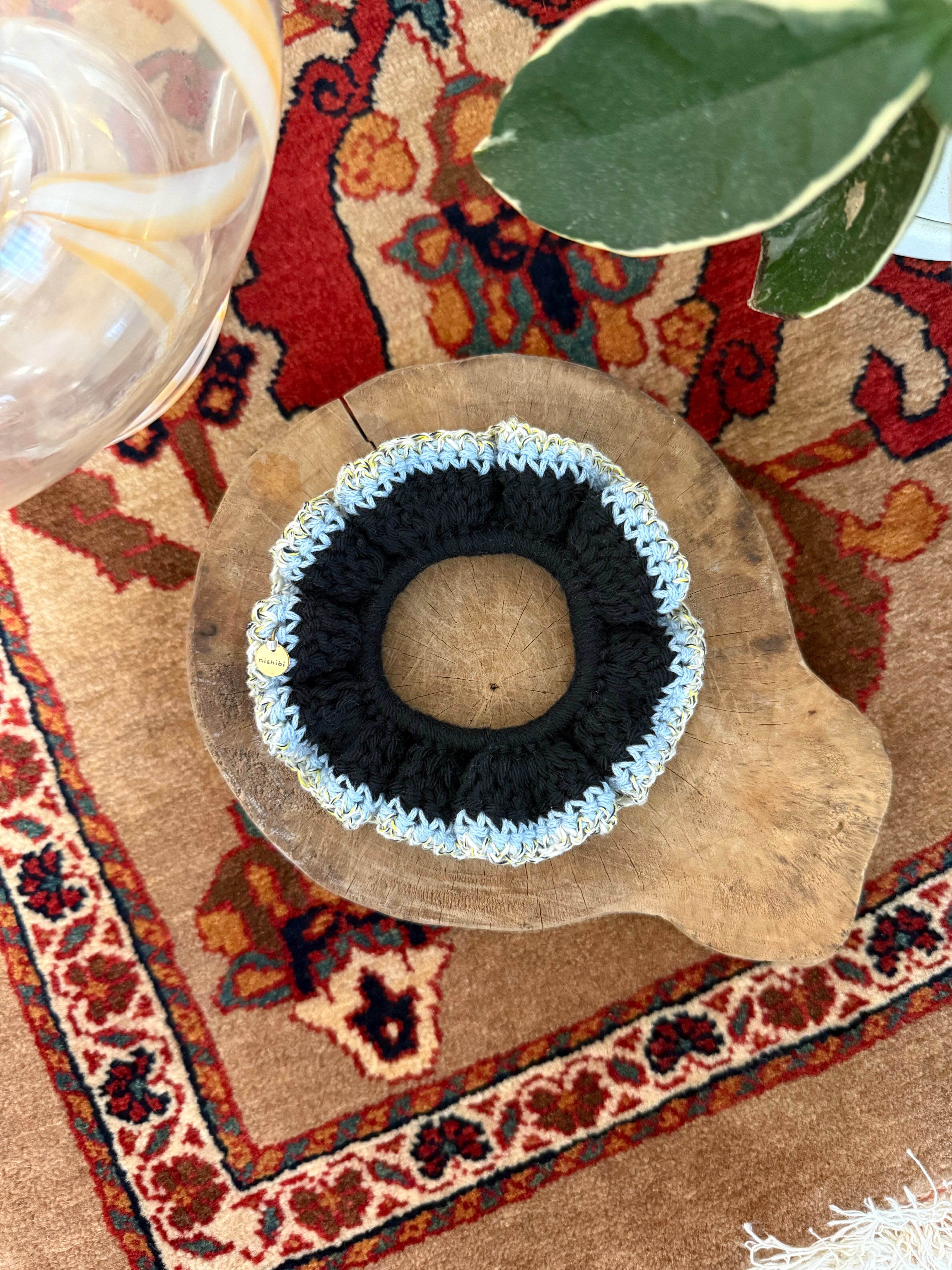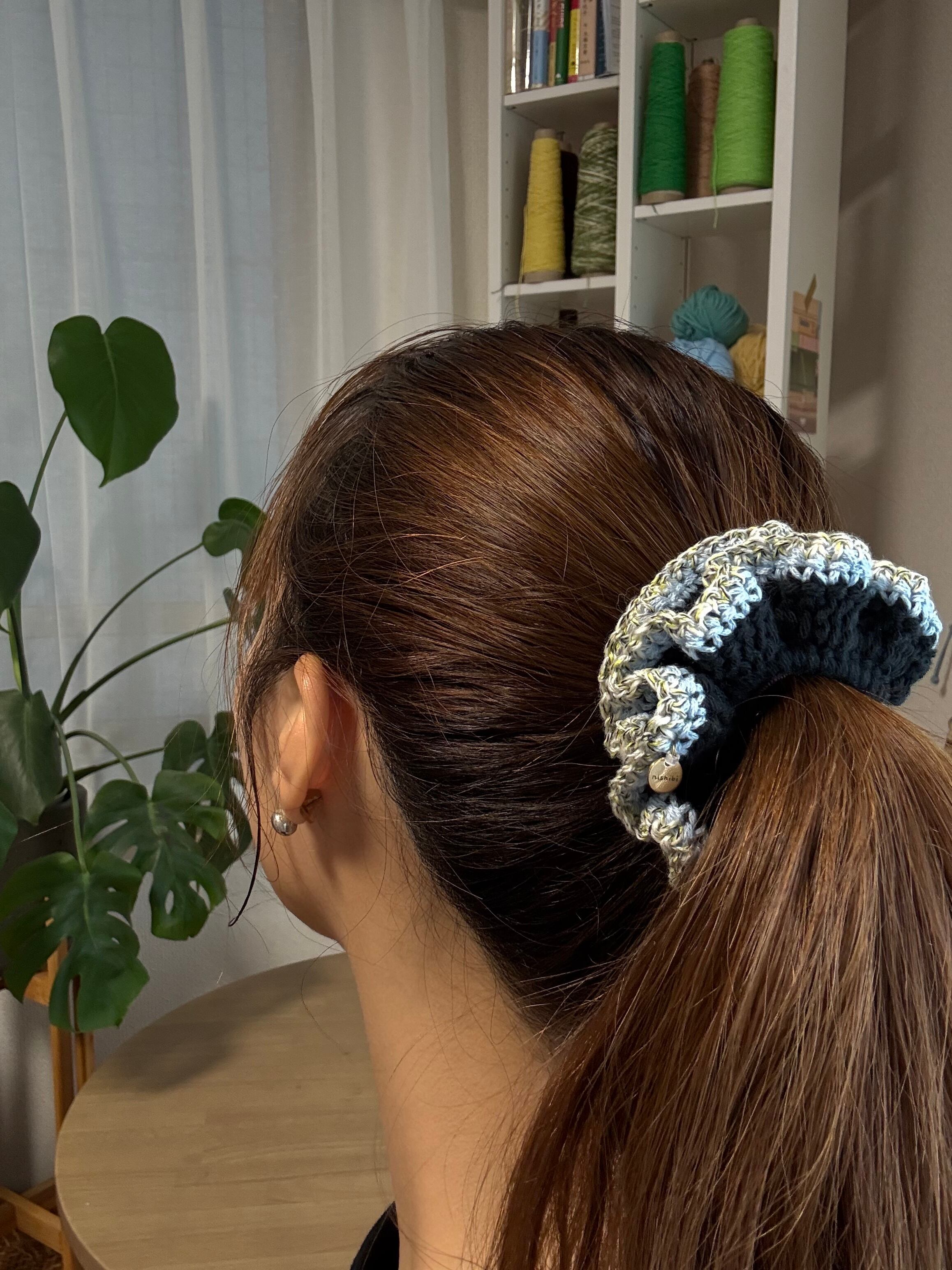 アクセサリー感覚で付けられる手編みのシュシュ。