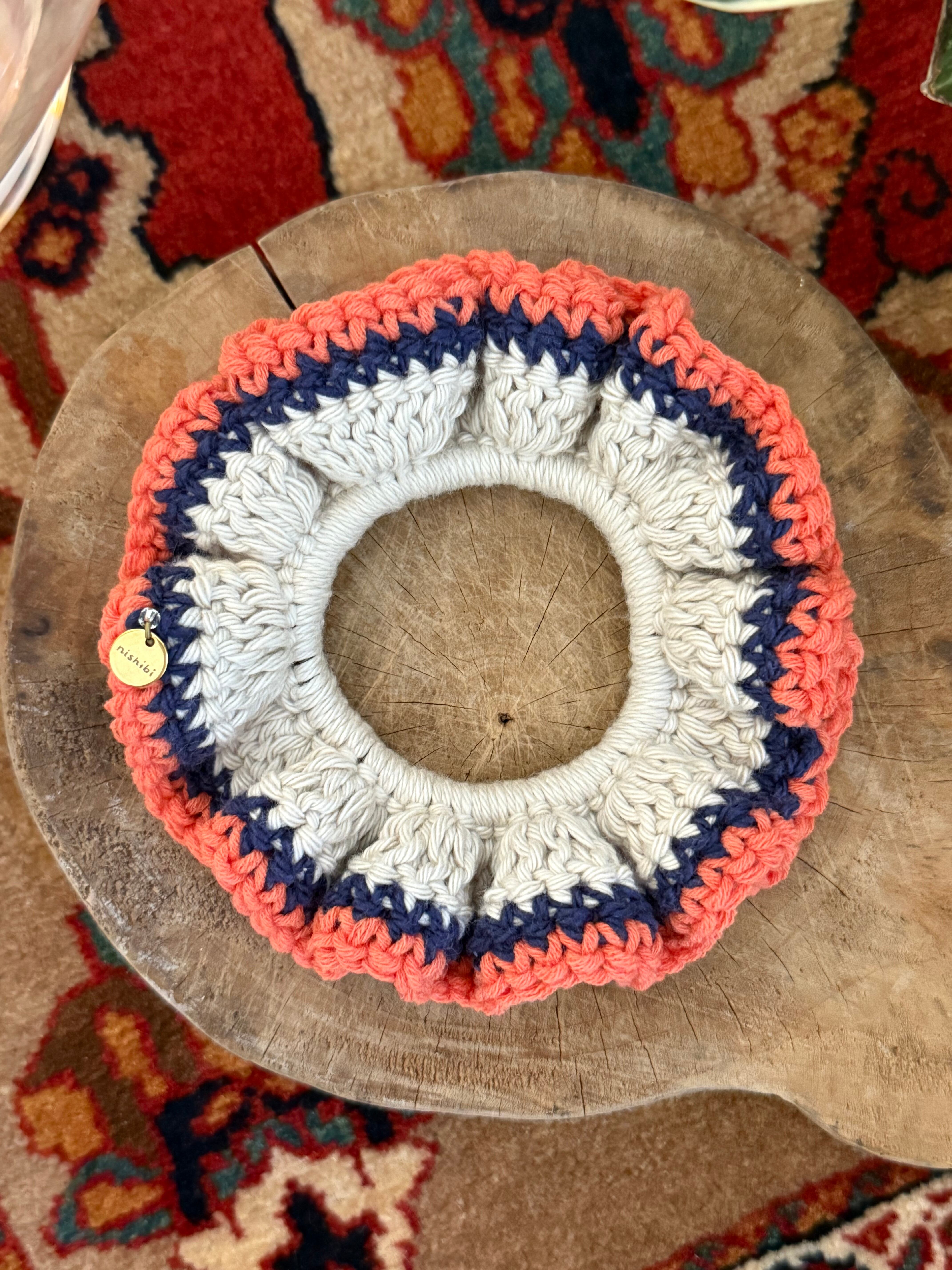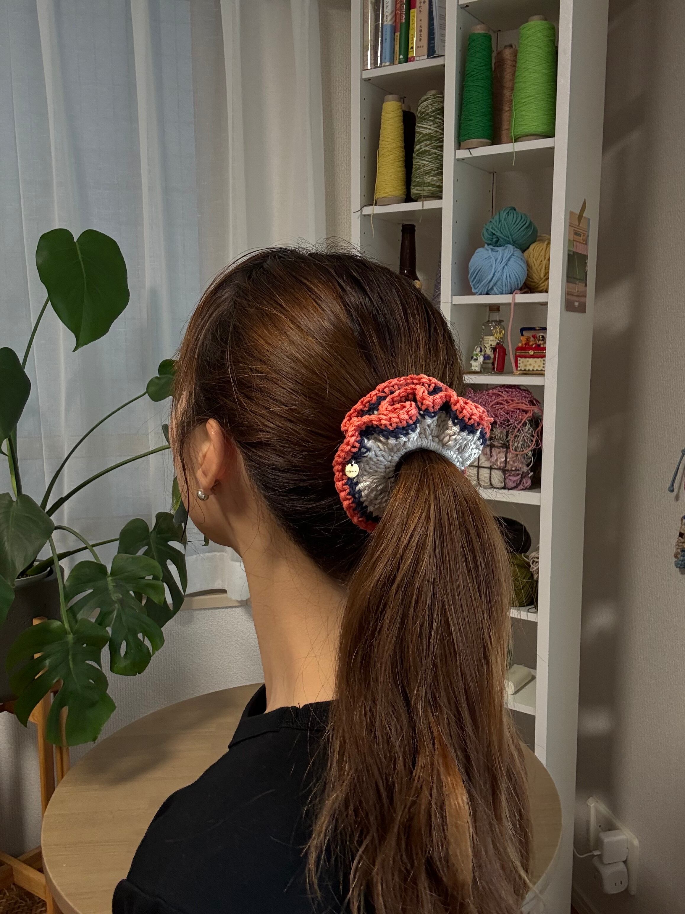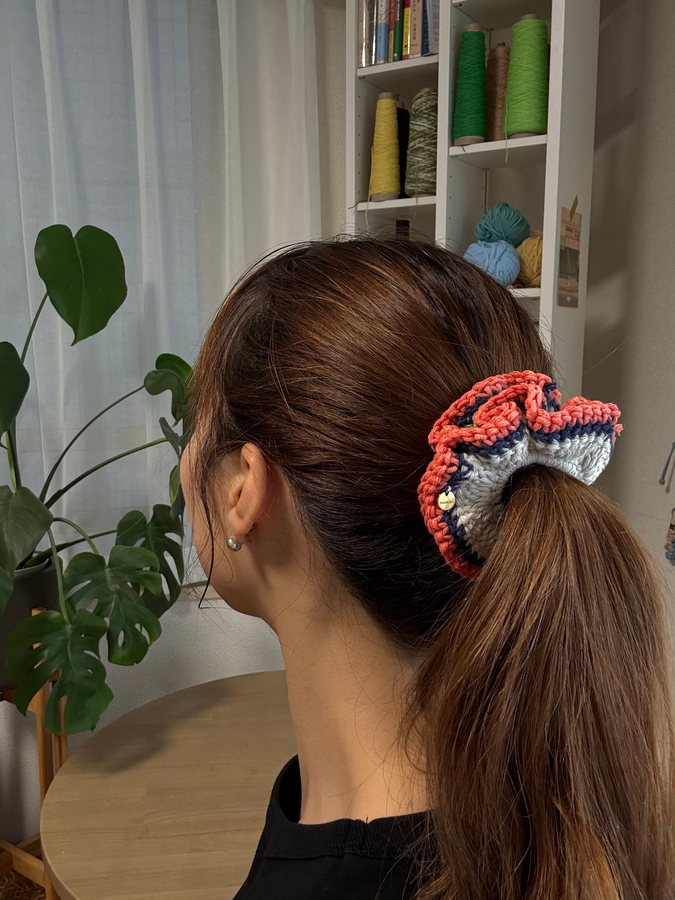 アクセサリー感覚で付けられる手編みのシュシュ。