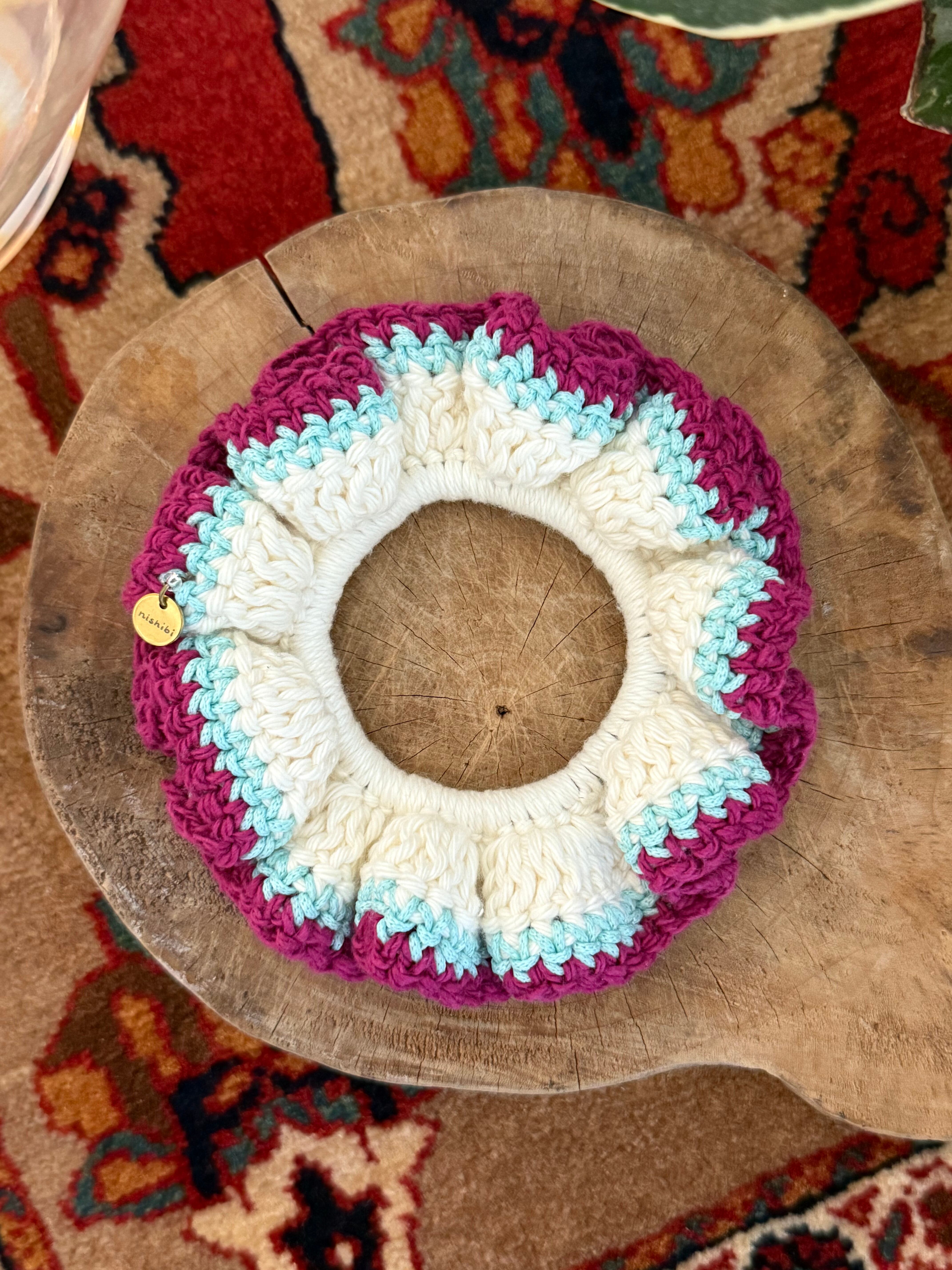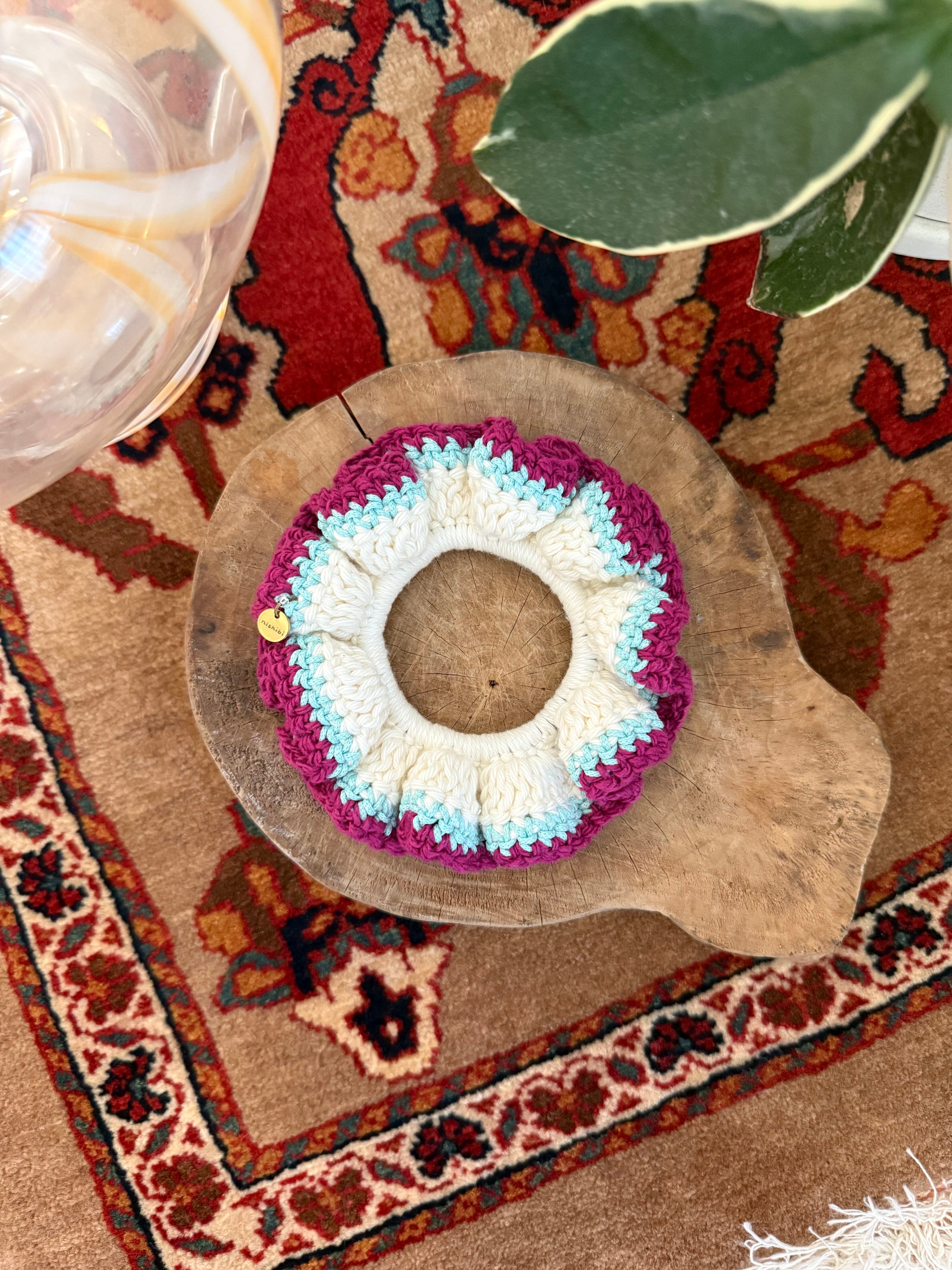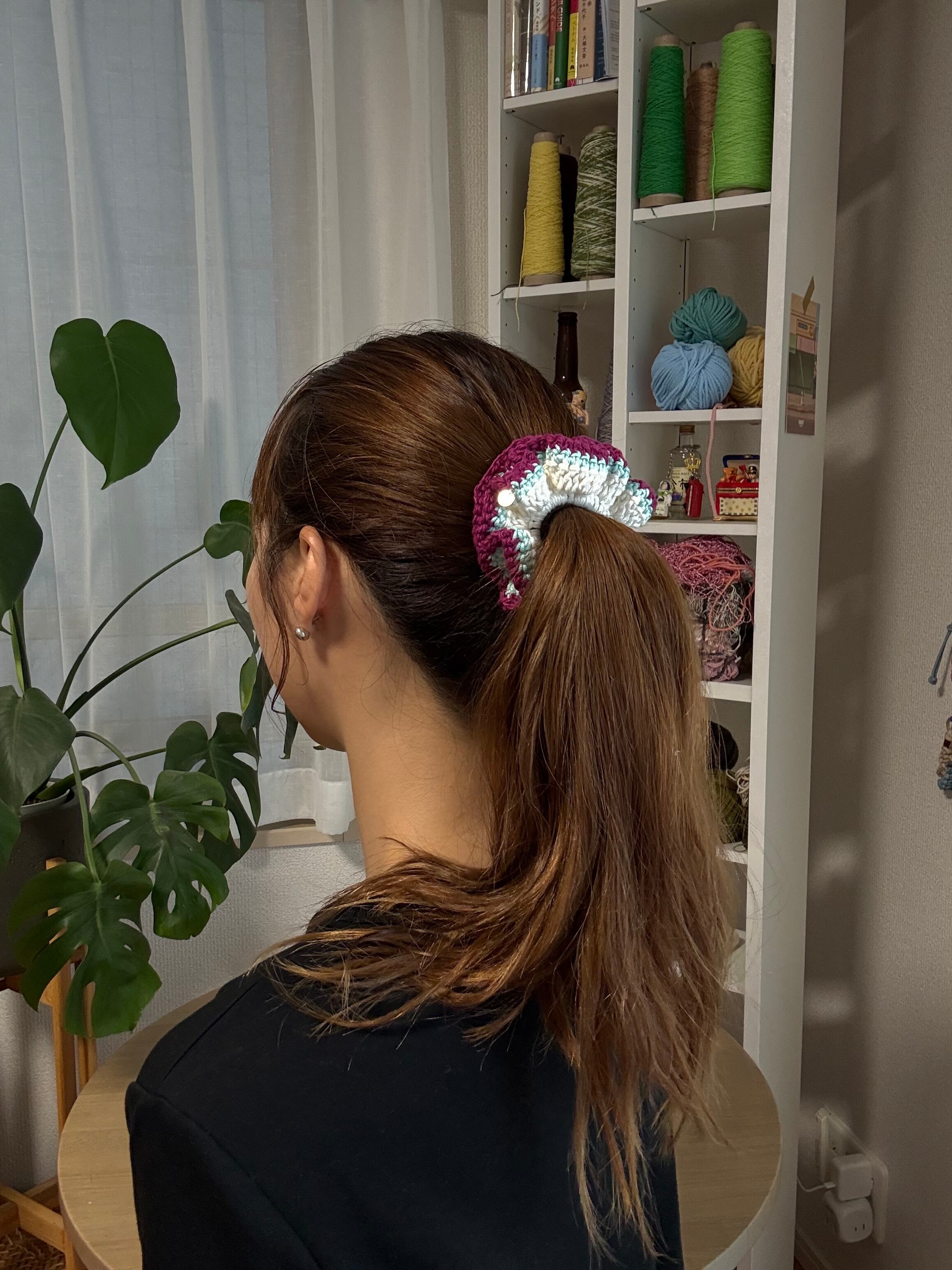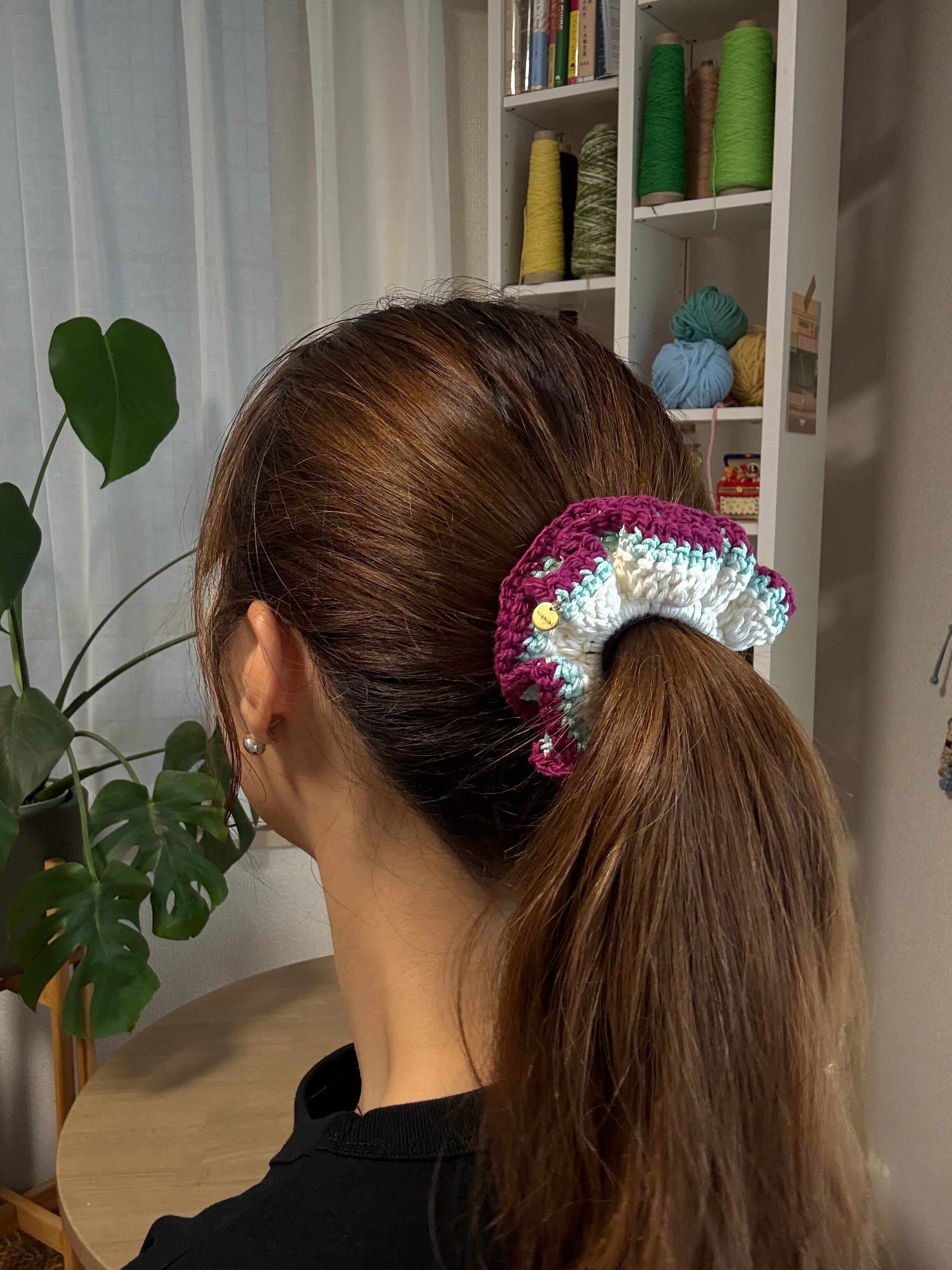 アクセサリー感覚で付けられる手編みのシュシュ。