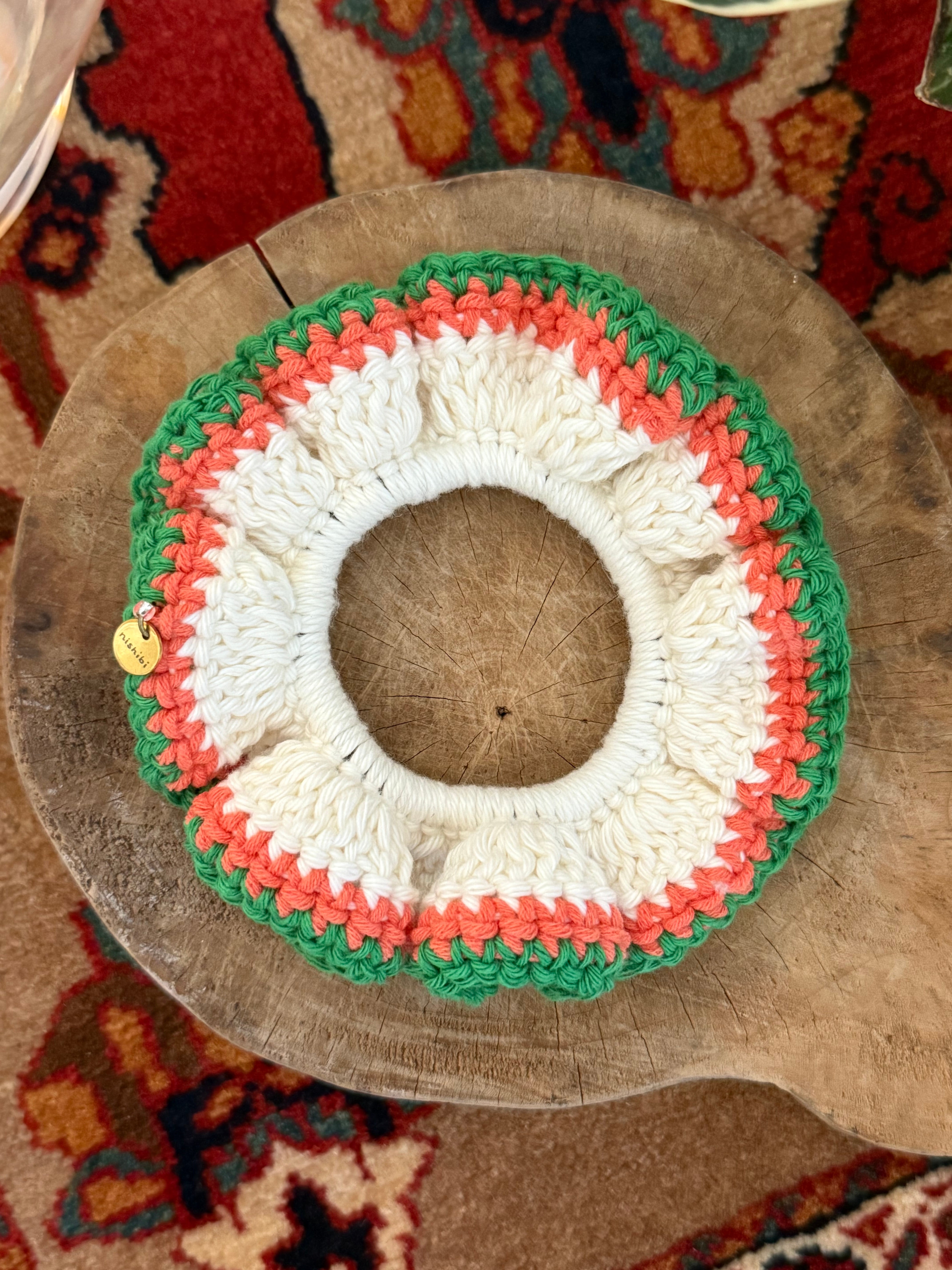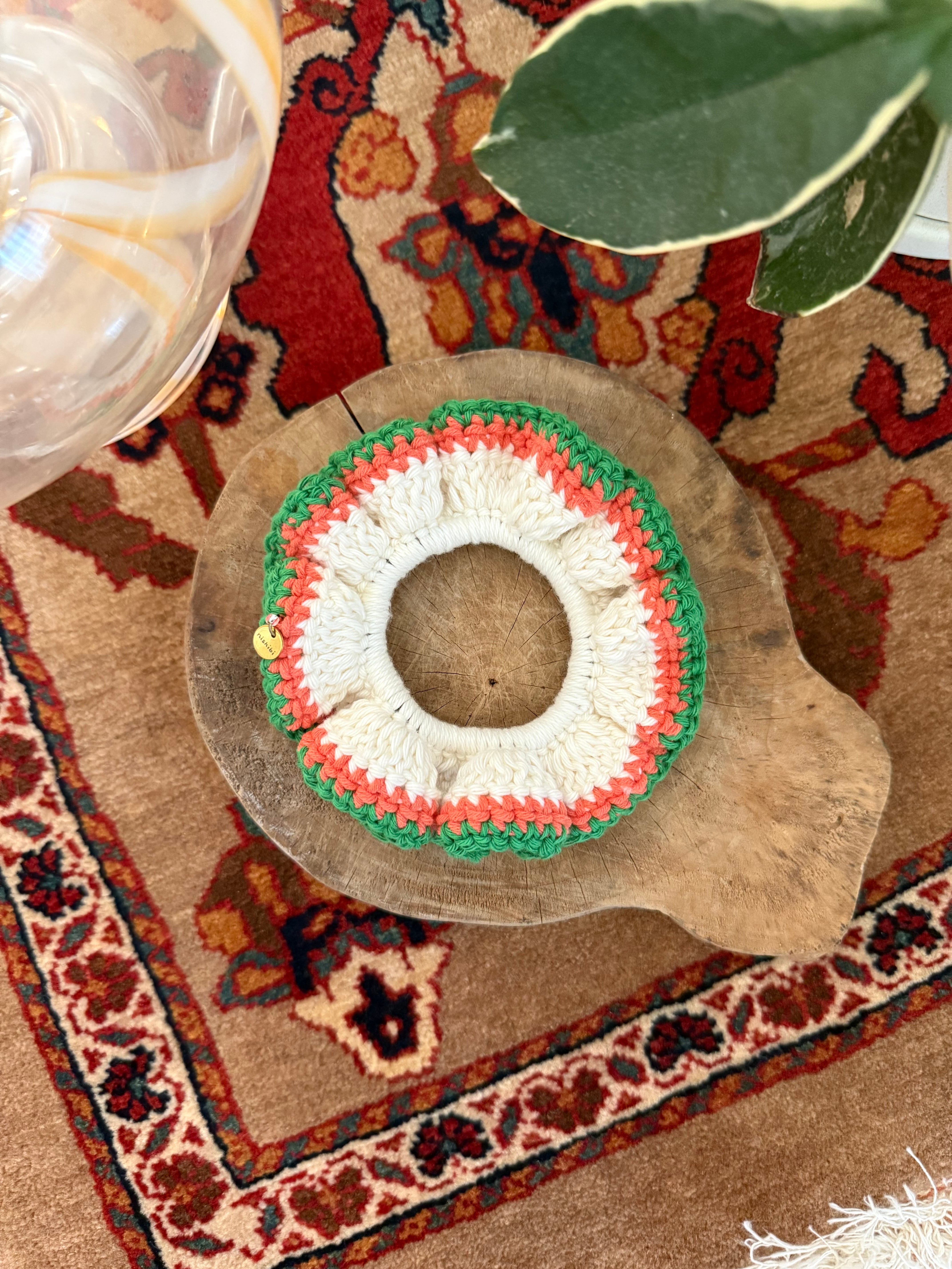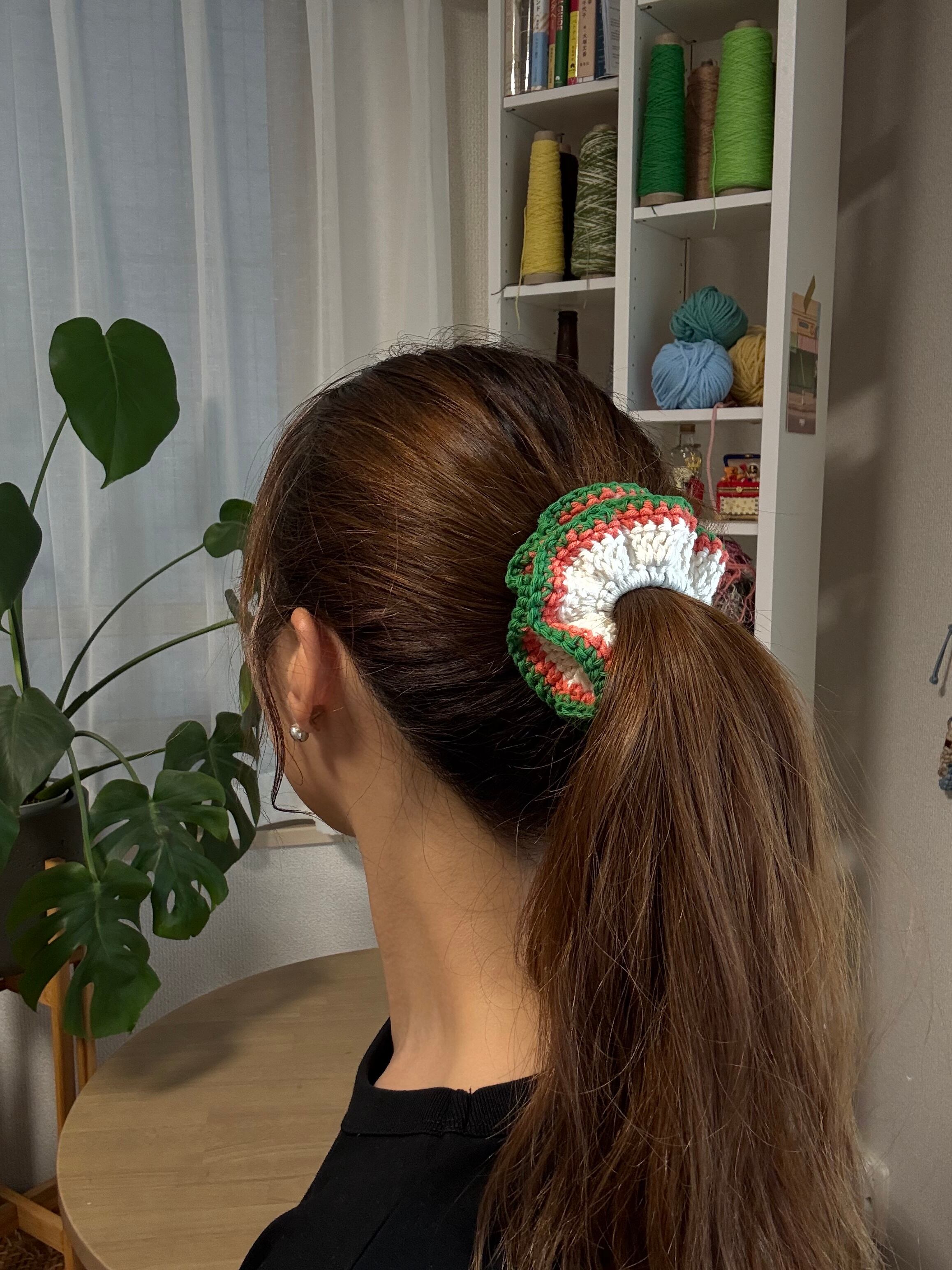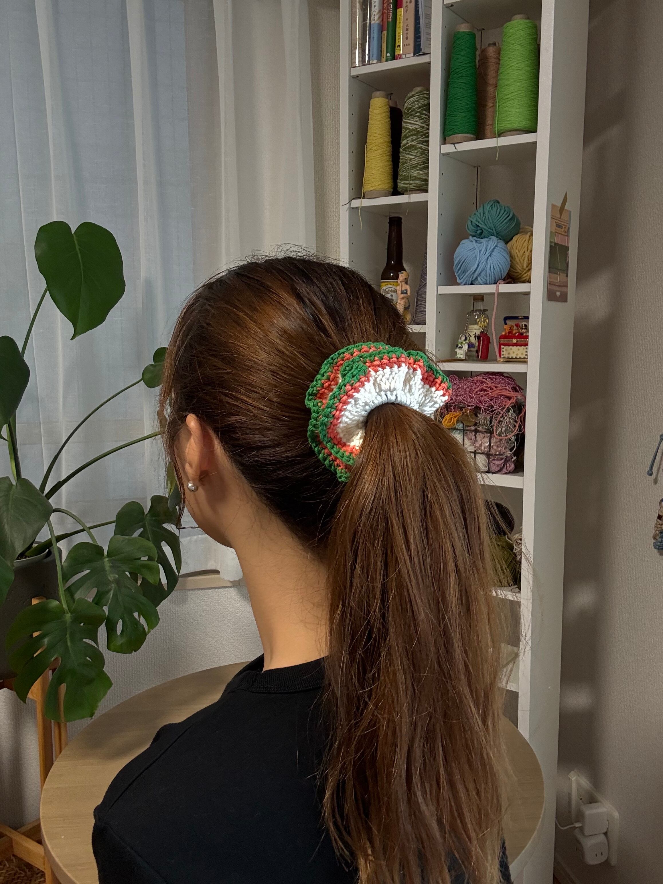 アクセサリー感覚で付けられる手編みのシュシュ。