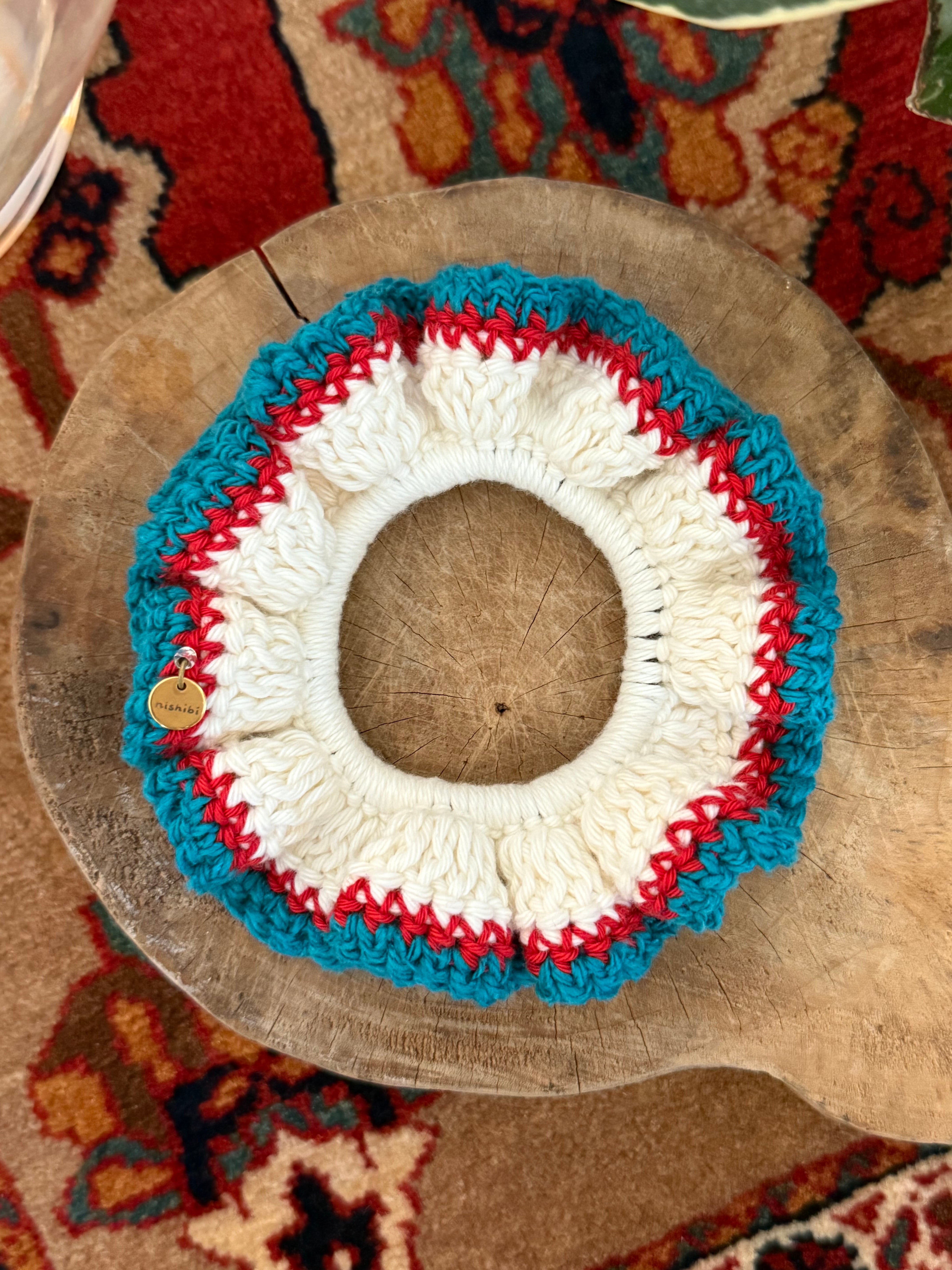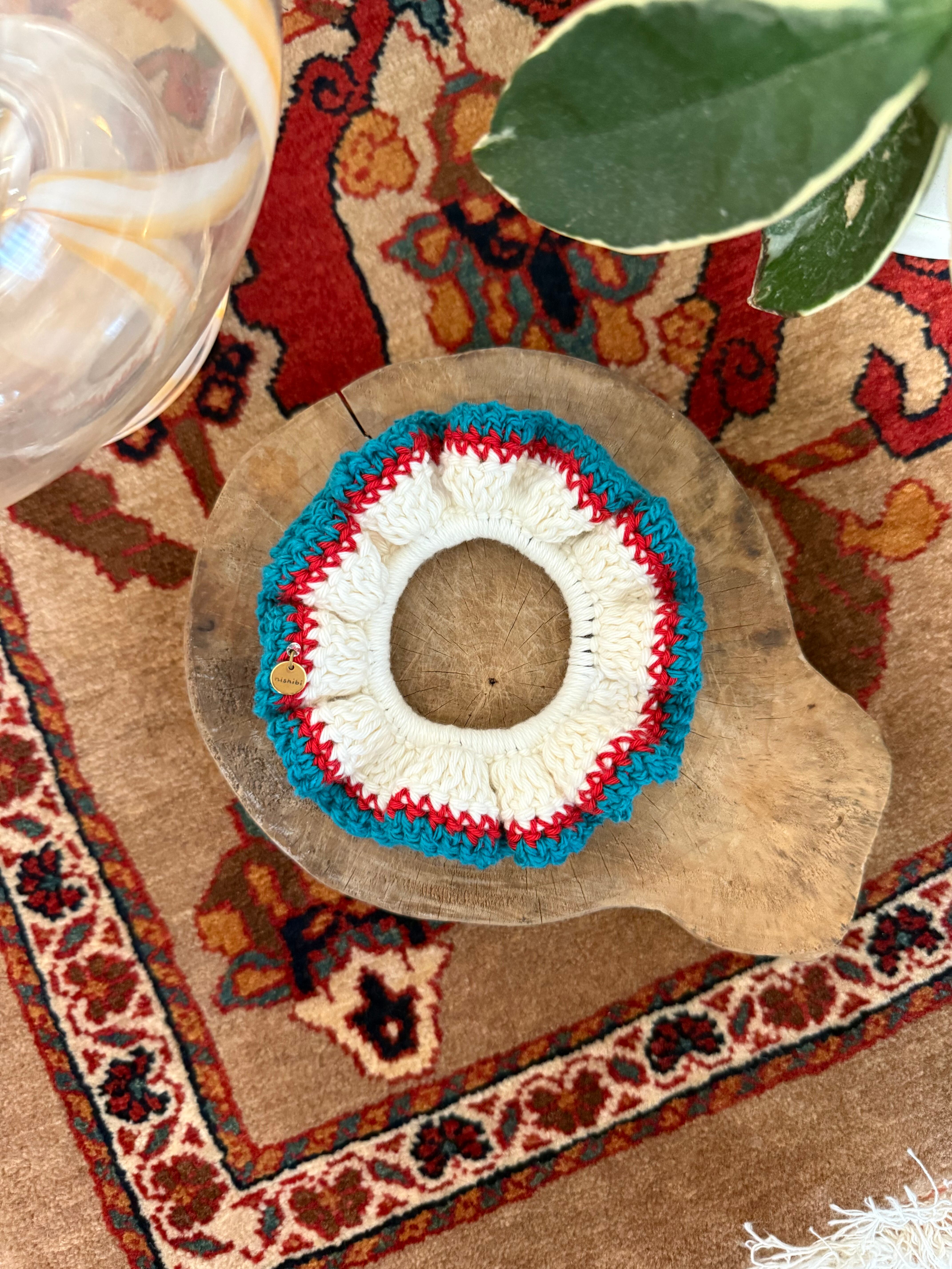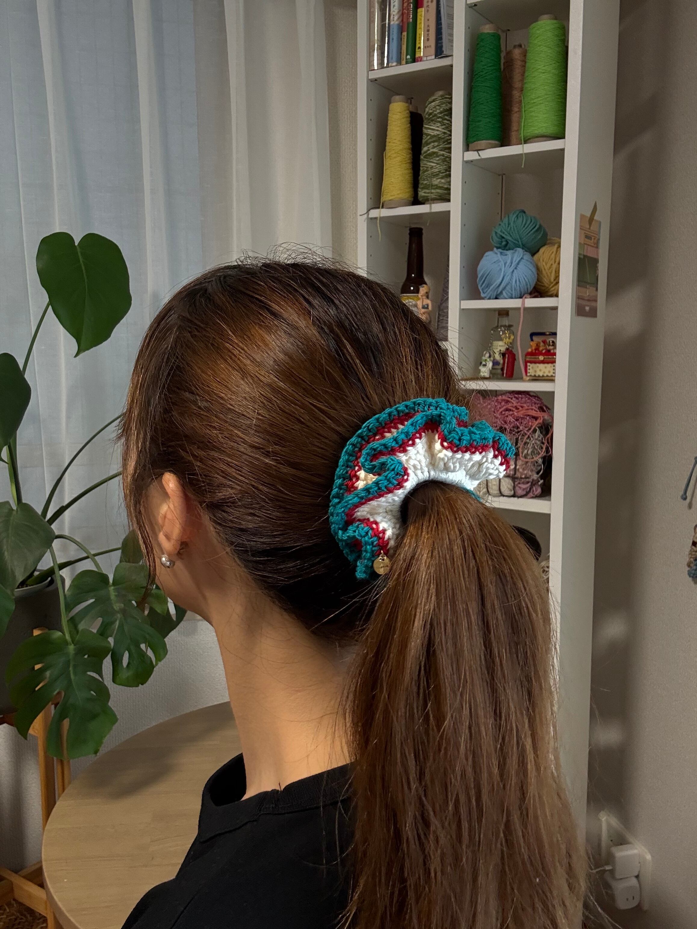 アクセサリー感覚で付けられる手編みのシュシュ。