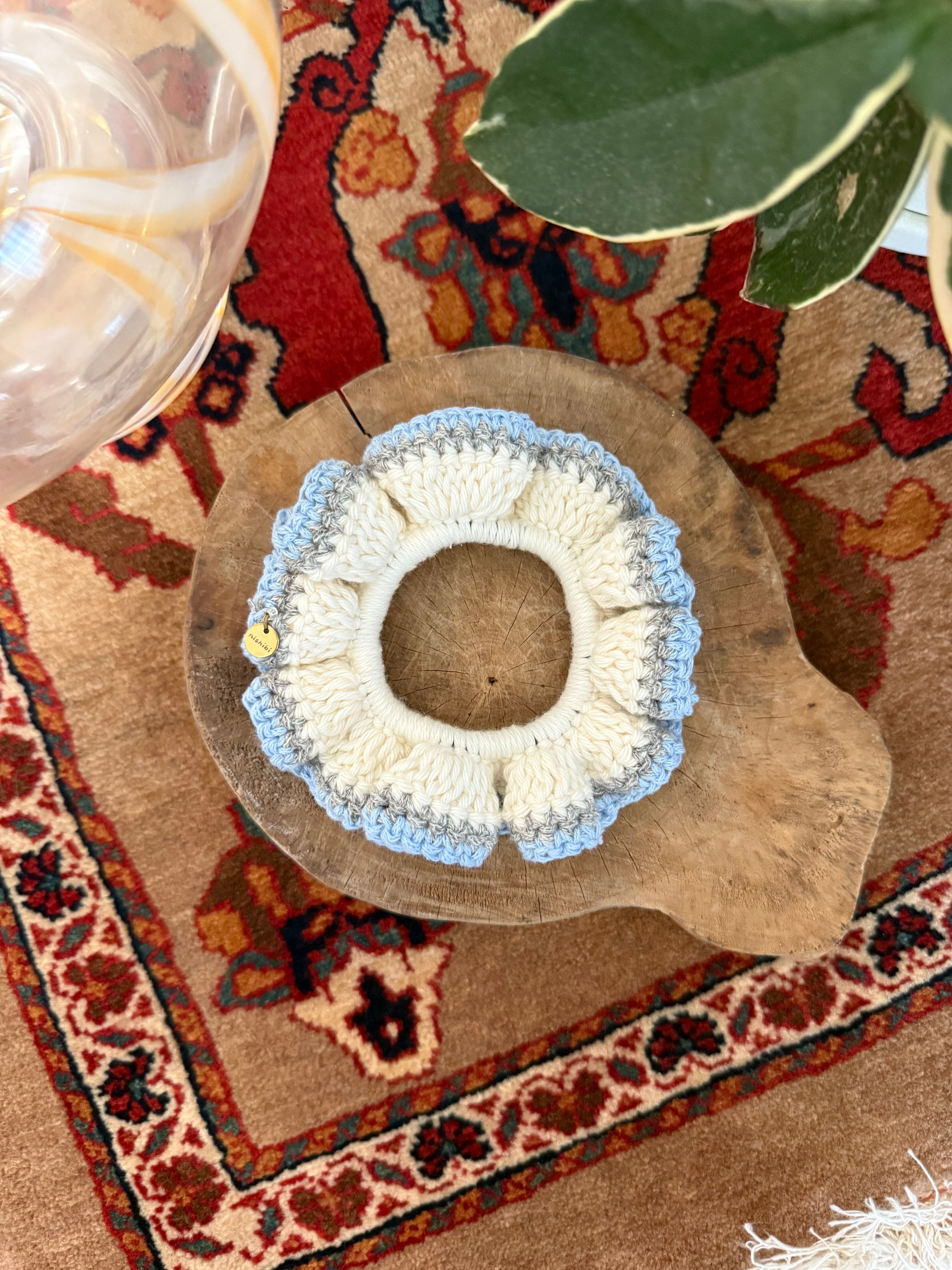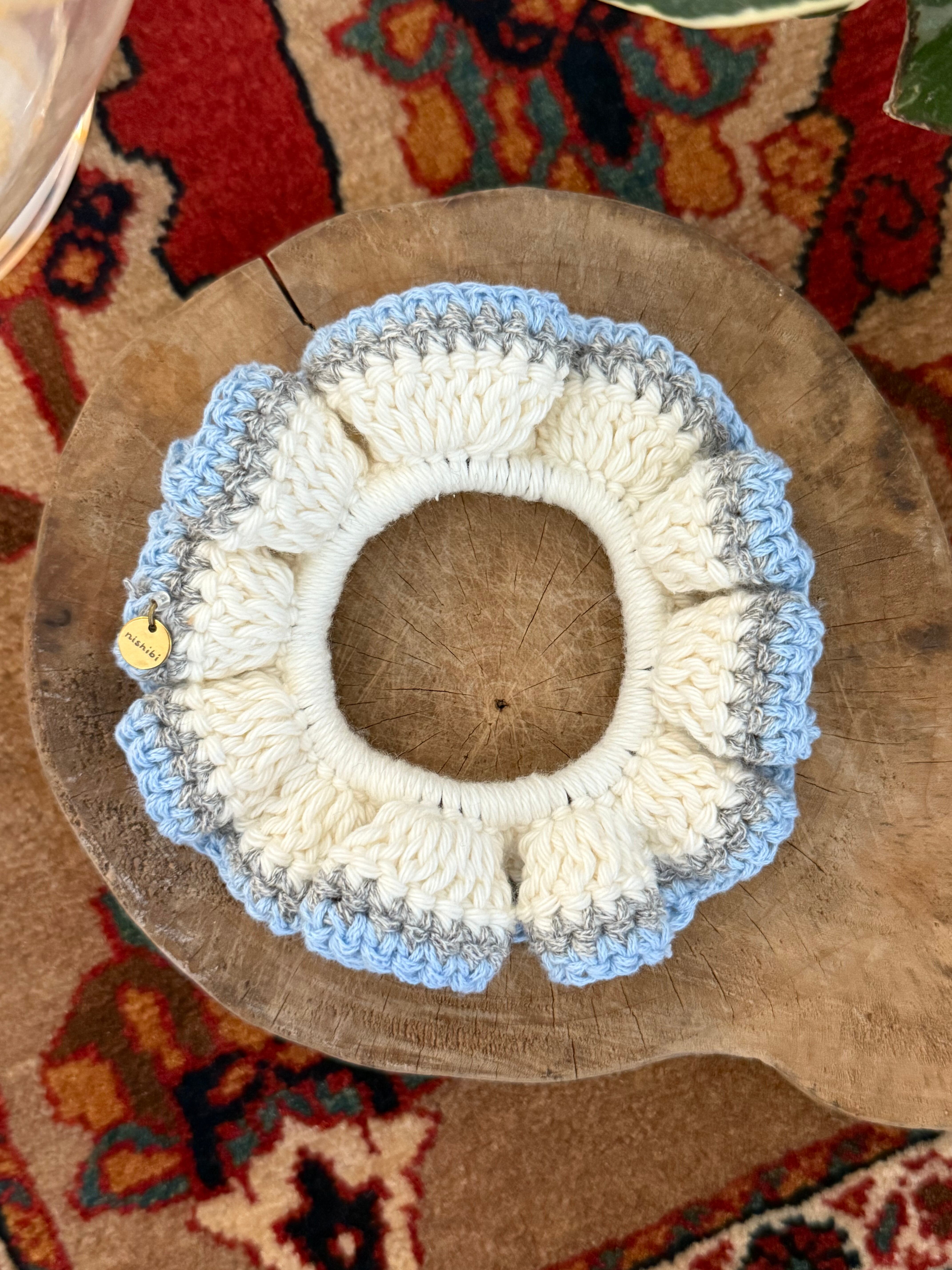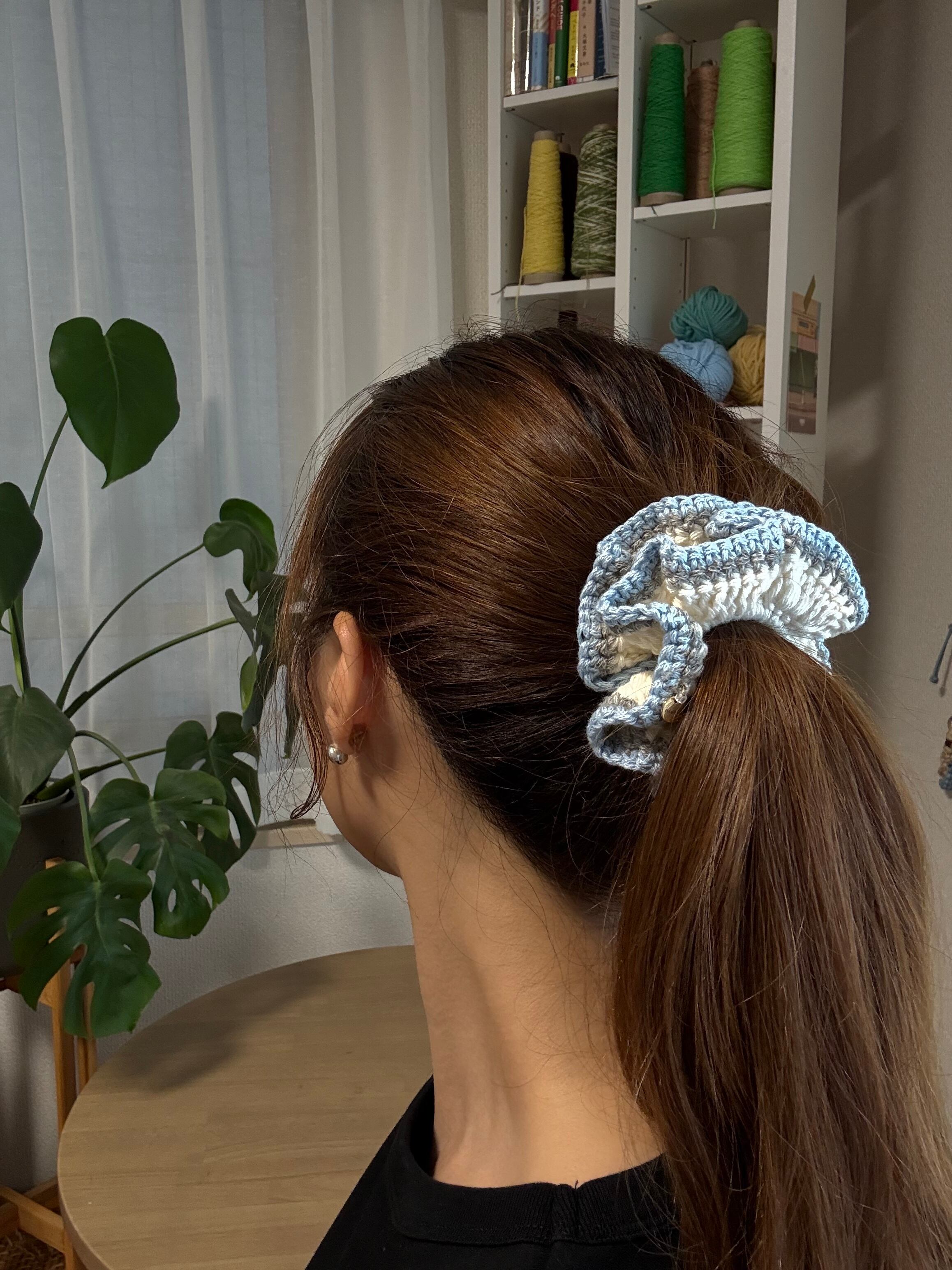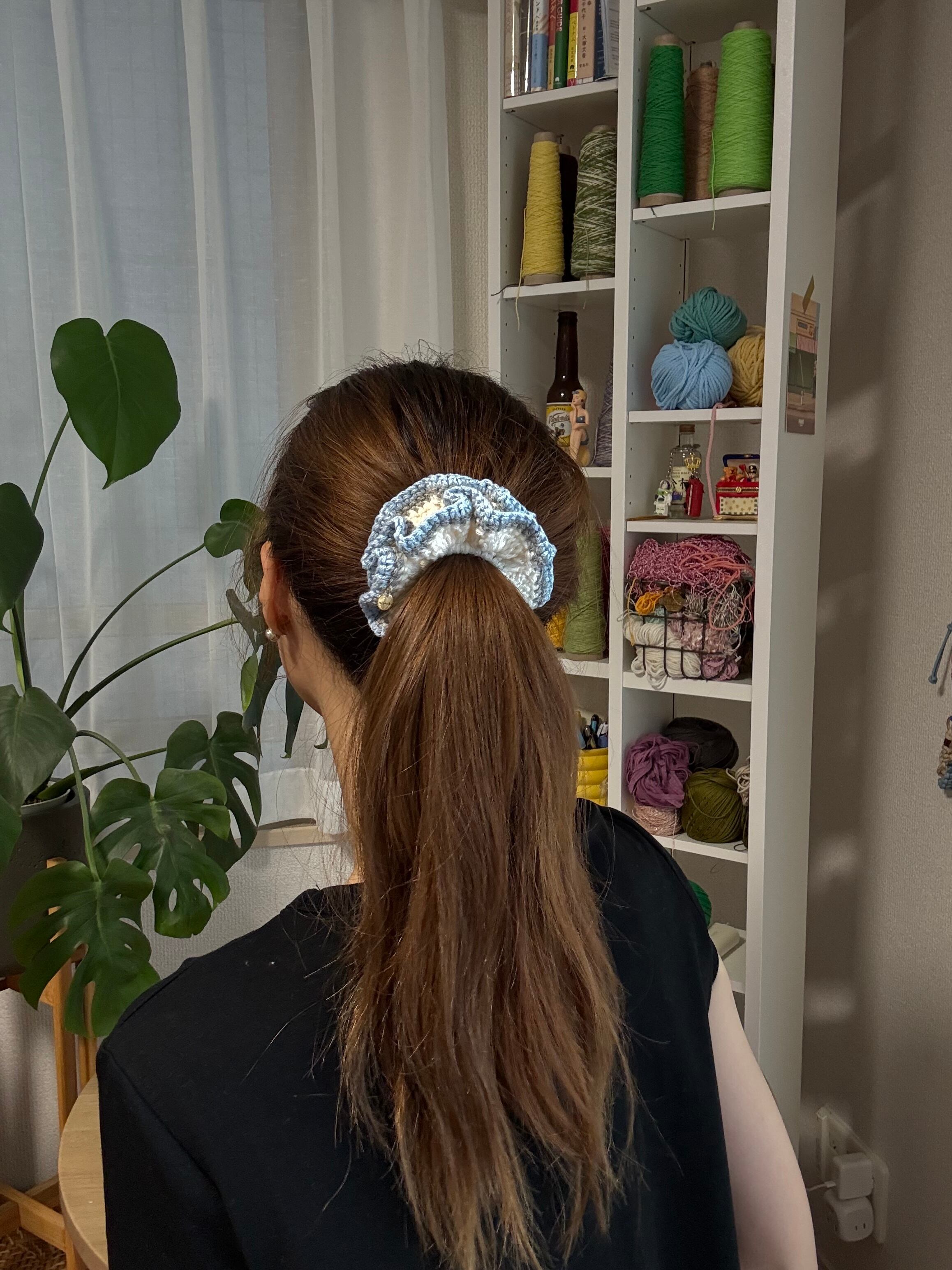 アクセサリー感覚で付けられる手編みのシュシュ。