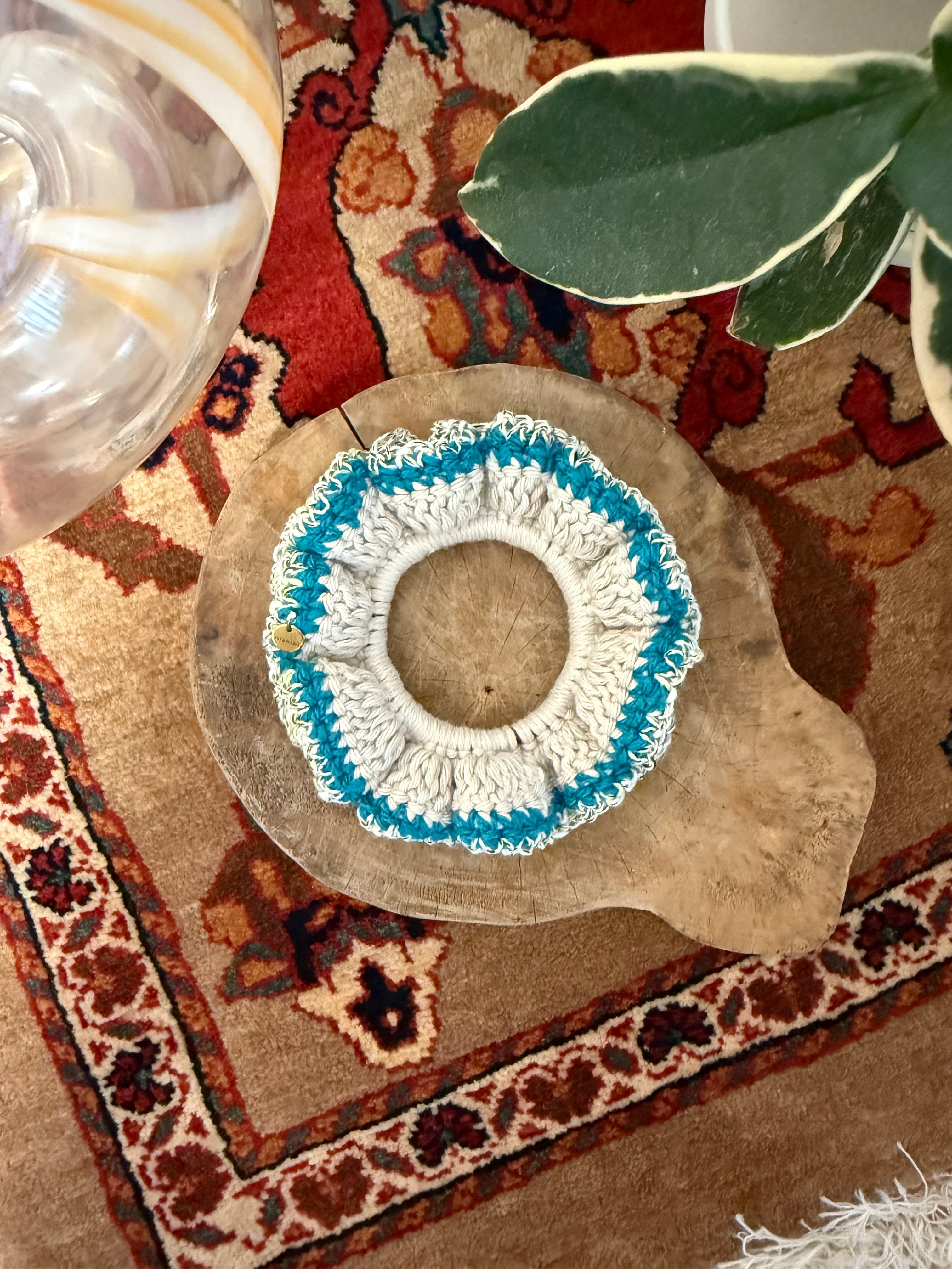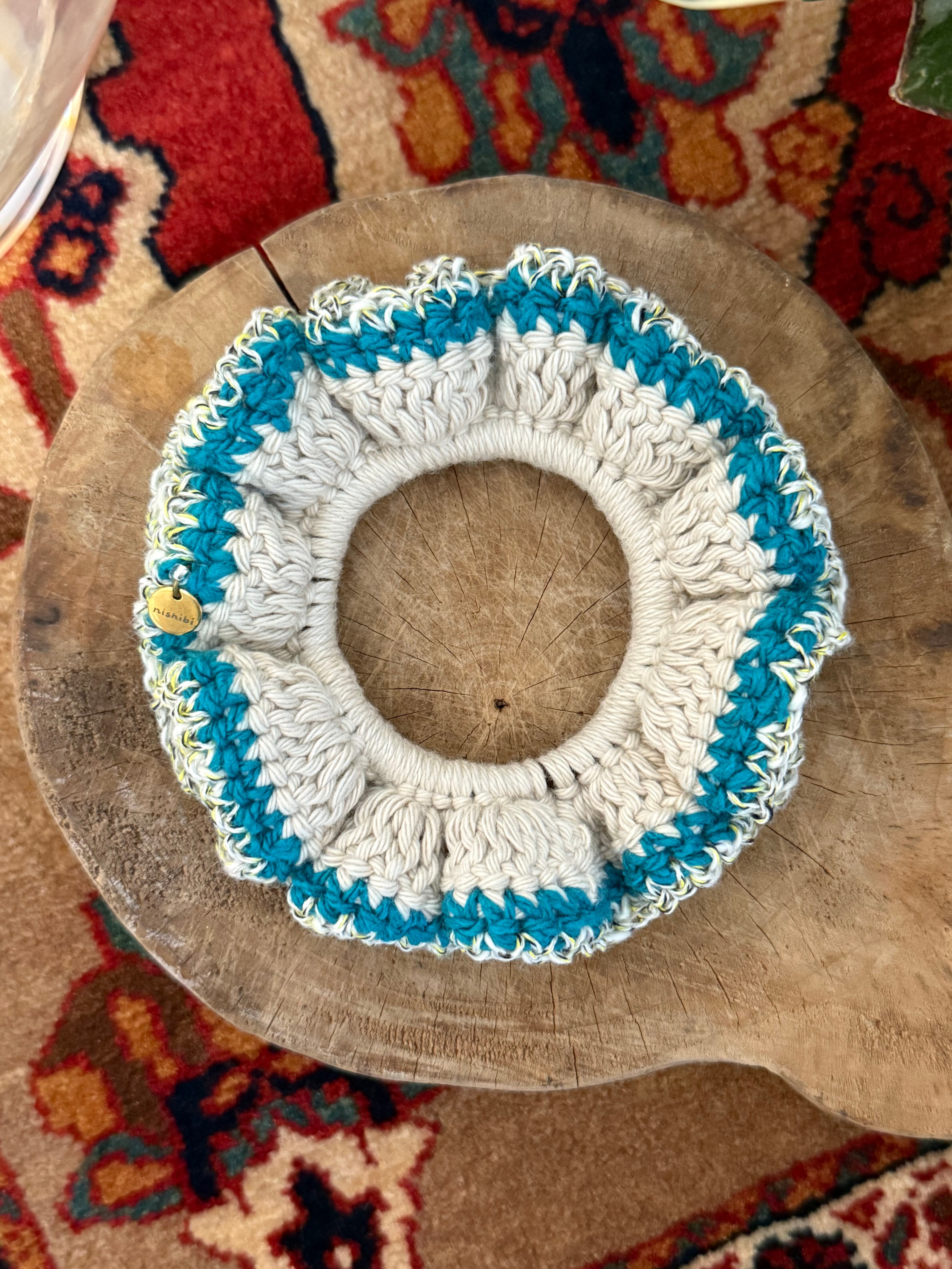 アクセサリー感覚で付けられる手編みのシュシュ。