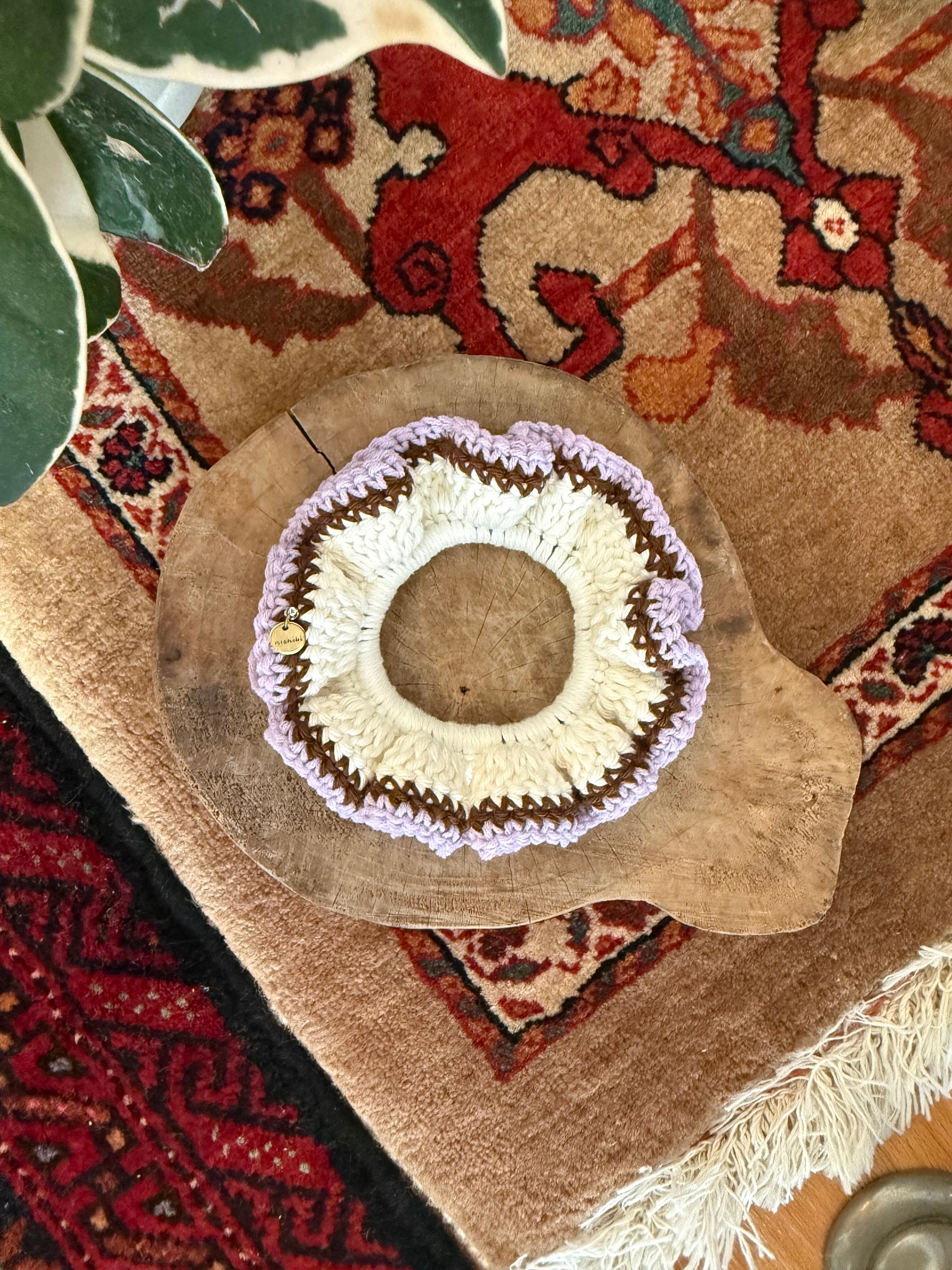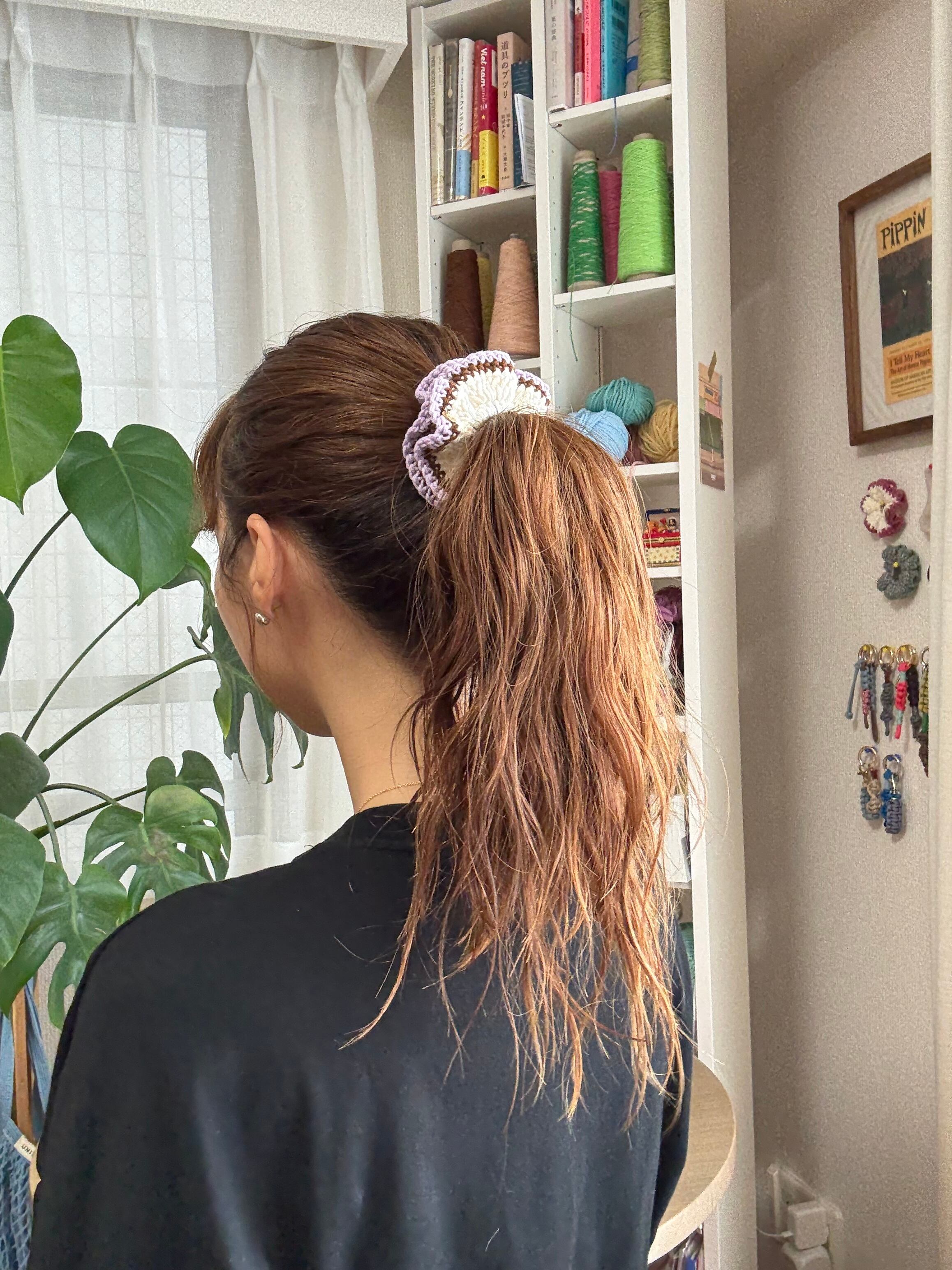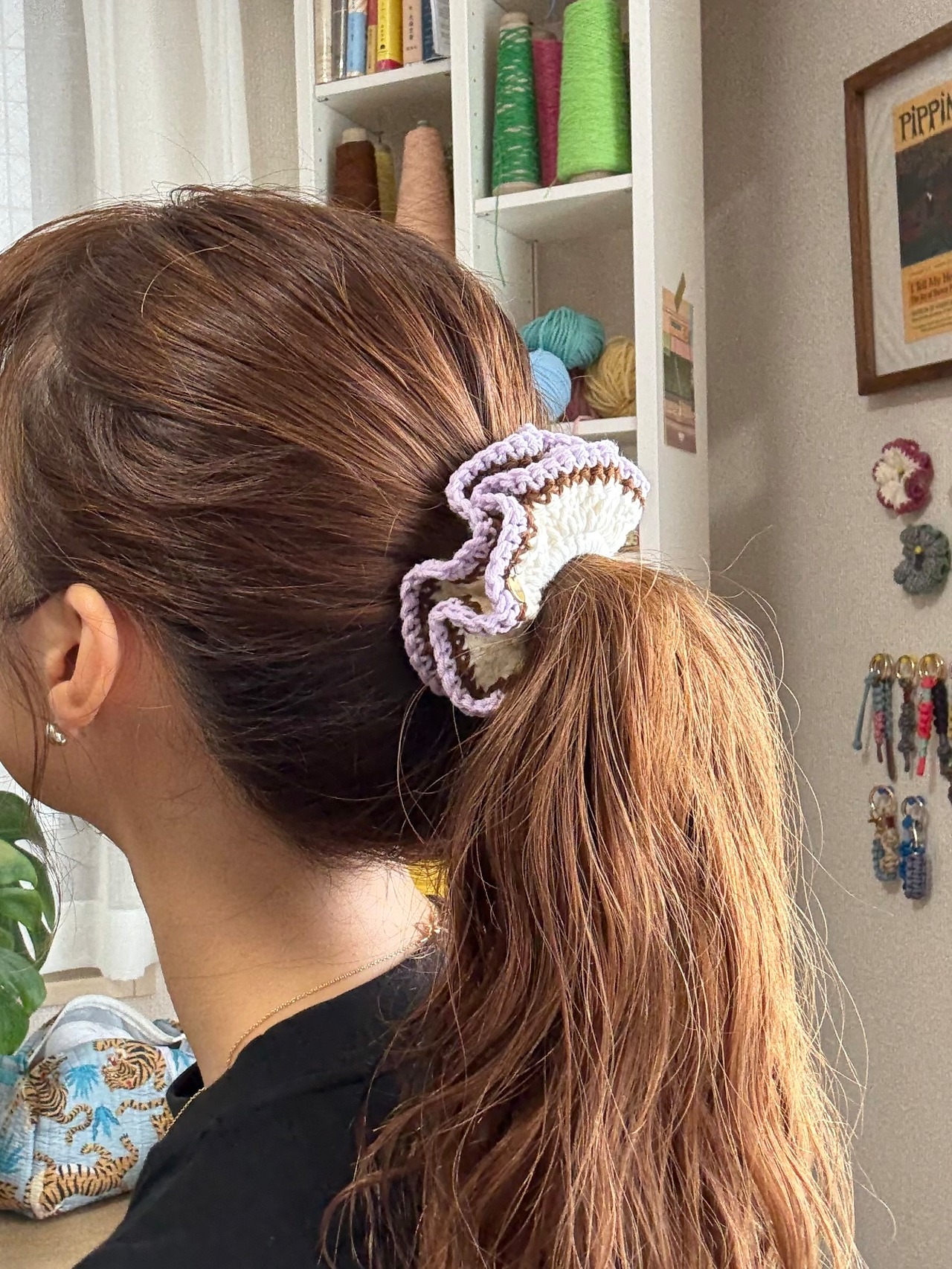 アクセサリー感覚で付けられる手編みのシュシュ。