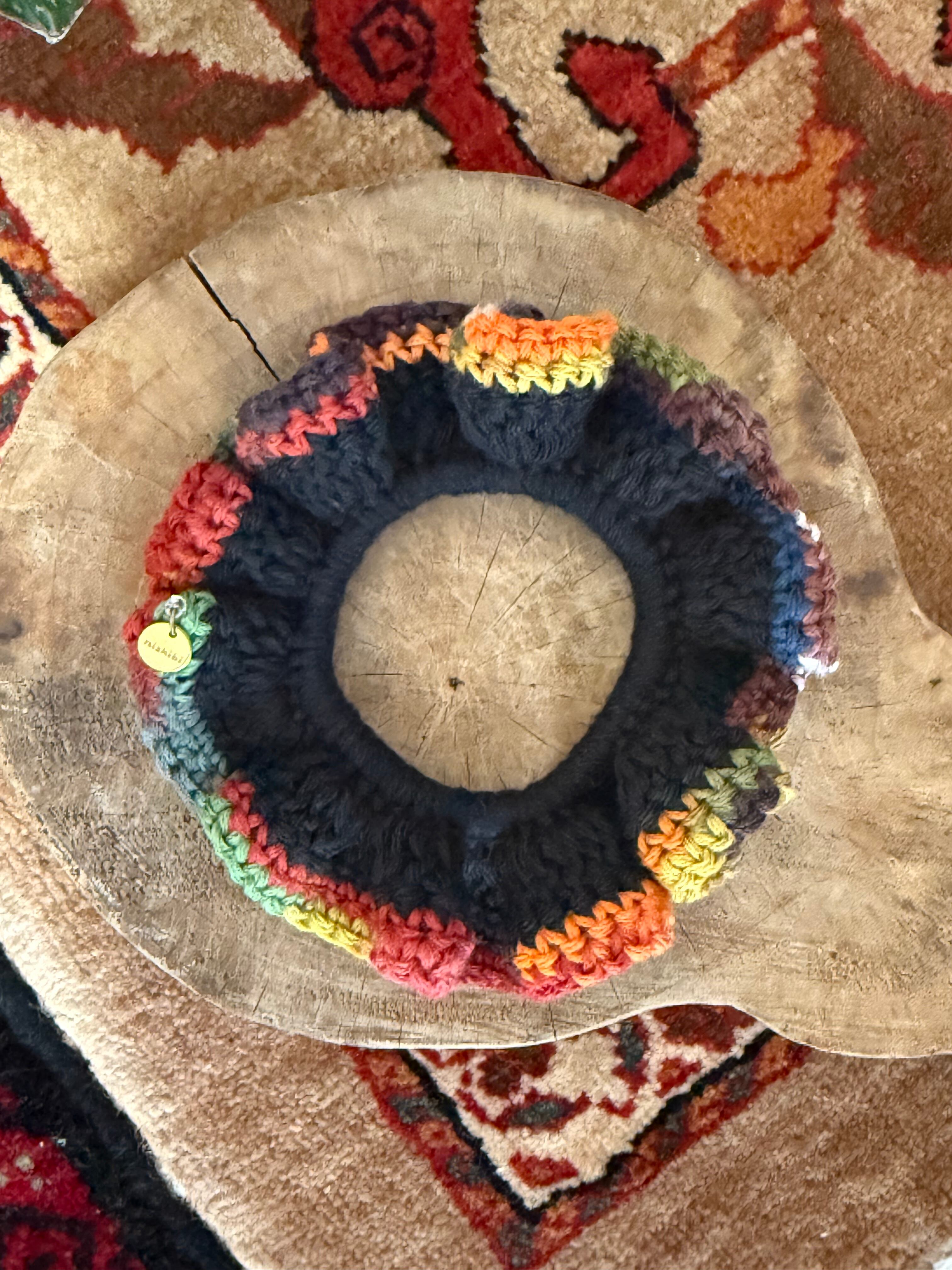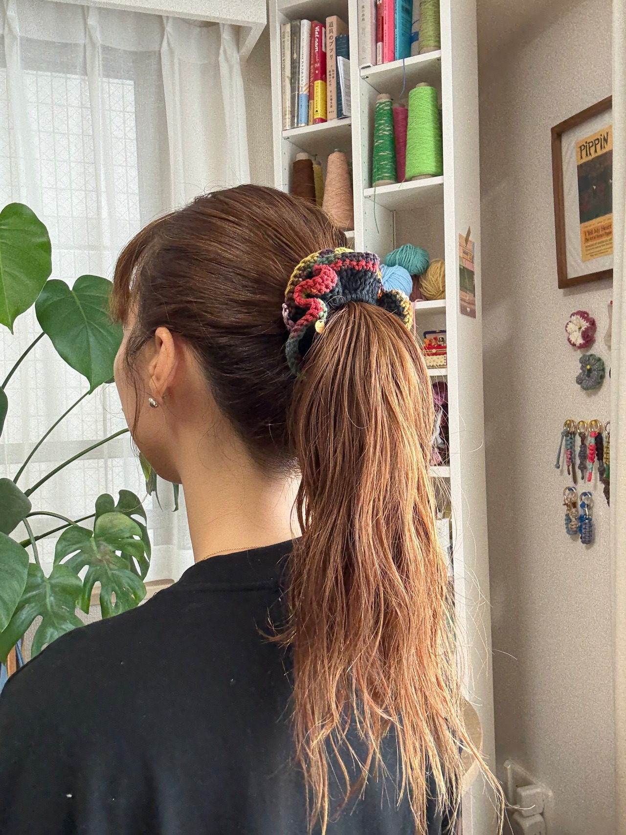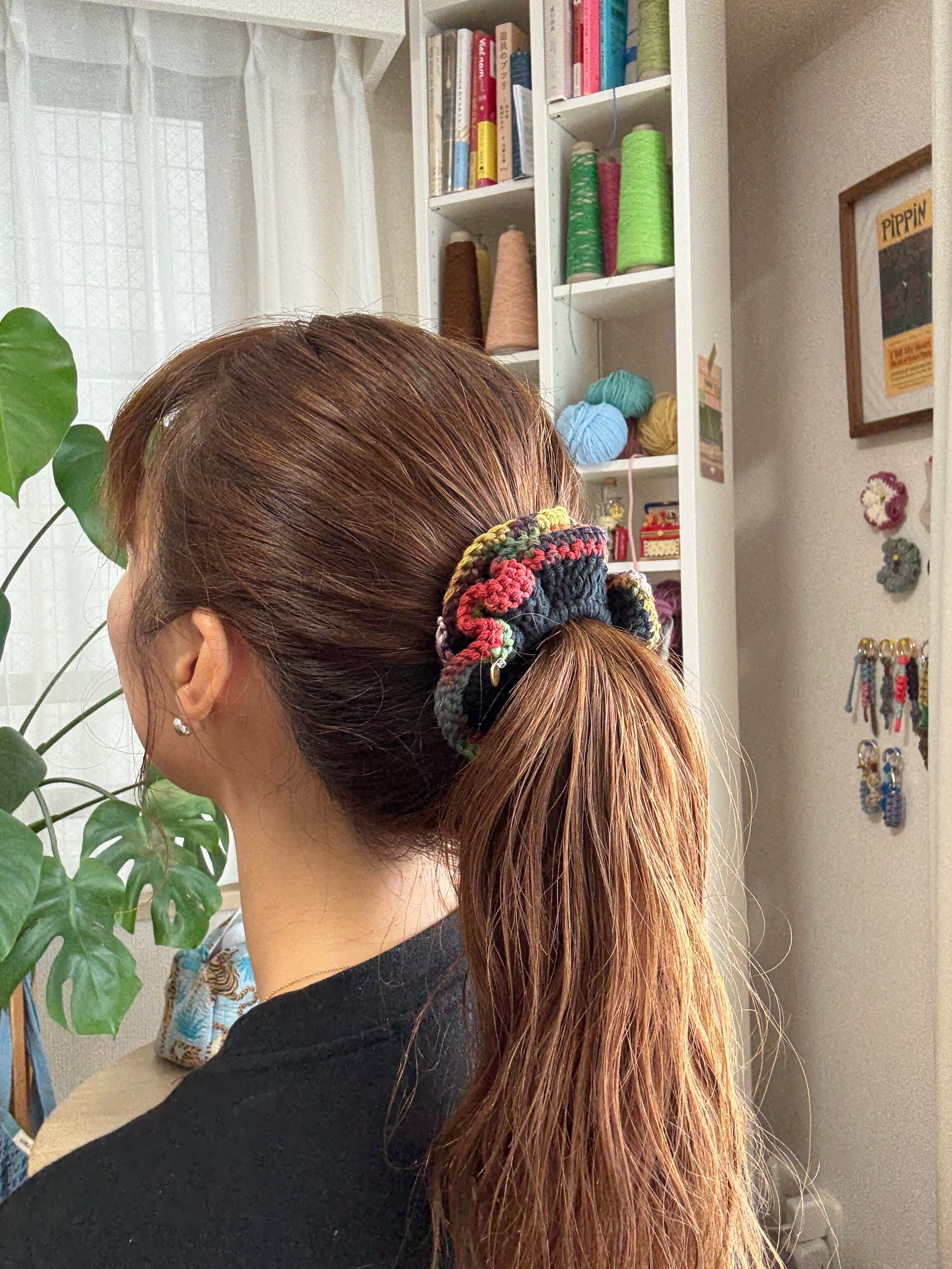 アクセサリー感覚で付けられる手編みのシュシュ。