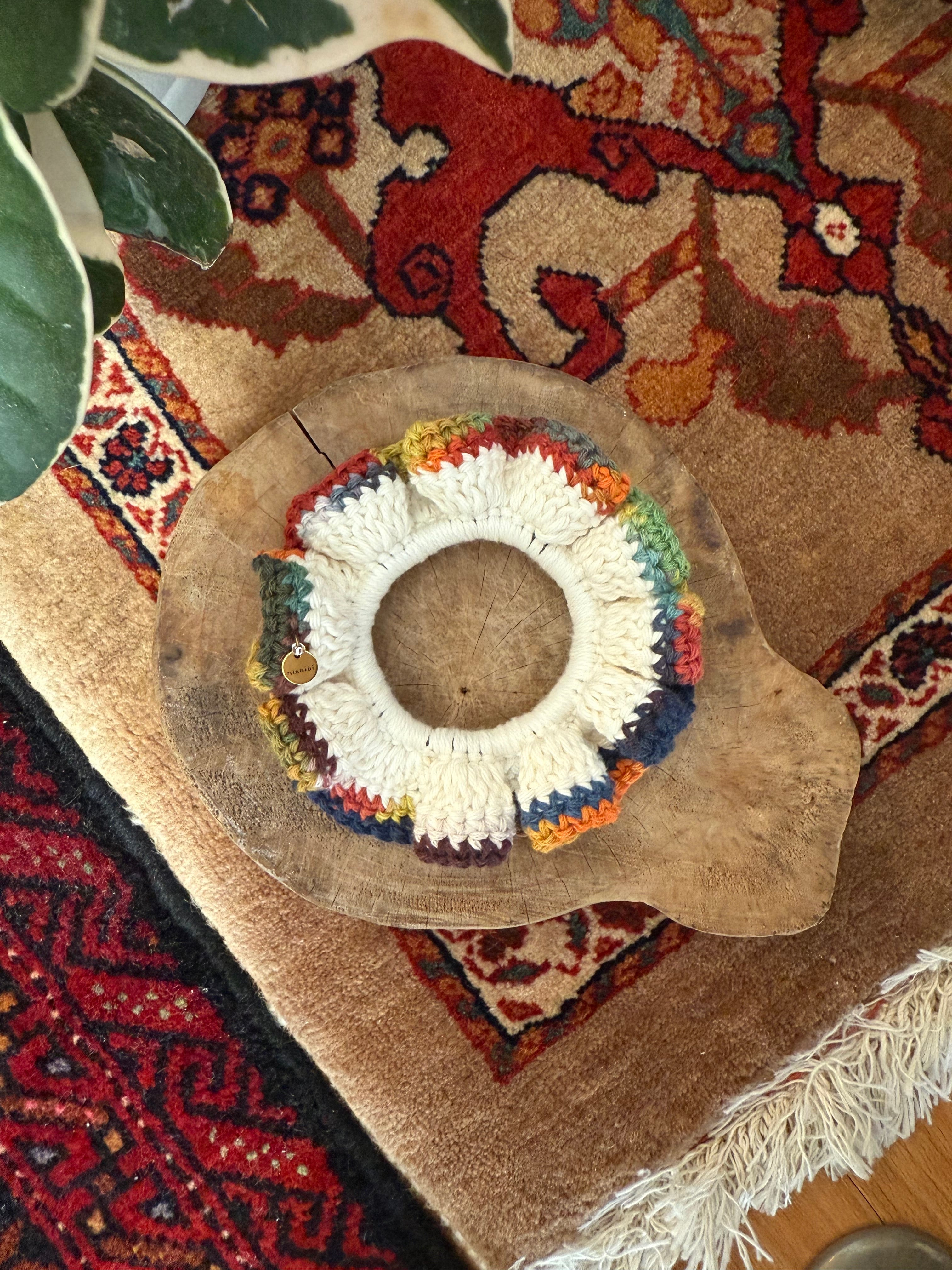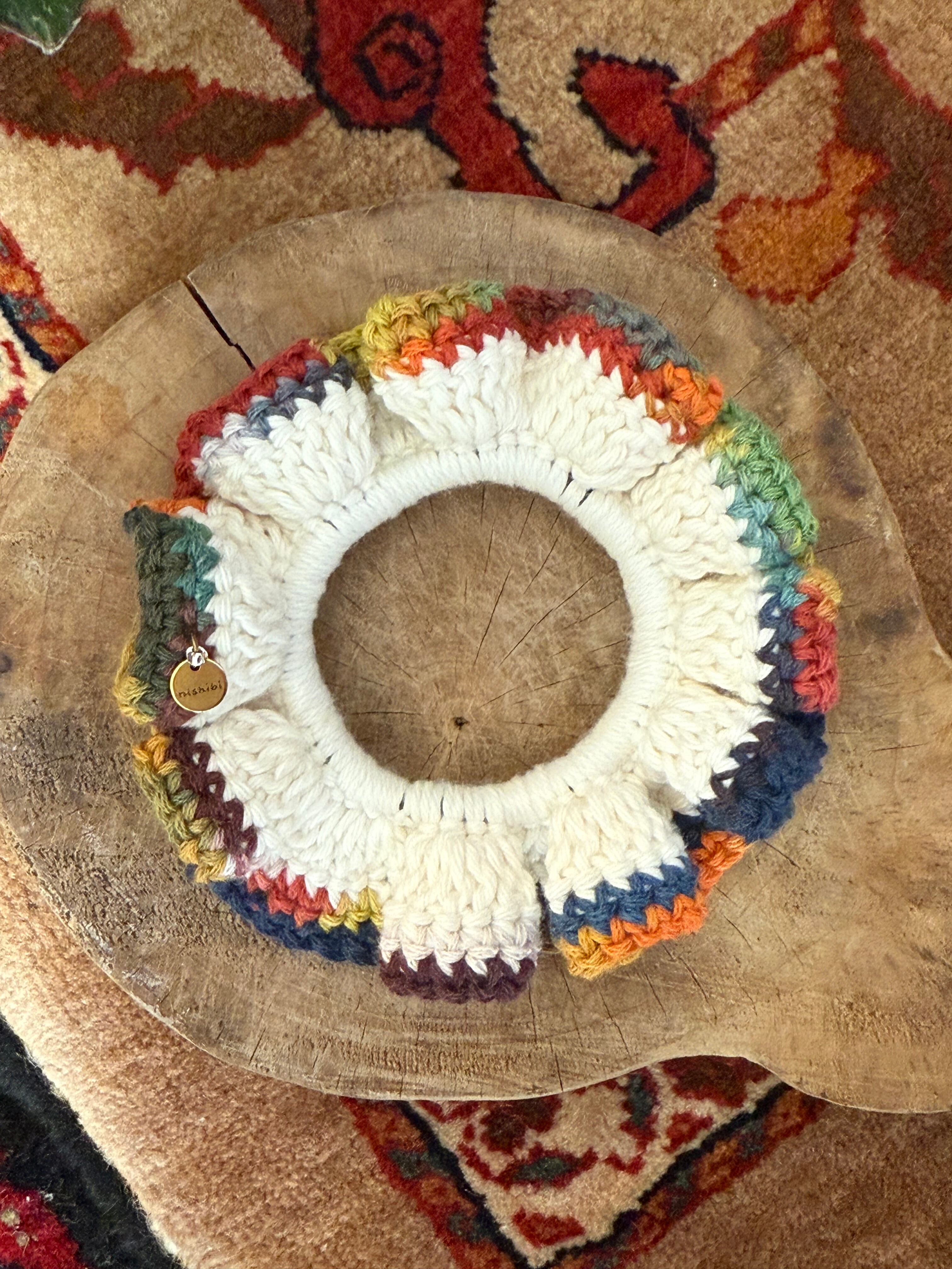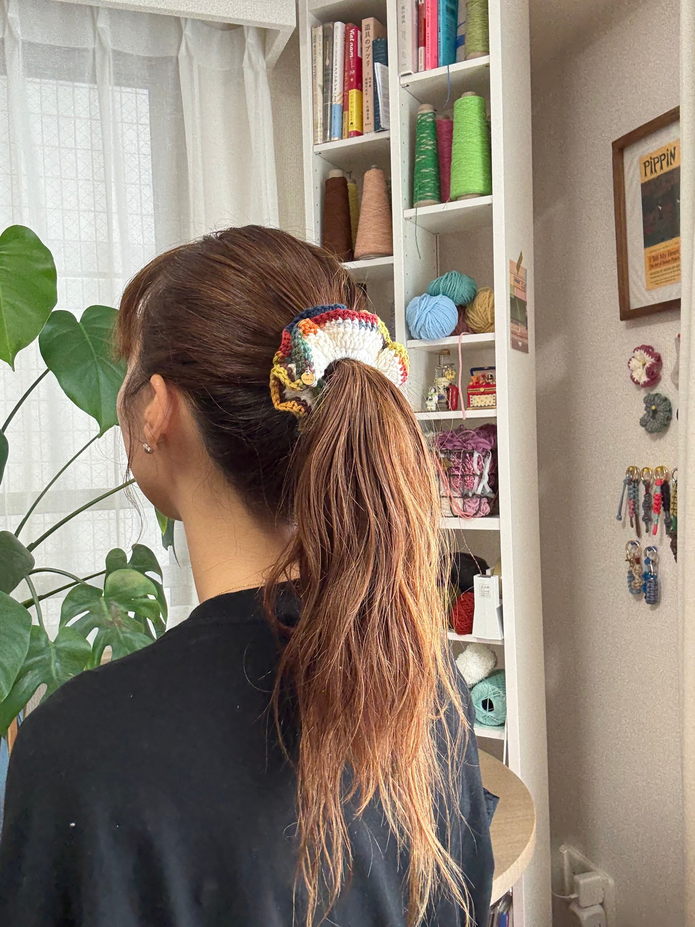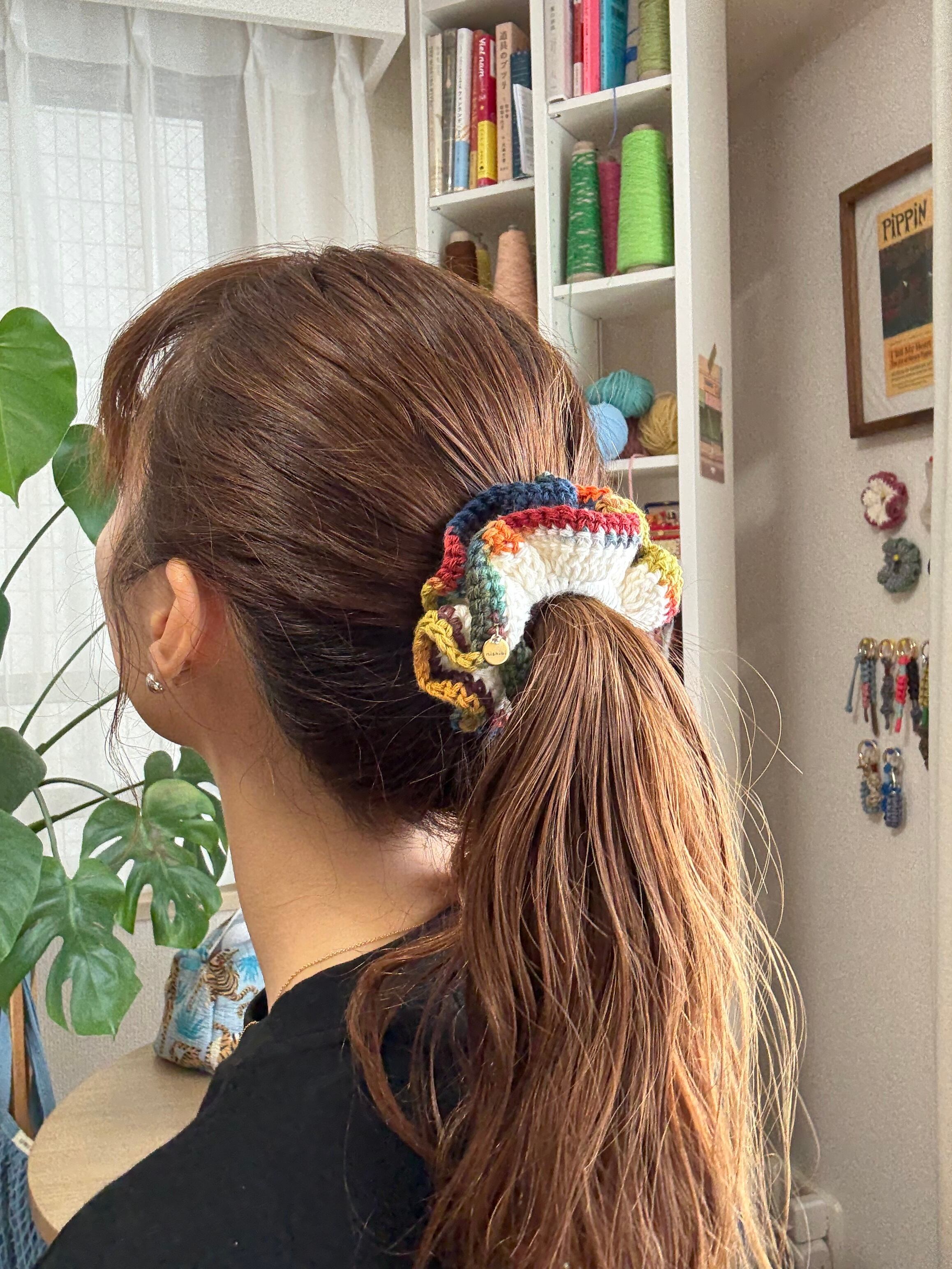 アクセサリー感覚で付けられる手編みのシュシュ。