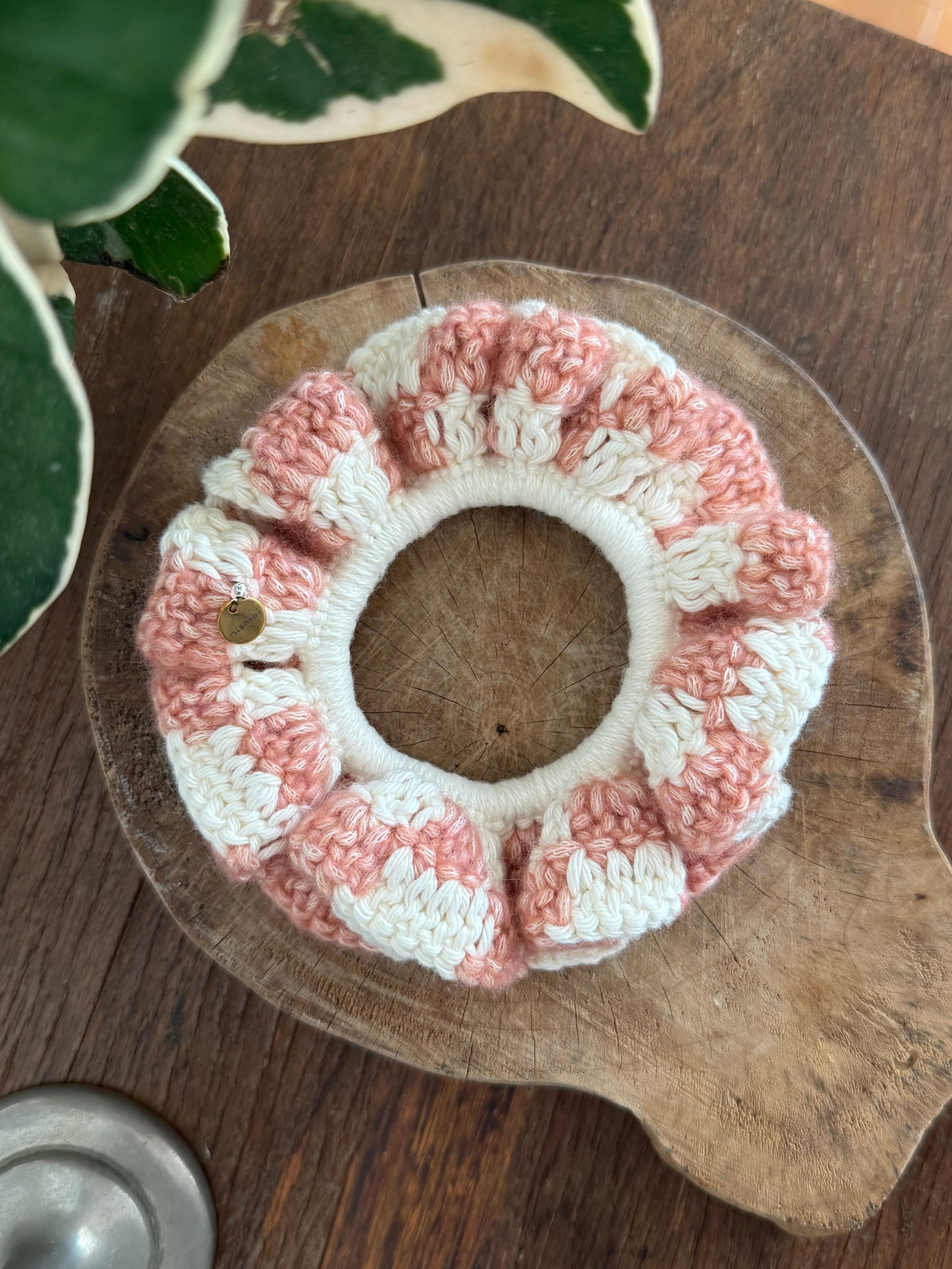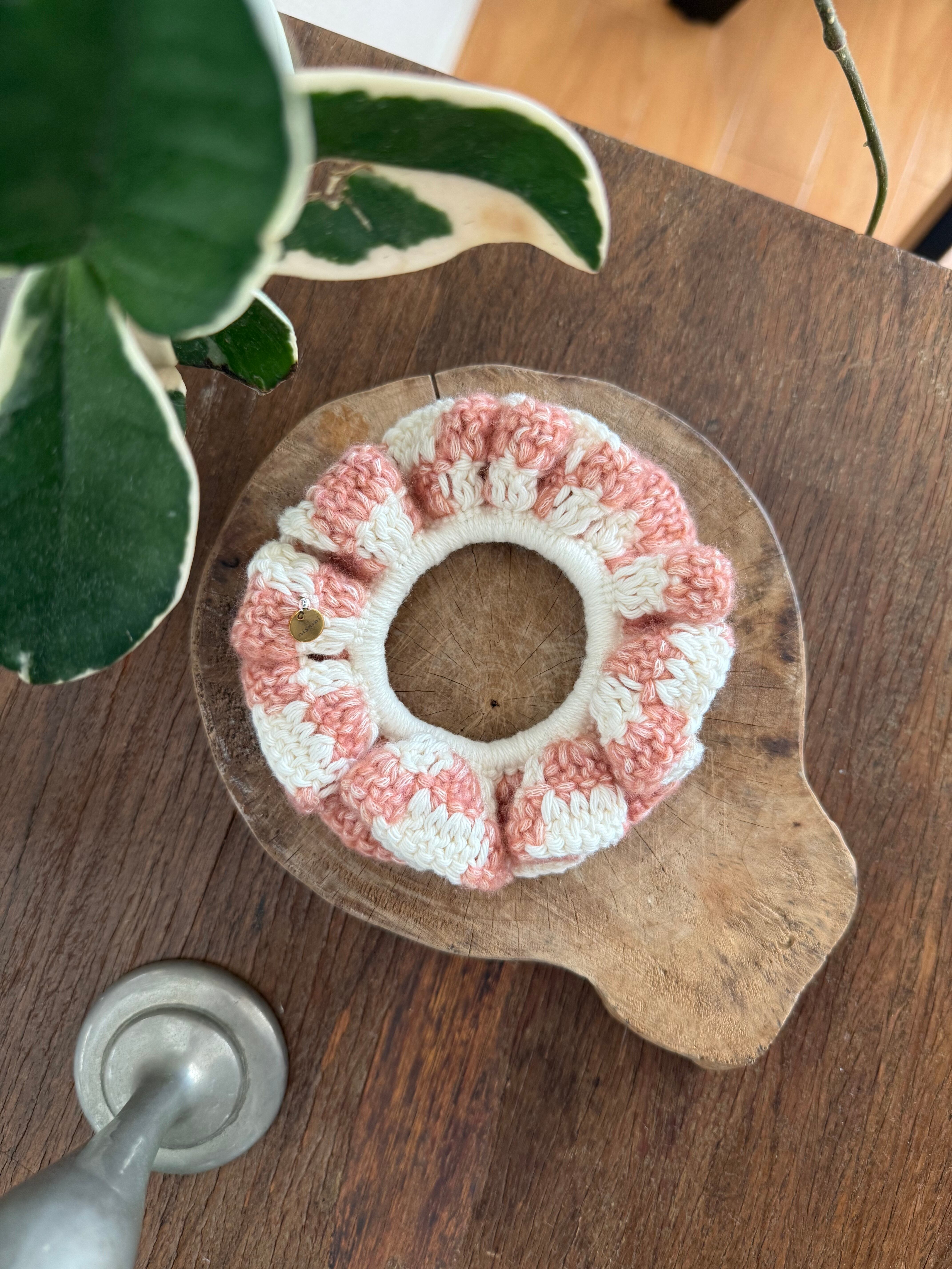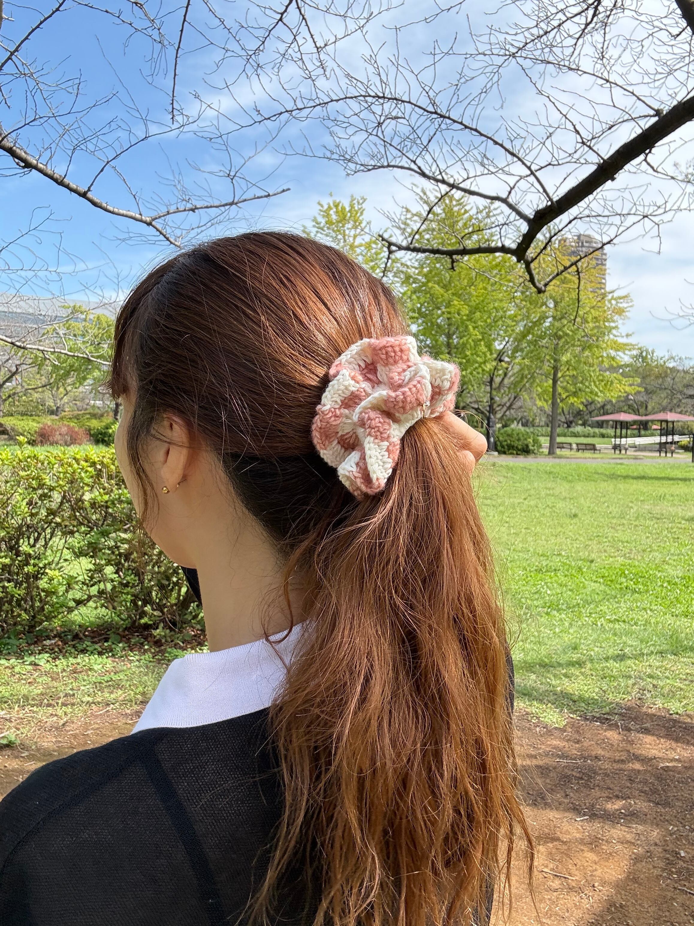 アクセサリー感覚で付けられる手編みのシュシュ。