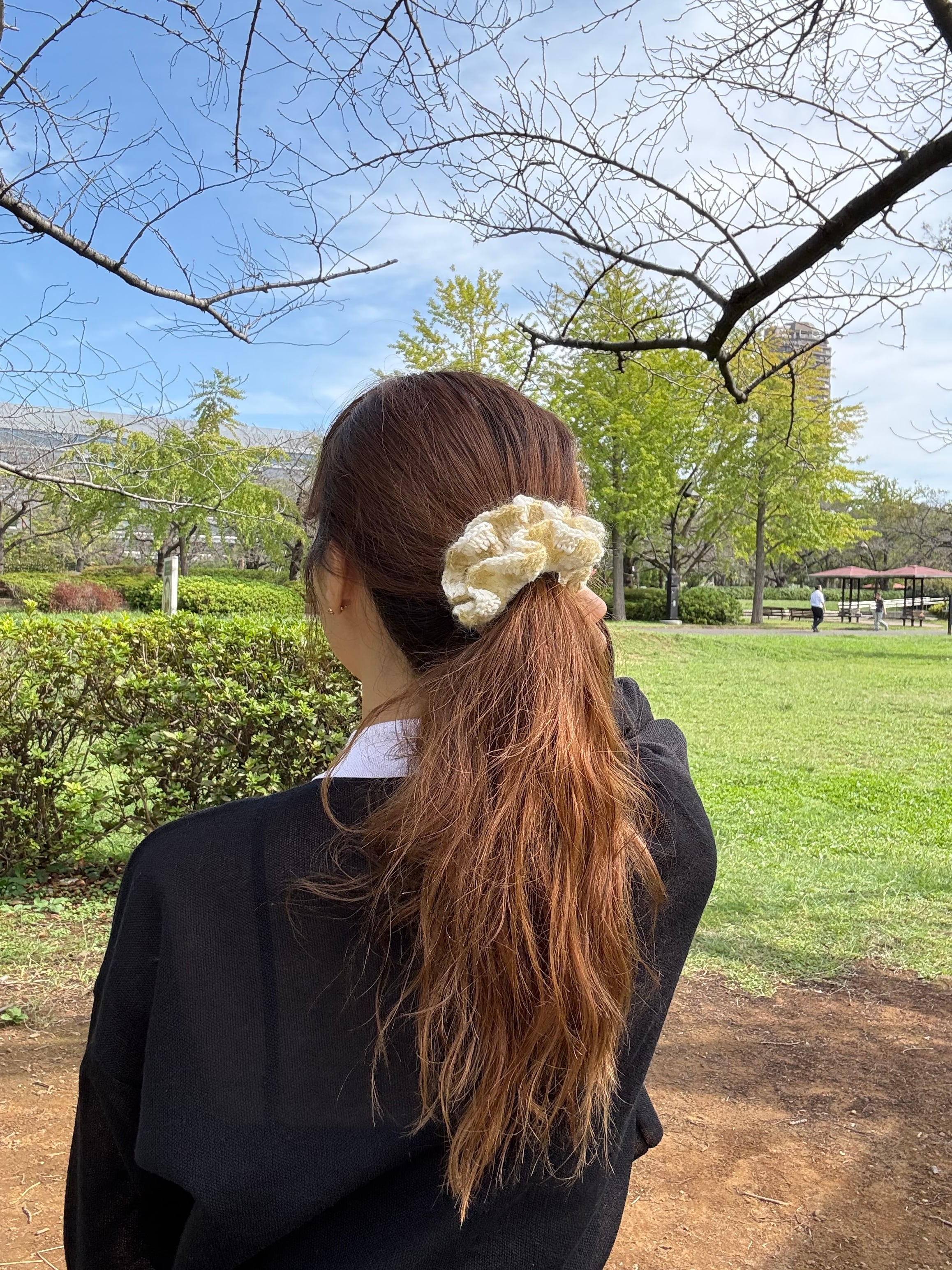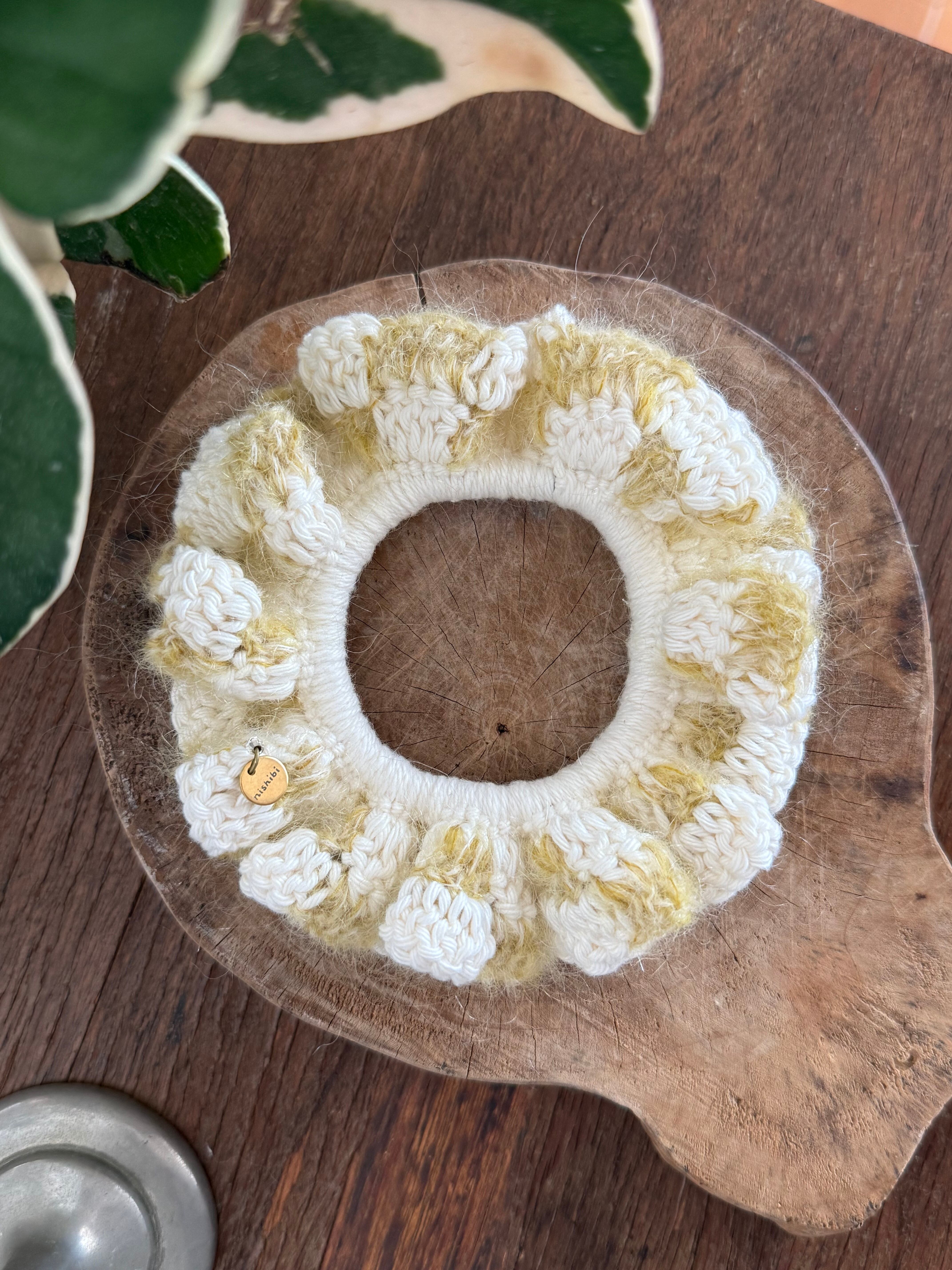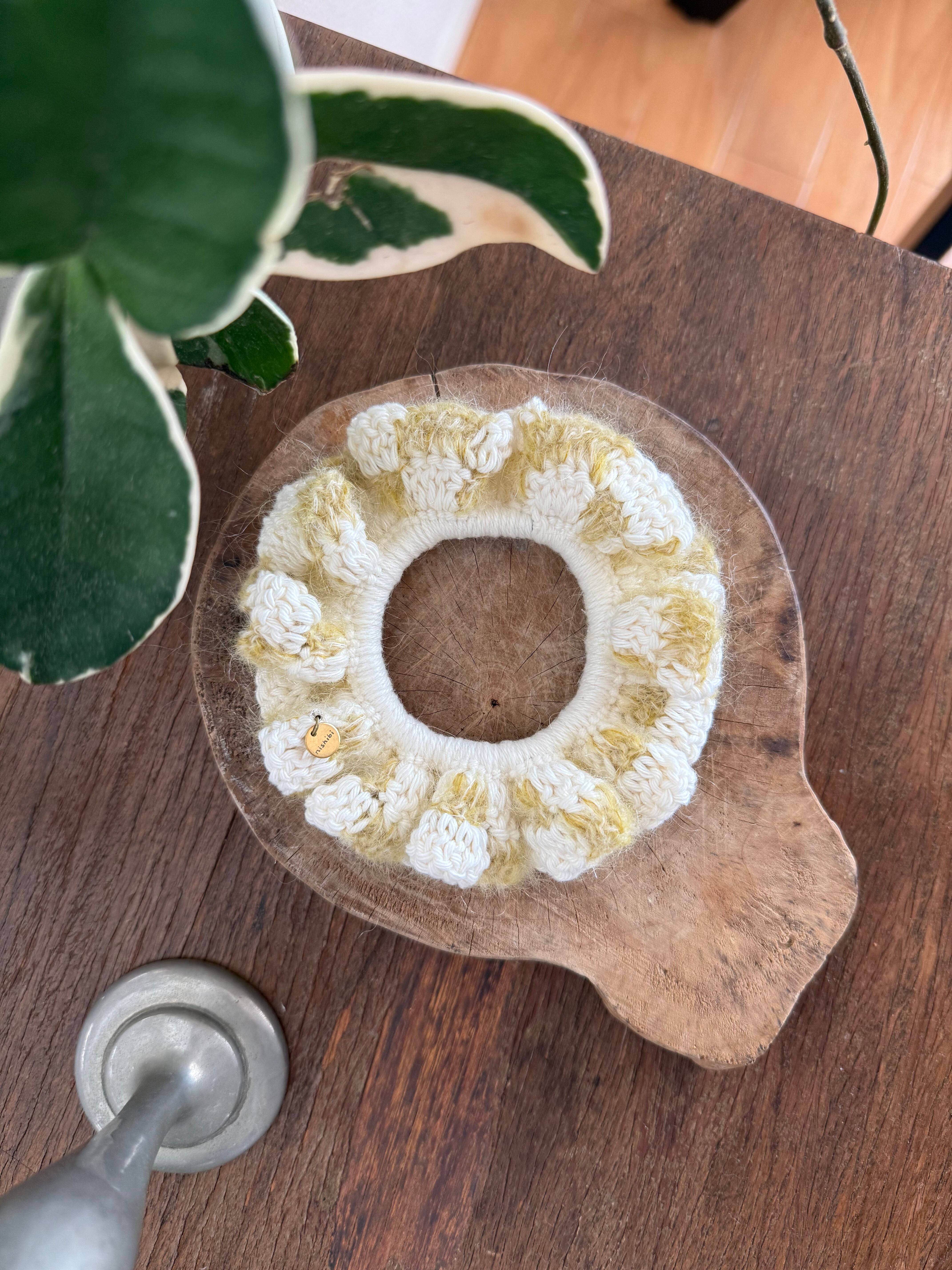アクセサリー感覚で付けられる手編みのシュシュ。
