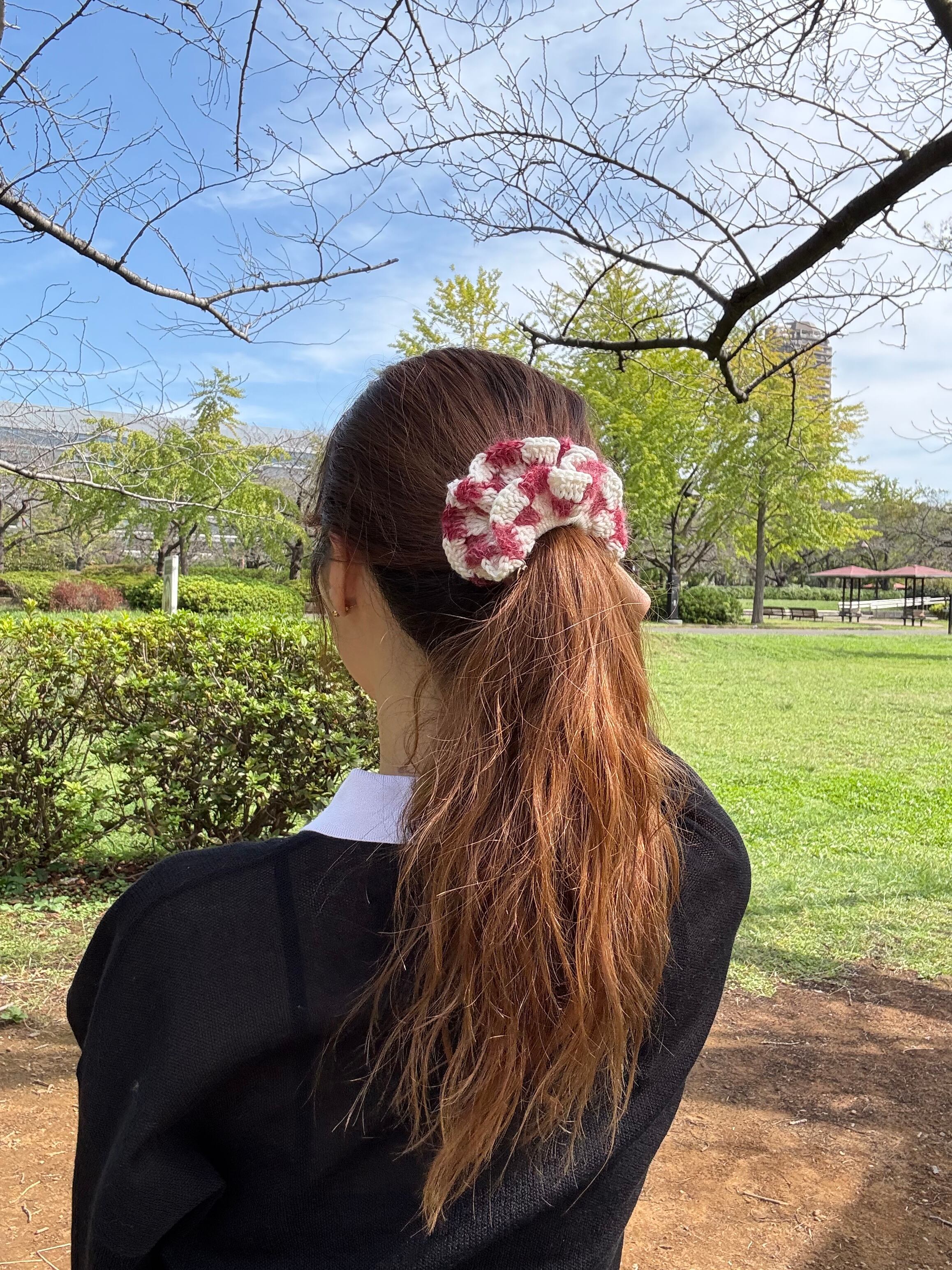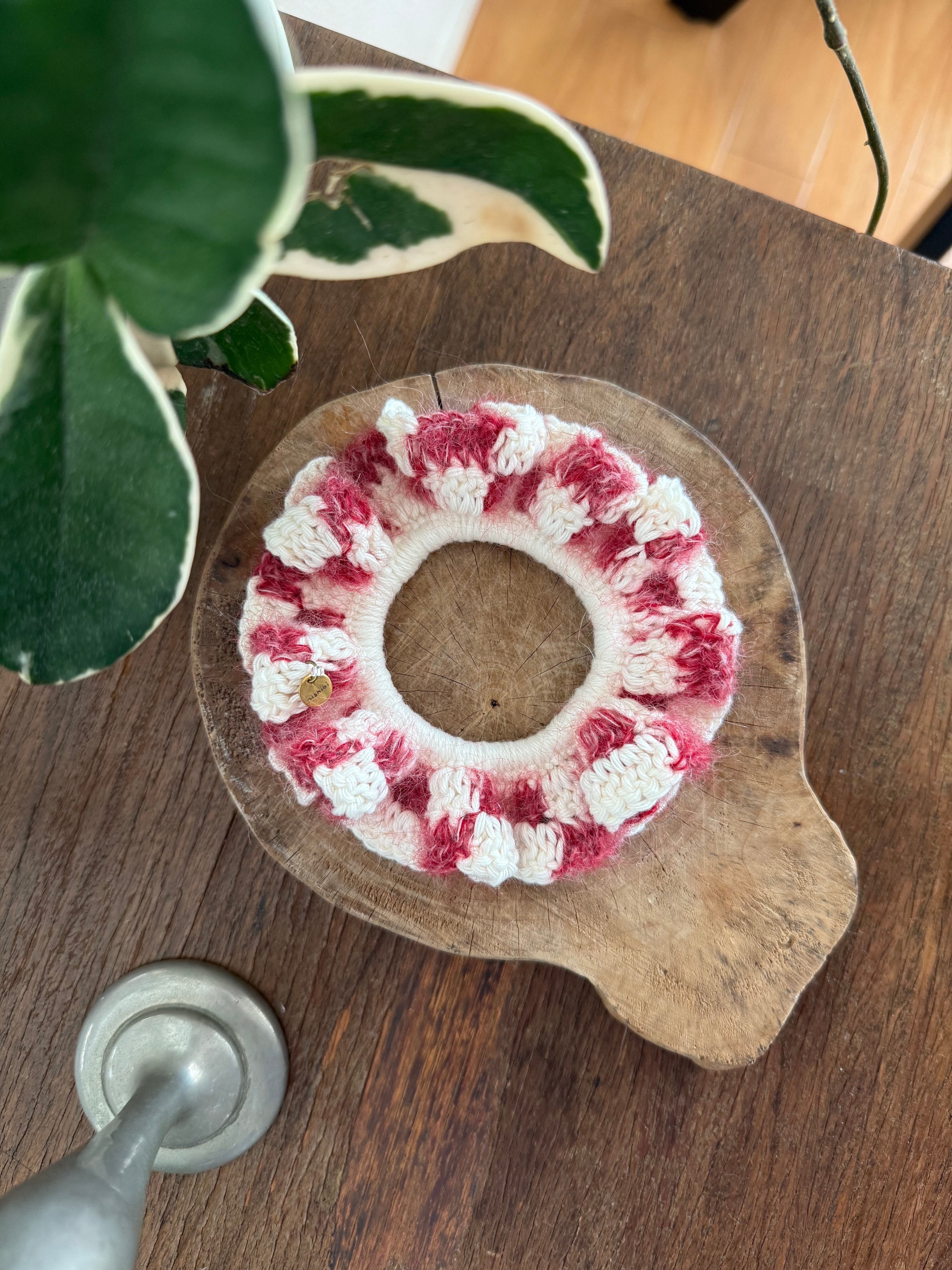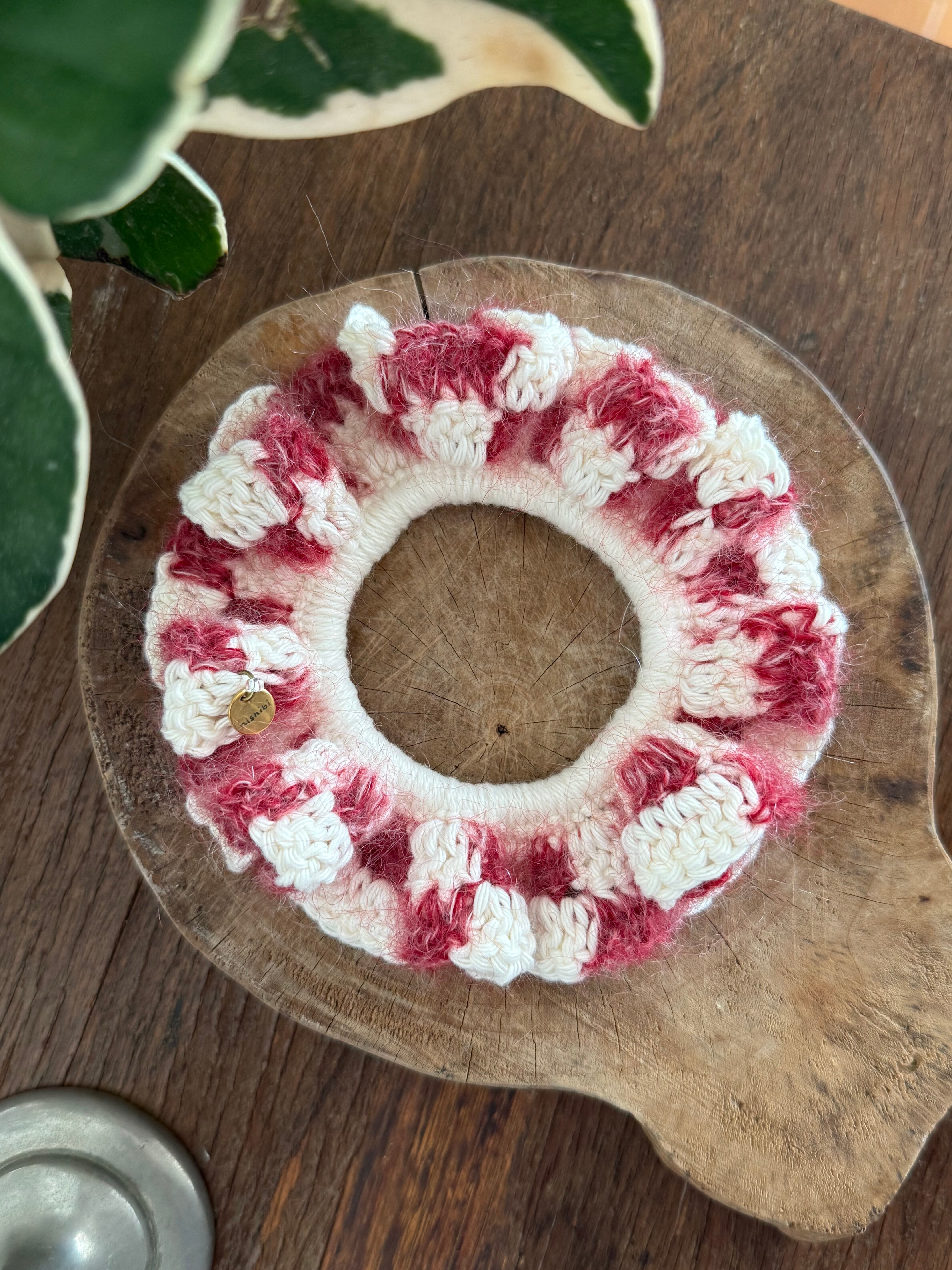 アクセサリー感覚で付けられる手編みのシュシュ。