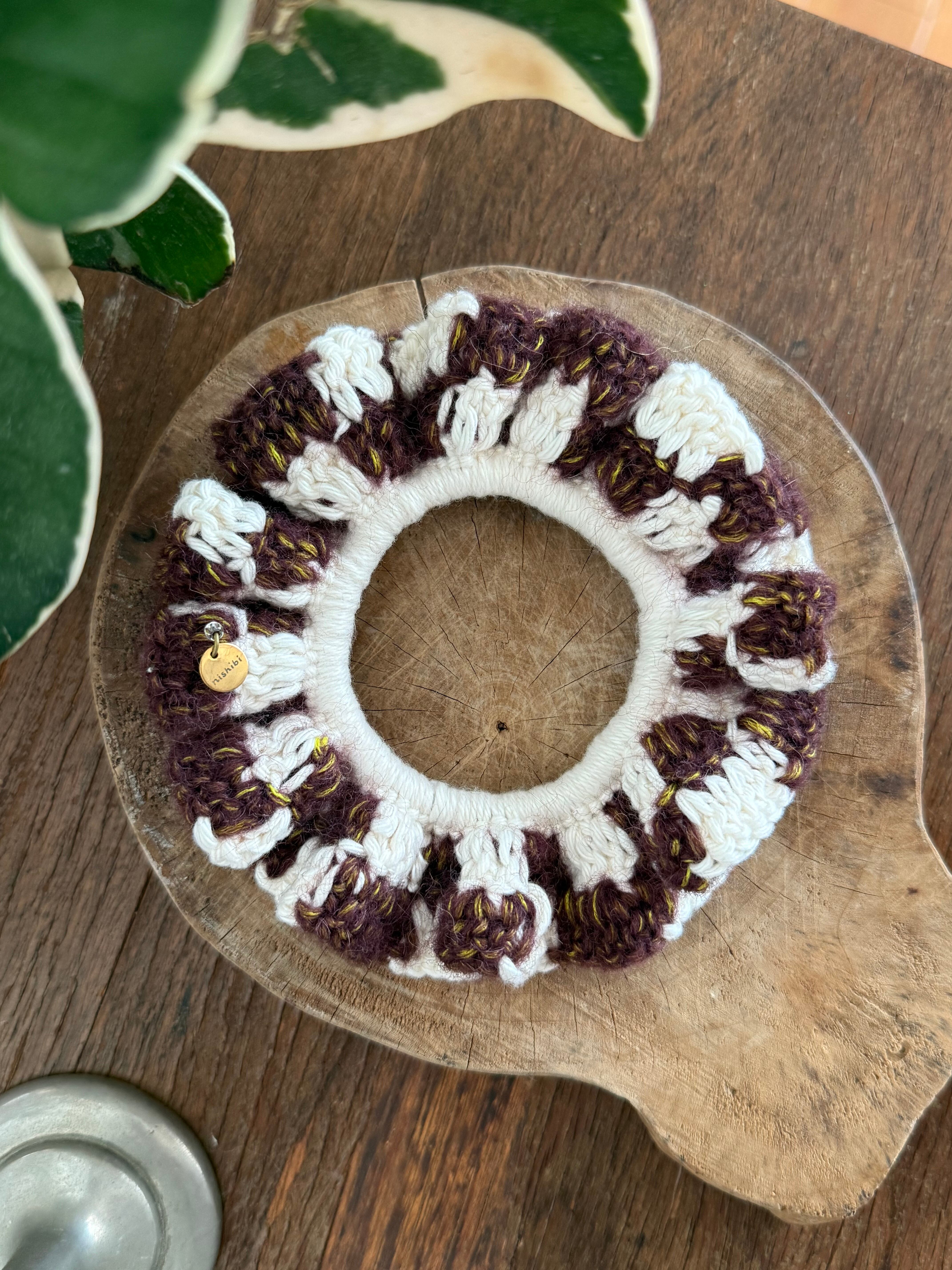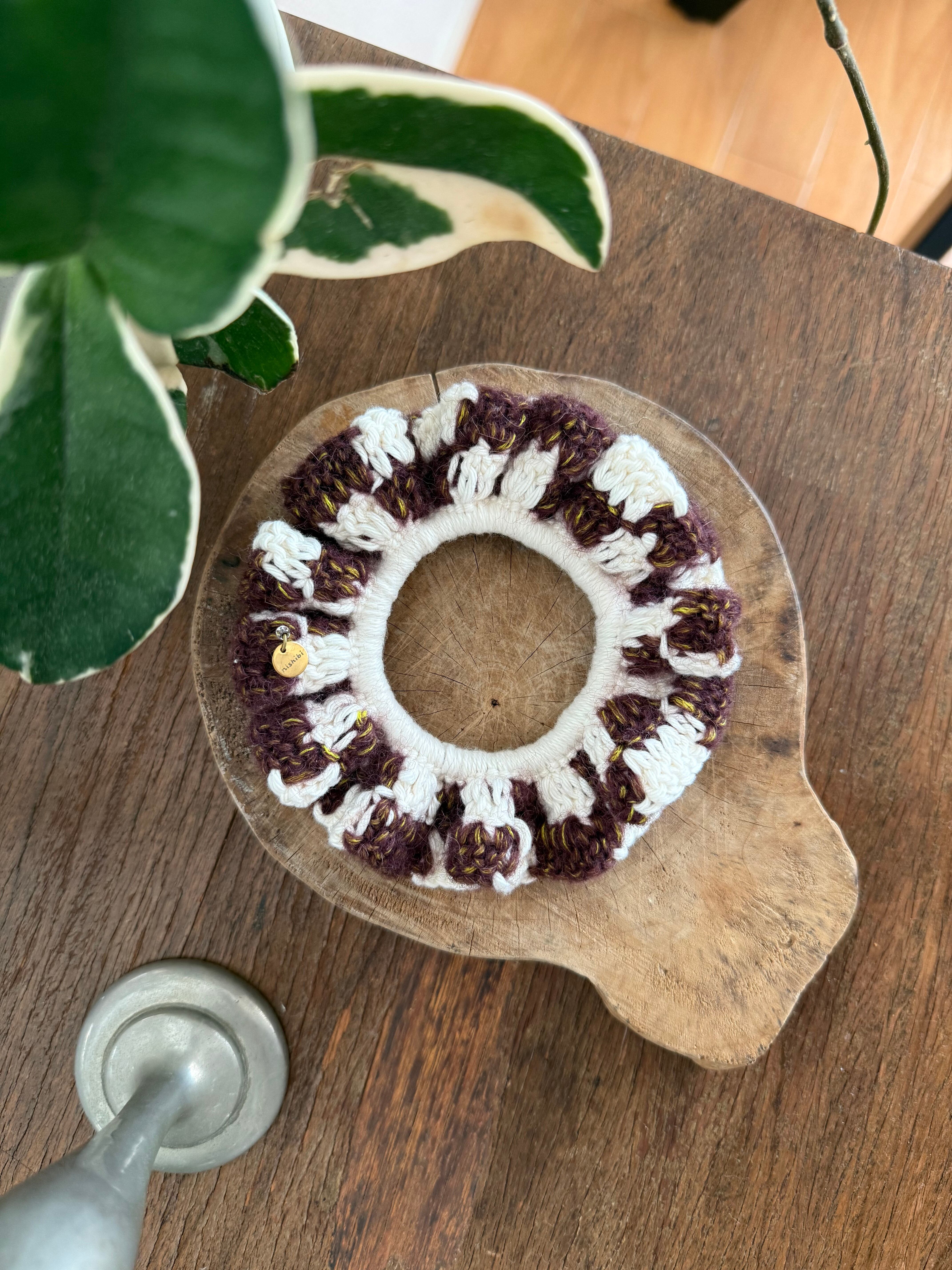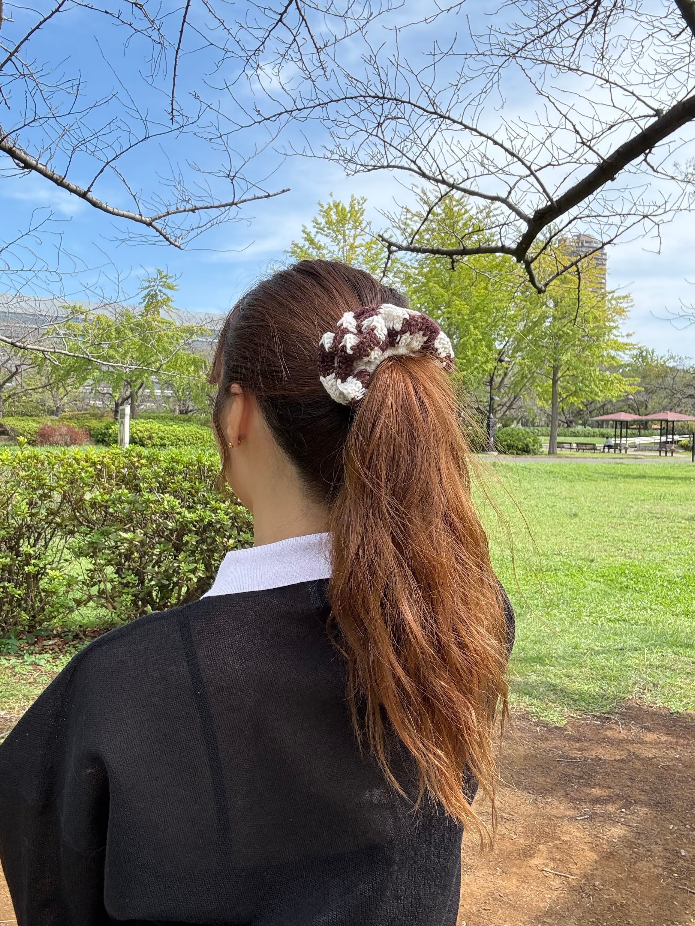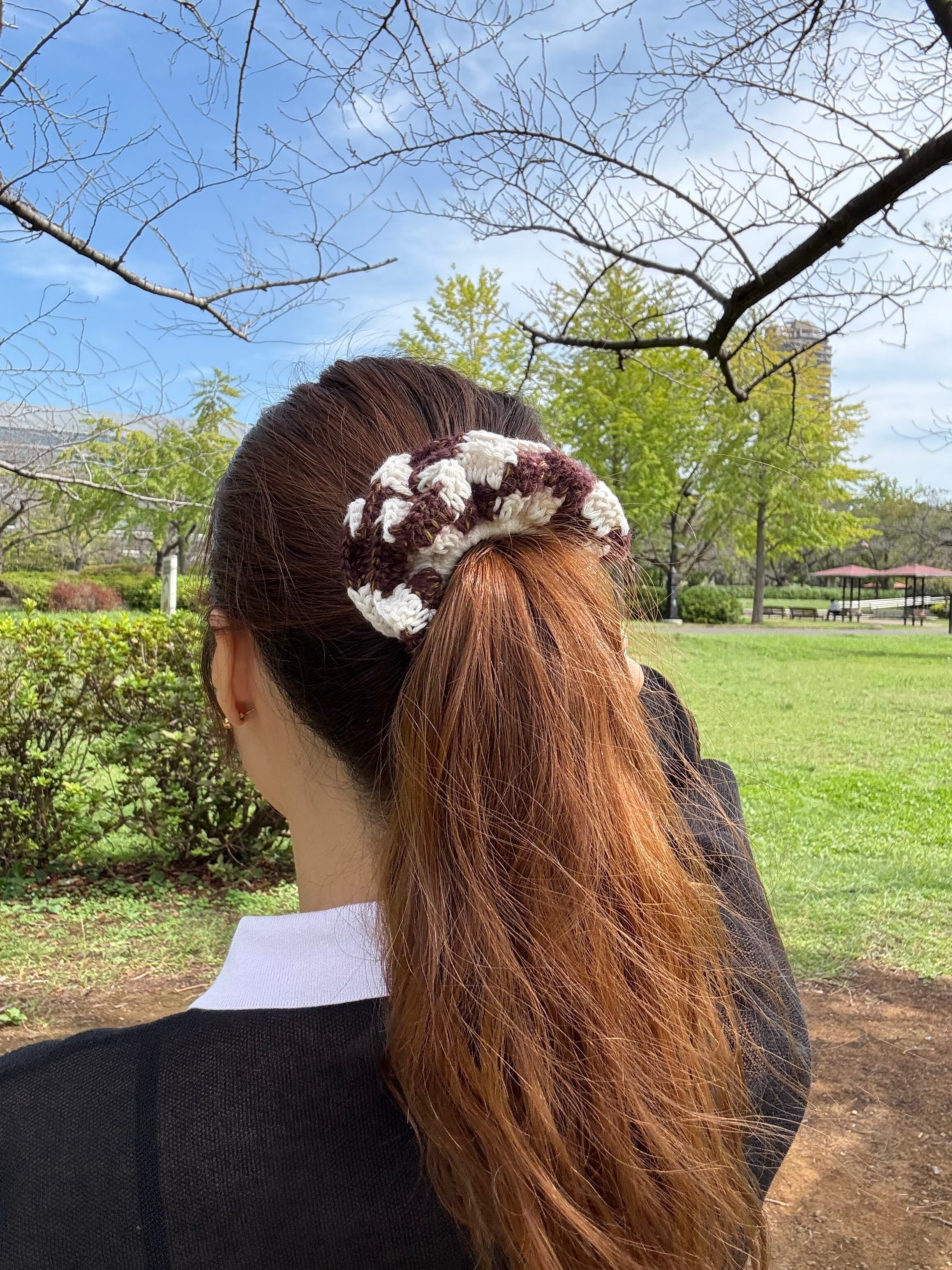 アクセサリー感覚で付けられる手編みのシュシュ。