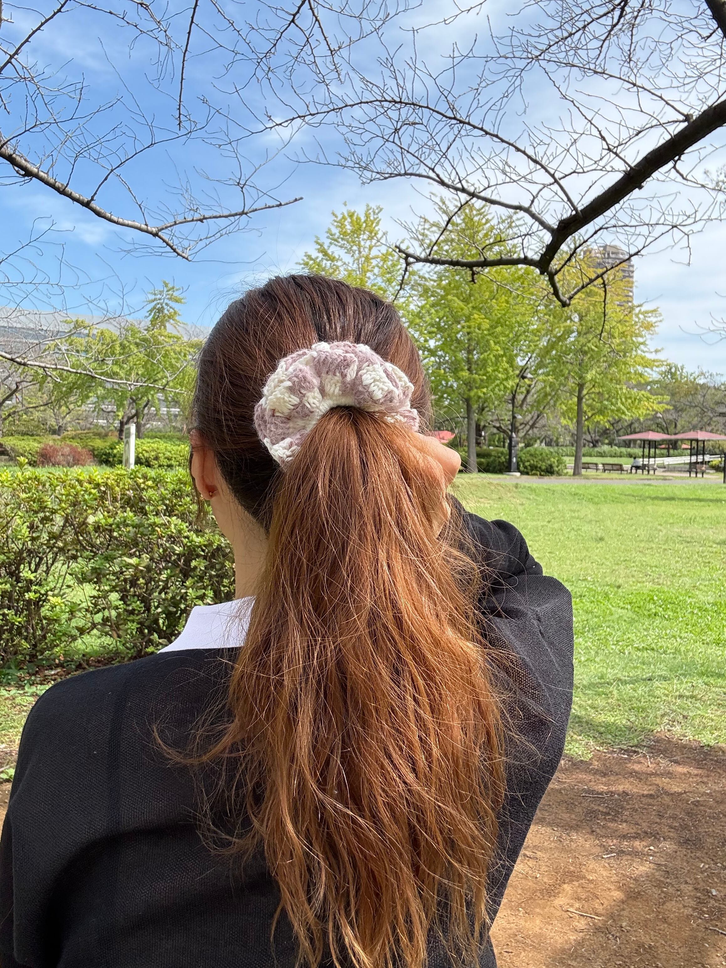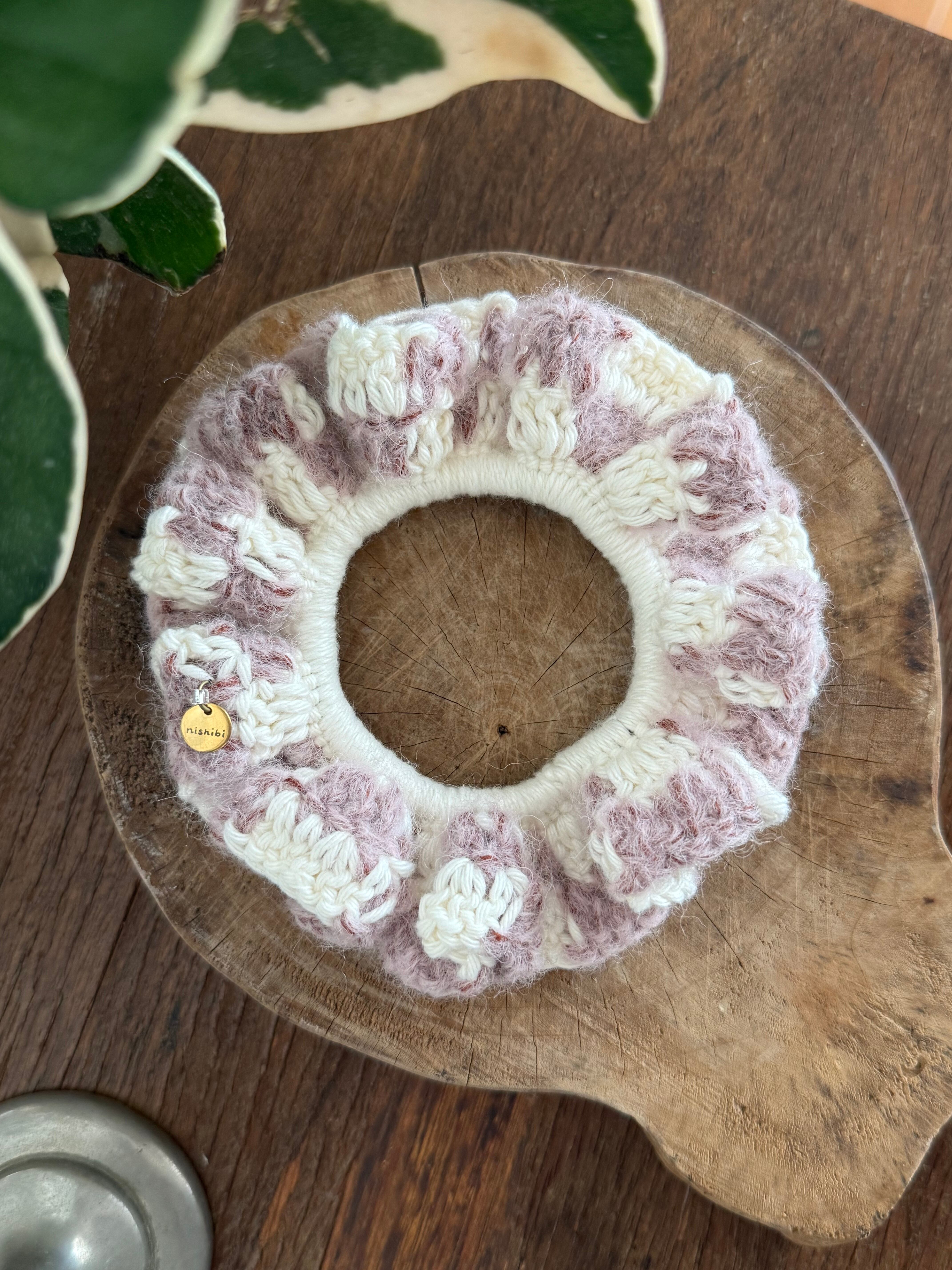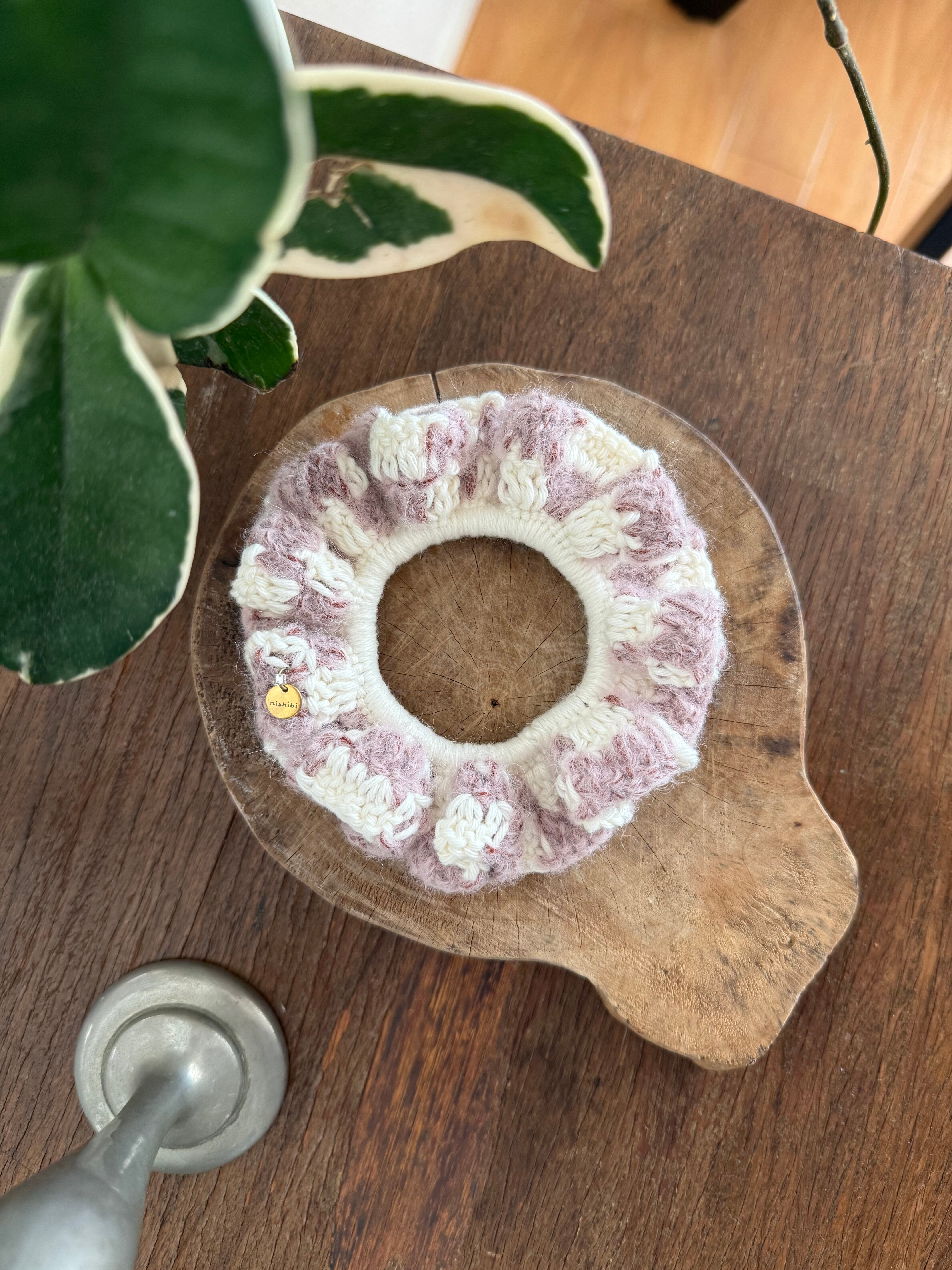 アクセサリー感覚で付けられる手編みのシュシュ。
