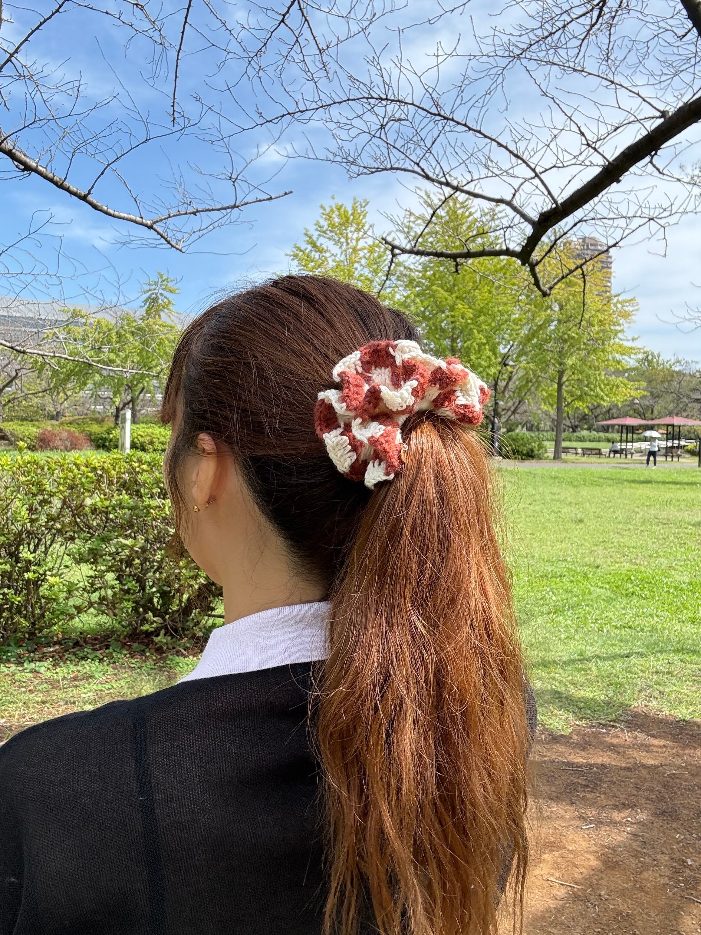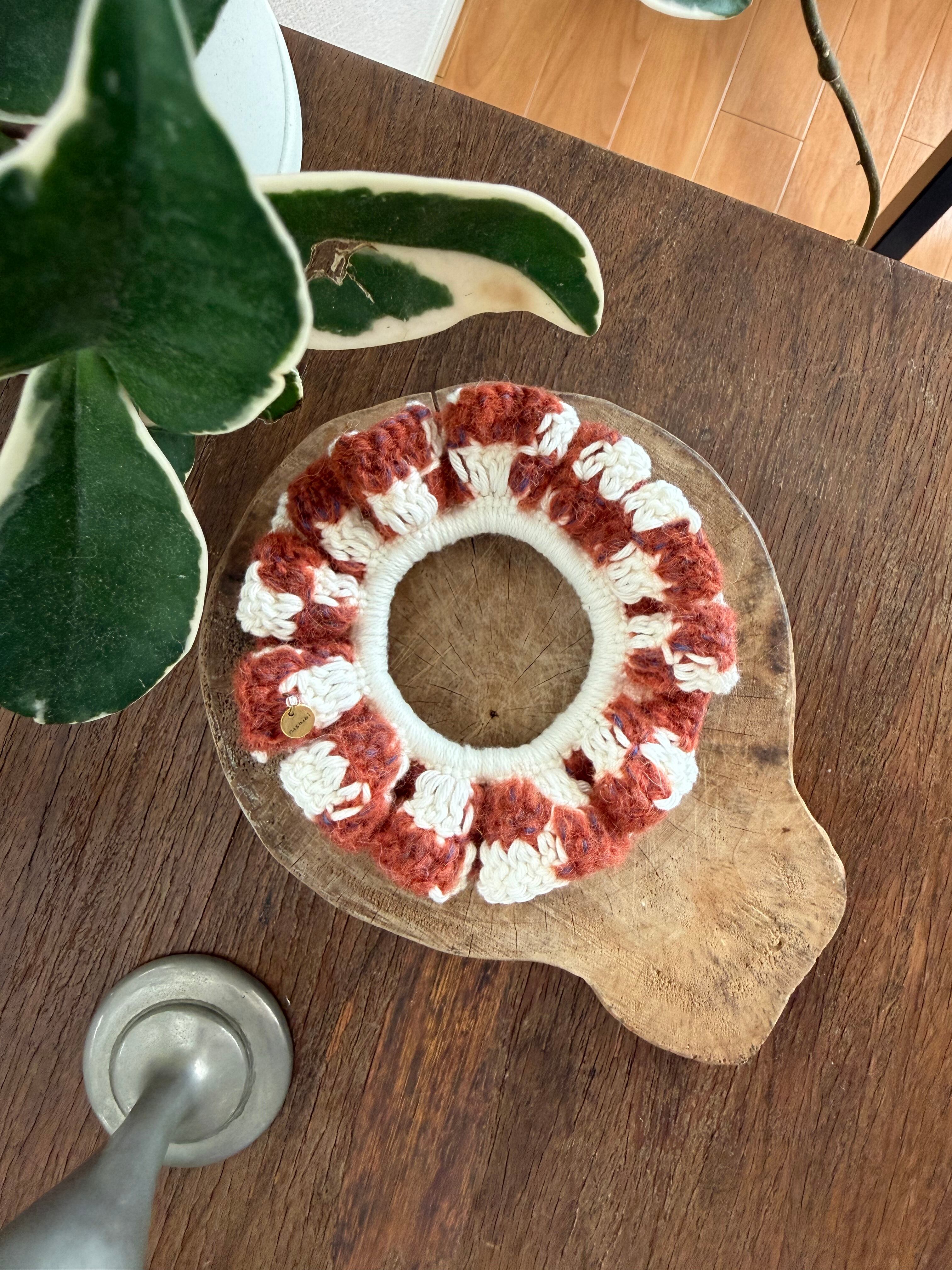 アクセサリー感覚で付けられる手編みのシュシュ。