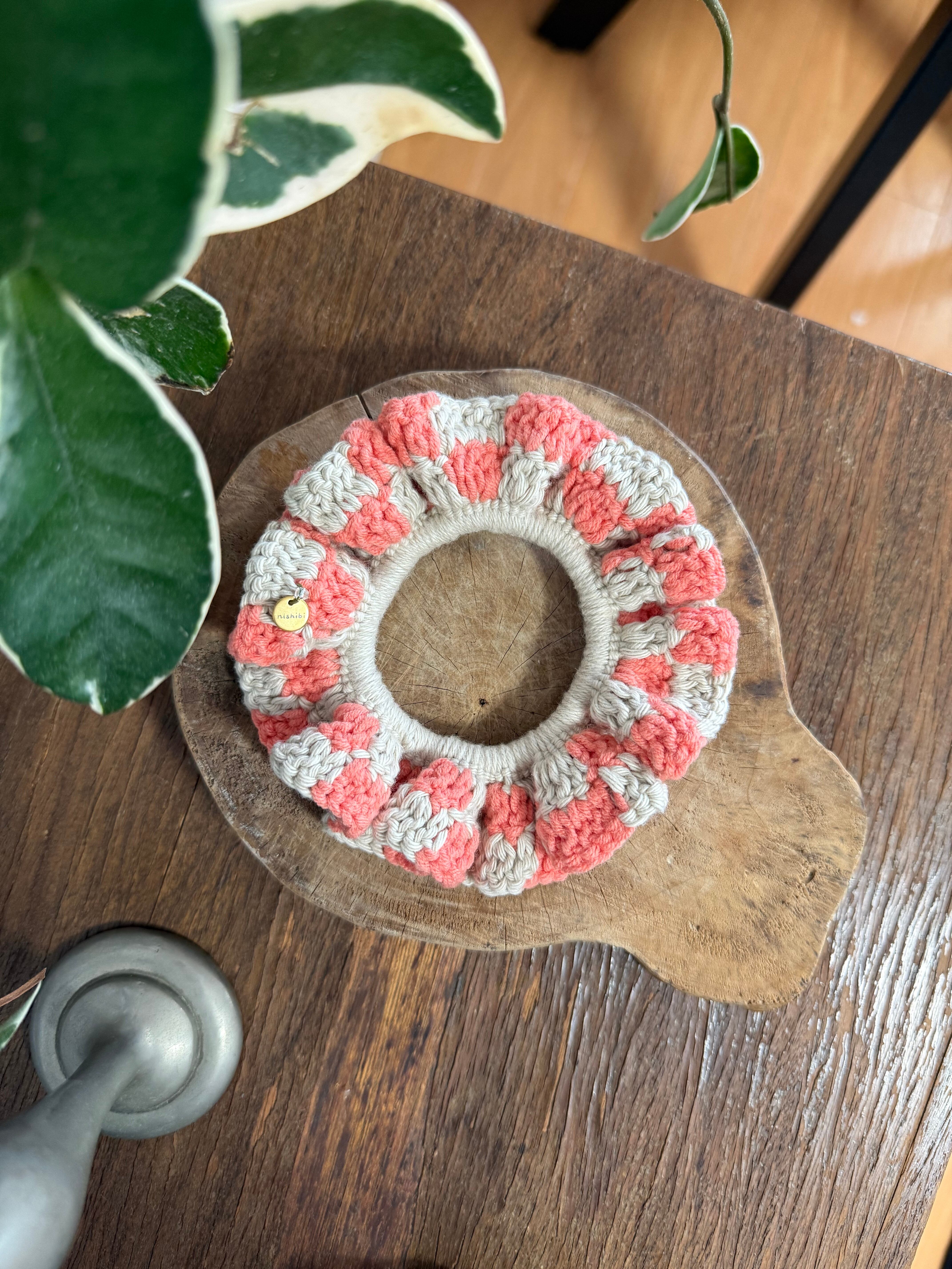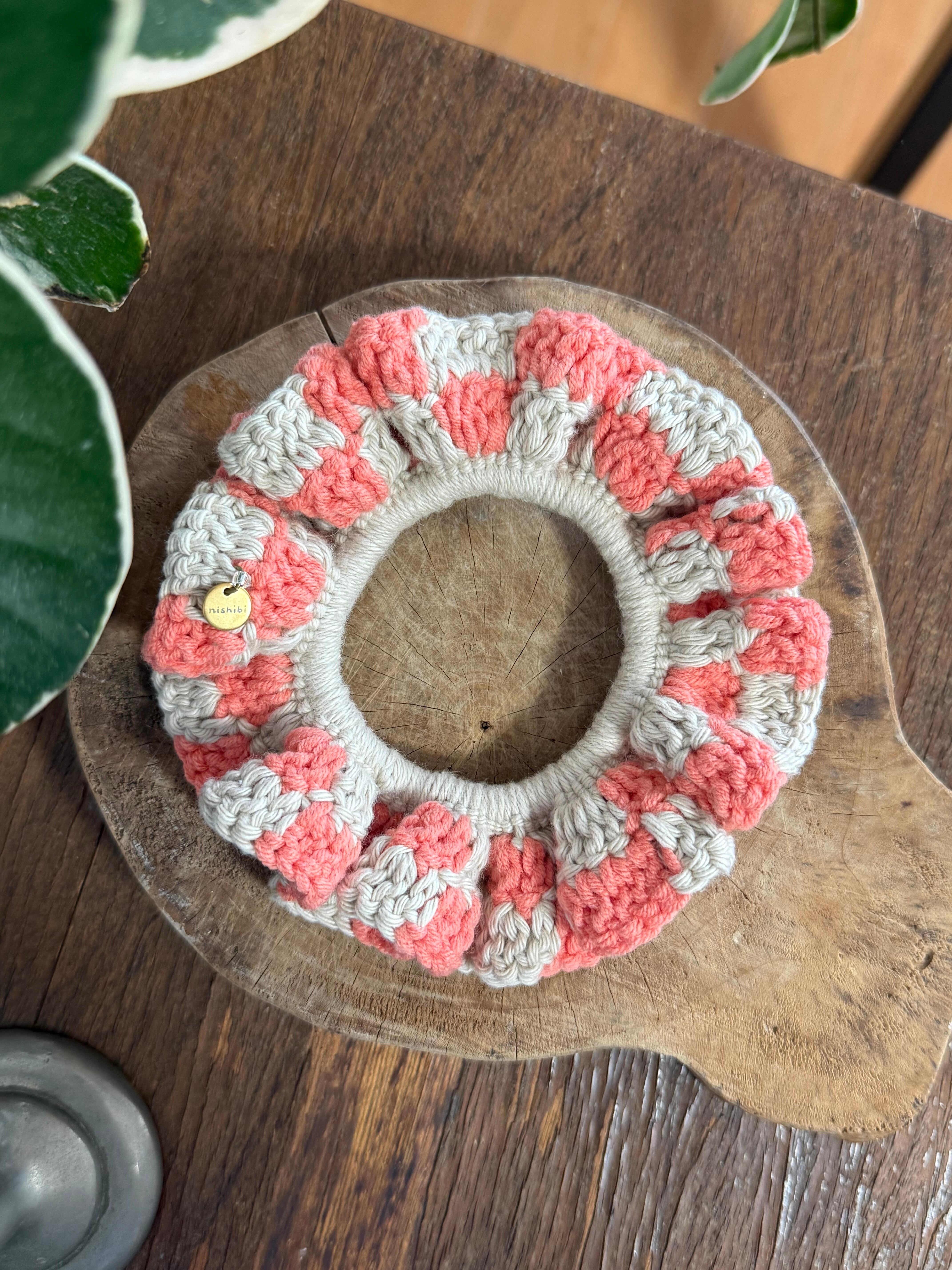 アクセサリー感覚で付けられる手編みのシュシュ。