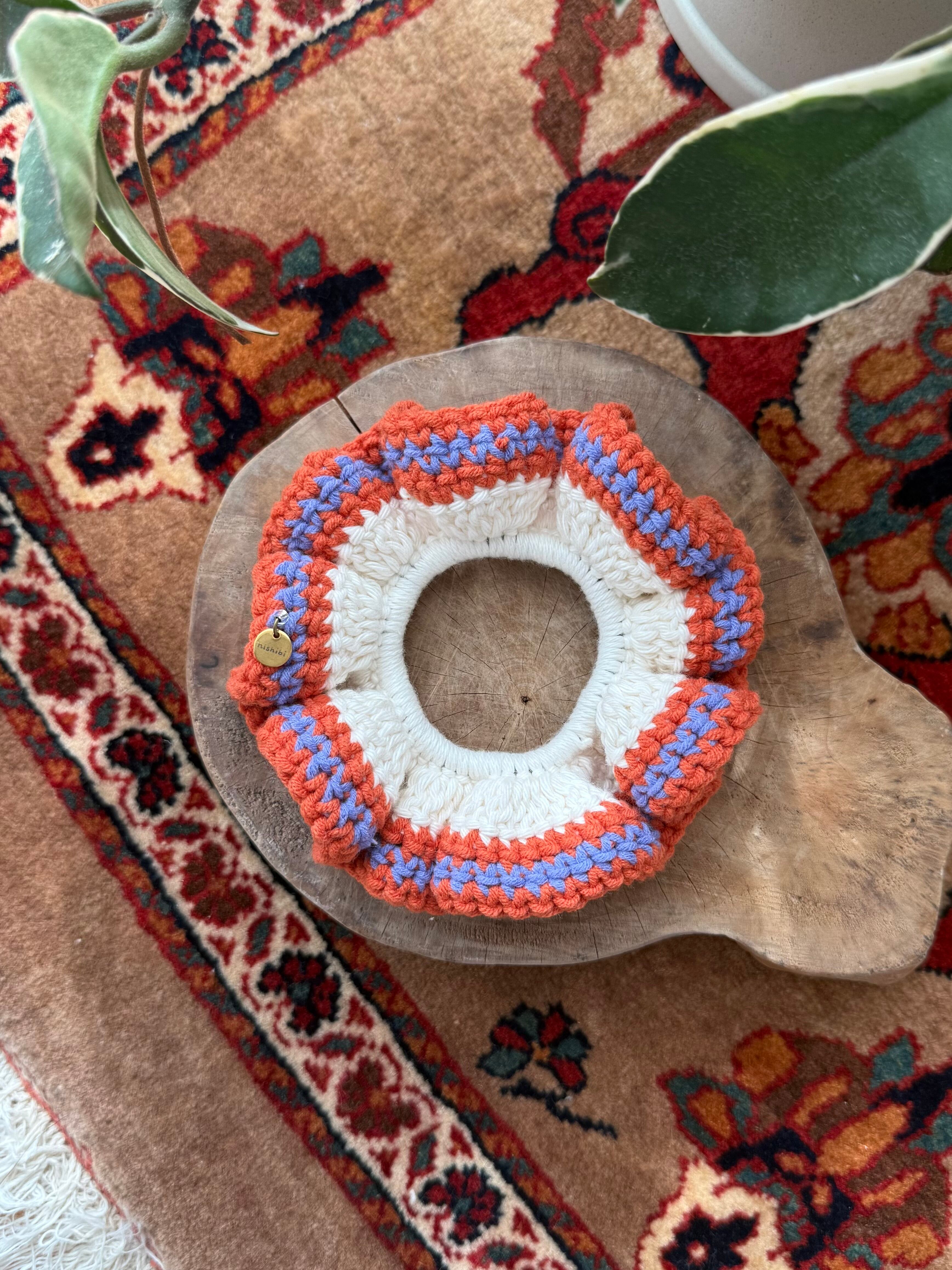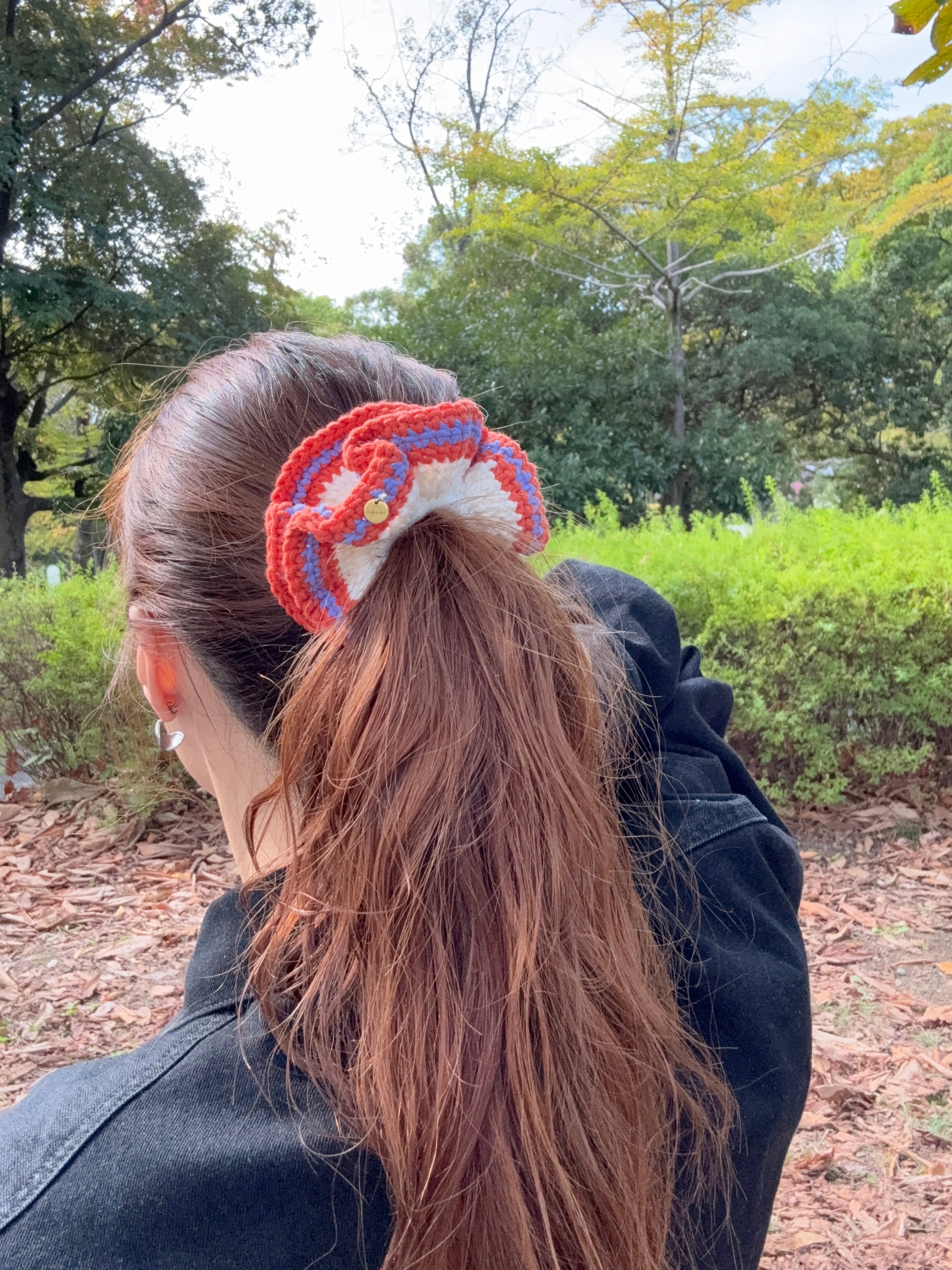 アクセサリー感覚で付けられる手編みのシュシュ。