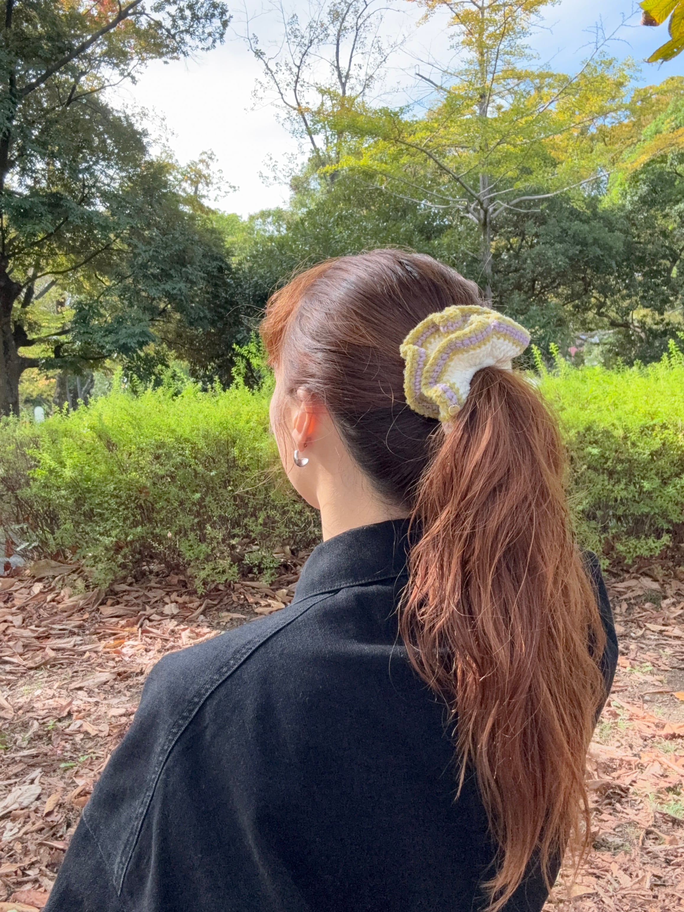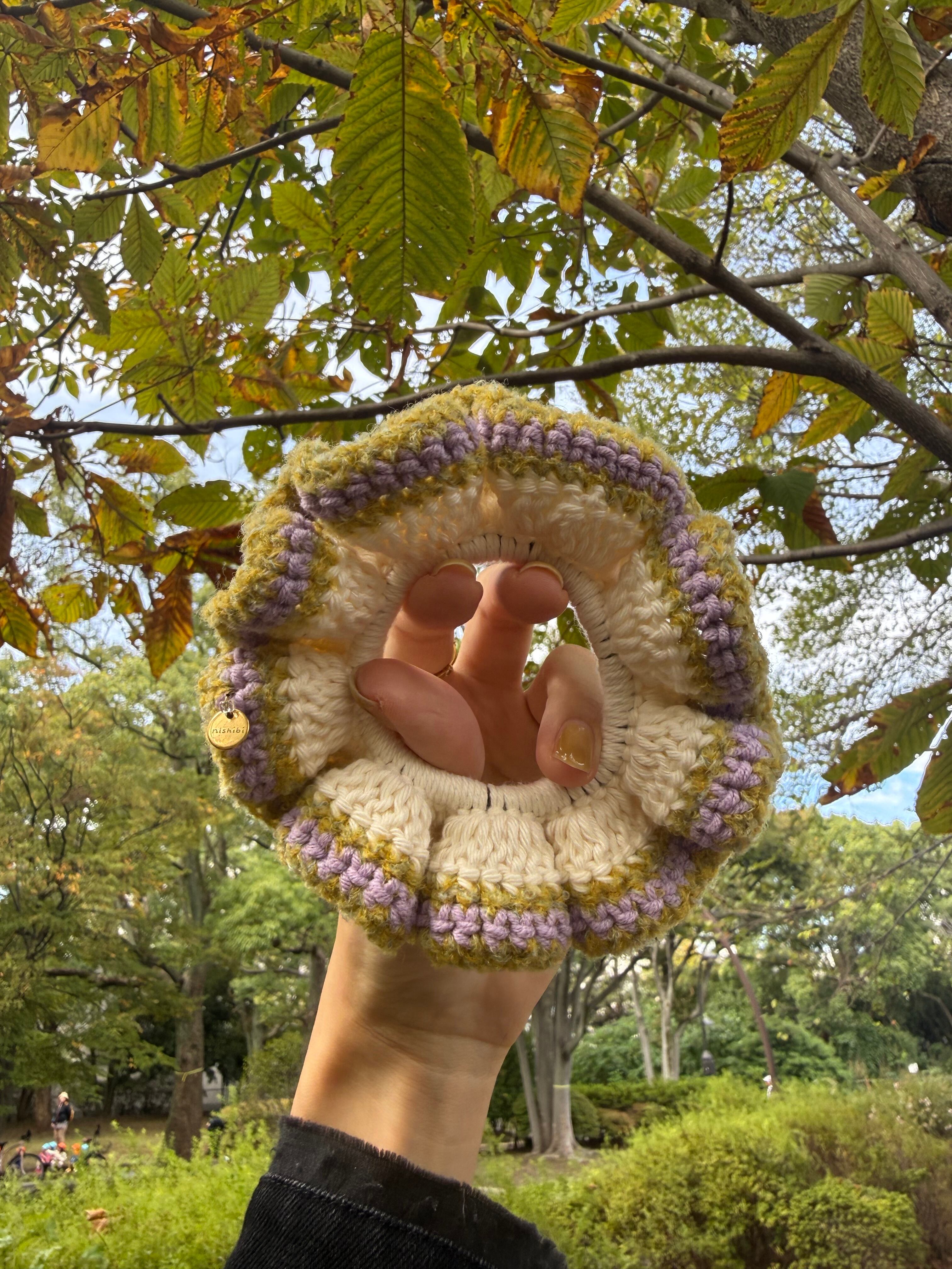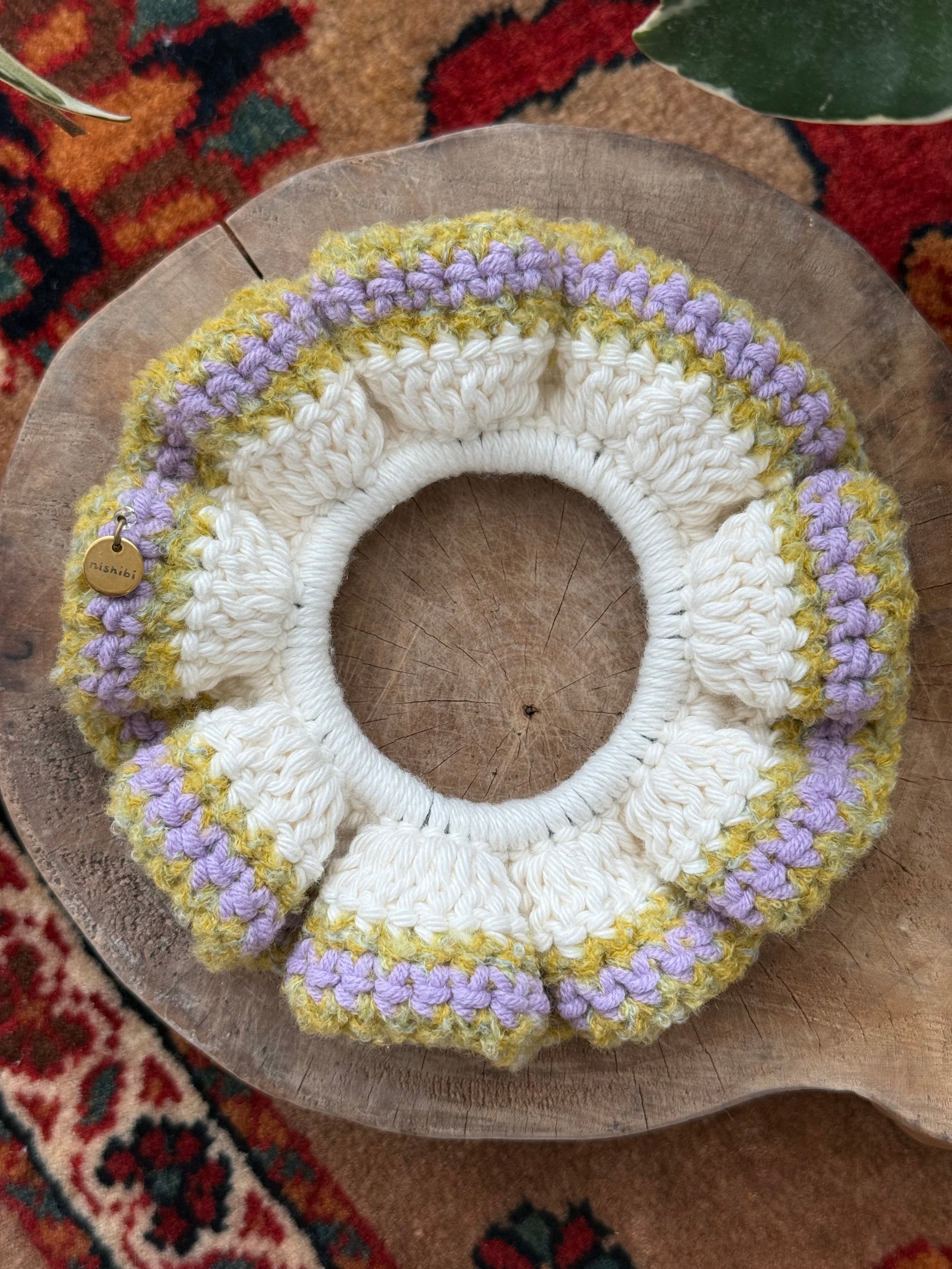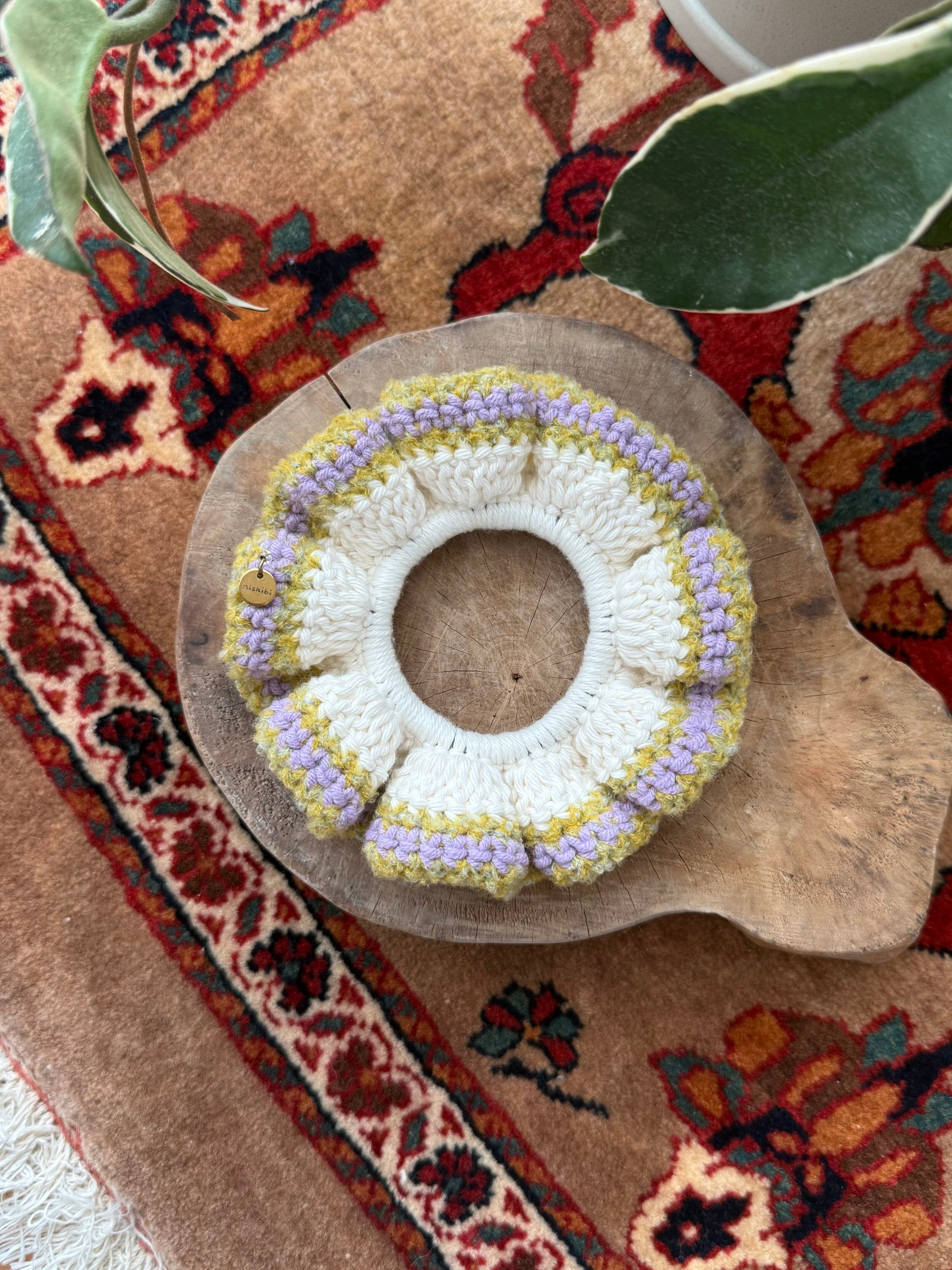 アクセサリー感覚で付けられる手編みのシュシュ。