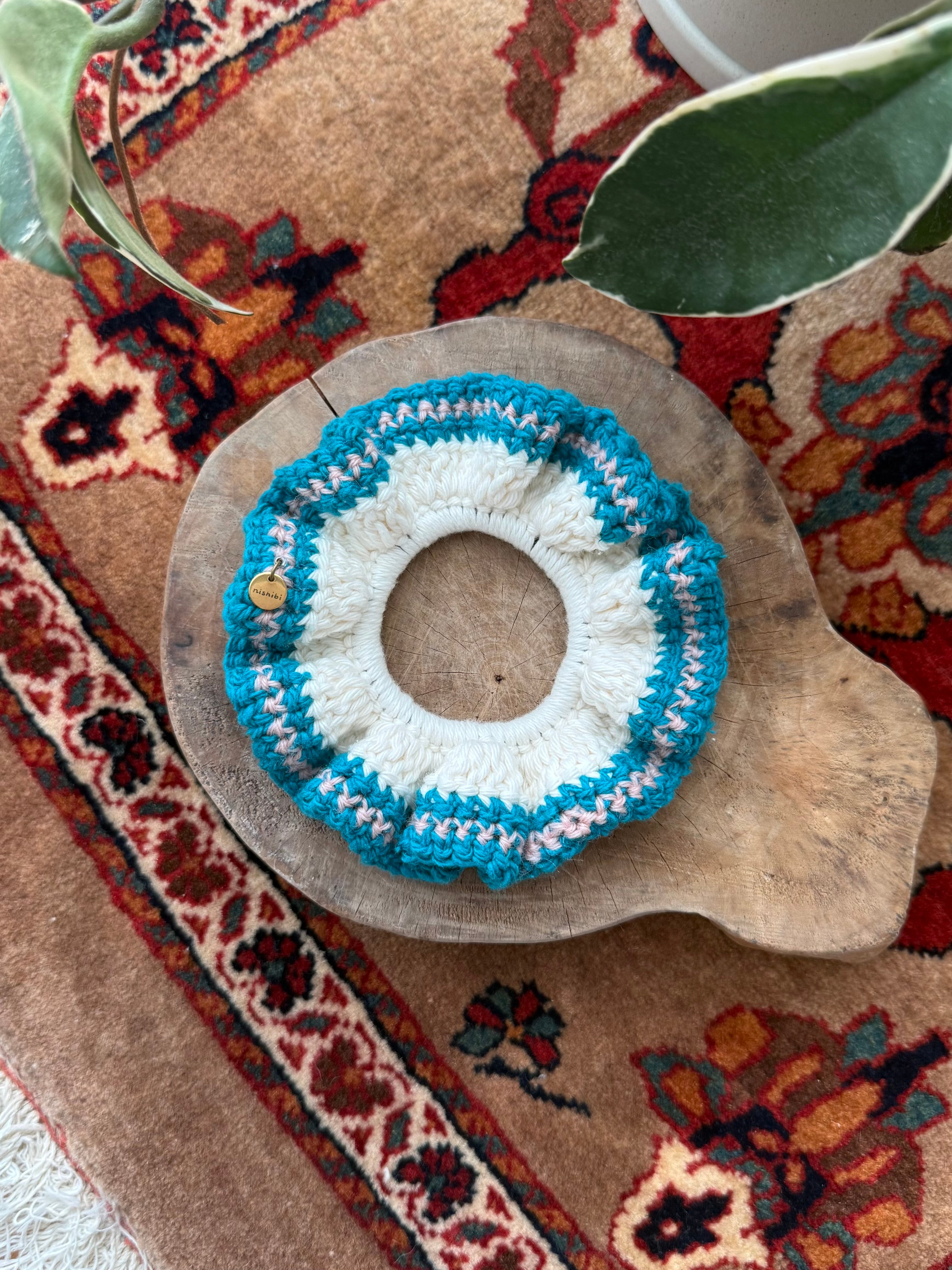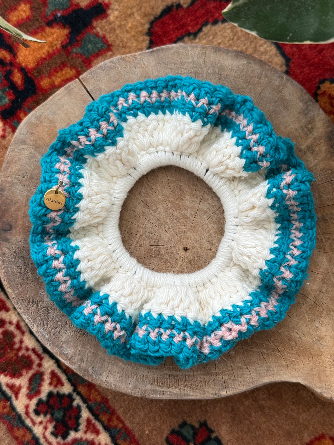 *パキッとしたターコイズブルーが目を惹くシュシュ。