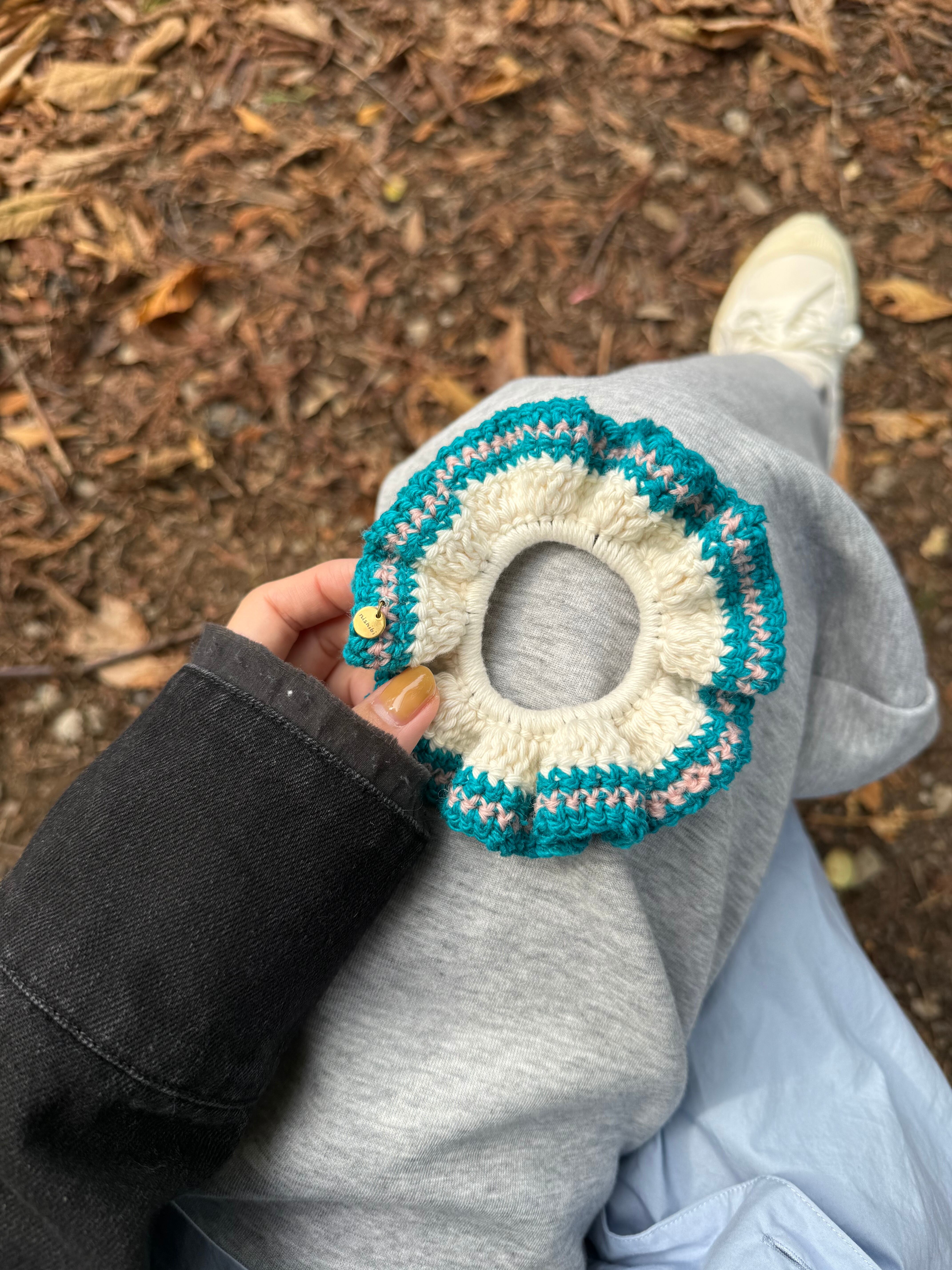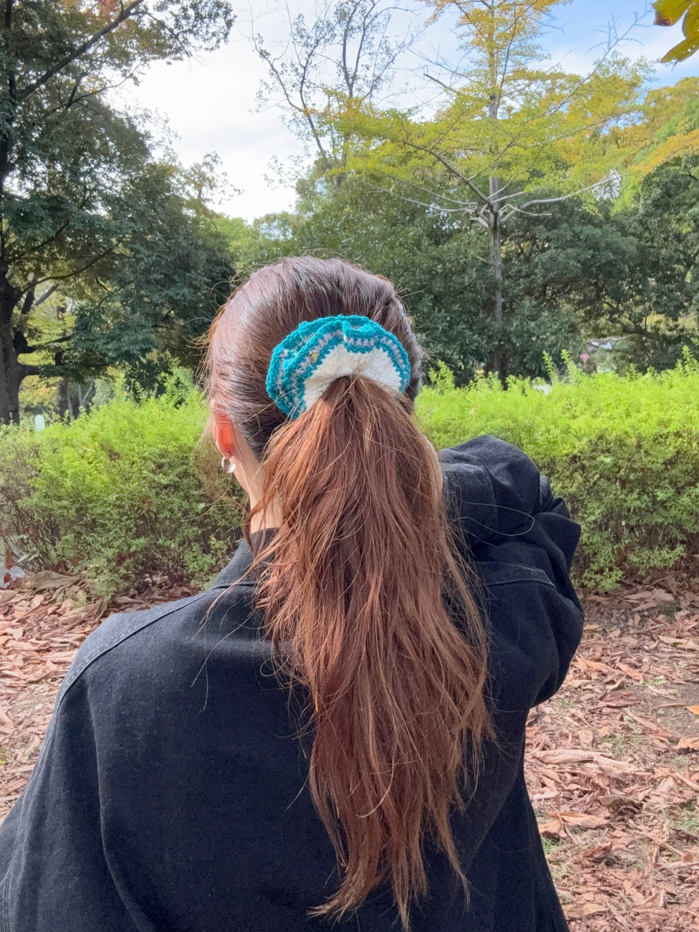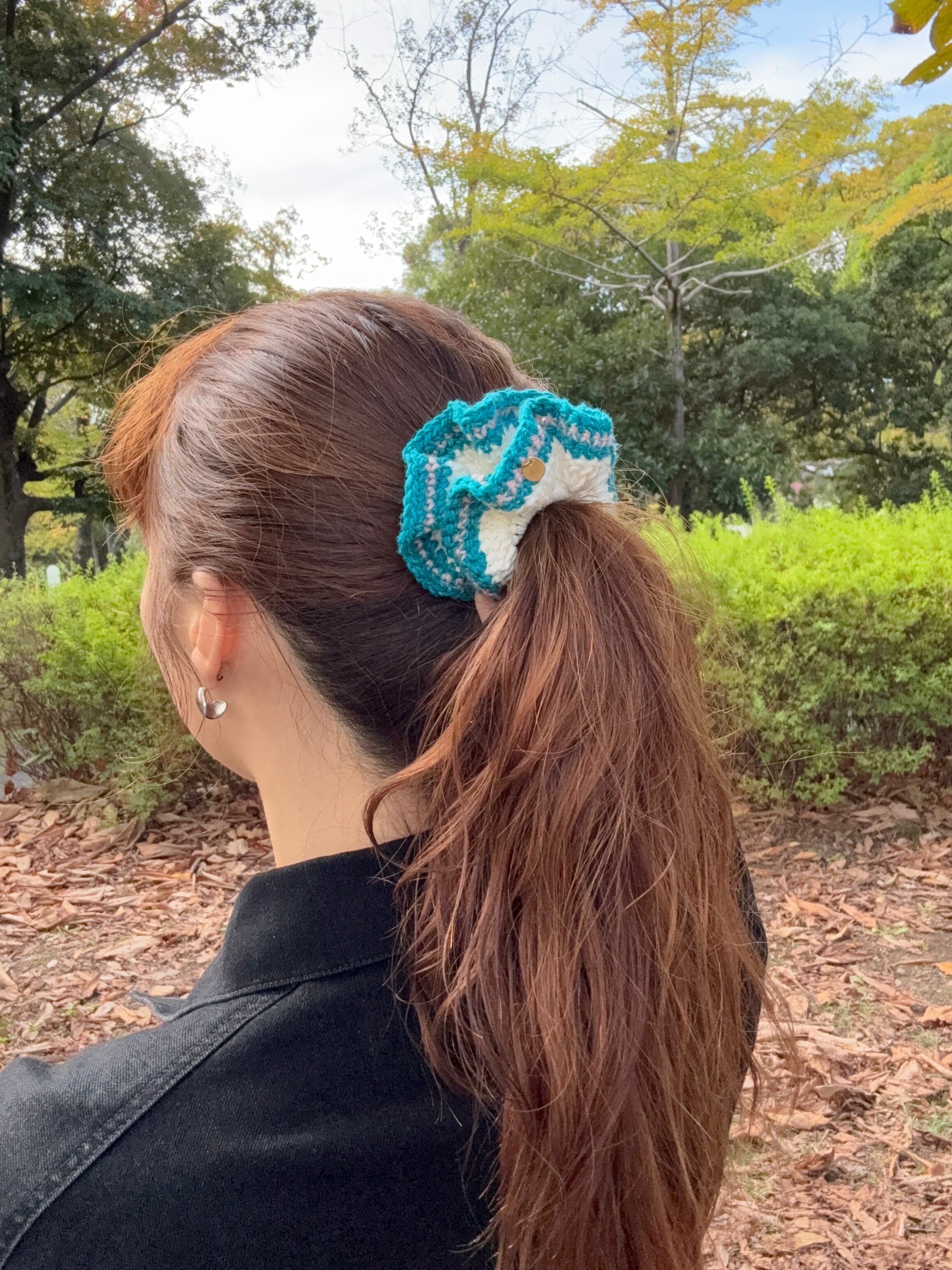 アクセサリー感覚で付けられる手編みのシュシュ。