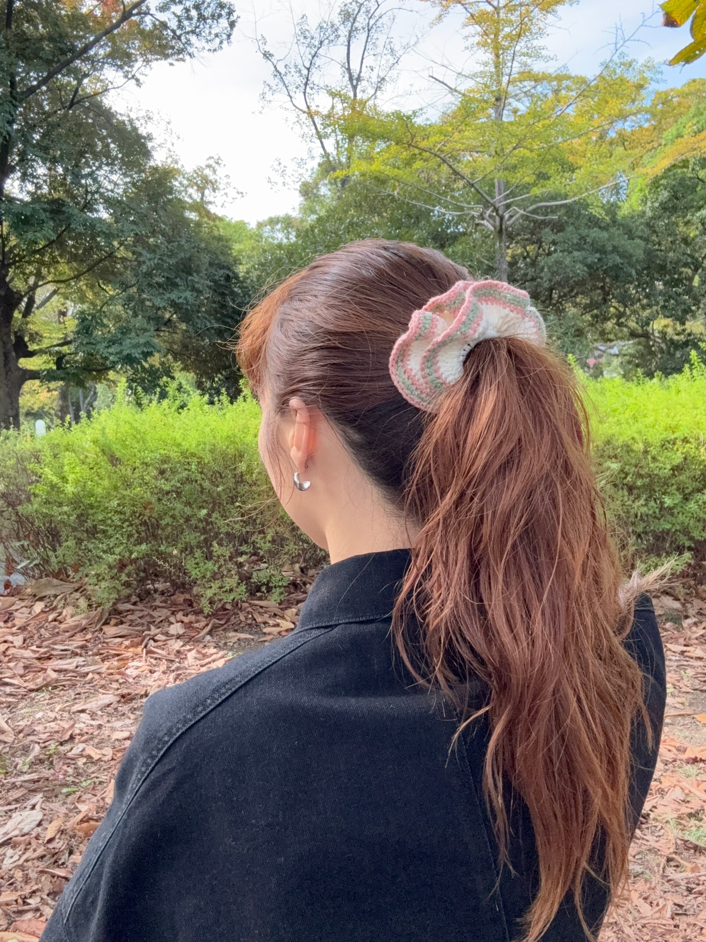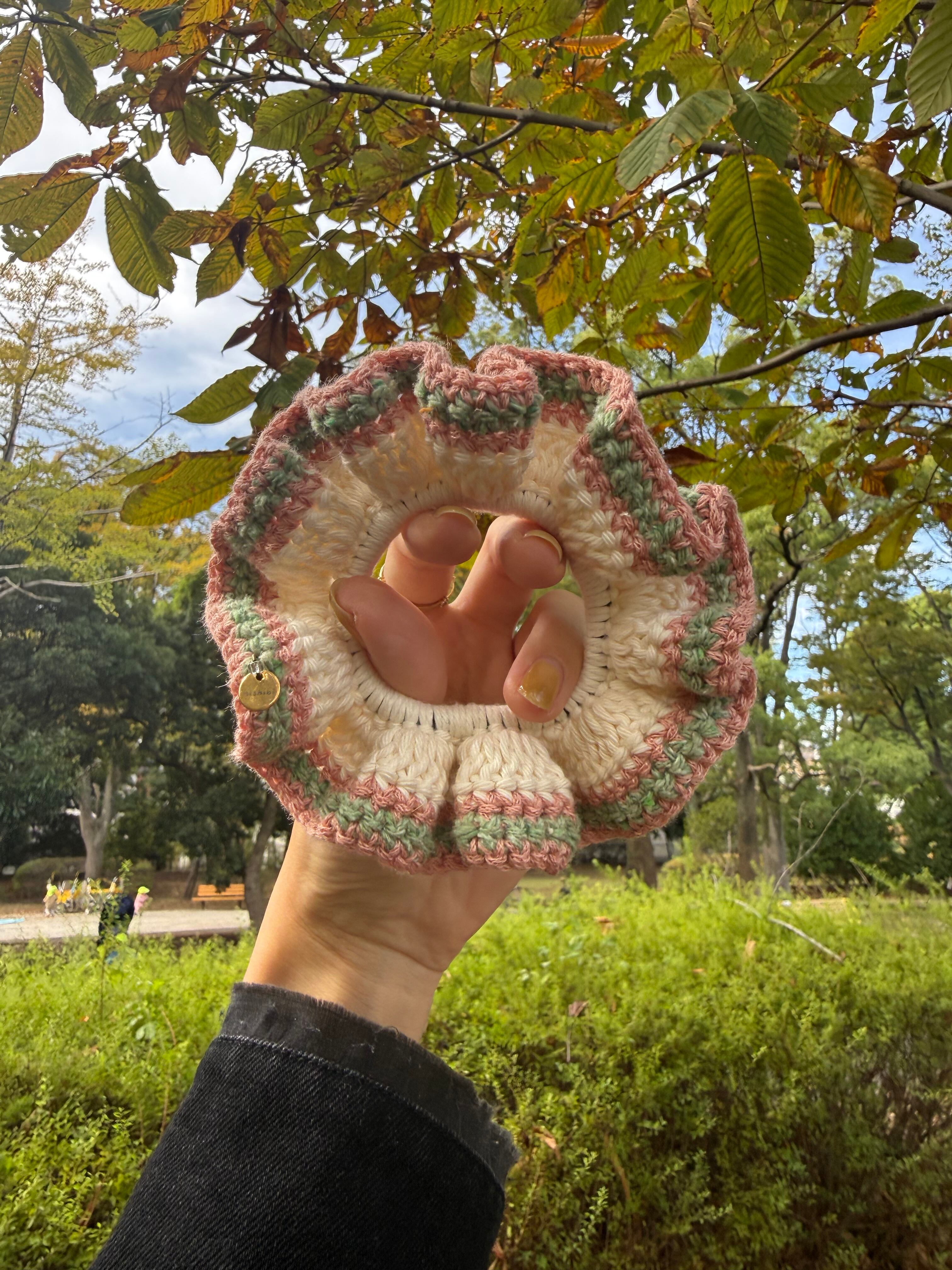 アクセサリー感覚で付けられる手編みのシュシュ。