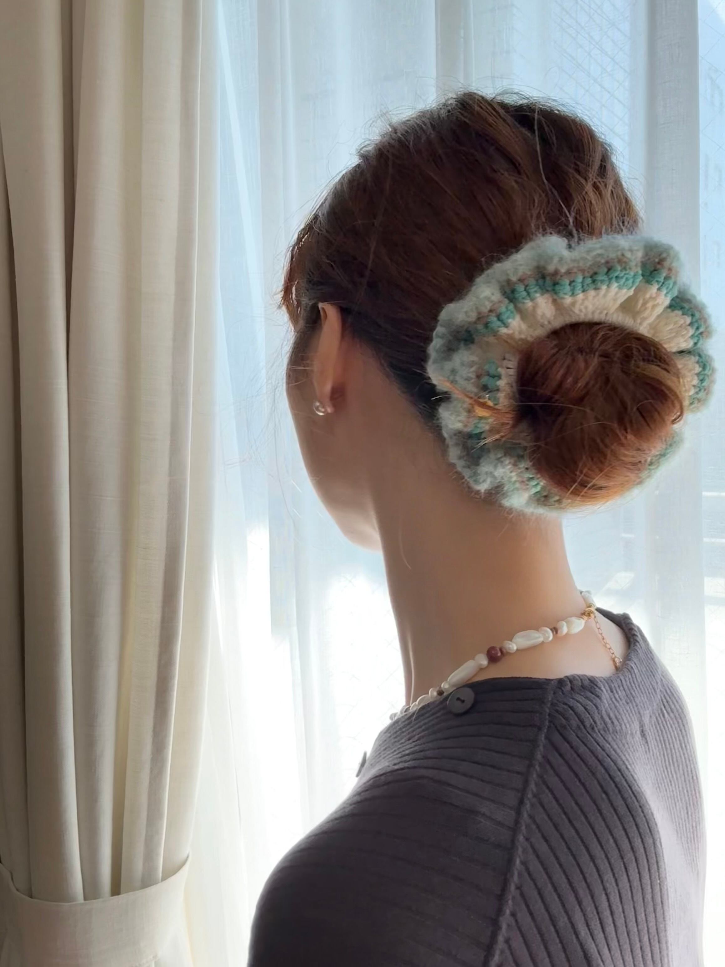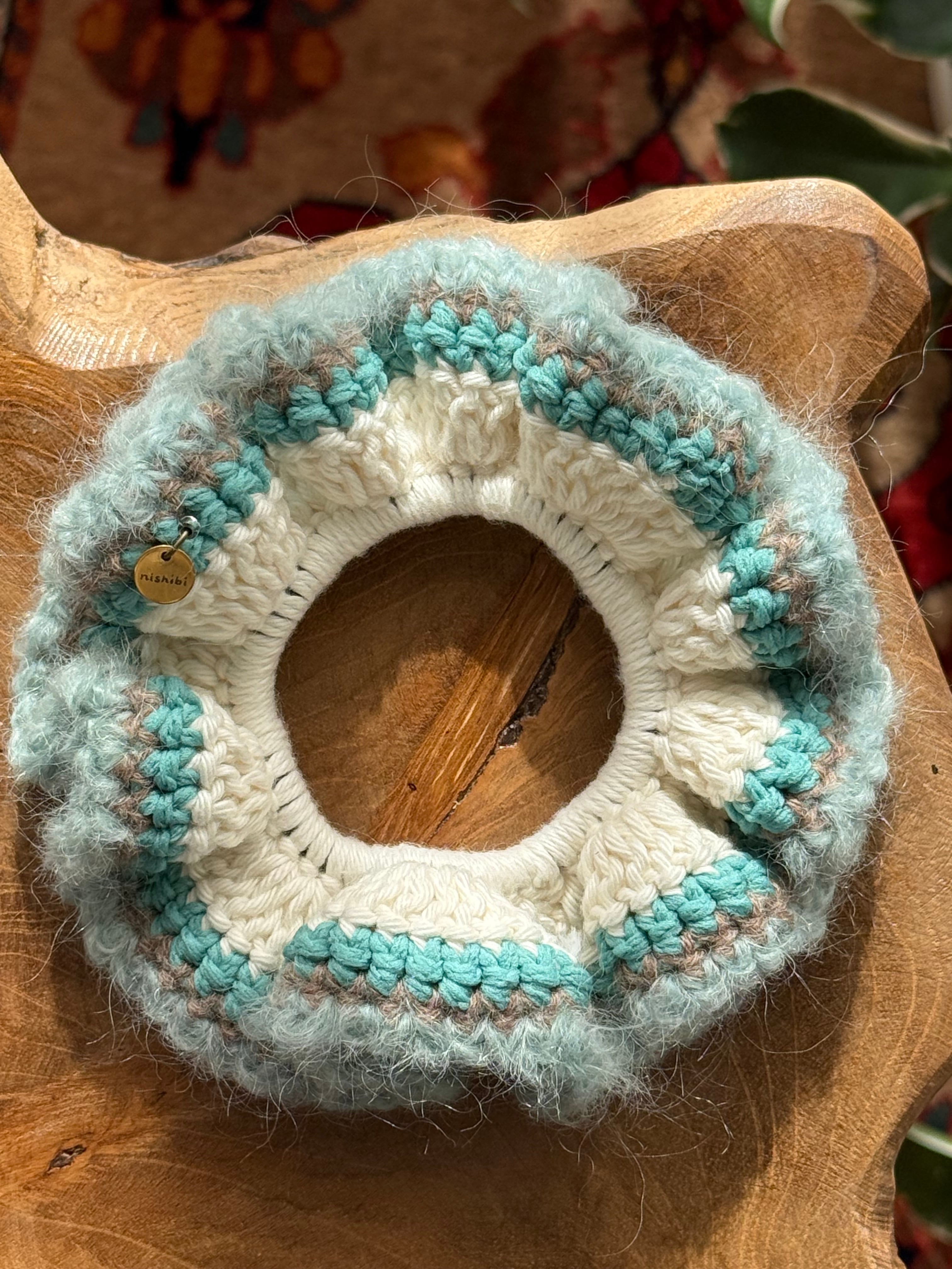 アクセサリー感覚で付けられる手編みのシュシュ。