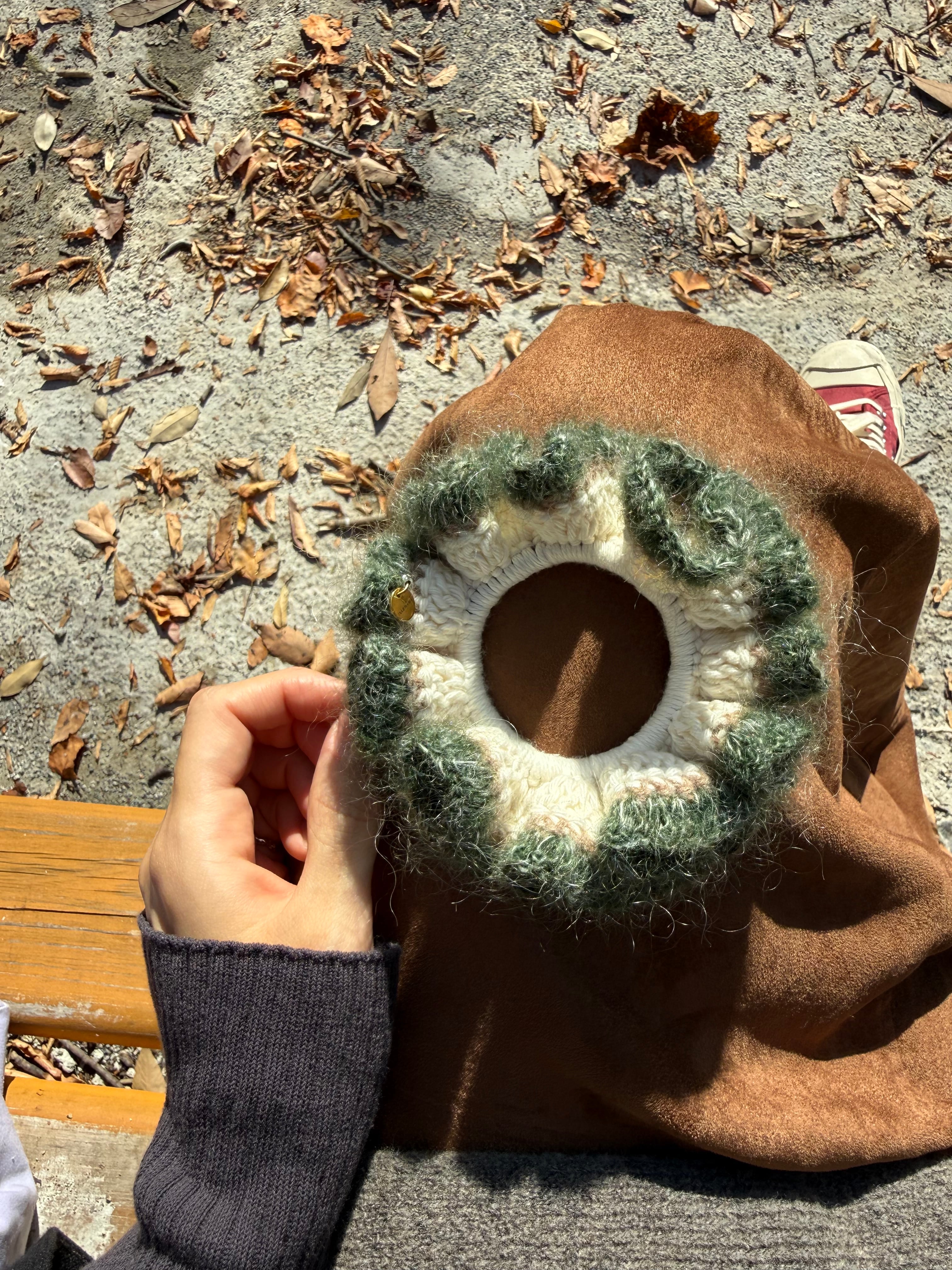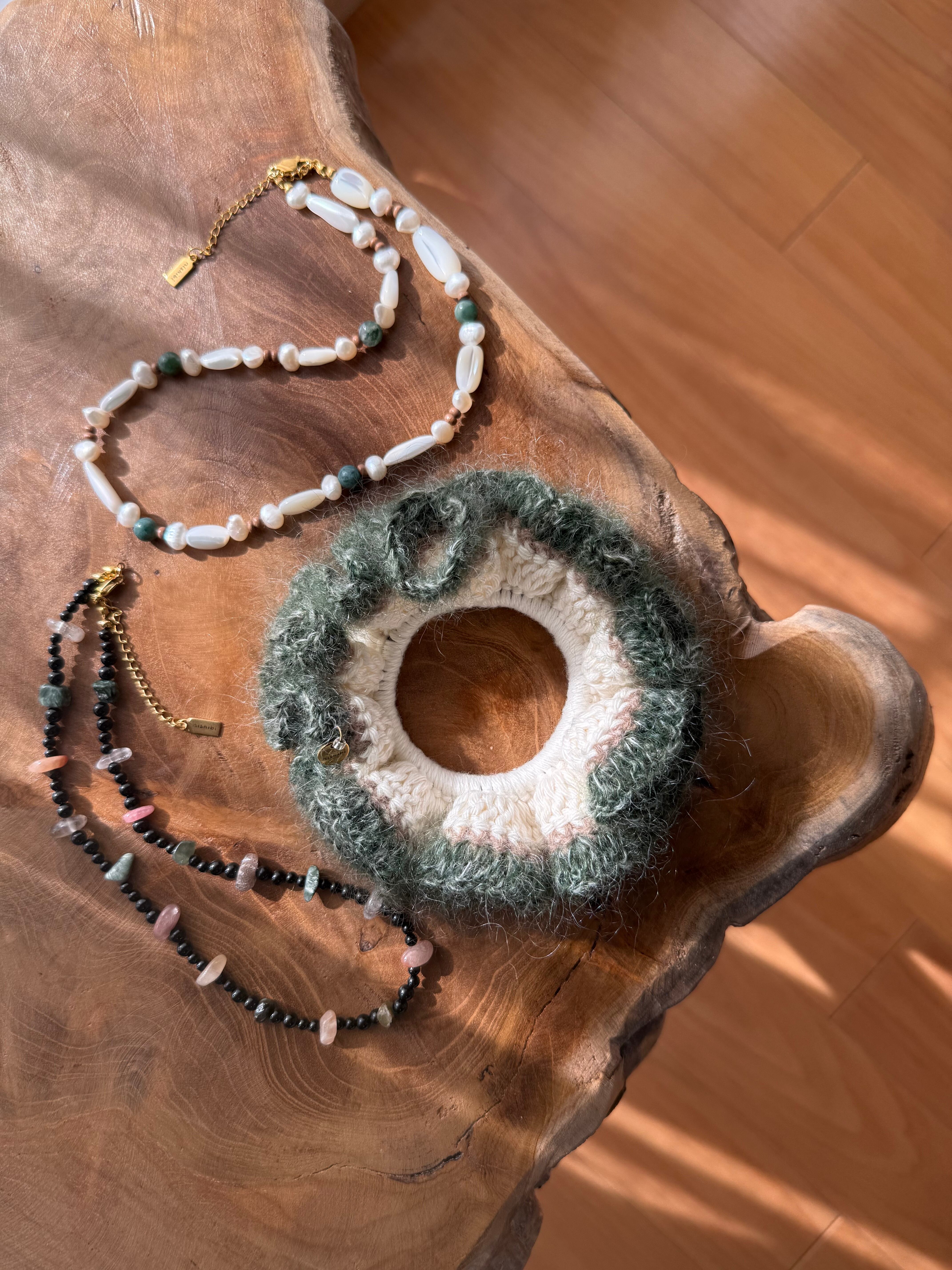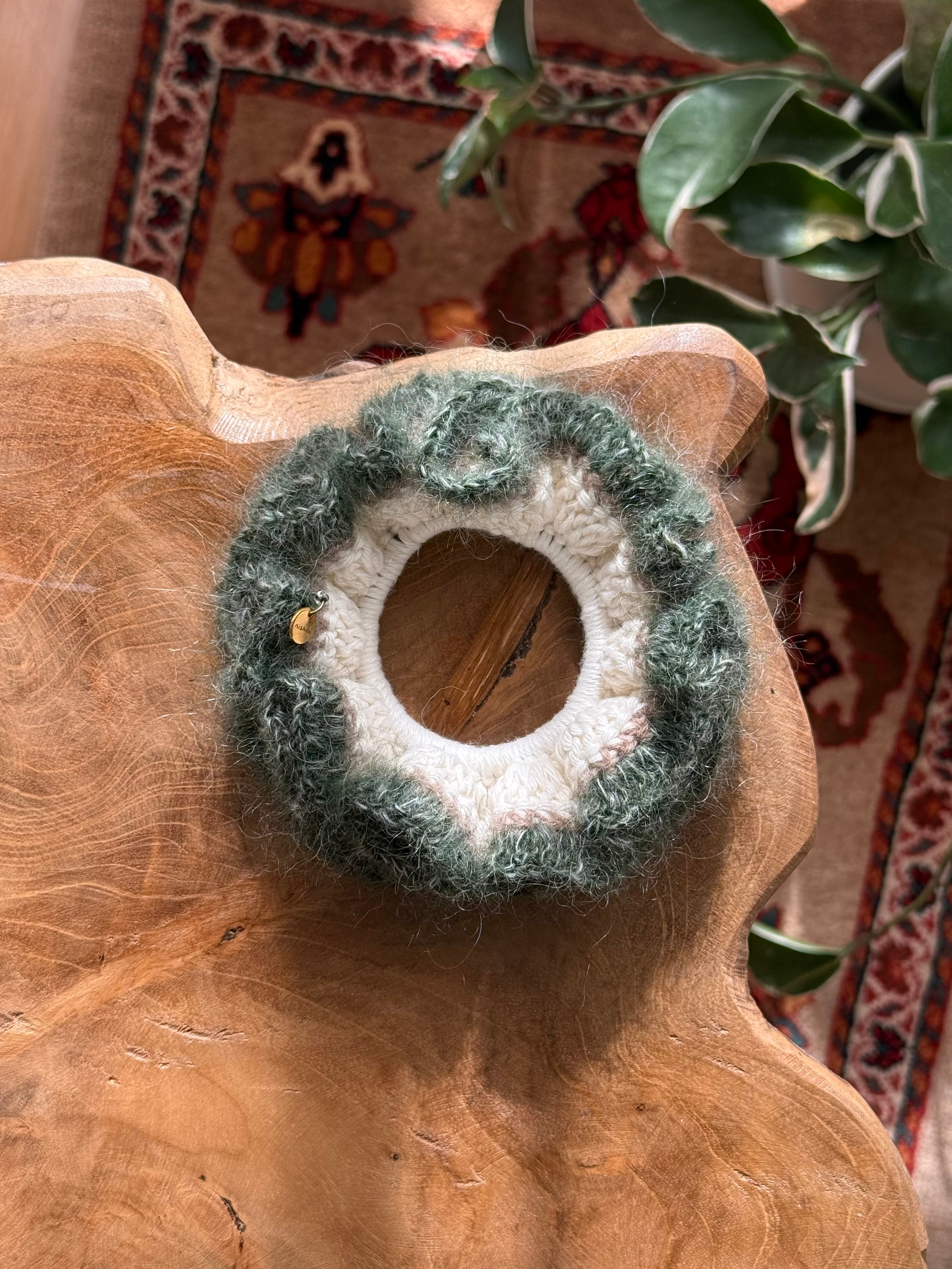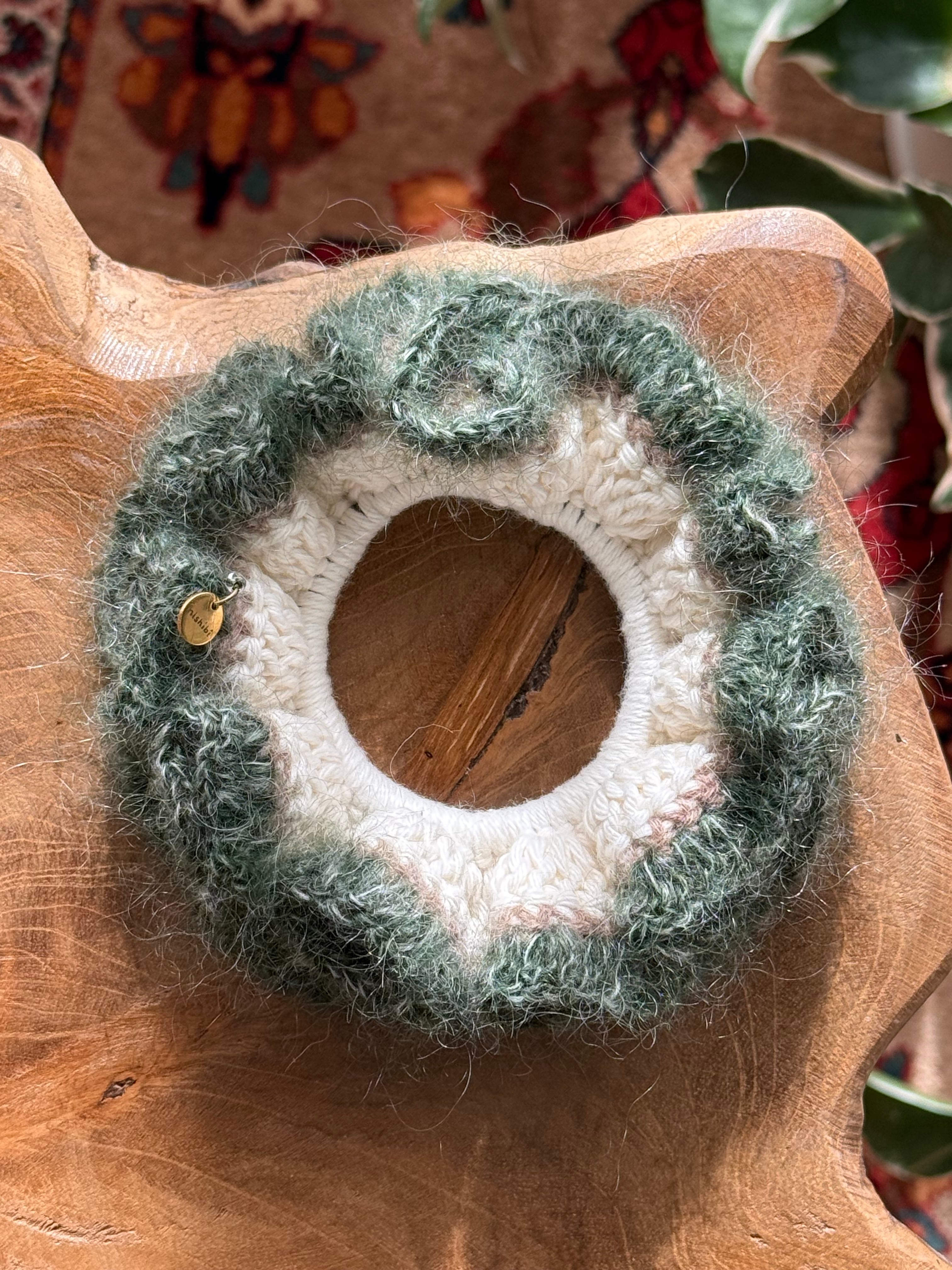 アクセサリー感覚で付けられる手編みのシュシュ。