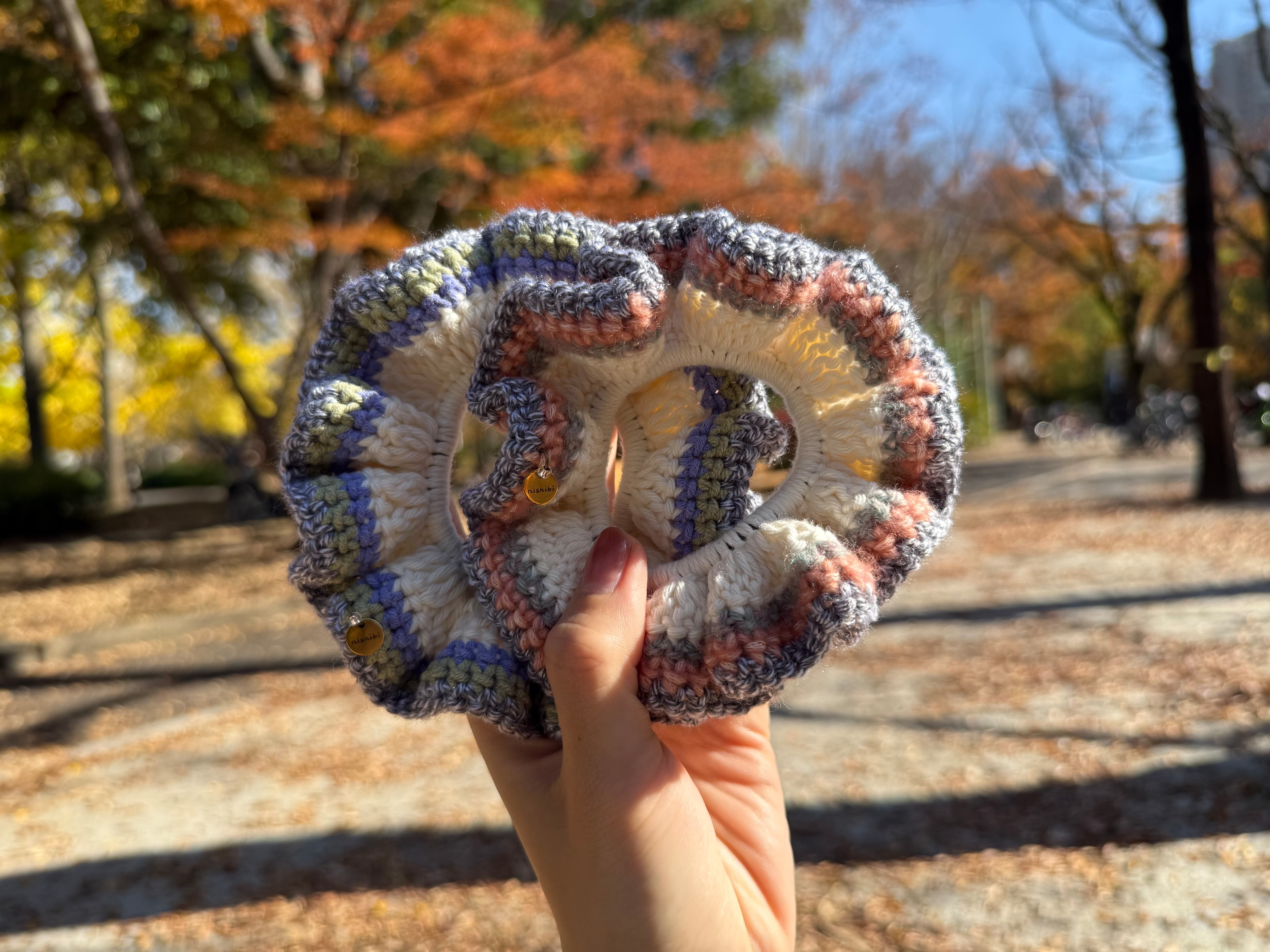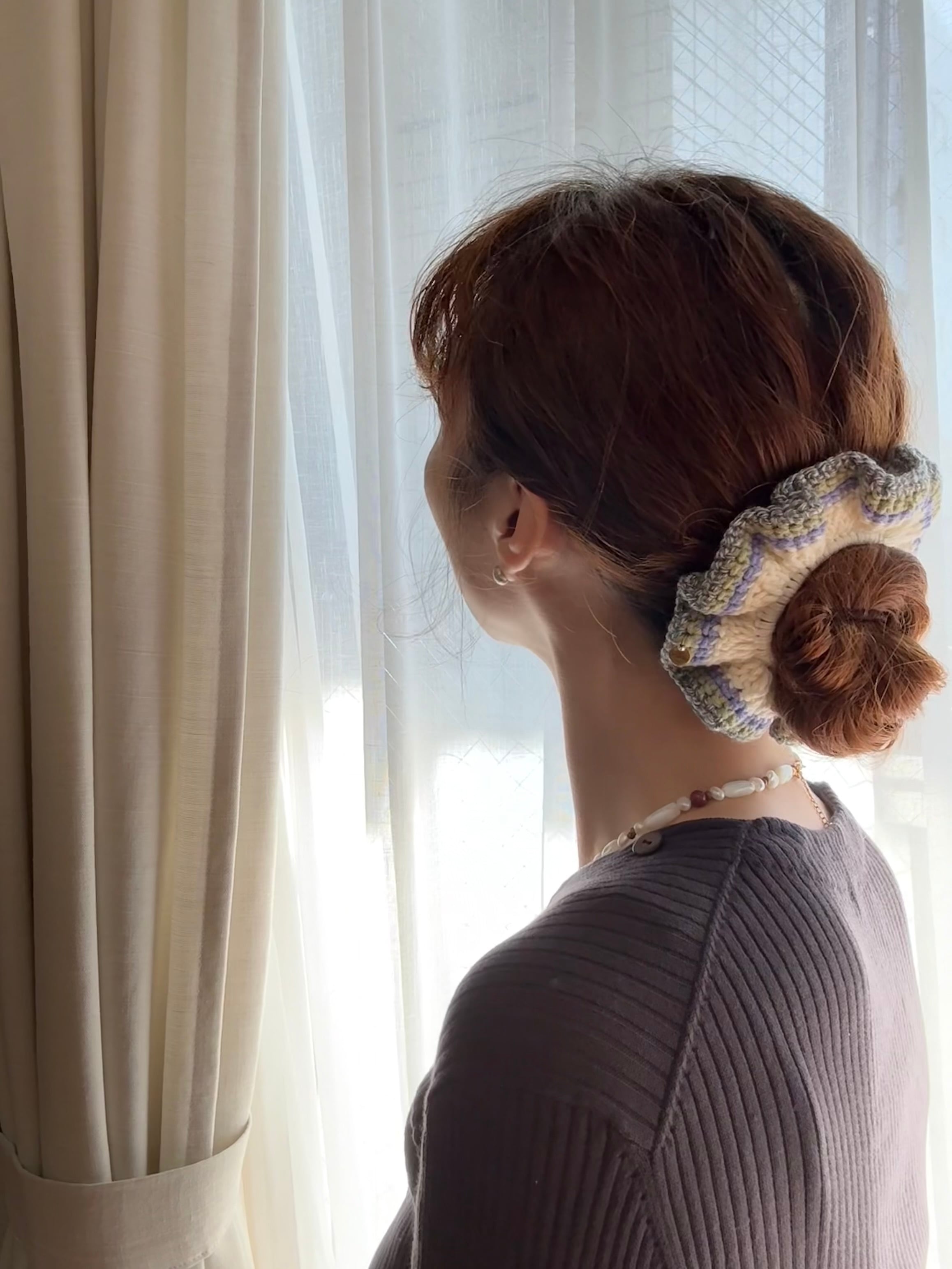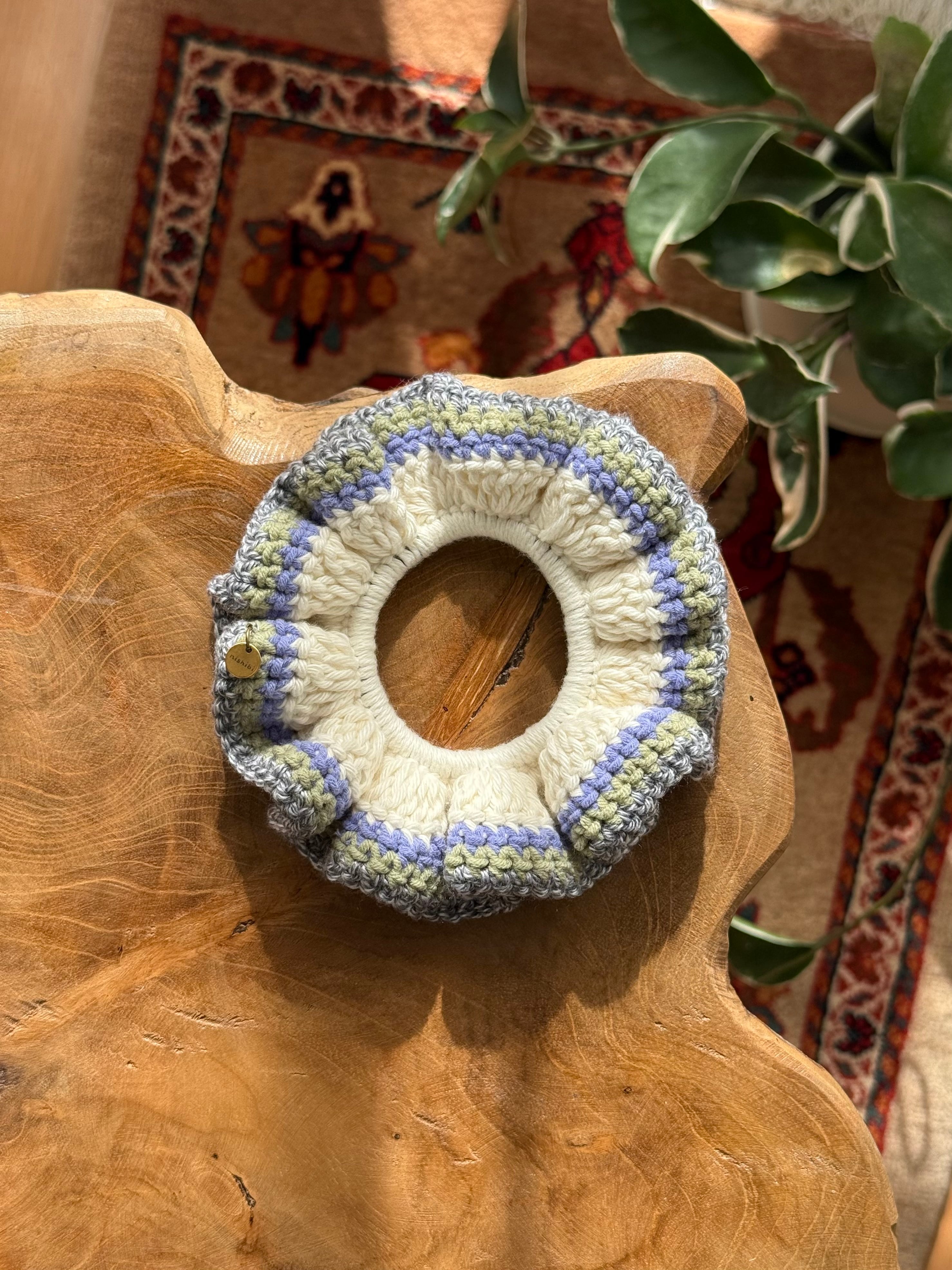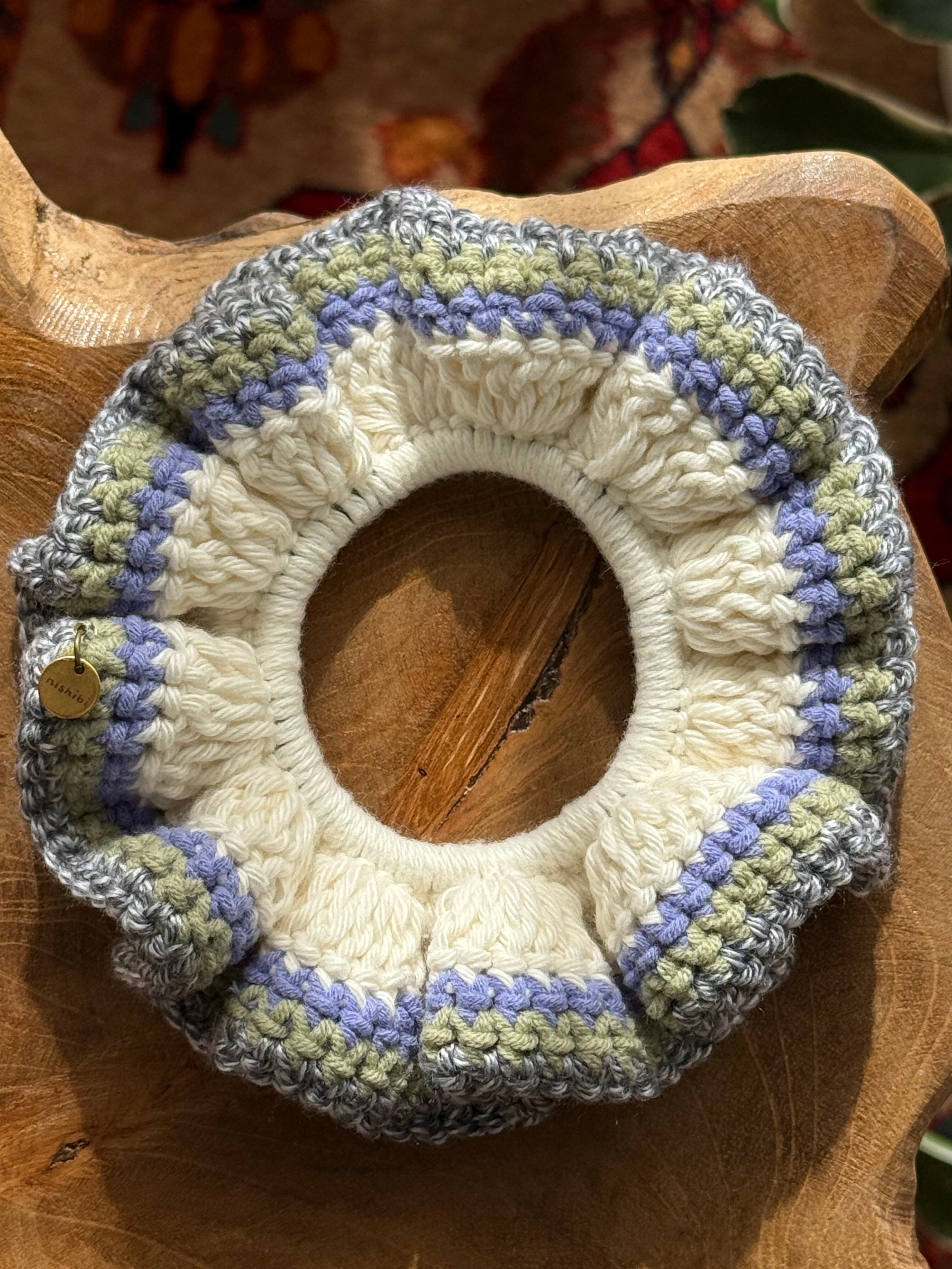 アクセサリー感覚で付けられる手編みのシュシュ。