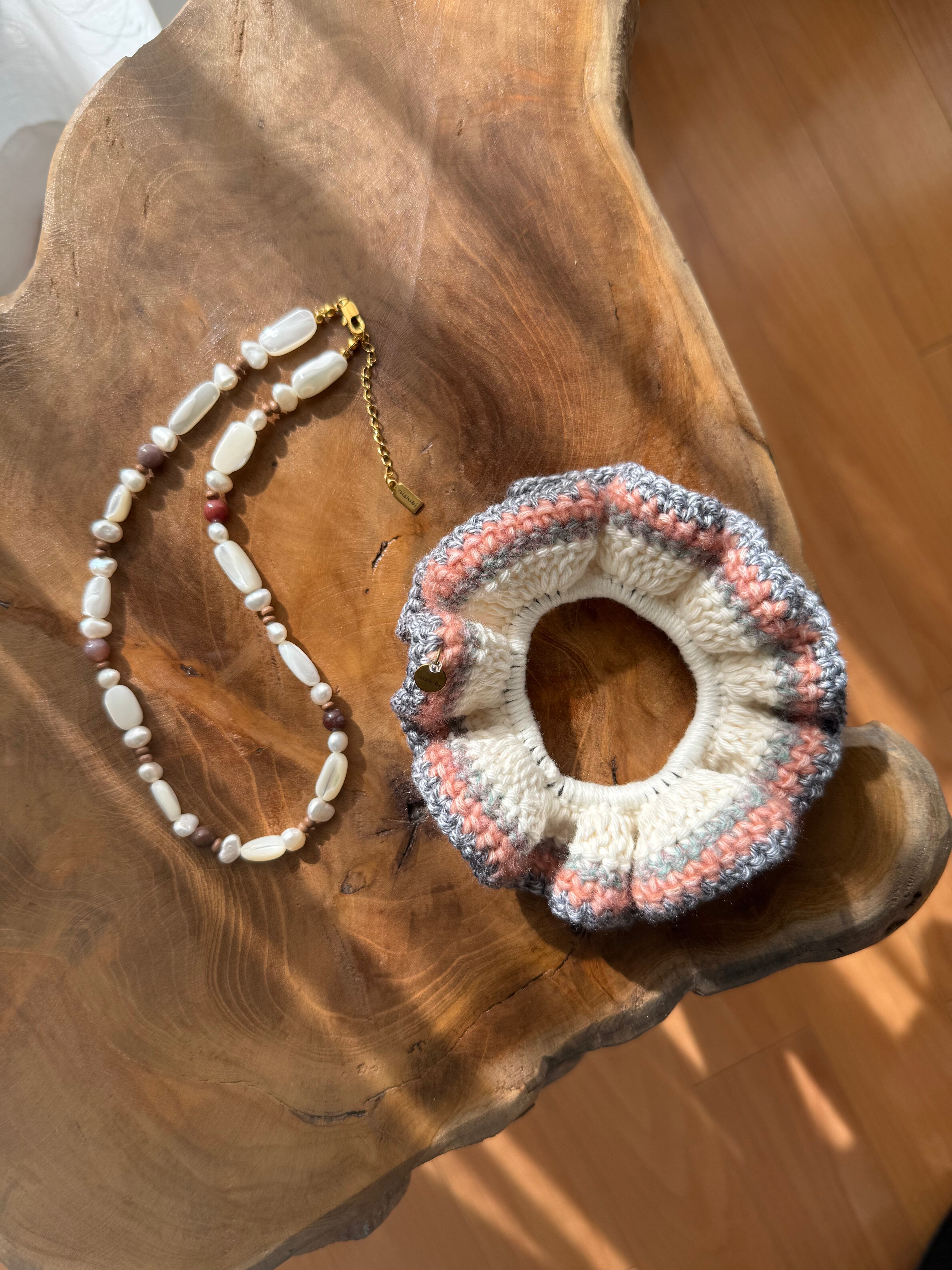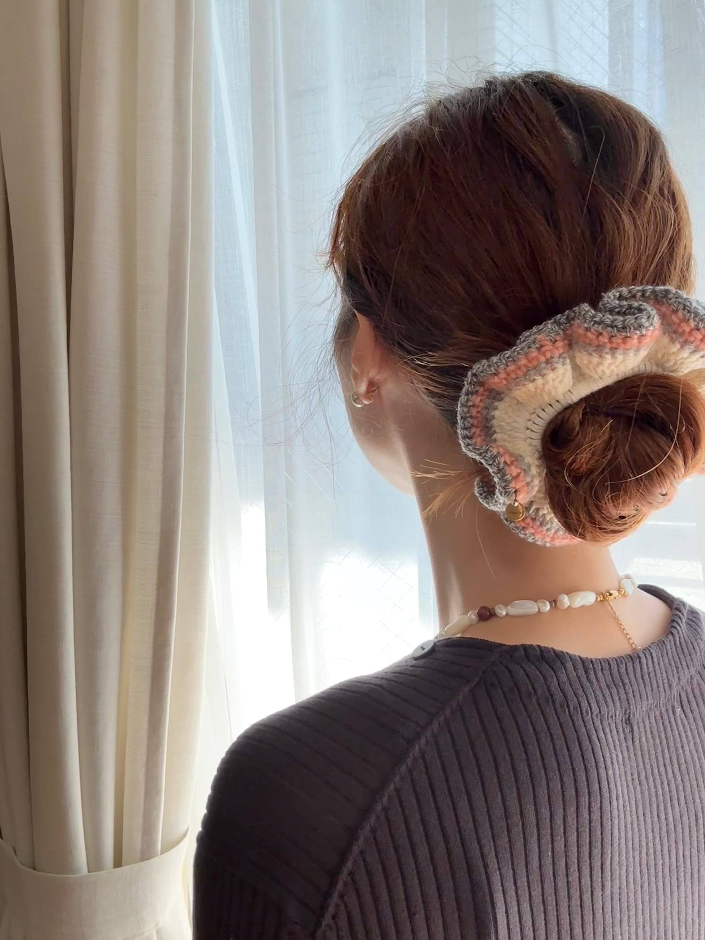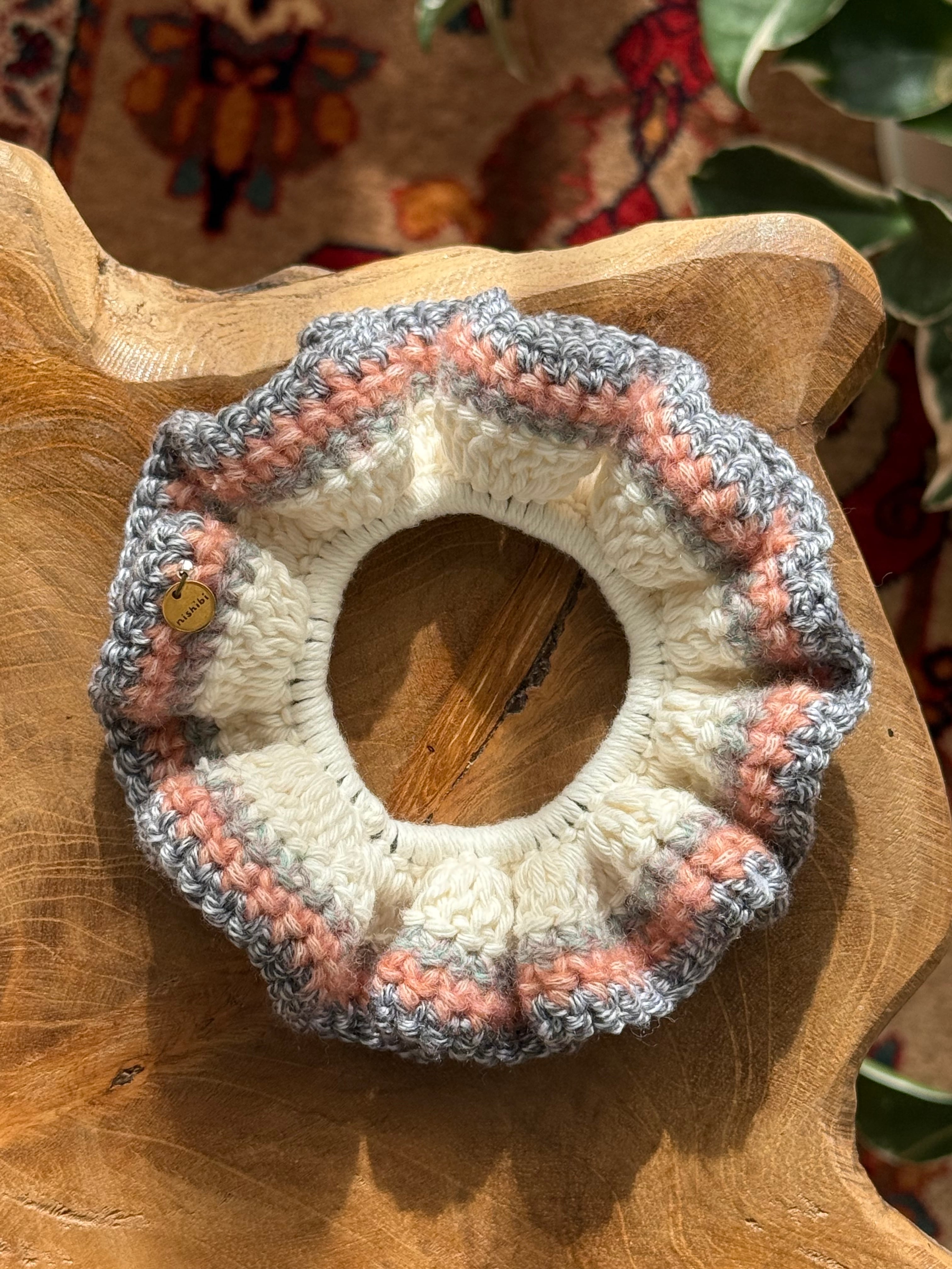 アクセサリー感覚で付けられる手編みのシュシュ。