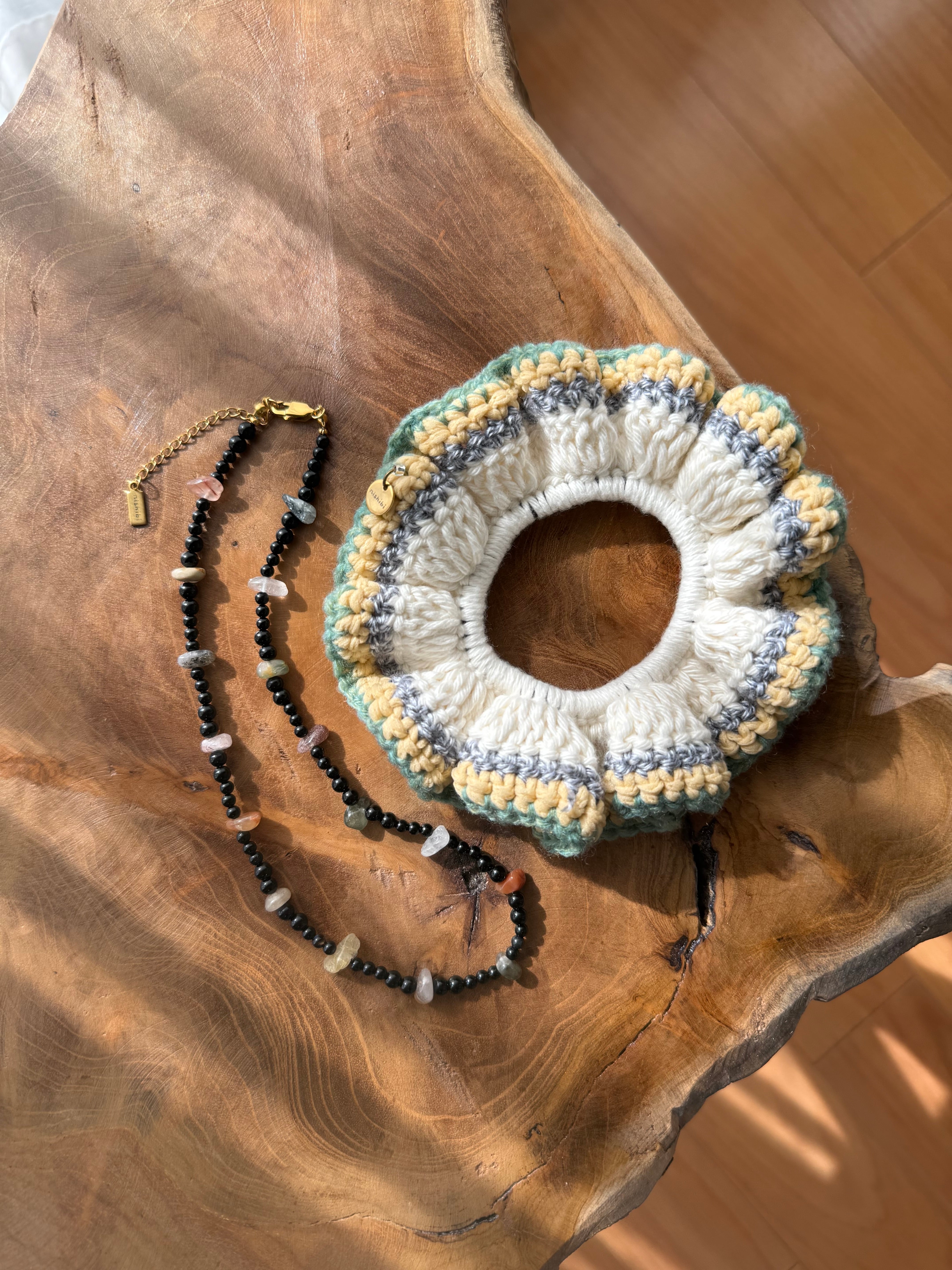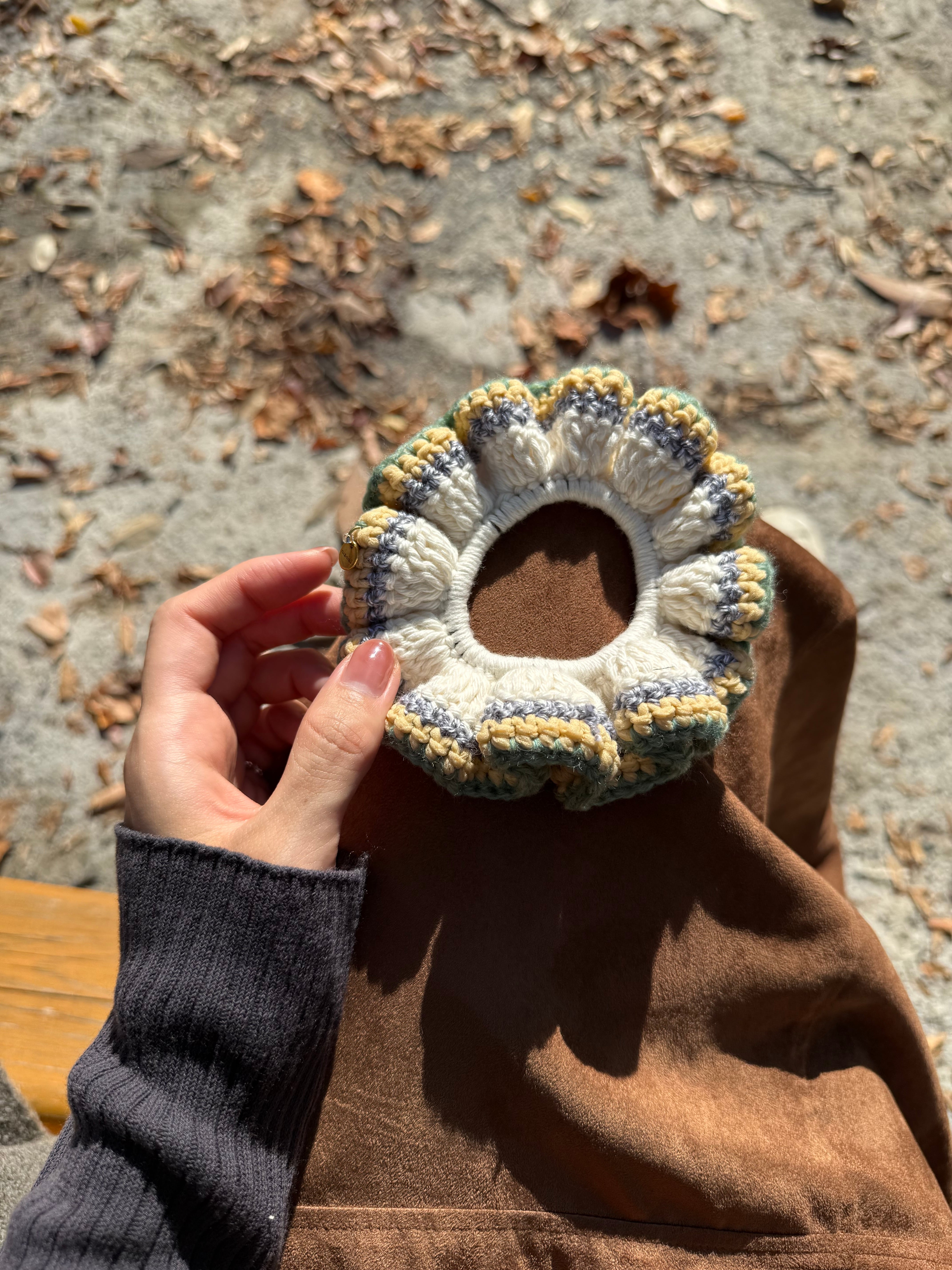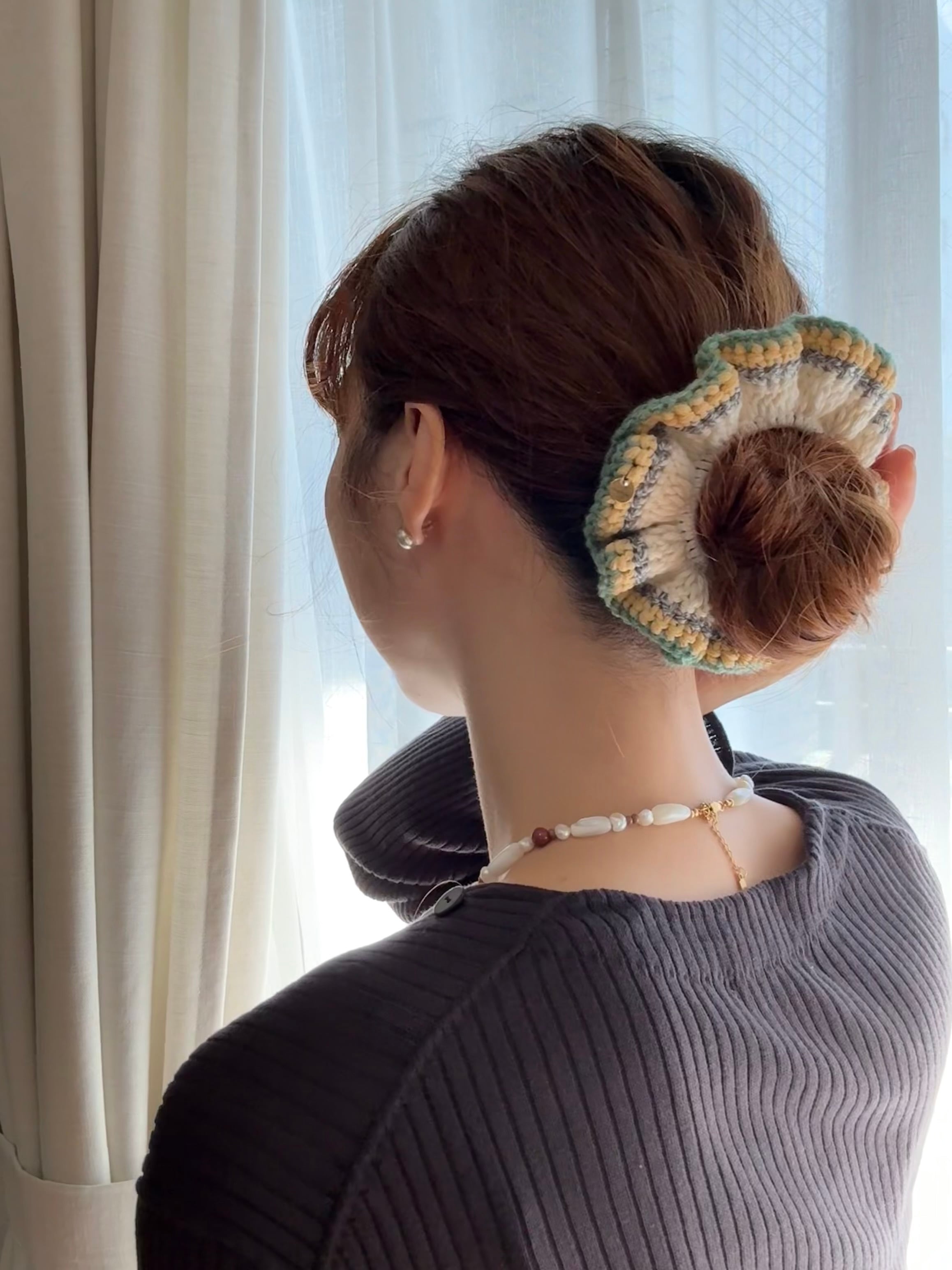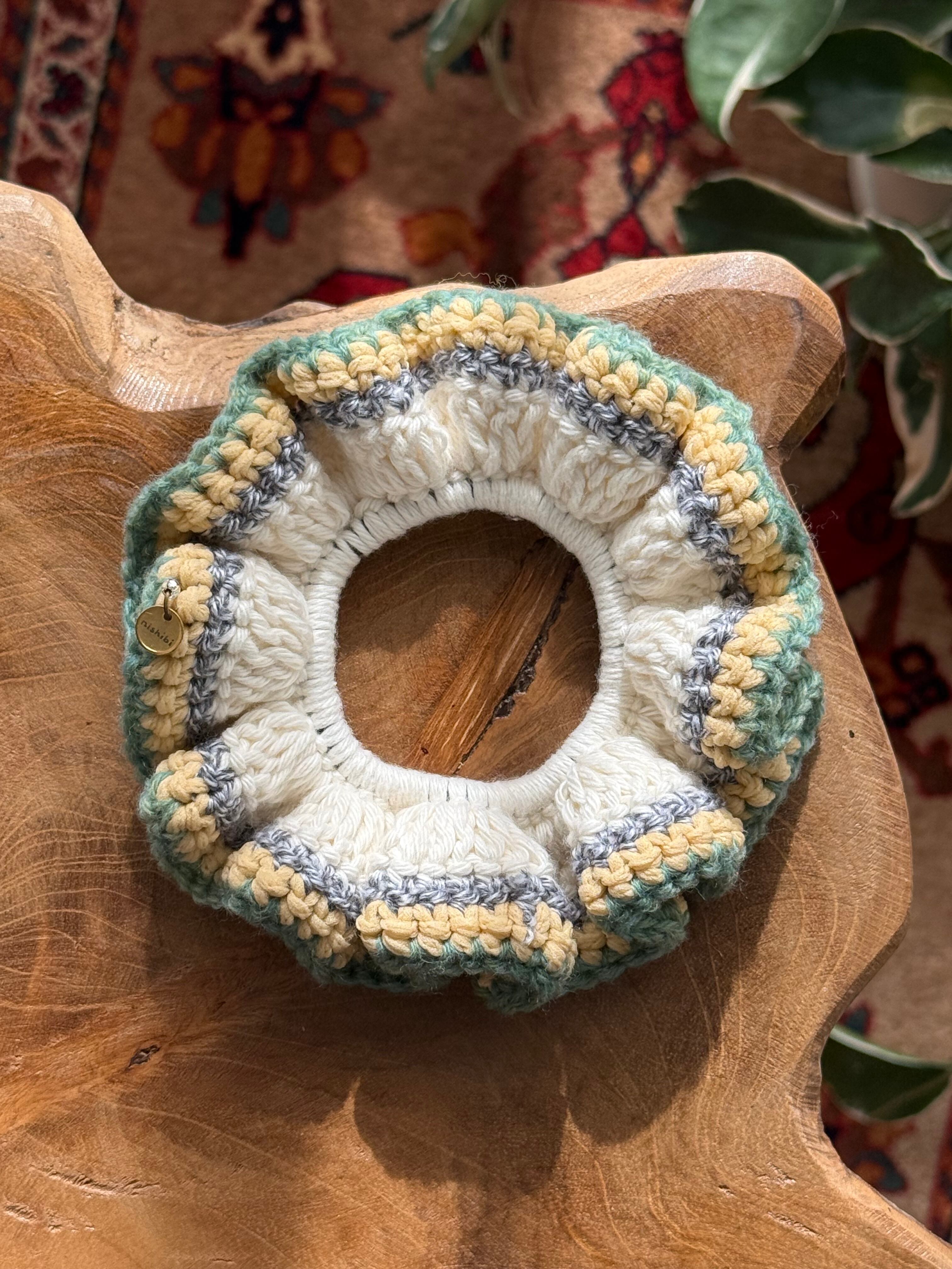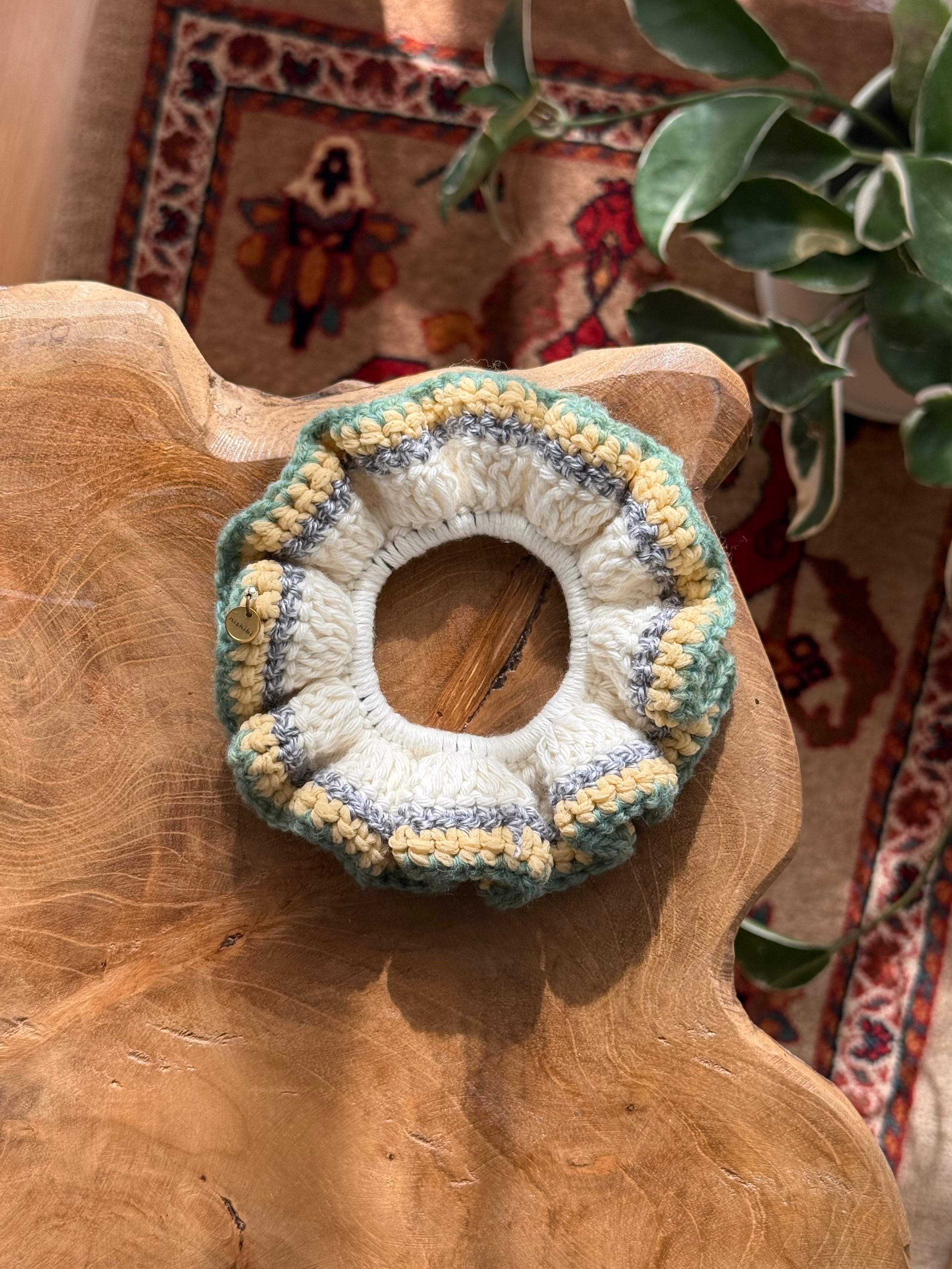 アクセサリー感覚で付けられる手編みのシュシュ。