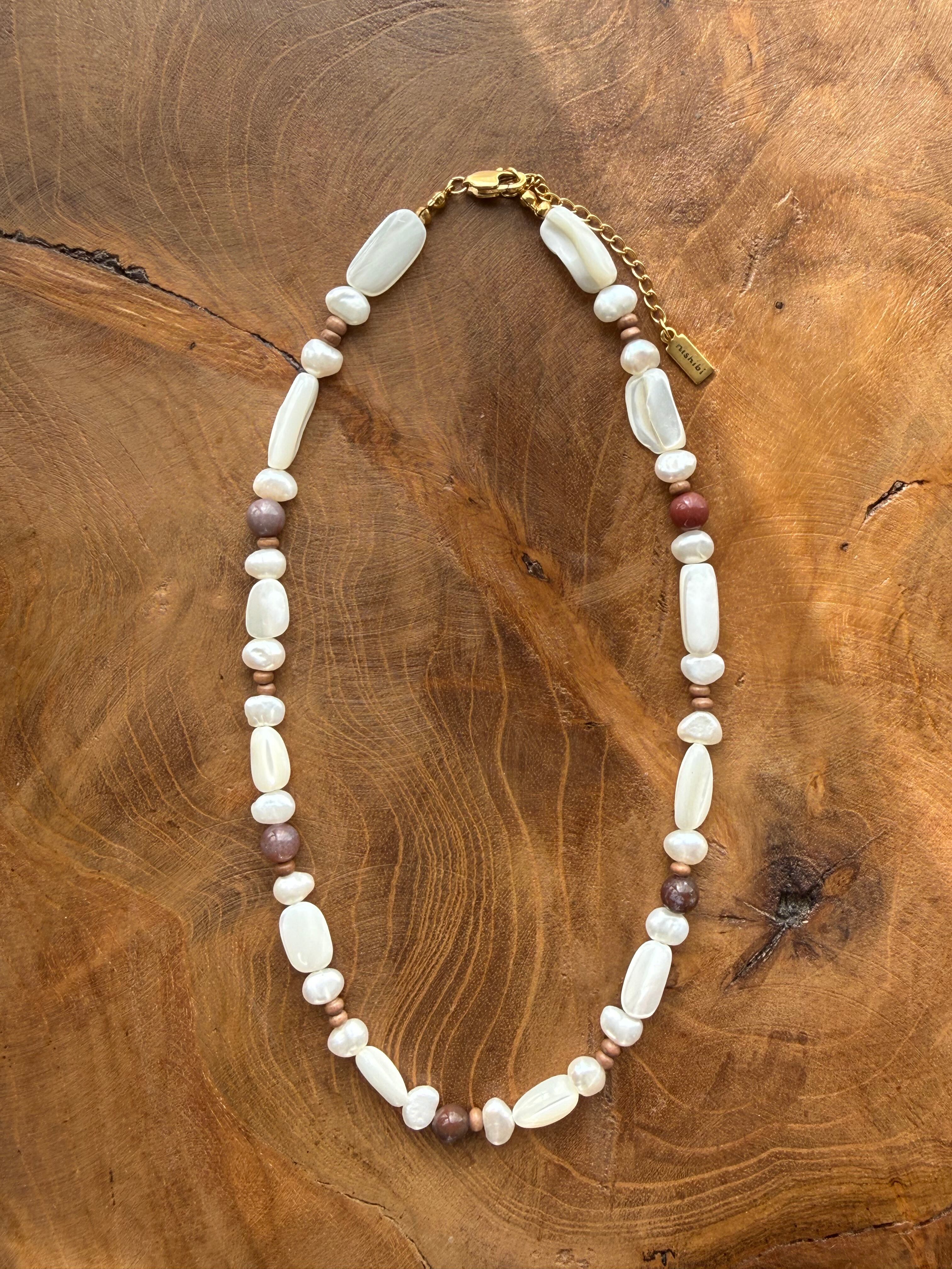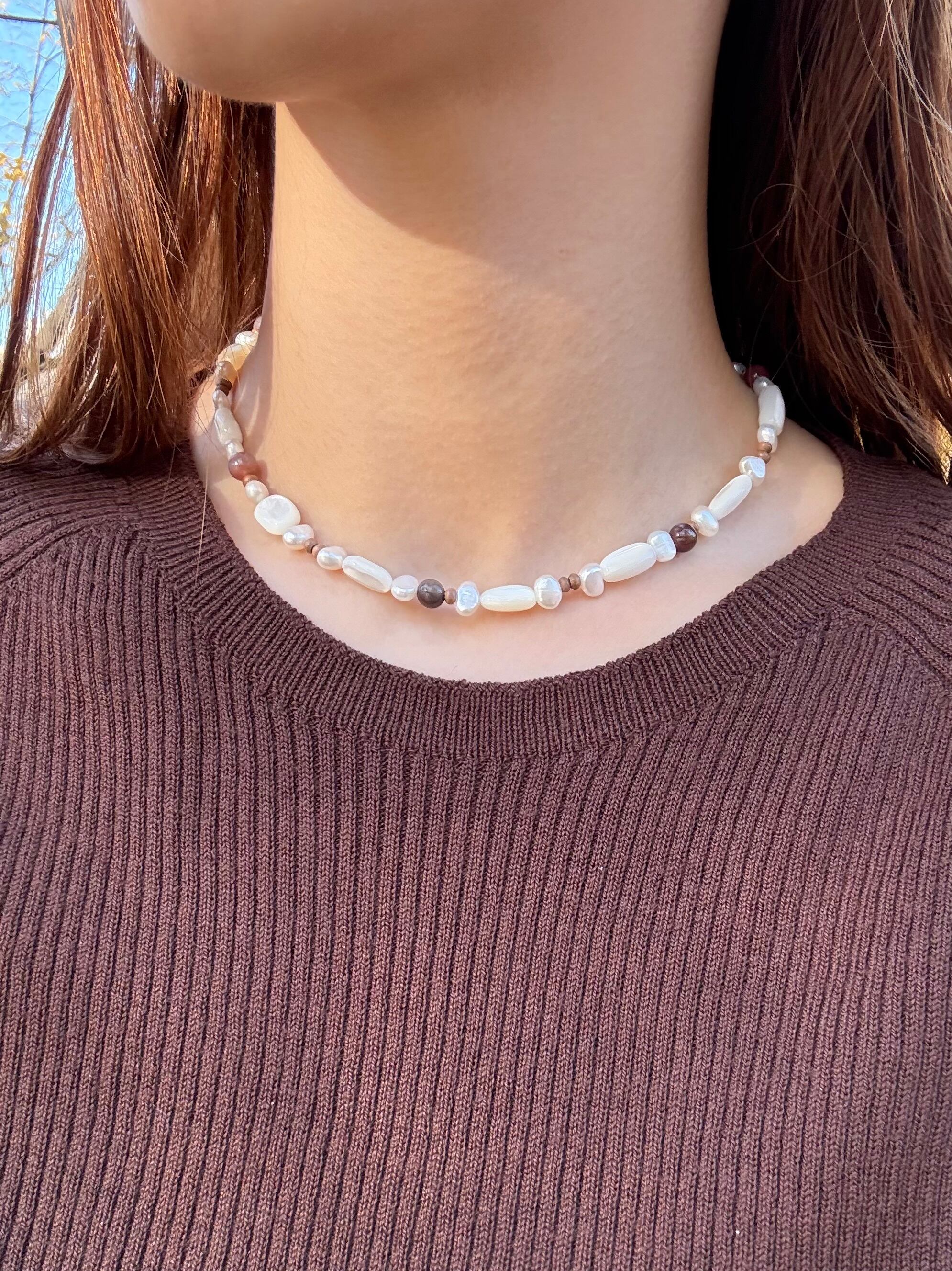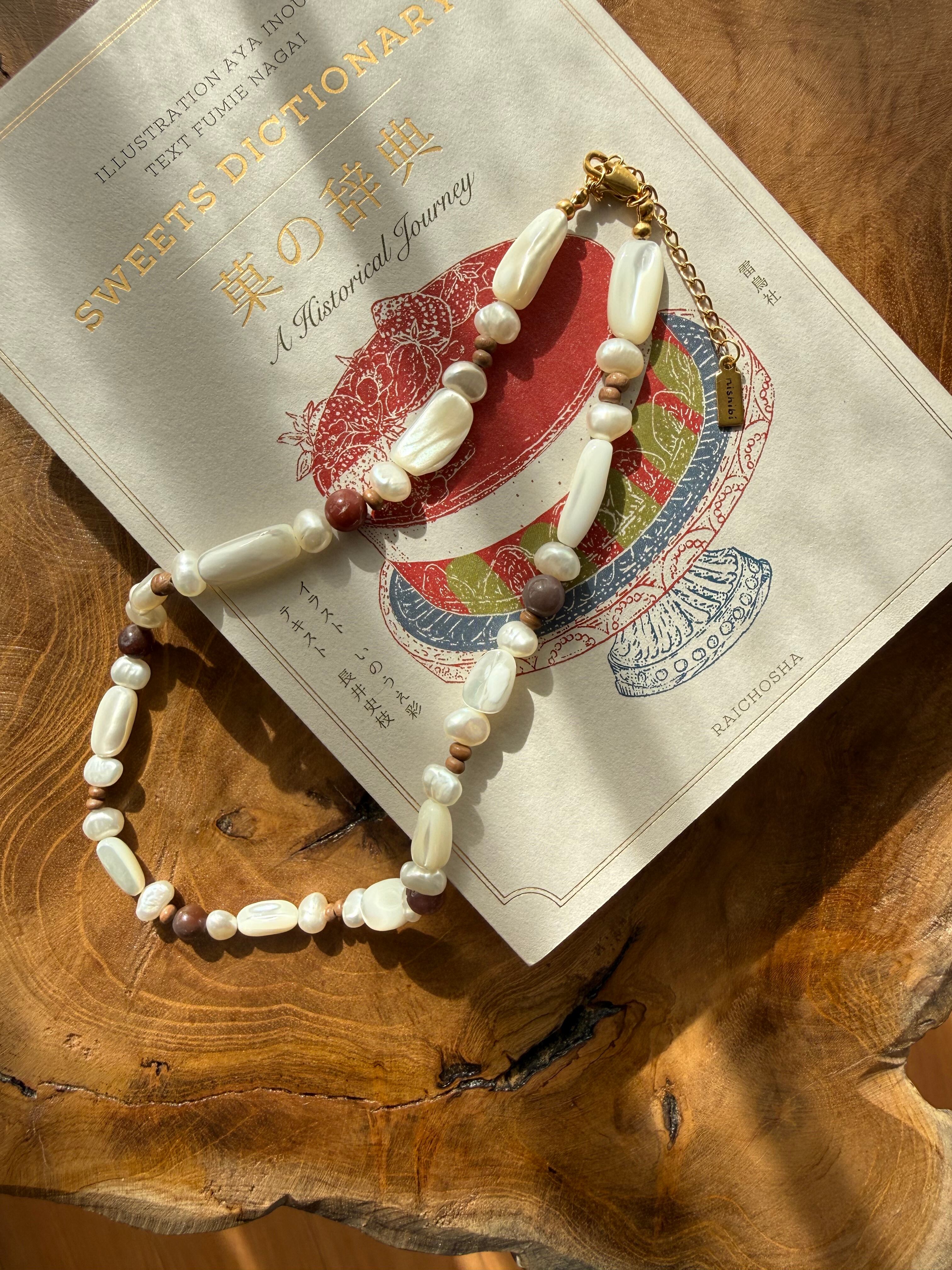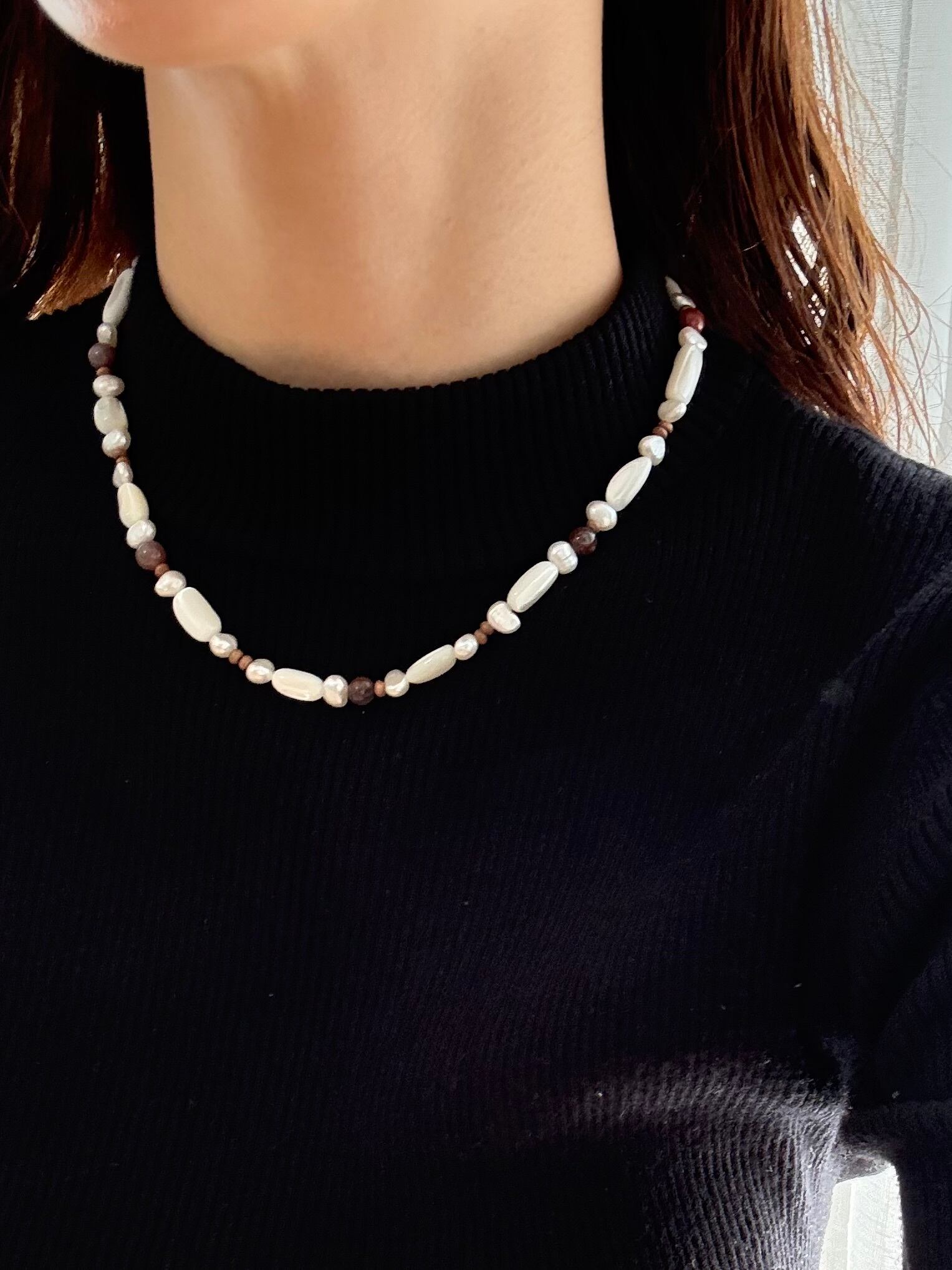 マザーオブパールのやわらかな艶、形や表情の異なる淡水パールに、深みのあるインディアンアゲートを合わせました。