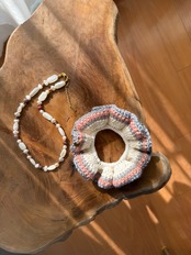 ところどころにウッドビーズを入れることで、きれいになりすぎず、日常に自然となじむバランスに仕上げています。