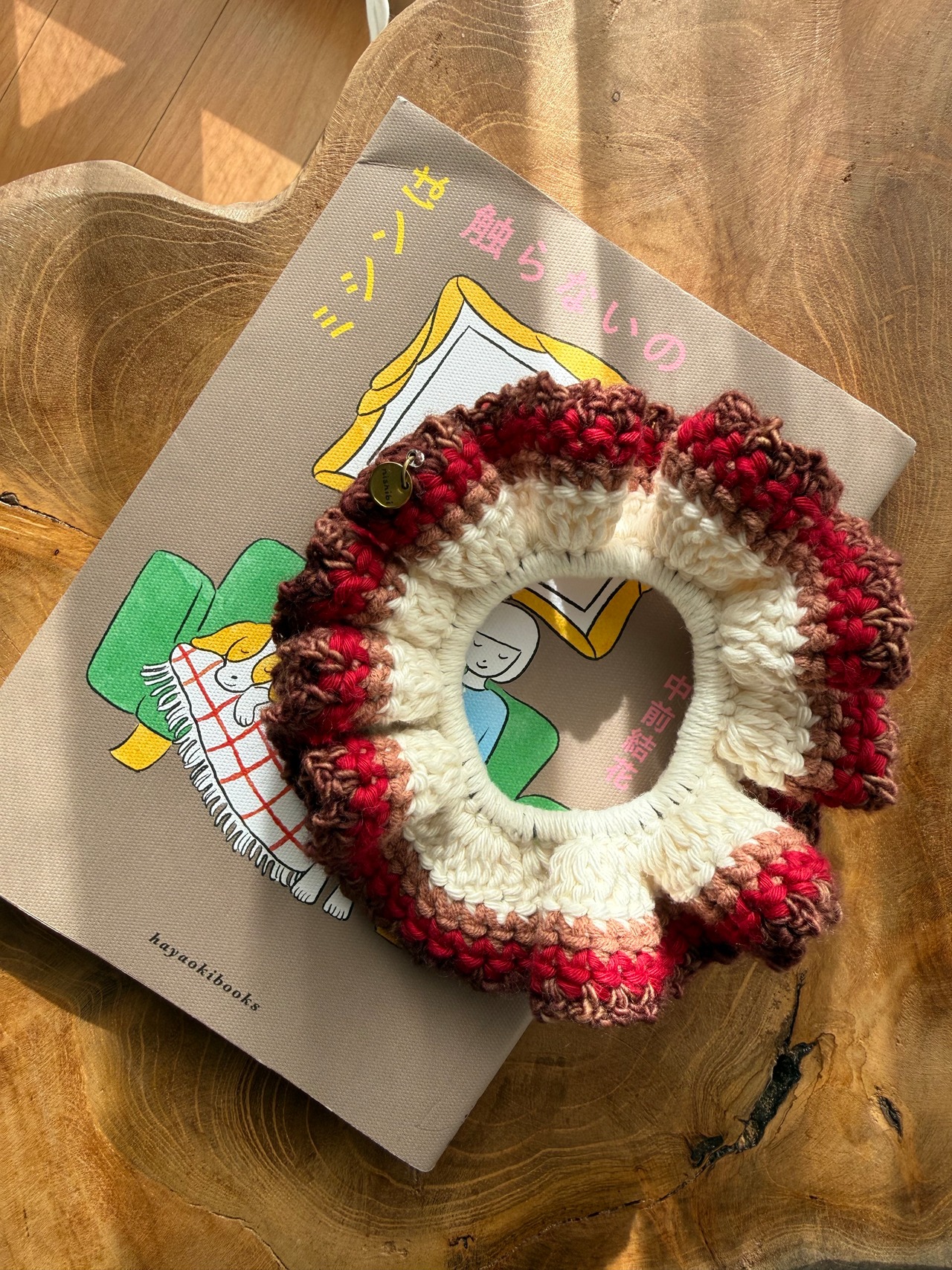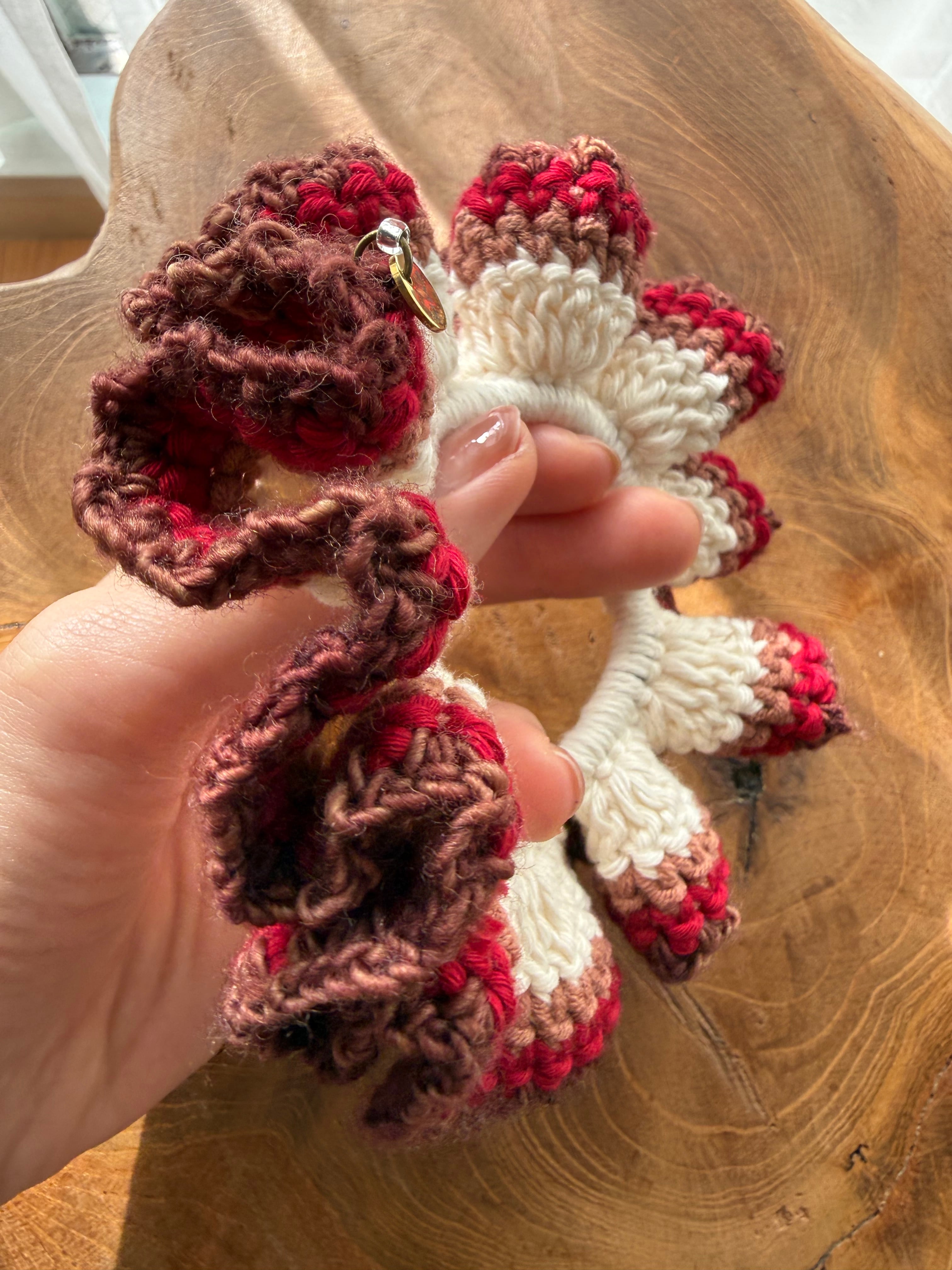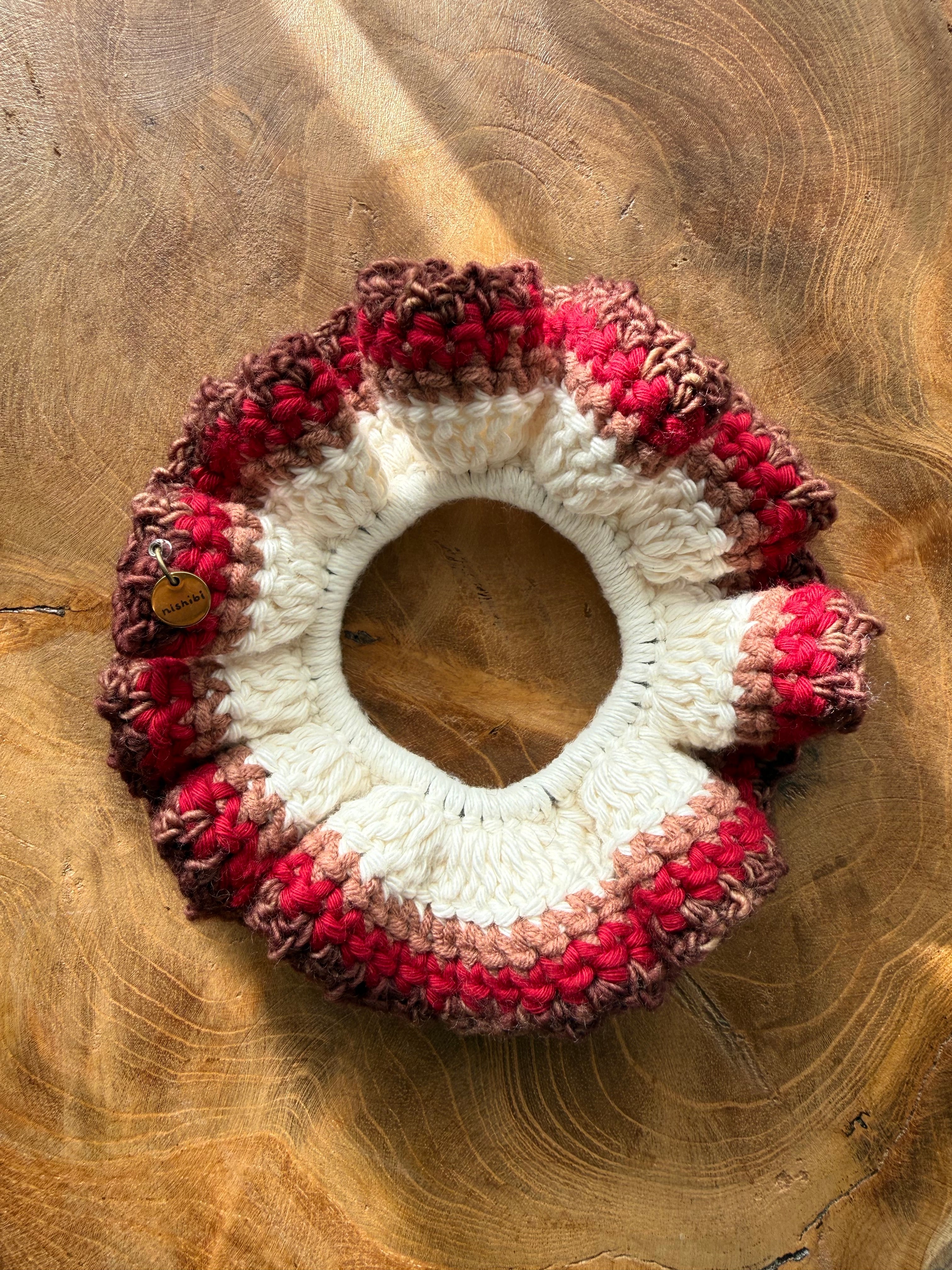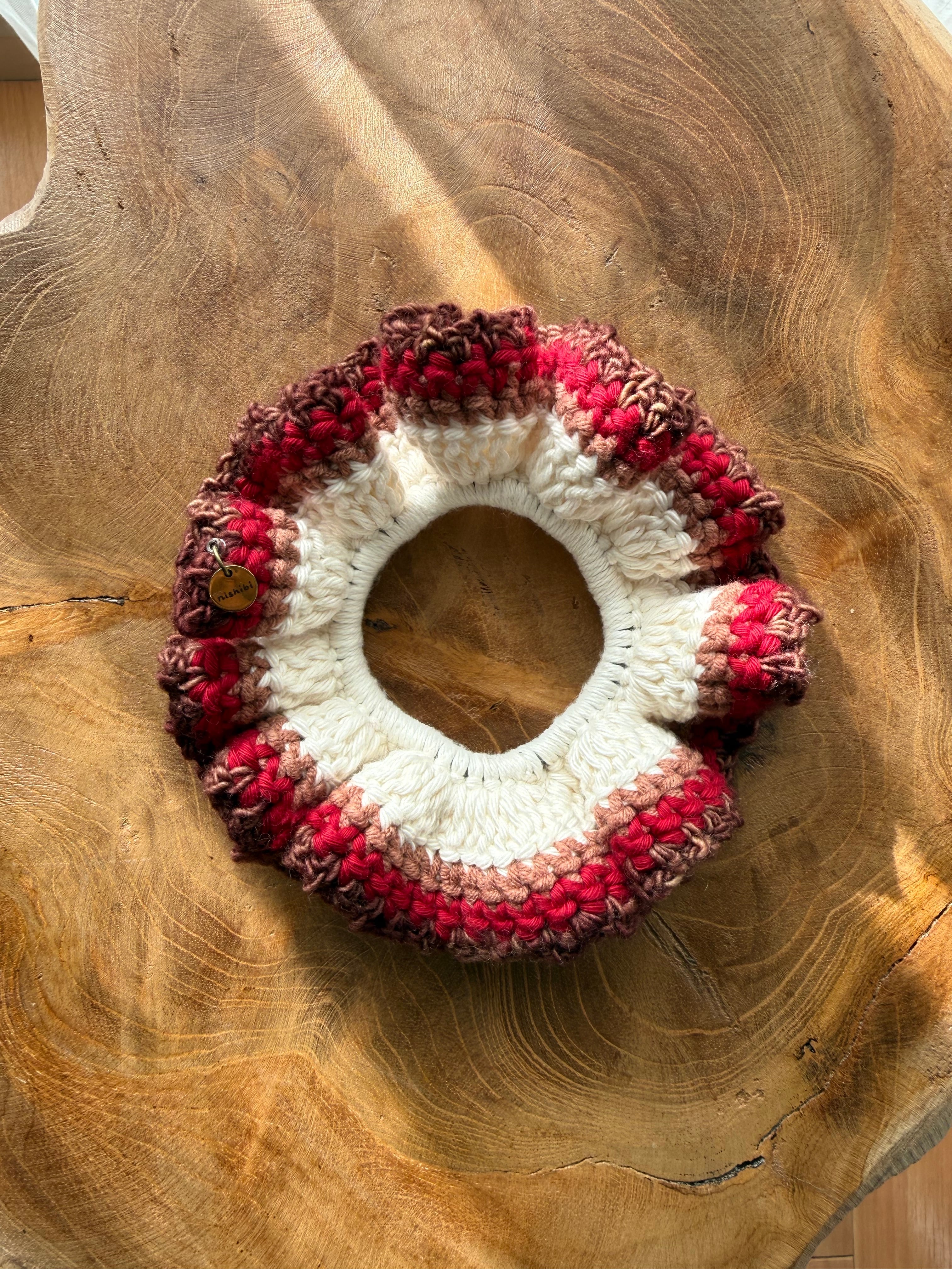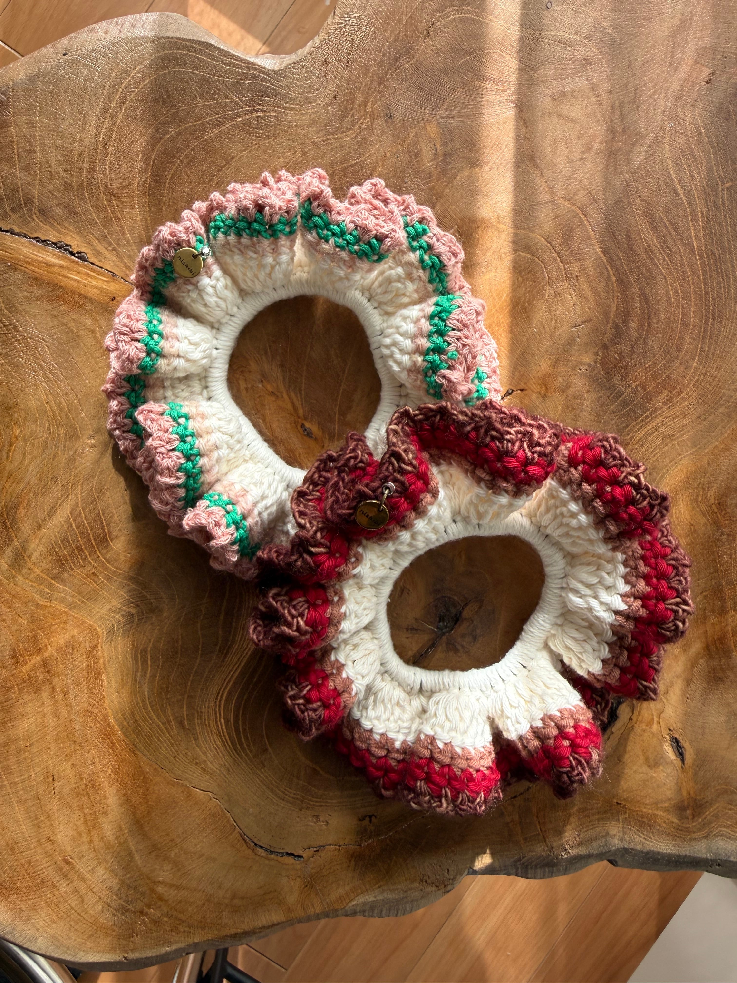 アクセサリー感覚で付けられる手編みのシュシュ。