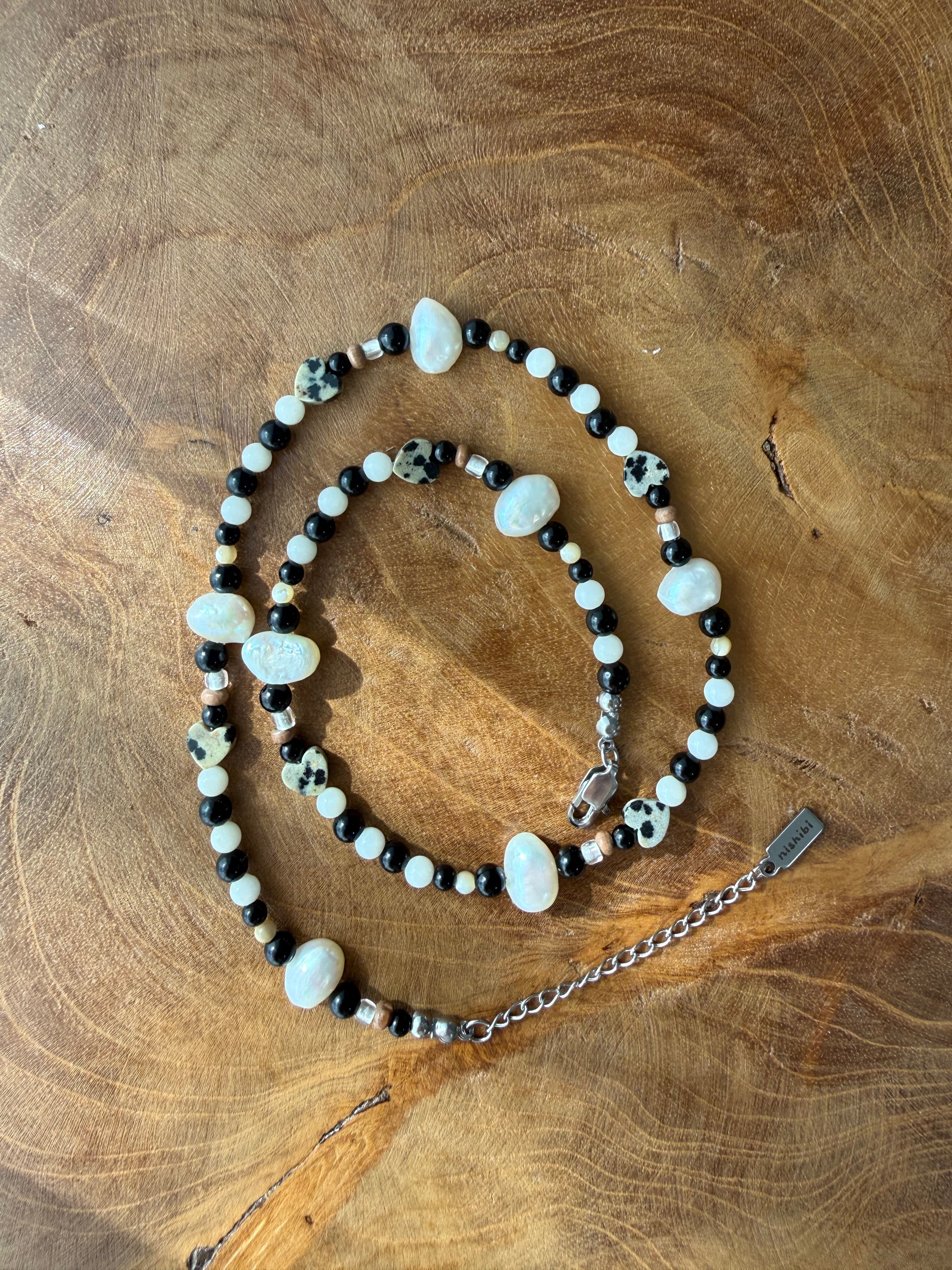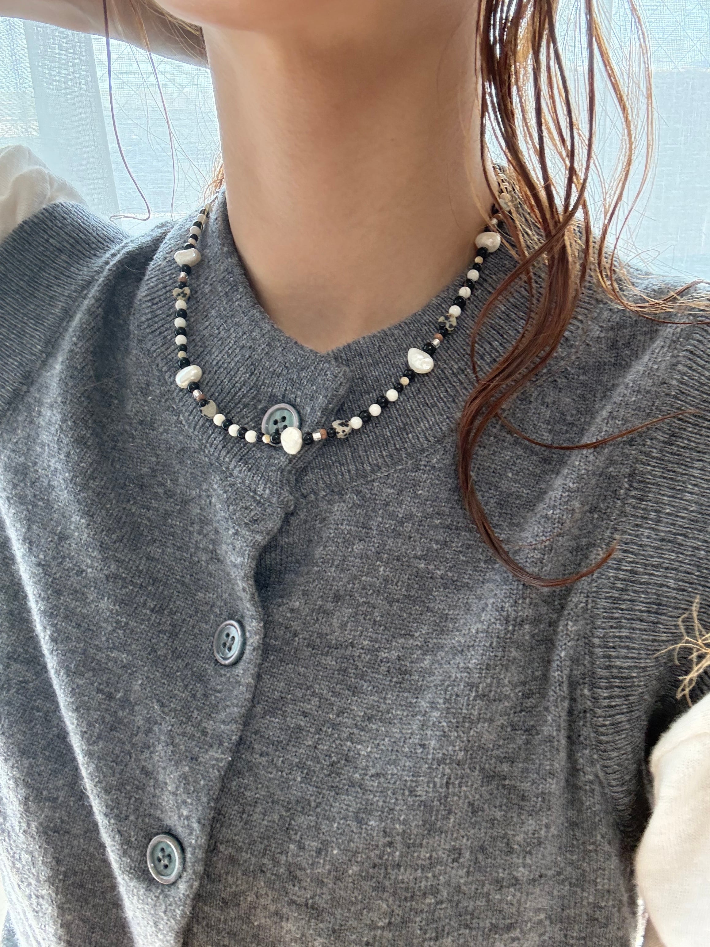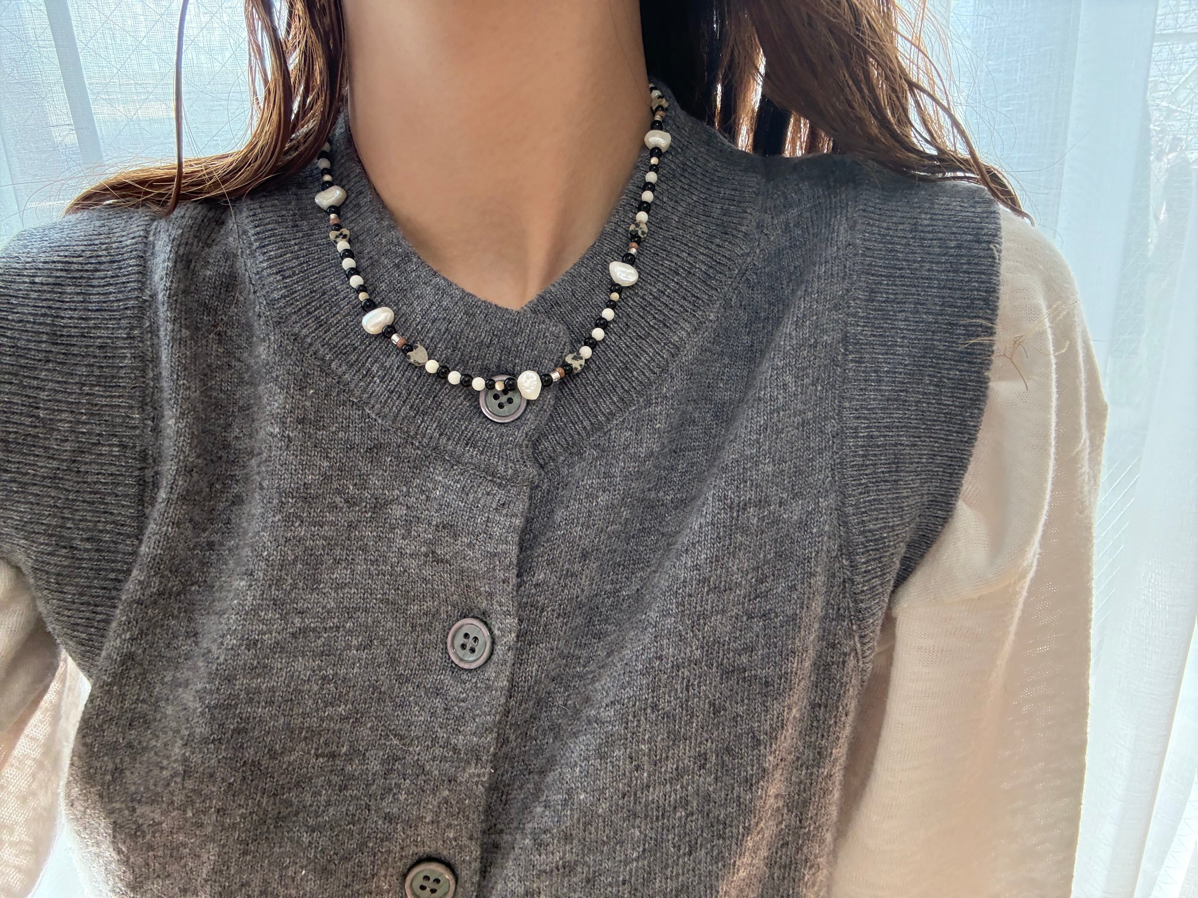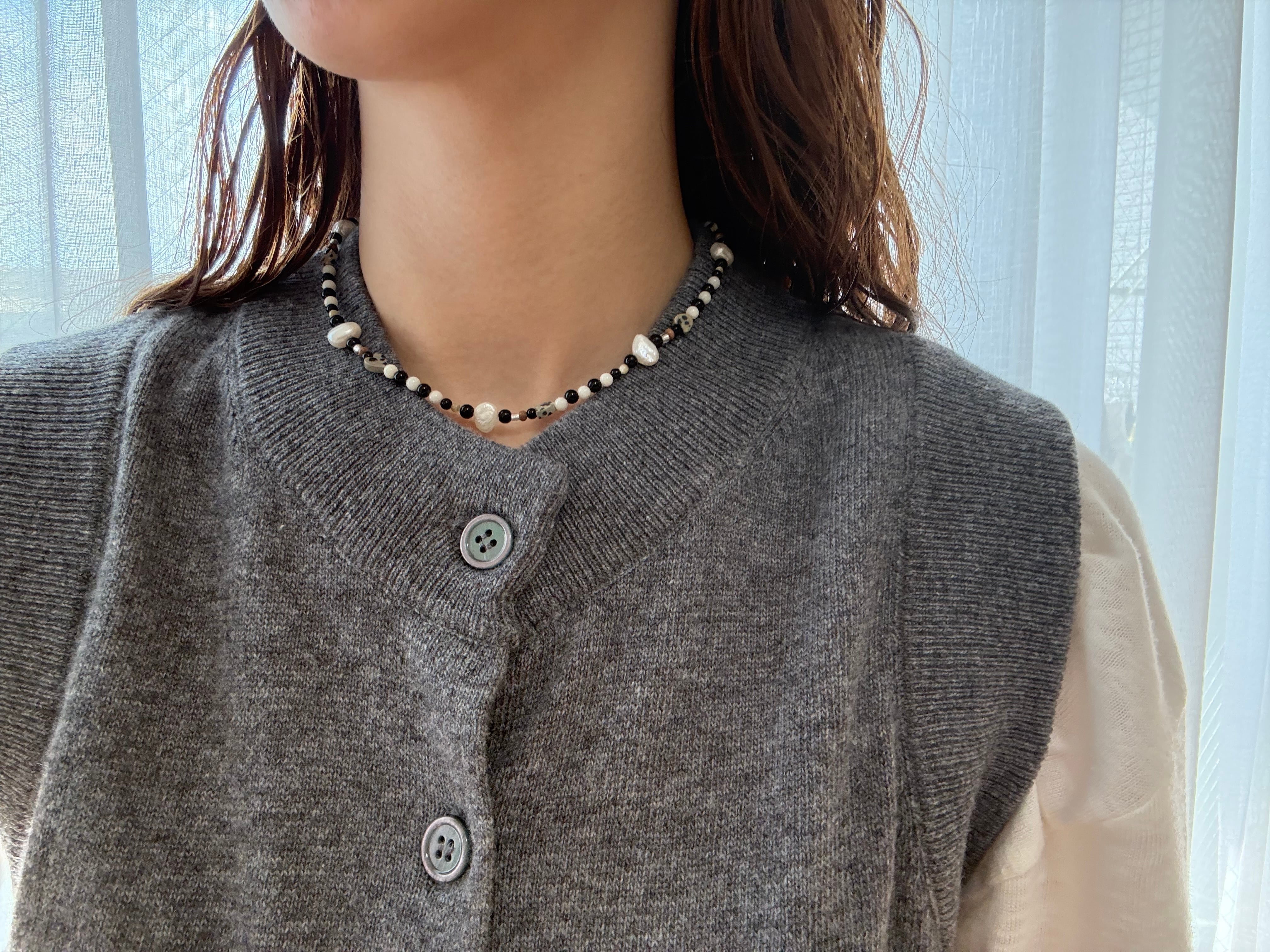 ドット模様が愛らしいダルメシアンジャスパーや、海の恵みであるホワイトコーラル、淡水パール。一つとして同じ形のない天然素材を贅沢に繋ぎ合わせました。