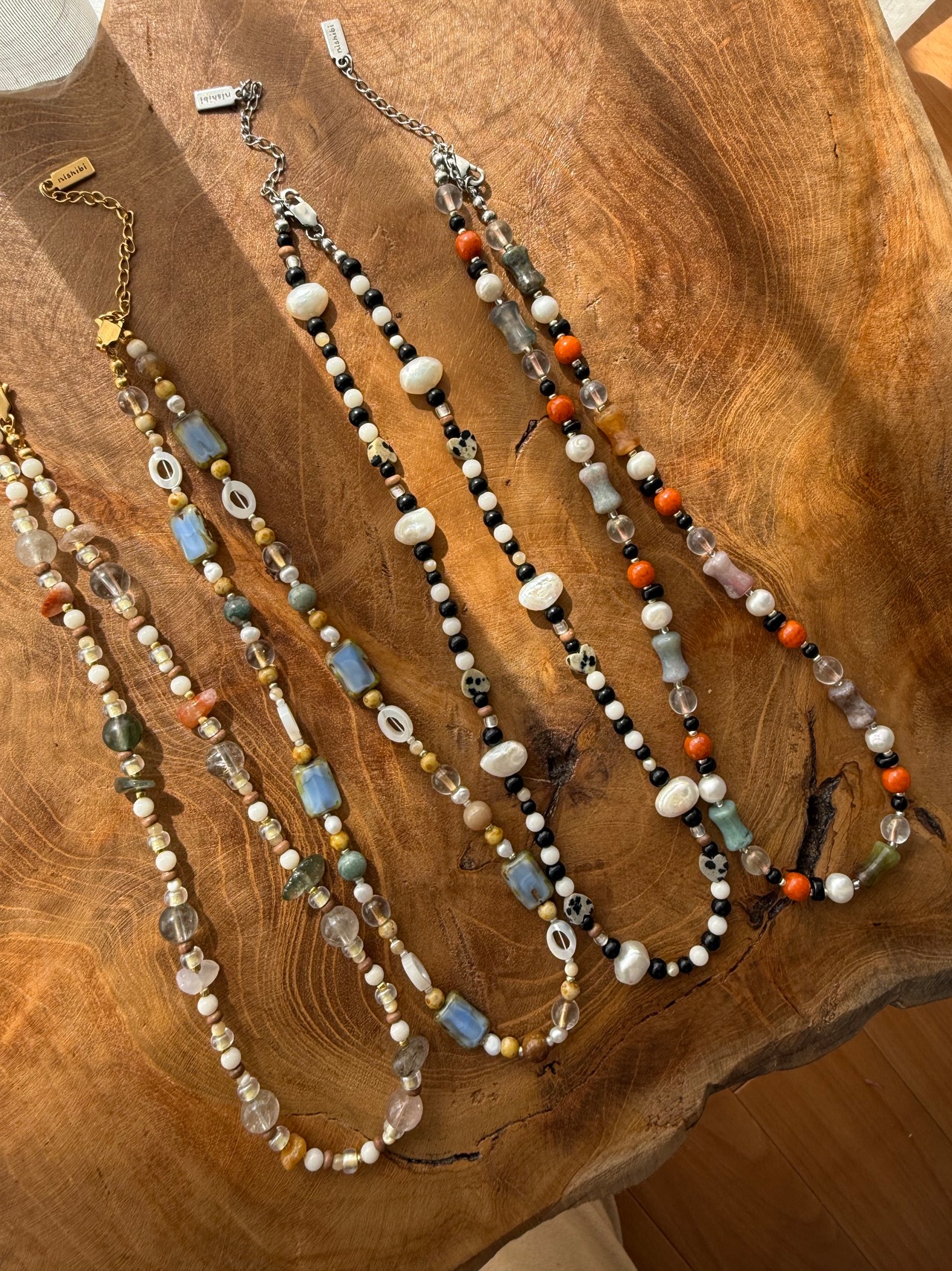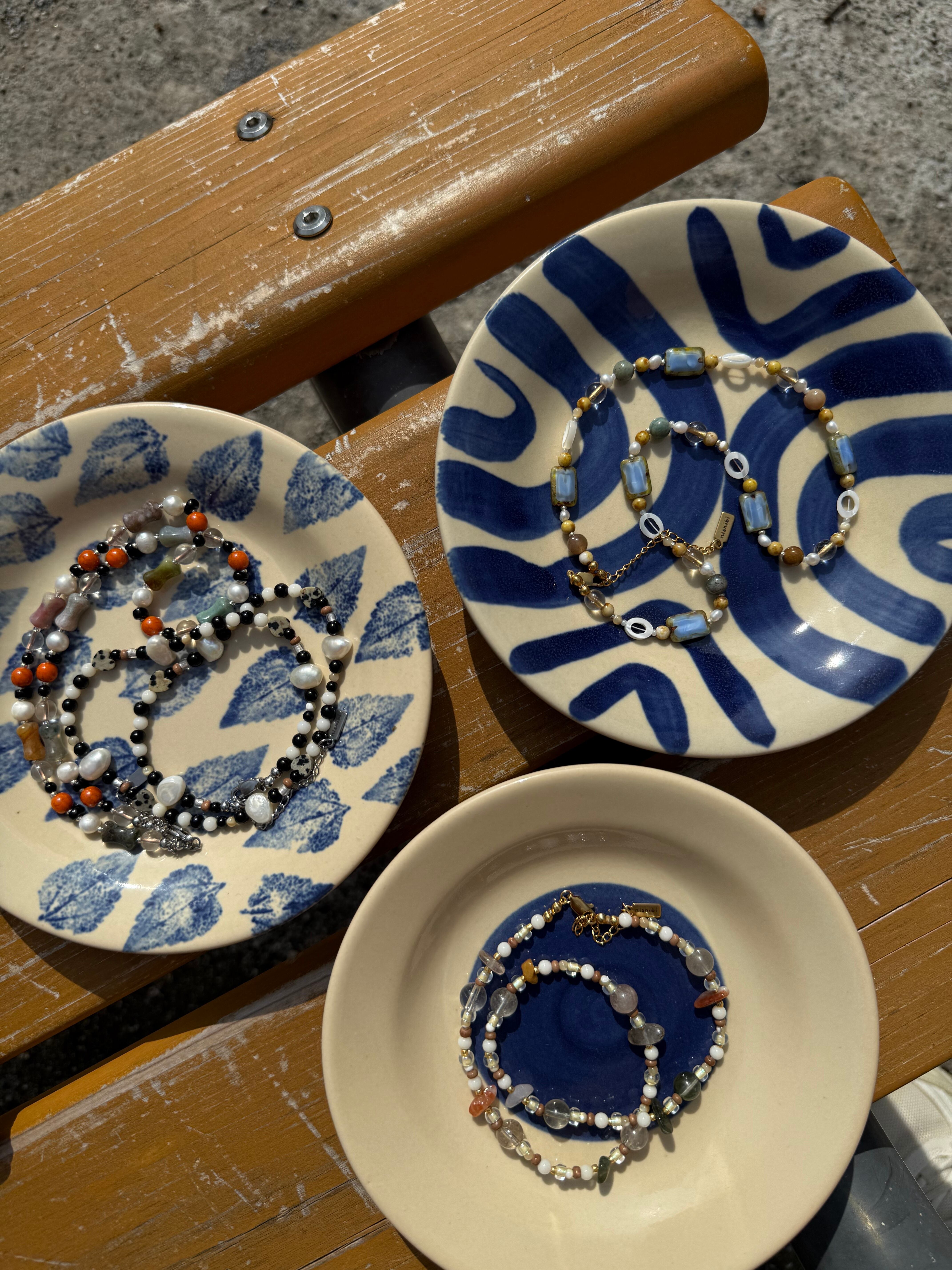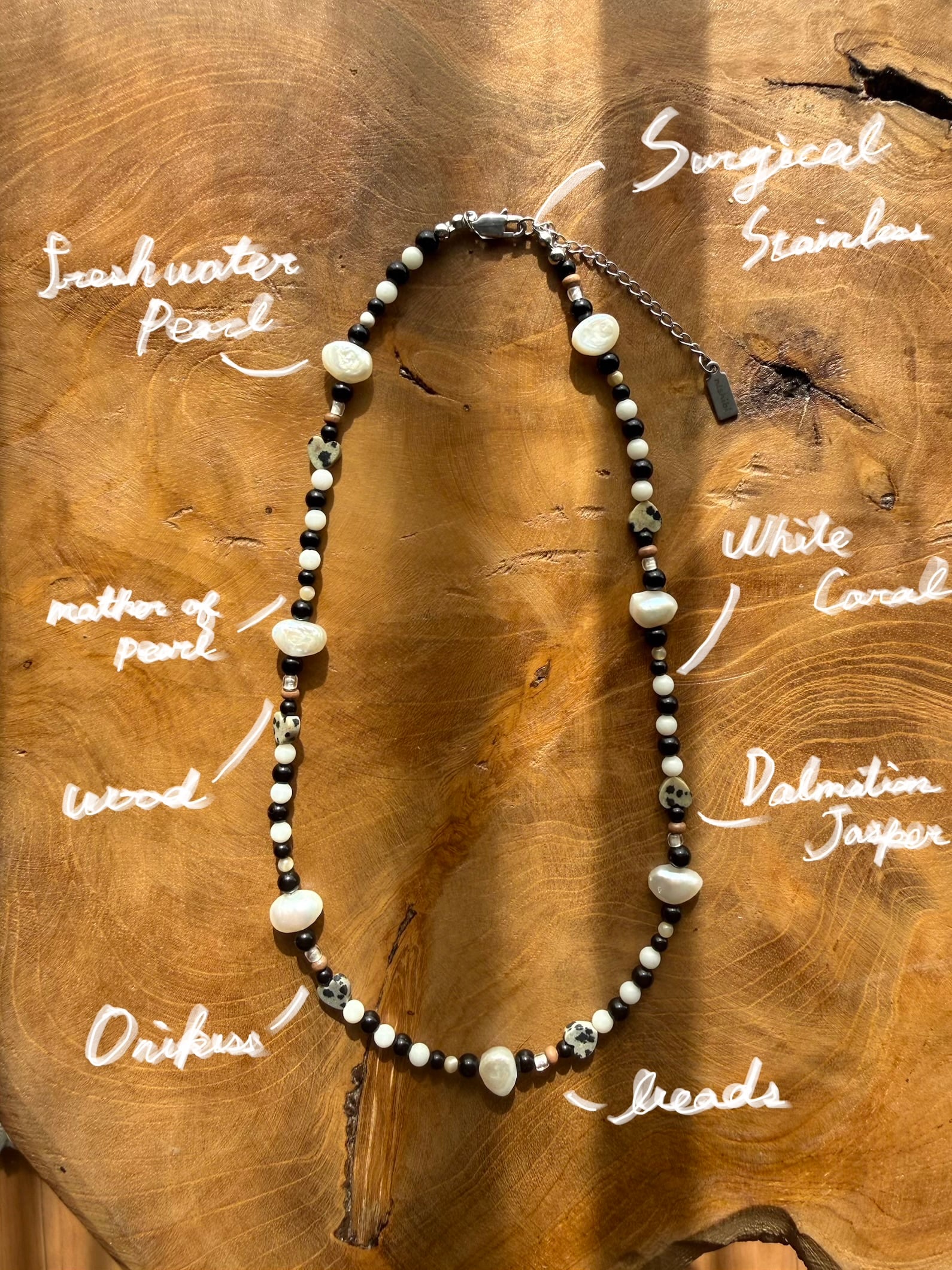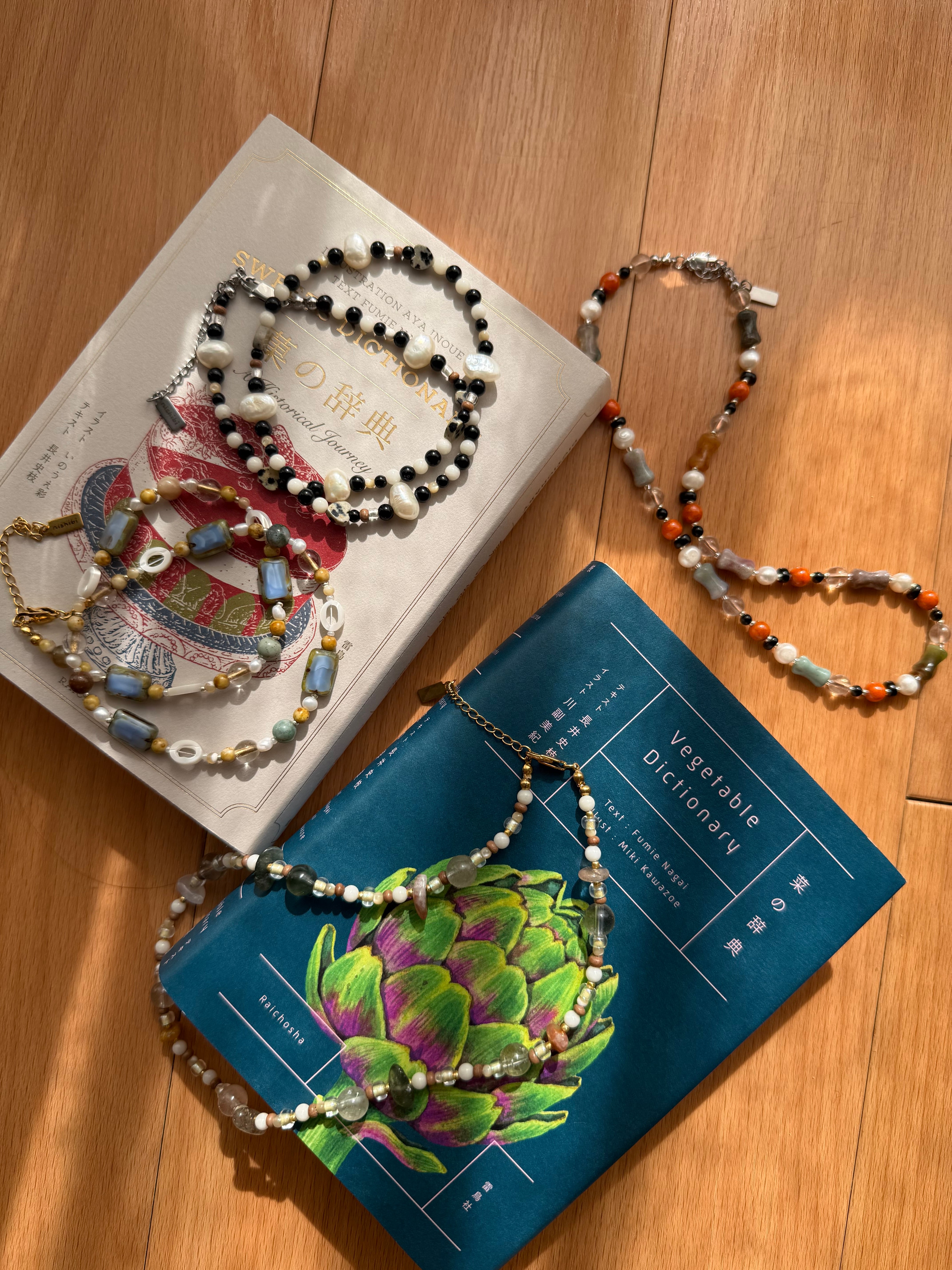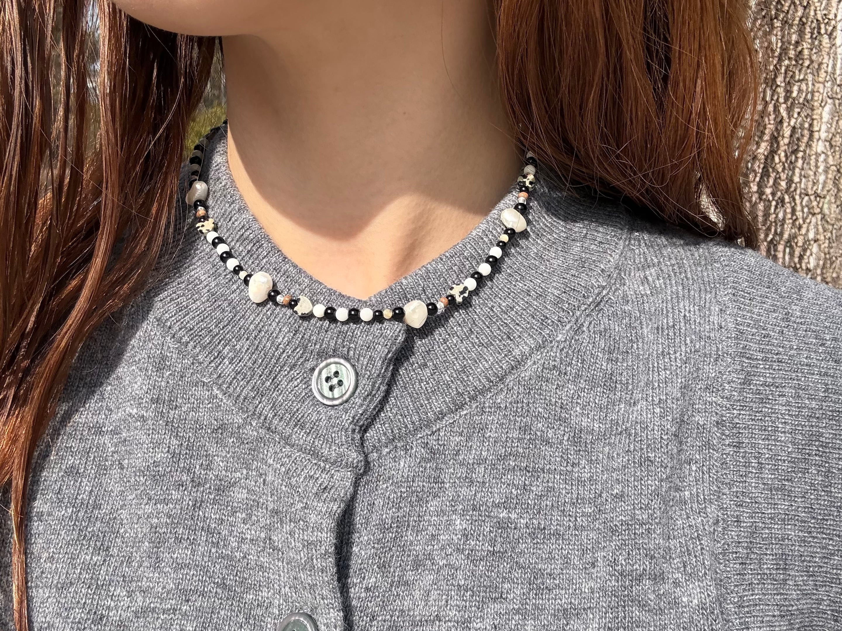 ドット模様が愛らしいダルメシアンジャスパーや、海の恵みであるホワイトコーラル、淡水パール。一つとして同じ形のない天然素材を贅沢に繋ぎ合わせました。