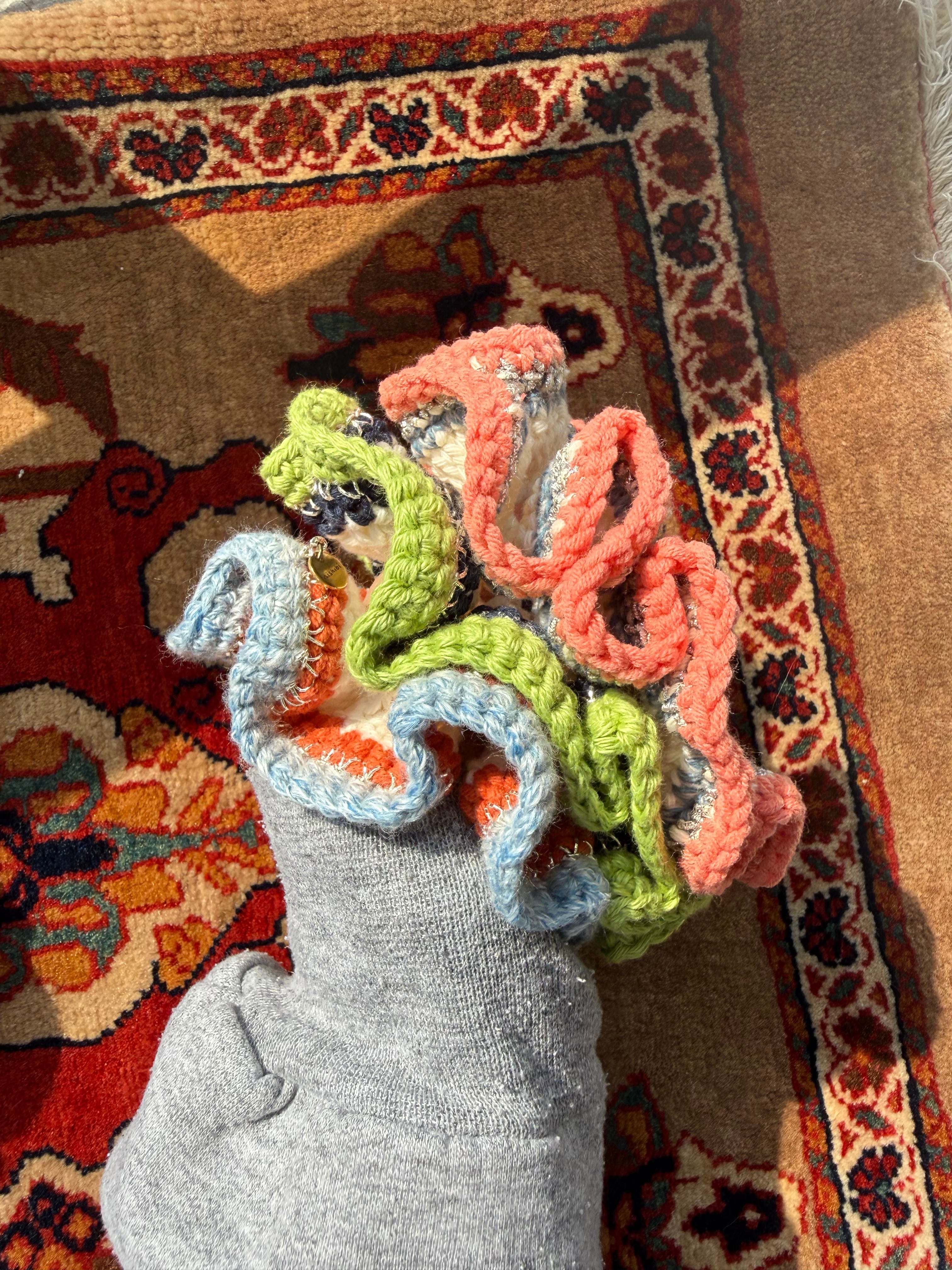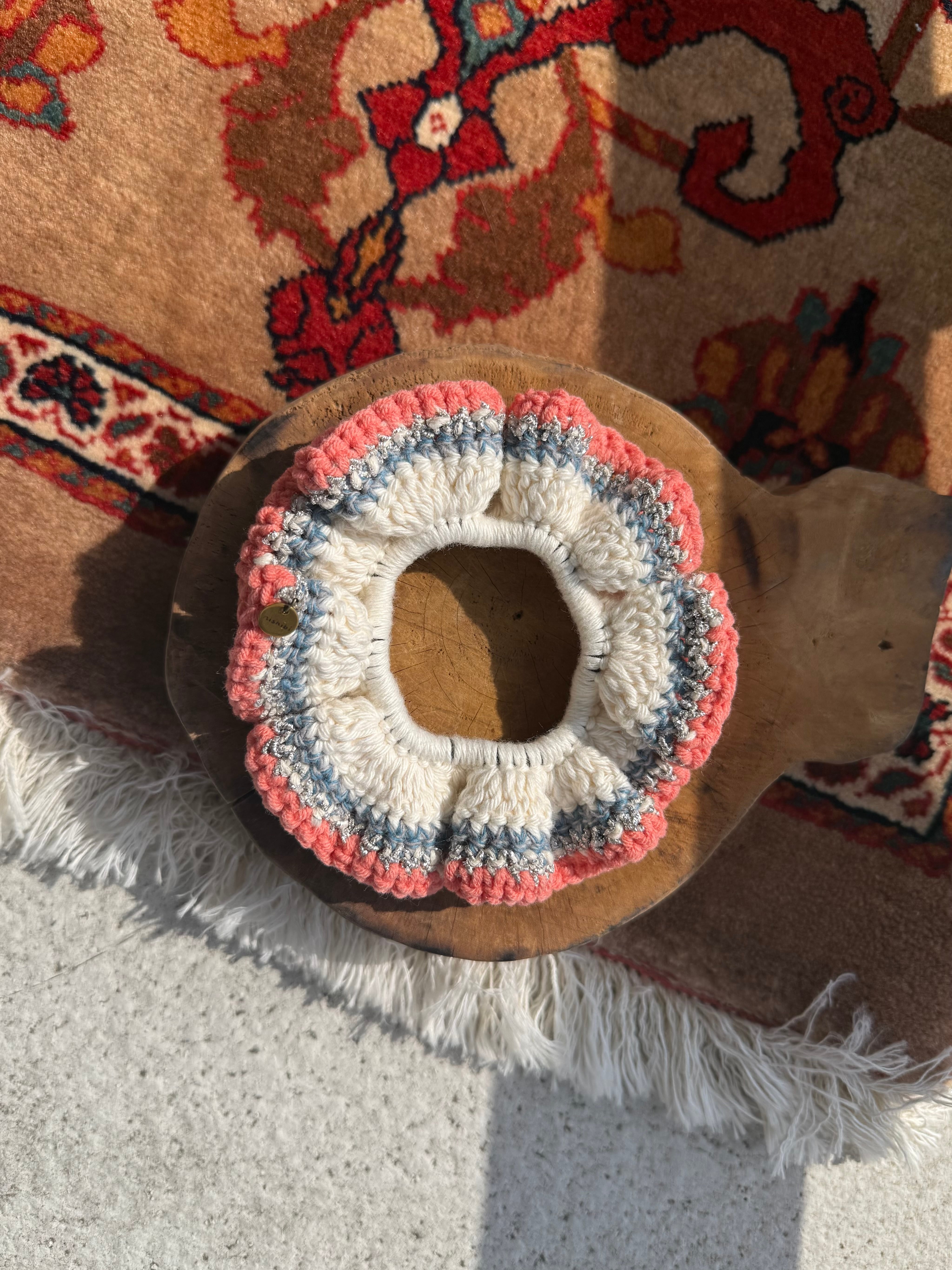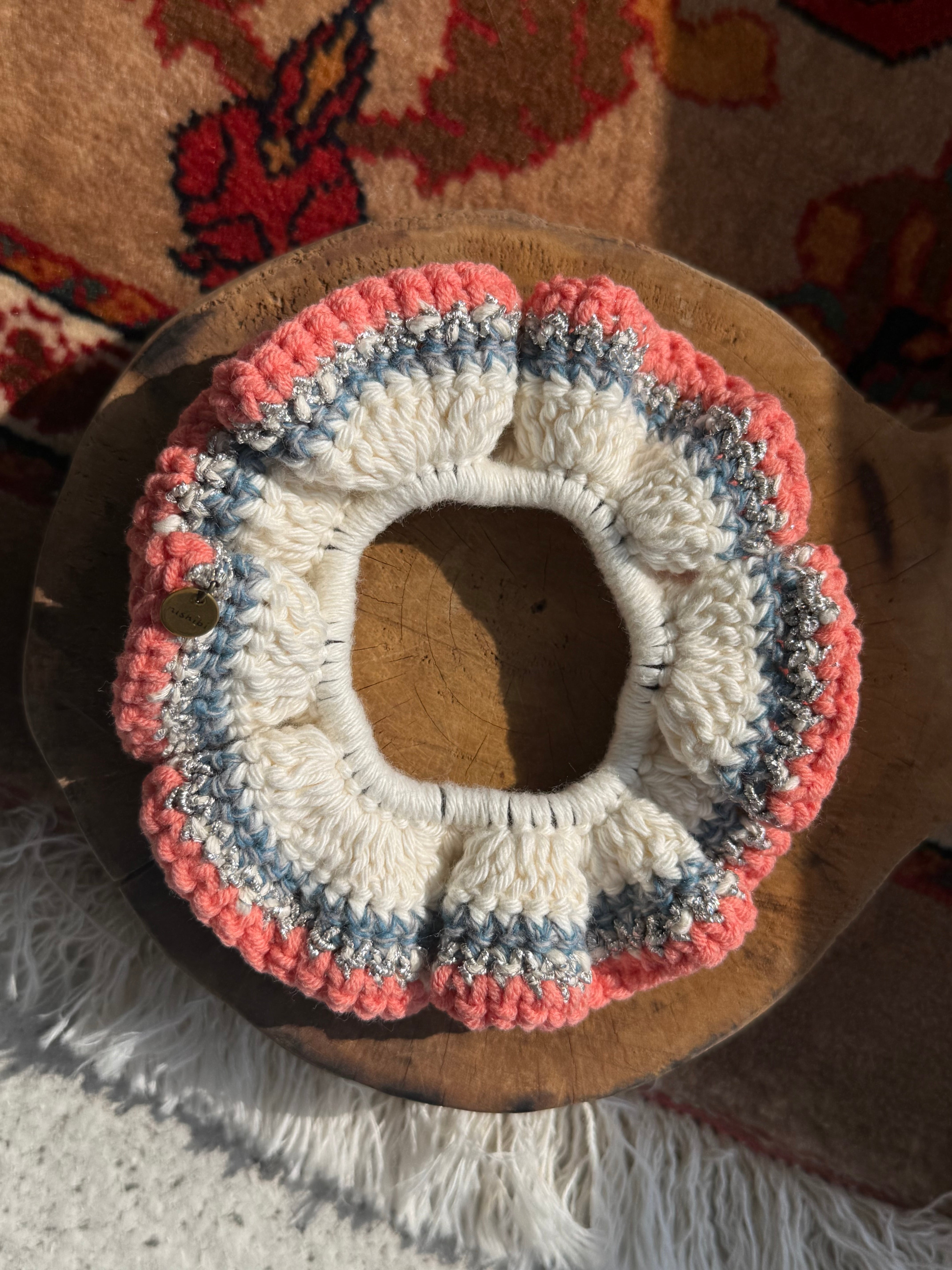 アクセサリー感覚で付けられる手編みのシュシュ。