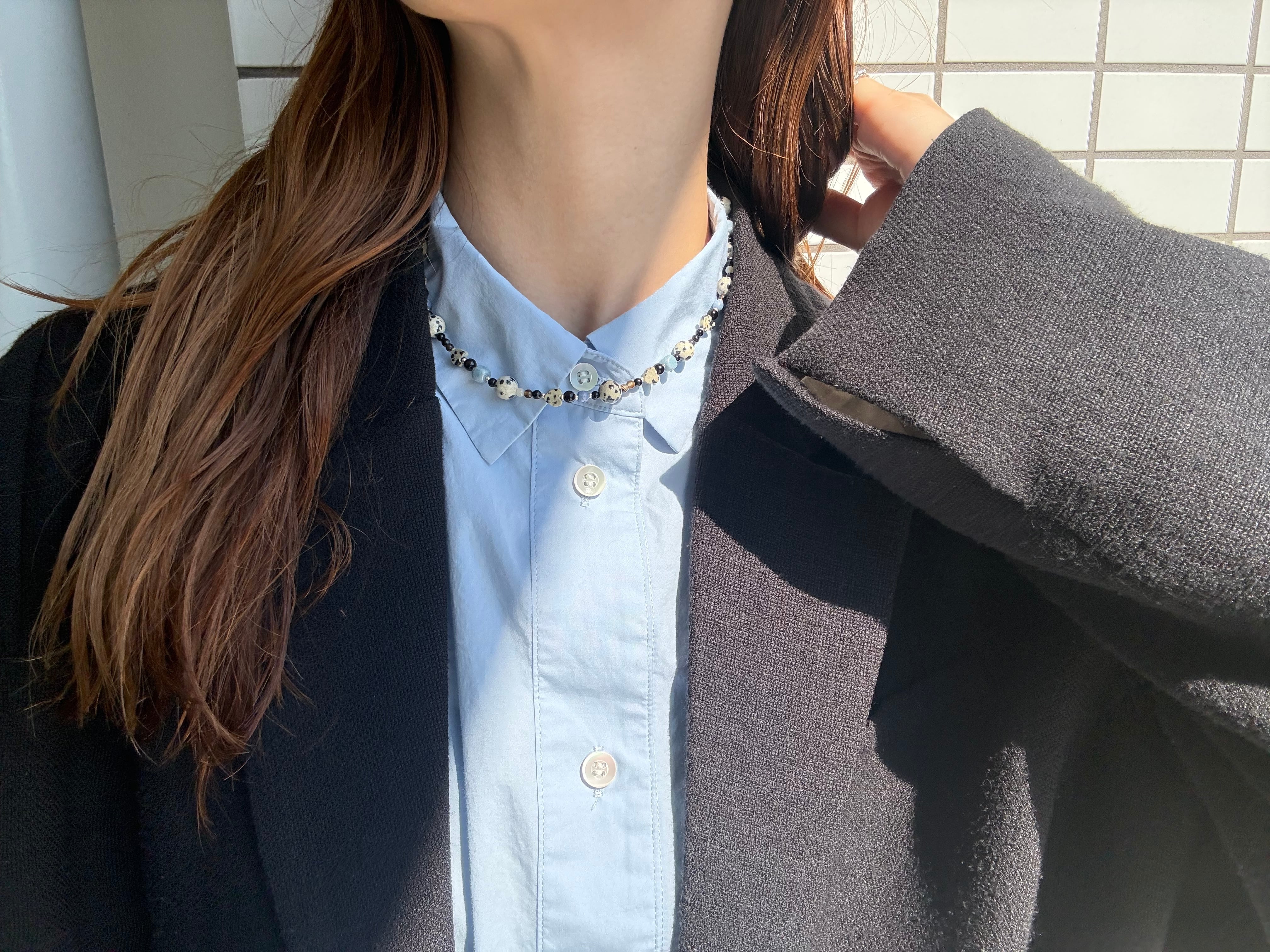 白と黒の不規則な模様が、シンプルな首元に遊び心をプラスしてくれます。